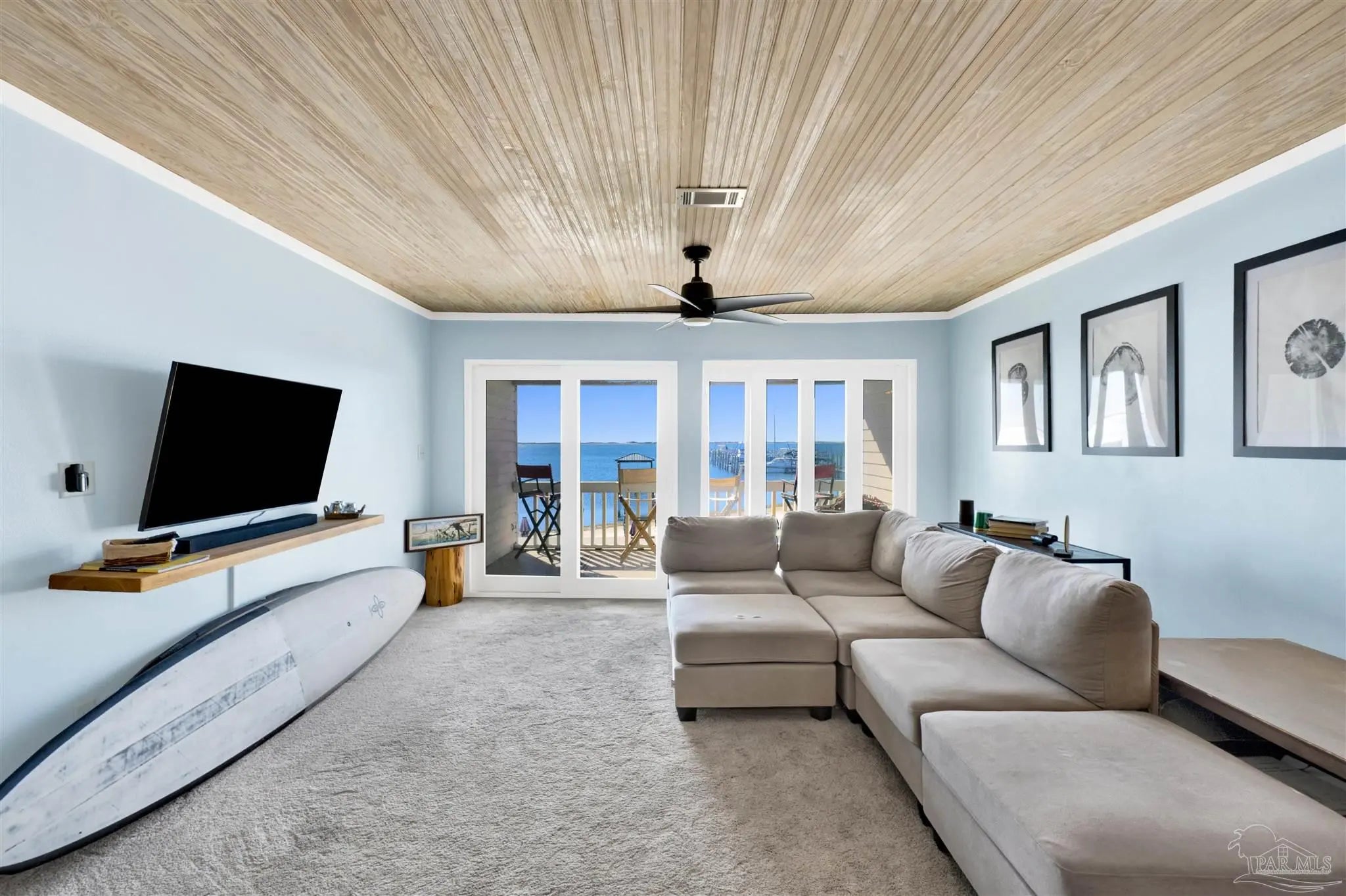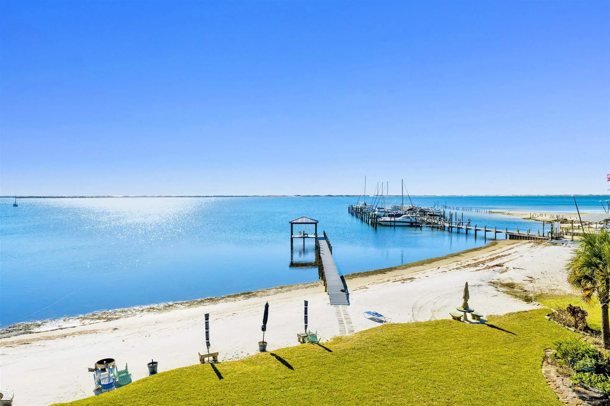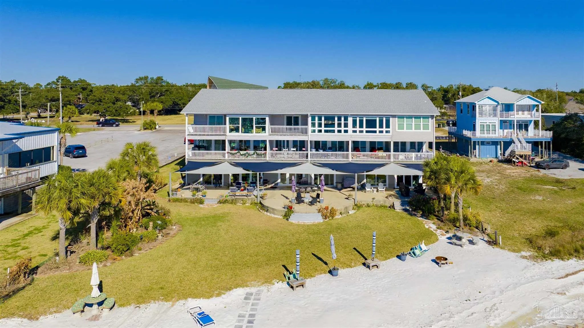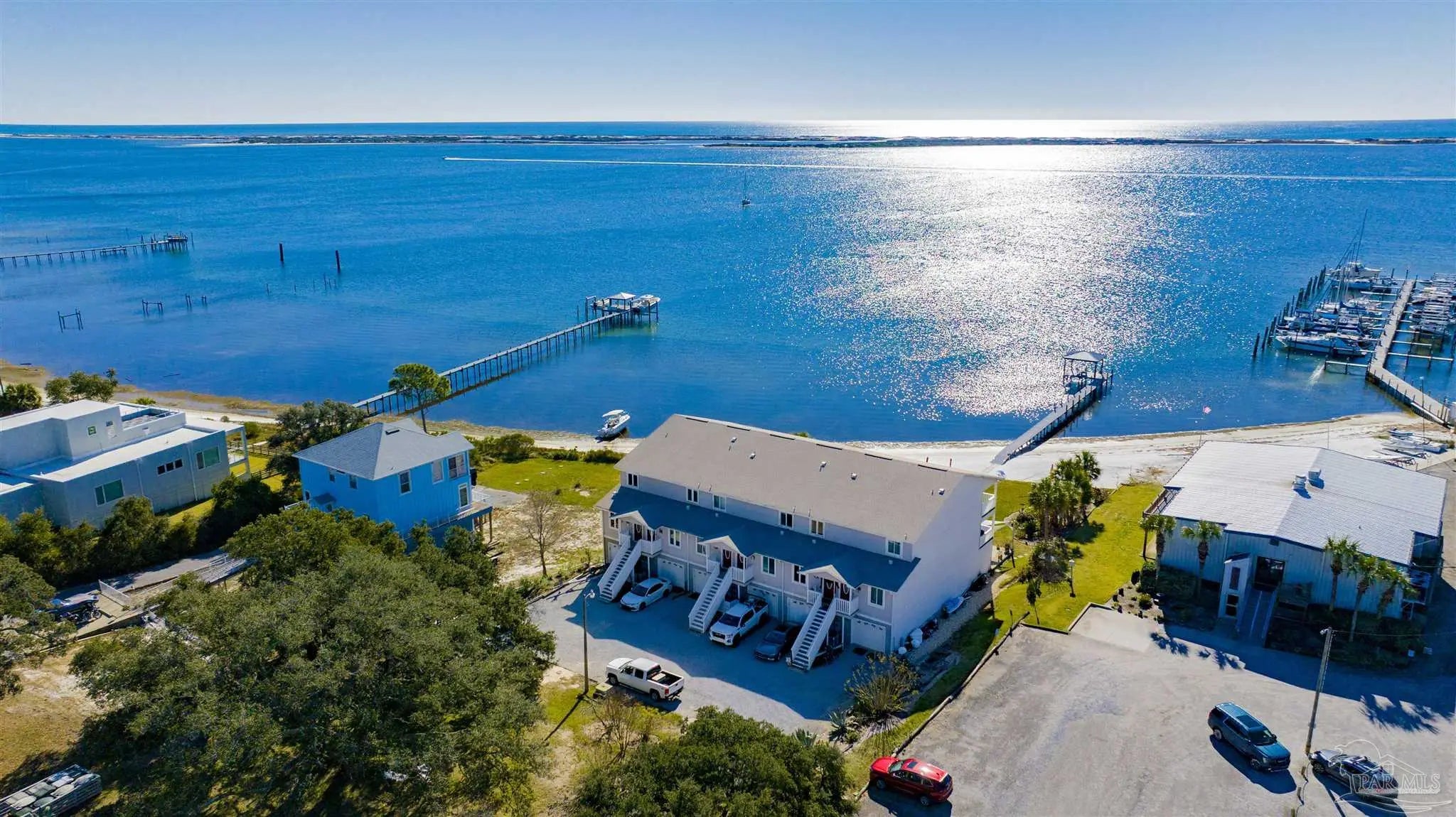 Enjoy living on gorgeous Grand Lagoon with stunning direct blue green water views from all three levels of this beautifully updated 2 Bedroom, 2.5 Bath residence! Recent upgrades include a kitchen remodel with granite counters, new cabinetry, durable 12mm LVP flooring, 2023 appliances with wine cooler, all new sliding glass doors, and an HVAC system replaced just two years ago. Private Community Pier with new composite decking! Outdoor living shines with a new sun sail, fire pit, and direct access to serene surroundings. The upper level hosts a spacious primary suite with an en-suite bath and expansive windows framing beautiful water views, and an additional bedroom with en-suite full bath. A secondary living area on the lower level opens to the back patio, creating a seamless indoor-outdoor flow ideal for relaxing or entertaining. The ground level also features a private gym space along with a garage with workshop area, perfect for hobbies or storage. Boat lovers will appreciate the yacht club next door with social memberships and boat slips - minutes from Pensacola Pass! Take in sweeping views of Big Lagoon, Gulf Islands National Seashore, and the Gulf. The property's location makes this a rare opportunity for both full-time living or a coastal retreat. Make sure to watch the Virtual Tour Video! Buyer to verify all information during due diligence.