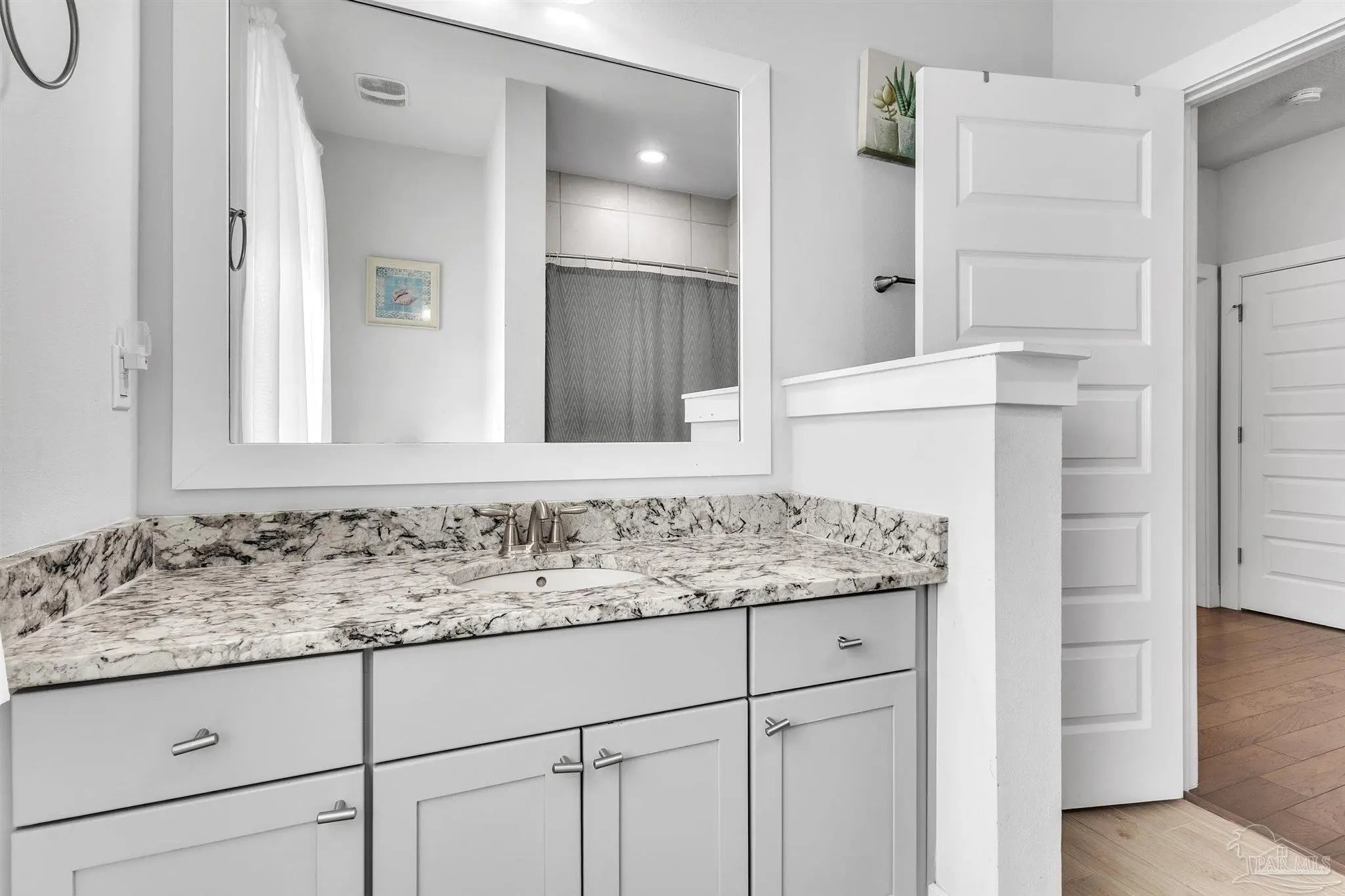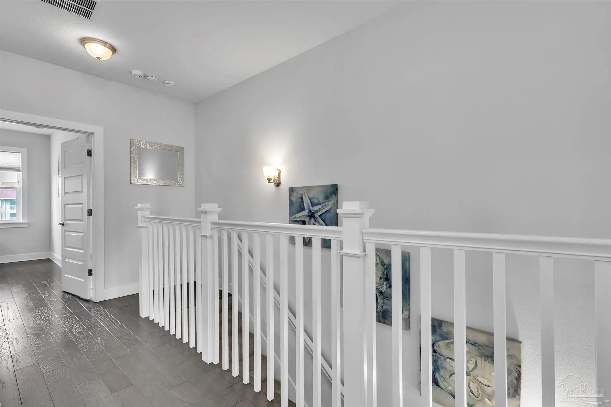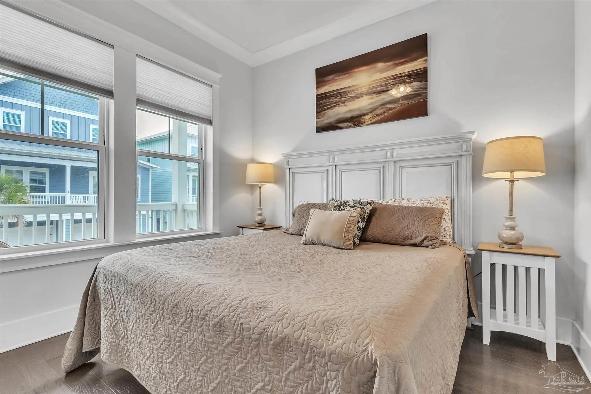 Located in a gated soundside community on Navarre Beach, this turnkey, fully furnished 4-bedroom, 2.5-bath home offers a flexible layout and coastal lifestyle convenience. Built in 2016 with 2,209 sq feet, it is a quick walk to both the community's deeded Santa Rosa Sound access and the white sand beaches and emerald waters of the Gulf of Mexico. The main level features an open and bright floor plan with hardwood floors, tall ceilings, crown molding, and abundant natural light. The kitchen includes a large island with granite countertops, stainless steel appliances, soft-close wood cabinetry, under-cabinet lighting, and a stylish backsplash. The spacious living and dining areas flow directly to a large wraparound porch with multiple seating and dining areas. Also on this level is a guest bedroom with private porch and a powder bath. Upstairs, the home offers two additional guest bedrooms, a full bath, a laundry room, and a generously sized primary suite. The primary suite includes a king-size sleeping area with space for additional furniture and a seating area. The primary bath features double sinks, ample cabinetry, a large tiled shower with glass enclosure, a water closet, and a walk-in closet. The ground level provides parking for four vehicles, two covered and two uncovered spots, along with a large storage area that is fully outfitted with bikes, paddleboards, beach chairs, and beach and water toys. A covered area offers space for casual outdoor dining or relaxing after a day at the beach. Community amenities include private sound access, a pool, hot tub, and fire pit. This property is well suited as a primary residence, second home, or investment property with strong rental performance.