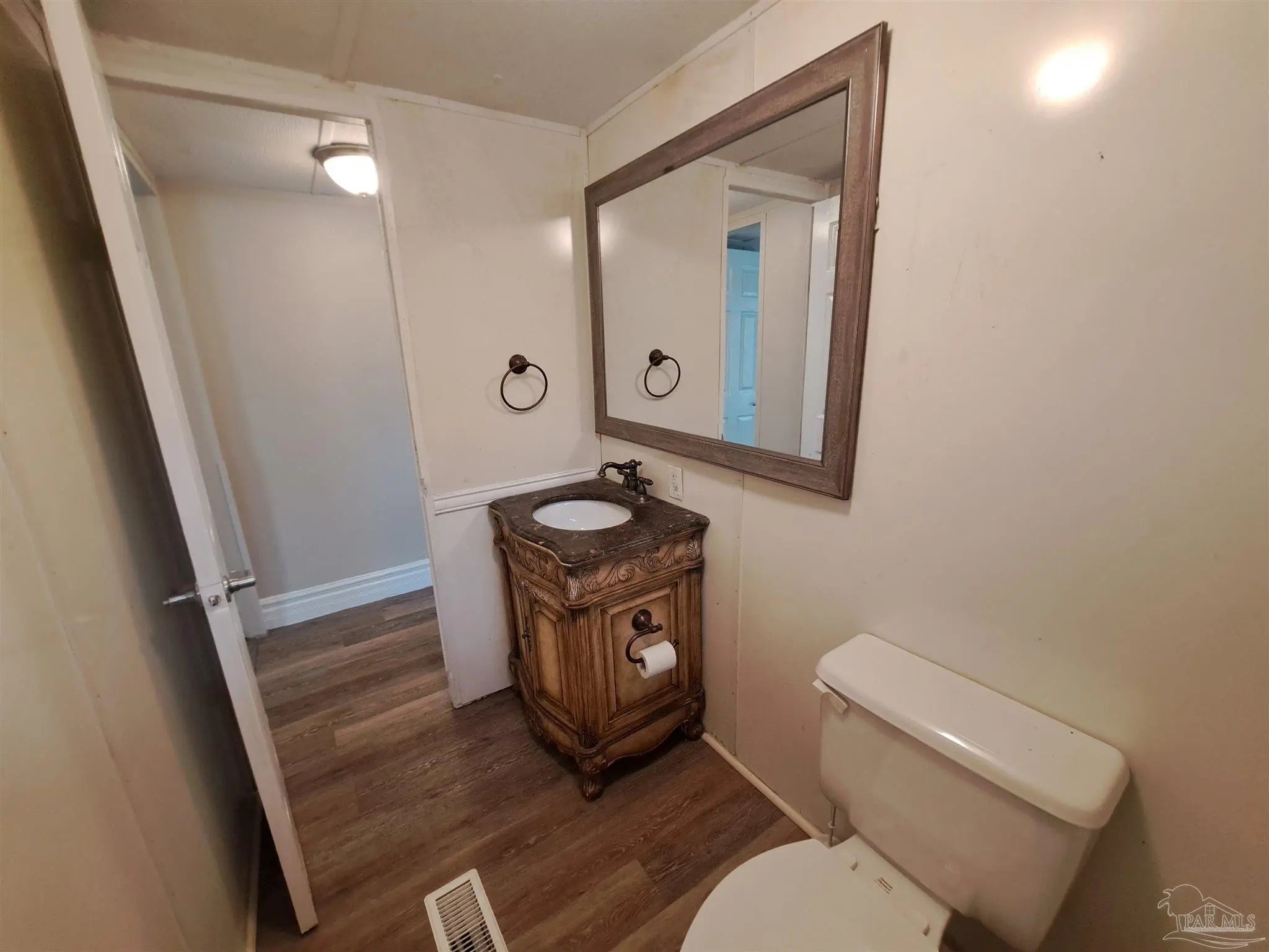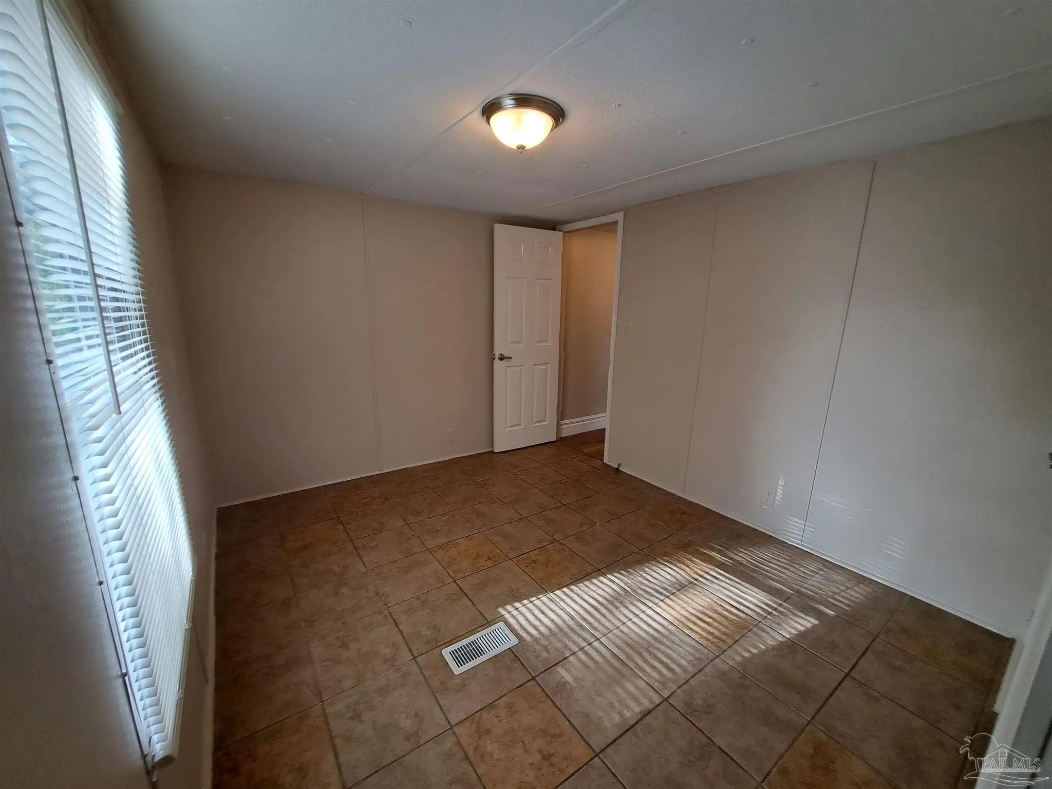 Nicely remodeled 2BR/2BA mobile home located just off Pine Forest Rd near Blue Angel Parkway. This open floor plan home features a living room with gray plank vinyl flooring and a fully equipped eat-in kitchen with marble countertops, a stainless steel smooth-top electric stove, side-by-side refrigerator, and dishwasher. Additional kitchen highlights include a breakfast bar and a built-in buffet. The split floor plan places the primary bedroom off the kitchen. The primary bedroom offers wood laminate flooring, his-and-hers closets, and a ceiling fan. The en-suite bathroom features a whirlpool garden tub, separate shower, and granite-topped vanity. The additional bedroom and bathroom are located on the opposite side of the home. The second bedroom has tile flooring, and the guest bath offers marble countertops and a standard tub. Additional features include indoor washer/dryer connections, a covered entry, and all-electric utilities with central heating and air. Rent includes water, trash service, and lawn maintenance. Pets are considered with owner approval and a non-refundable $325 pet fee per pet. No smokers, please. Roommates, if accepted, must apply and qualify separately.