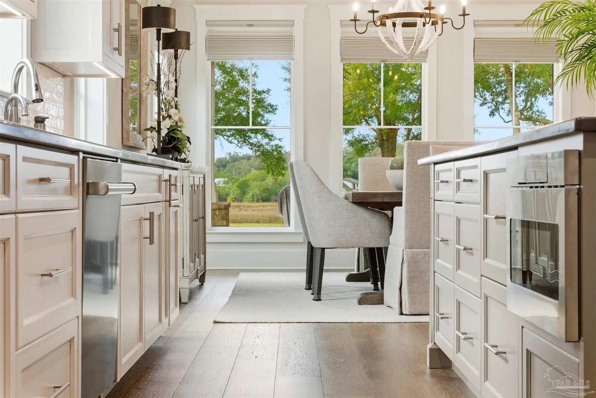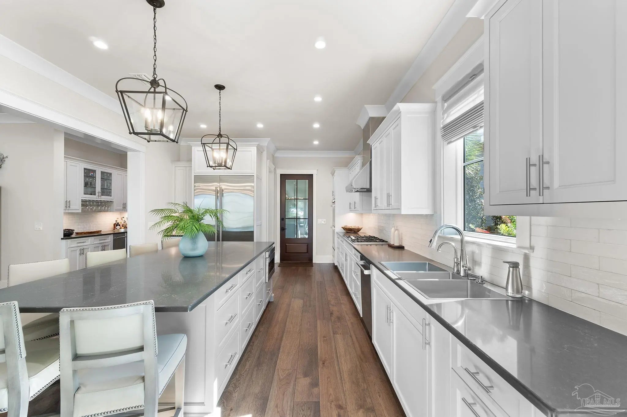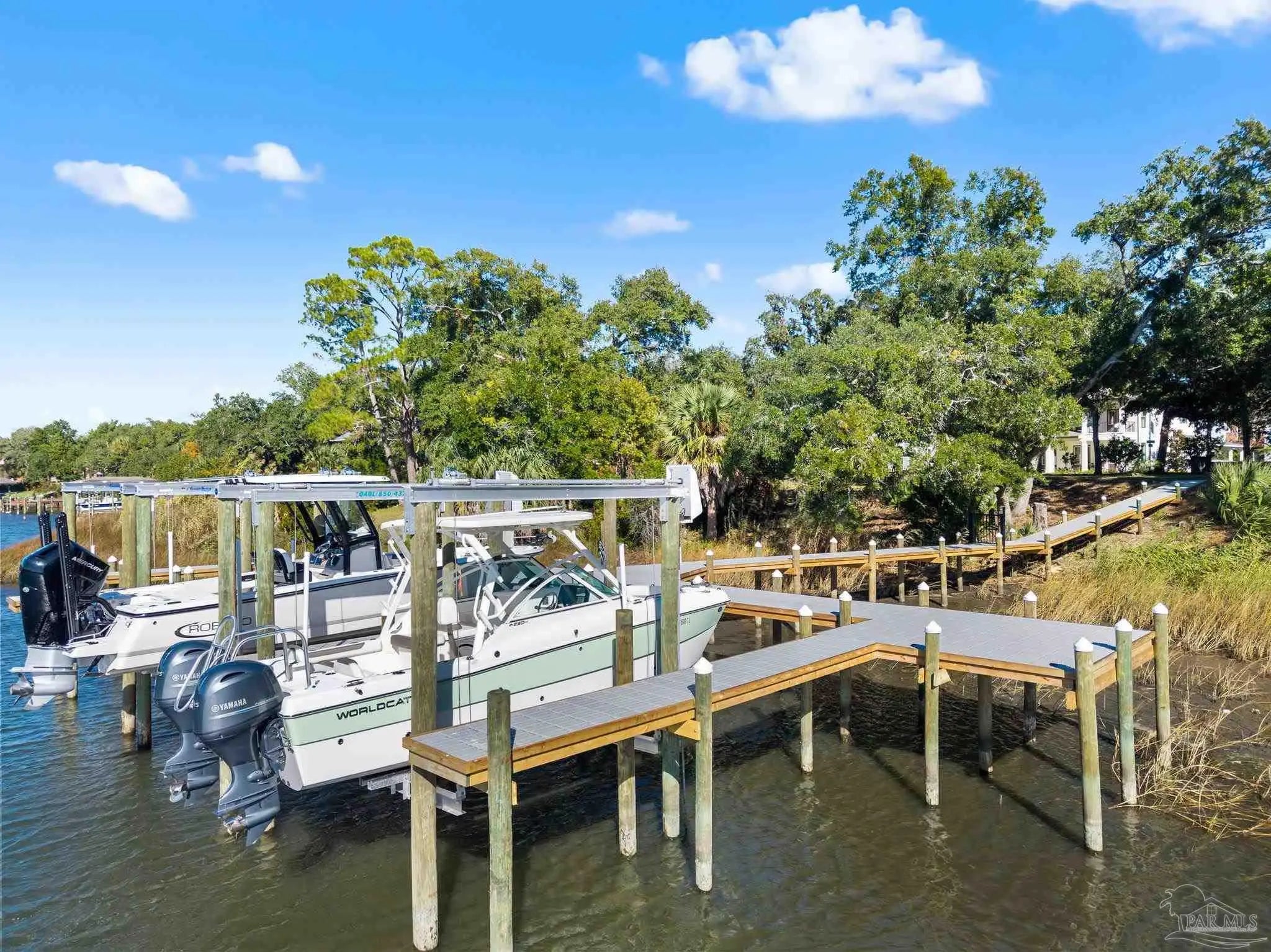 Experience the best of coastal luxury living in this stunning 2023 custom-built home. Perfectly positioned for peaceful bayou views, this residence blends timeless architecture, superior craftsmanship, and modern efficiency throughout. The open-concept floor plan features a gourmet kitchen with Silas stone countertops, Wolf double ovens, a Thermador refrigerator, spacious island, custom cabinetry, a hidden walk-in pantry, and a wet bar with beverage cooler. Elegant crown moulding, wide baseboards, beautiful hardwood floors, and thoughtful under-cabinet outlets showcase exceptional attention to detail. The primary suite on the main level offers his-and-hers closets and a spa-inspired bath with a soaking tub and Silas stone finishes, all overlooking lush natural privacy. A guest bedroom and full bath on the main floor provide comfort and convenience. Upstairs are two spacious ensuite bedrooms, including one with breathtaking bayou and bay views, along with ample walk-in attic access and spray foam insulation for superior storage and efficiency. Additional features include a mudroom off the three-car garage, whole-house generator, and a grilling porch with gas hookups. Outdoor living shines with a large front porch featuring tongue-and-groove Cypress ceilings and a charming swing—perfect for enjoying unforgettable bayou sunsets. Mature landscaping, a built-in bug misting system, and a private dock with boat lift (accommodating up to a 26’ boat) complete this exceptional waterfront property. Quiet, private, and impeccably designed, this home embodies refined coastal living.