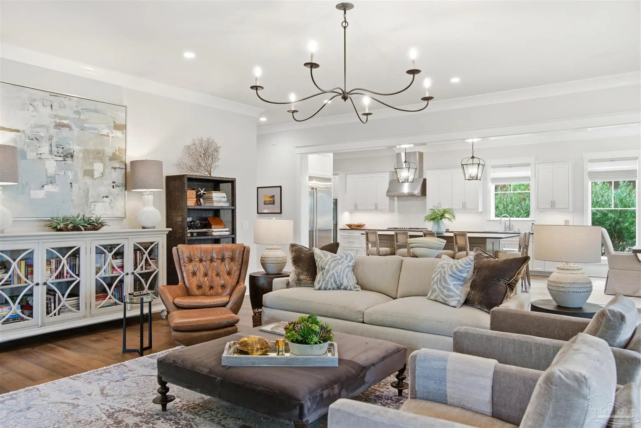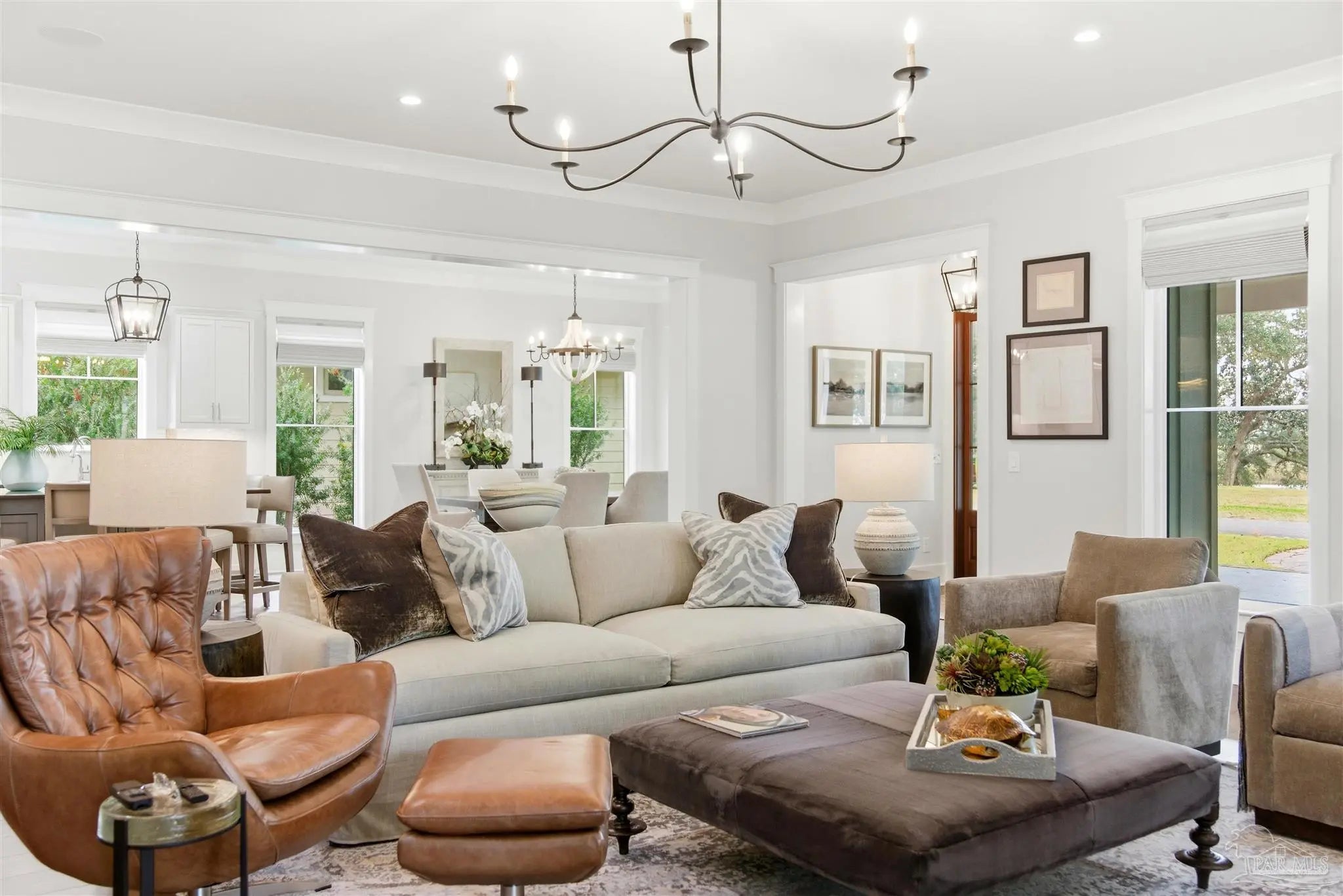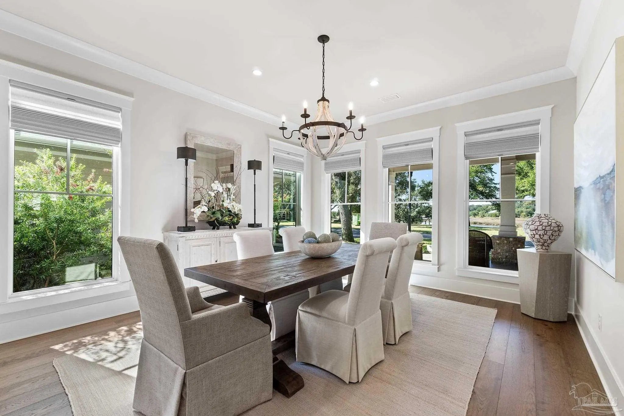 Experience the best of coastal luxury living in this stunning 2023 custom-built home. Perfectly positioned for peaceful bayou views, this residence blends timeless architecture, superior craftsmanship, and modern efficiency throughout. The open-concept floor plan features a gourmet kitchen with Silas stone countertops, Wolf double ovens, a Thermador refrigerator, spacious island, custom cabinetry, a hidden walk-in pantry, and a wet bar with beverage cooler. Elegant crown moulding, wide baseboards, beautiful hardwood floors, and thoughtful under-cabinet outlets showcase exceptional attention to detail. The primary suite on the main level offers his-and-hers closets and a spa-inspired bath with a soaking tub and Silas stone finishes, all overlooking lush natural privacy. A guest bedroom and full bath on the main floor provide comfort and convenience. Upstairs are two spacious ensuite bedrooms, including one with breathtaking bayou and bay views, along with ample walk-in attic access and spray foam insulation for superior storage and efficiency. Additional features include a mudroom off the three-car garage, whole-house generator, and a grilling porch with gas hookups. Outdoor living shines with a large front porch featuring tongue-and-groove Cypress ceilings and a charming swing—perfect for enjoying unforgettable bayou sunsets. Mature landscaping, a built-in bug misting system, and a private dock with boat lift (accommodating up to a 26’ boat) complete this exceptional waterfront property. Quiet, private, and impeccably designed, this home embodies refined coastal living.
