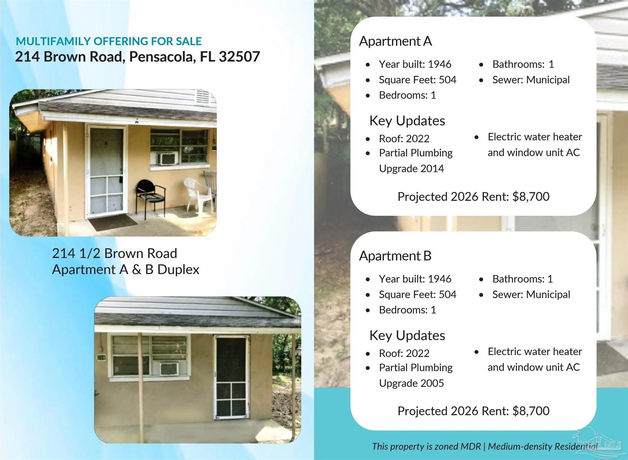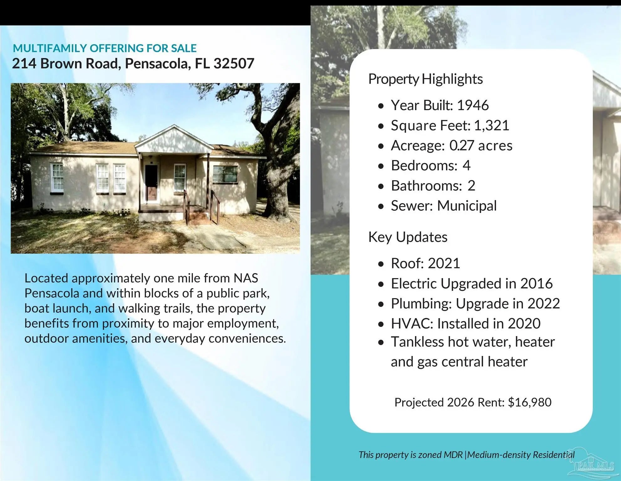 214 Brown Road presents a fully leased residential investment opportunity in Pensacola, Florida, featuring two income-producing buildings on one parcel. The property includes a 4-bedroom, 2-bath single-family home and a duplex consisting of two 1-bedroom, 1-bath units, offering a unit mix that appeals to a broad tenant base. The main residence at 214 Brown Road is equipped with gas heat and a gas water heater, with water and sewer service provided by ECUA. It is 1,321 square feet and rents for $1,415 per month. The duplex at 214 ½ Brown Road (Units A & B) features two approximately 504-square-foot apartments, each with window air conditioning and individual layouts. Each Space rents for $735.00 per month. Located approximately one mile from NAS Pensacola and within blocks of a public park, boat launch, and walking trails, the property benefits from proximity to major employment, outdoor amenities, and everyday conveniences. With all units currently rented, this property provides immediate income and long-term rental upside in a strong demand area.
