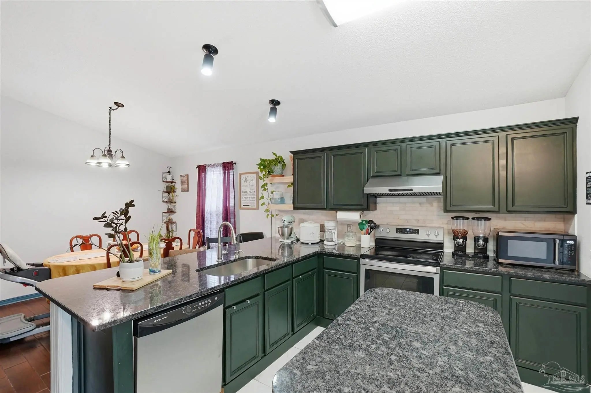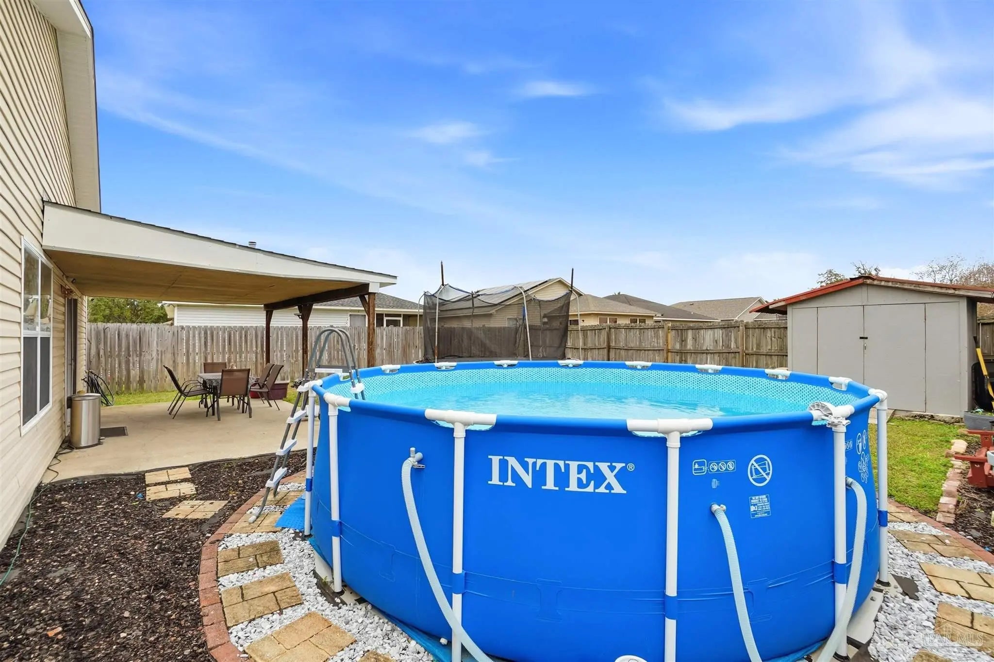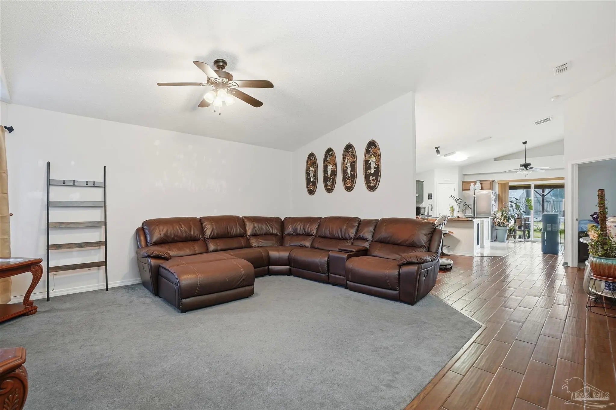 Welcome to coastal living in Navarre just 4 miles from the beach. This home offers a spacious, fully fenced backyard with a covered porch area, perfect for relaxing or entertaining year-round. Inside, the open floor plan is highlighted by vaulted ceilings and a bright, inviting living area. The kitchen overlooks both the living and dining spaces and features a breakfast bar, generous counter space, a pantry, and a layout designed for connection and ease. The primary suite is thoughtfully separated from the additional bedrooms, offering privacy and comfort. The en-suite bath includes a walk-in closet, double vanity, and a garden tub for unwinding at the end of the day. Conveniently located within 2 miles of Publix, dining, and shopping along US-98 and less than 4 miles from Navarre Beach, this home combines everyday convenience with easy access to the coast.