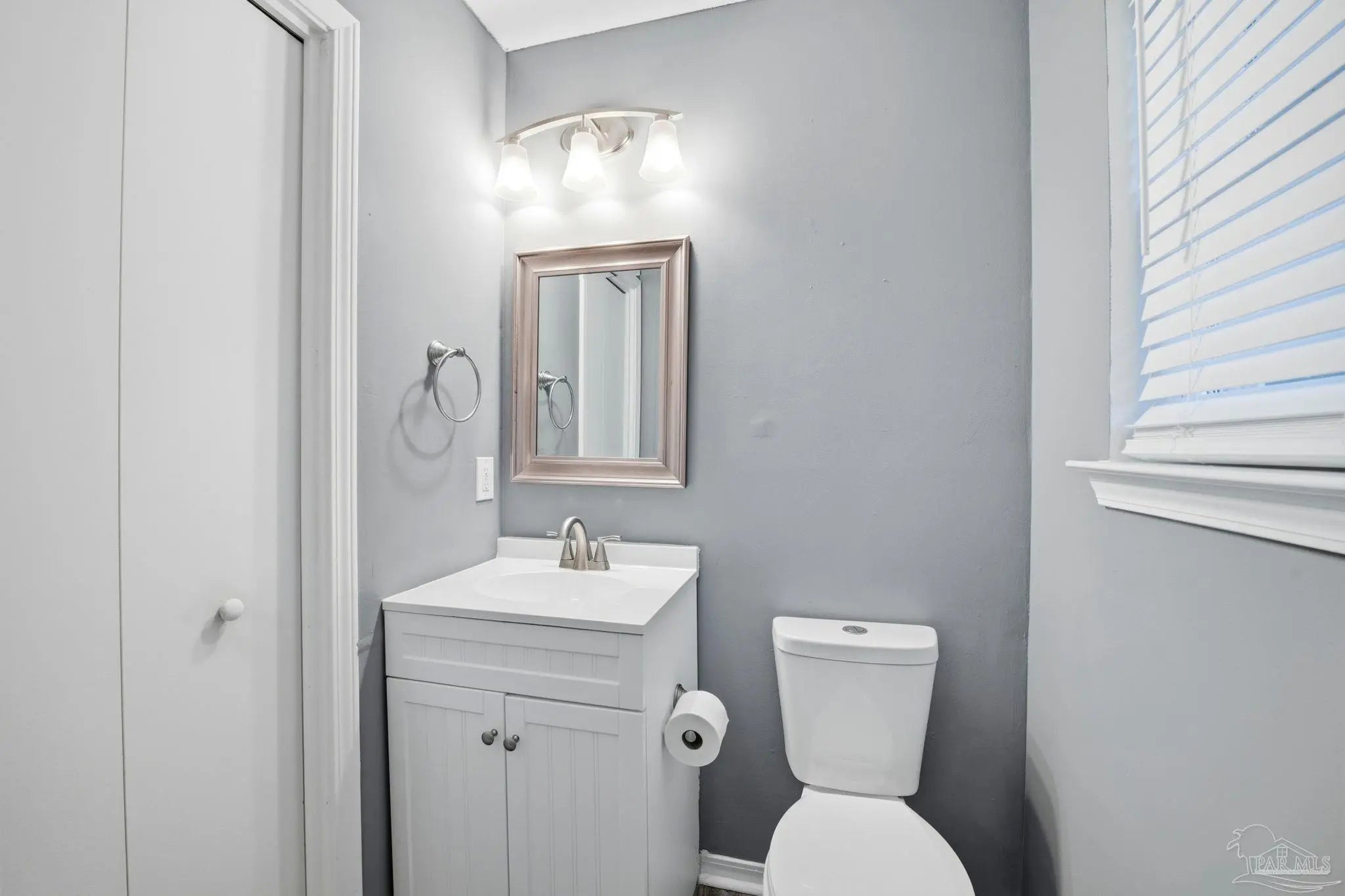 One-car garage, situated on a 0.32-acre lot with a spacious backyard. The property features an updated kitchen and bathrooms, interior and exterior paint, laminate flooring, and updated lighting and ceiling fans throughout. The primary bathroom includes a half bath with a cabinet featuring a granite countertop, mirror, lighting, and towel accessories. The hall bathroom offers a cabinet with granite countertop, mirror, and updated lighting