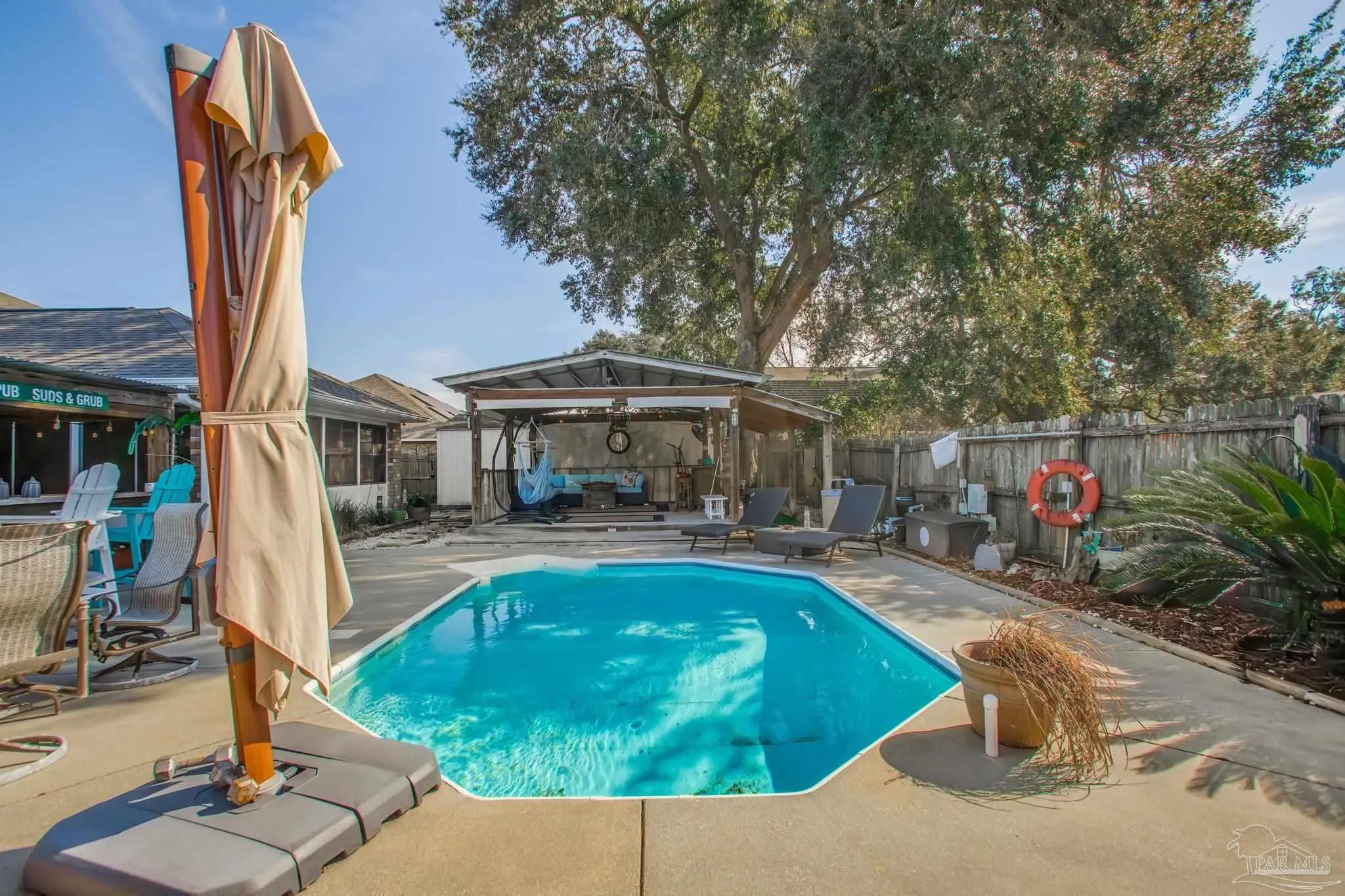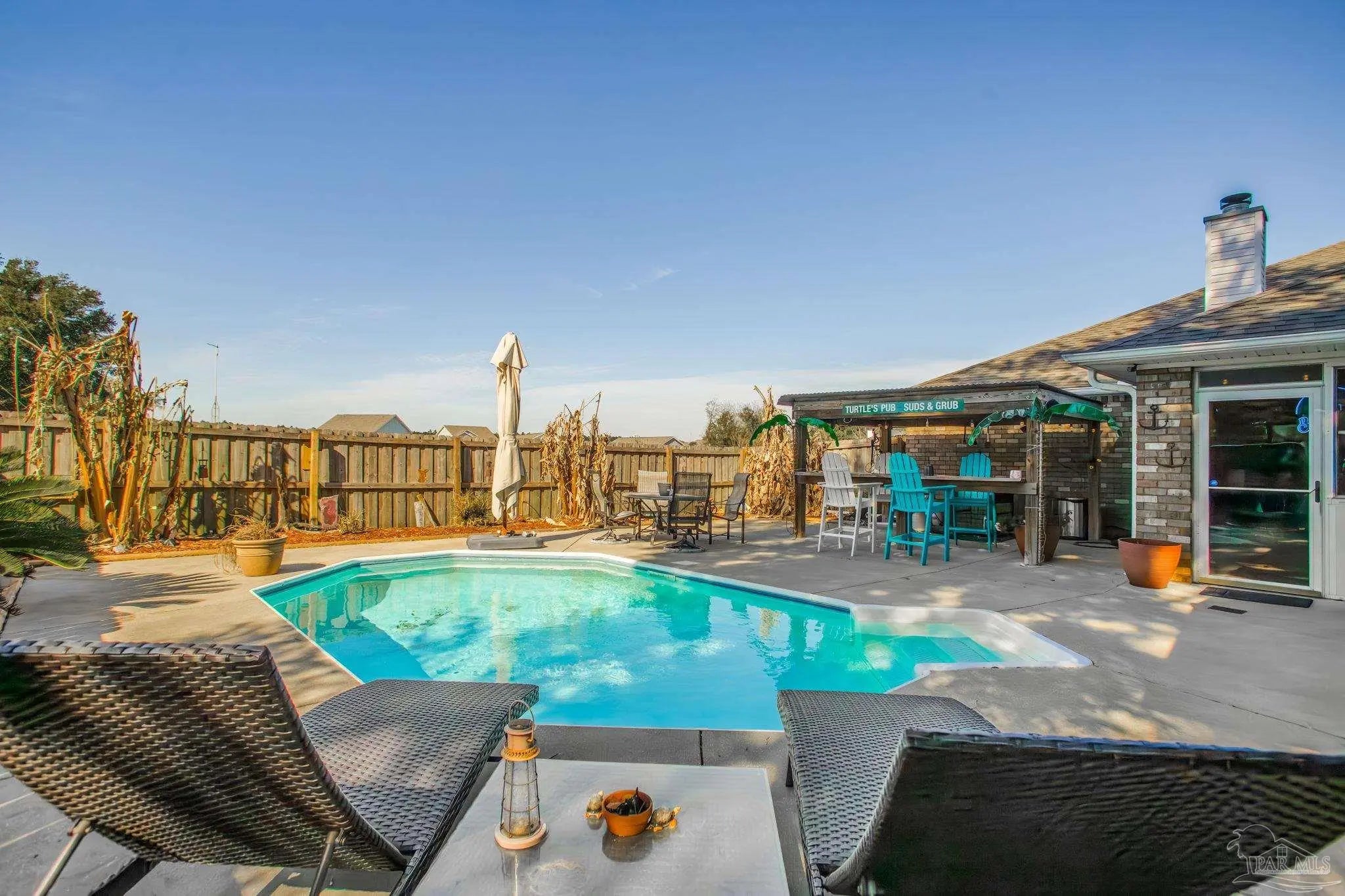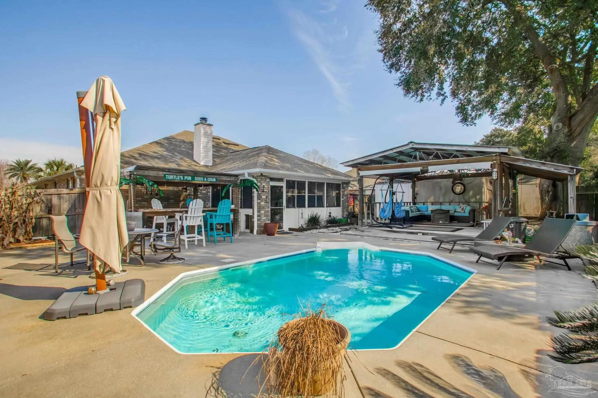 Located on a corner lot in the Spencer Ridge West neighborhood, this well-maintained 4 bedroom, 3 bathroom brick home offers 2,476 square feet of bright, open living space and an exceptional backyard built for entertaining. The main living area features vaulted ceilings and abundant natural light, flowing seamlessly into the kitchen and dining spaces. The kitchen includes stainless steel appliances, a large island, generous cabinetry, and an oversized walk-in pantry, providing both function and storage. A formal dining room adds flexibility and features a charming architectural shelf detail. The spacious primary suite offers a private retreat with a double vanity, soaking tub, and separate shower. Additional bedrooms are well-sized, and the home includes a large laundry room with extra storage. Interior spaces feel open and airy throughout, with multiple areas that can easily adapt to work-from-home, hobby, or guest needs. Step outside to an impressive outdoor living setup featuring a gorgeous in-ground pool, a covered patio with lighting and ceiling fan, a screened-in porch, and an additional covered outdoor bar area ideal for gatherings year-round. A detached shed provides convenient storage for yard and pool equipment, while the stone walkways add charm and character to the backyard. Recent updates include a new roof, new AC, and new pool pump. With a two-car garage, attractive curb appeal, and a location within walking distance to shops, dining, and everyday conveniences, this home offers comfort, space, and lifestyle. Schedule your private showing today!