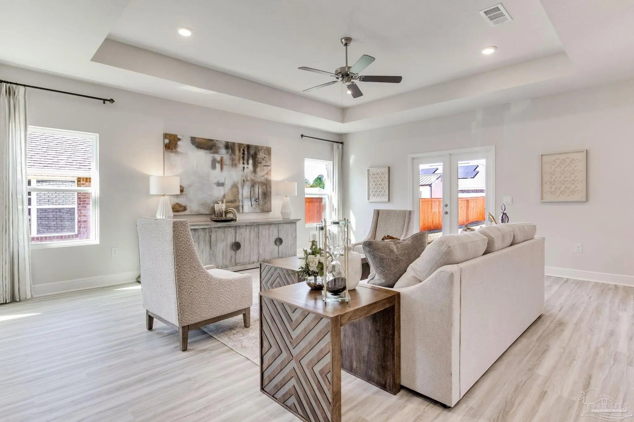 Welcome to The Grove at Berryhill! The Camden plan features a dedicated dining area, a large study, four bedrooms, and an extra garage space that can fit a third car or a golf cart. As you walk through this beautiful home, you'll notice the elegant EVP flooring that flows throughout, paired with cozy carpet in the bedrooms. The foyer opens up to two roomy bedrooms, which share a well-equipped bathroom that includes a double quartz vanity and a handy shower/tub combination. Bedroom 1 serves as a peaceful retreat, complete with a spacious en-suite bathroom featuring a relaxing garden tub, a separate shower, and a large walk-in closet. The kitchen boasts a central island with a sink, stylish cabinetry, a corner pantry, and sleek stainless-steel appliances. This home is equipped with our Smart Home Connected package, integrating modern conveniences into your everyday life. Located near top-rated schools, everyday conveniences, and Blackwater River, a natural gem perfect for outdoor activities such as kayaking, canoeing, and fishing. For those who enjoy beach days and coastal living, you are just 30 miles from the sugar-white sands of the Gulf Coast.