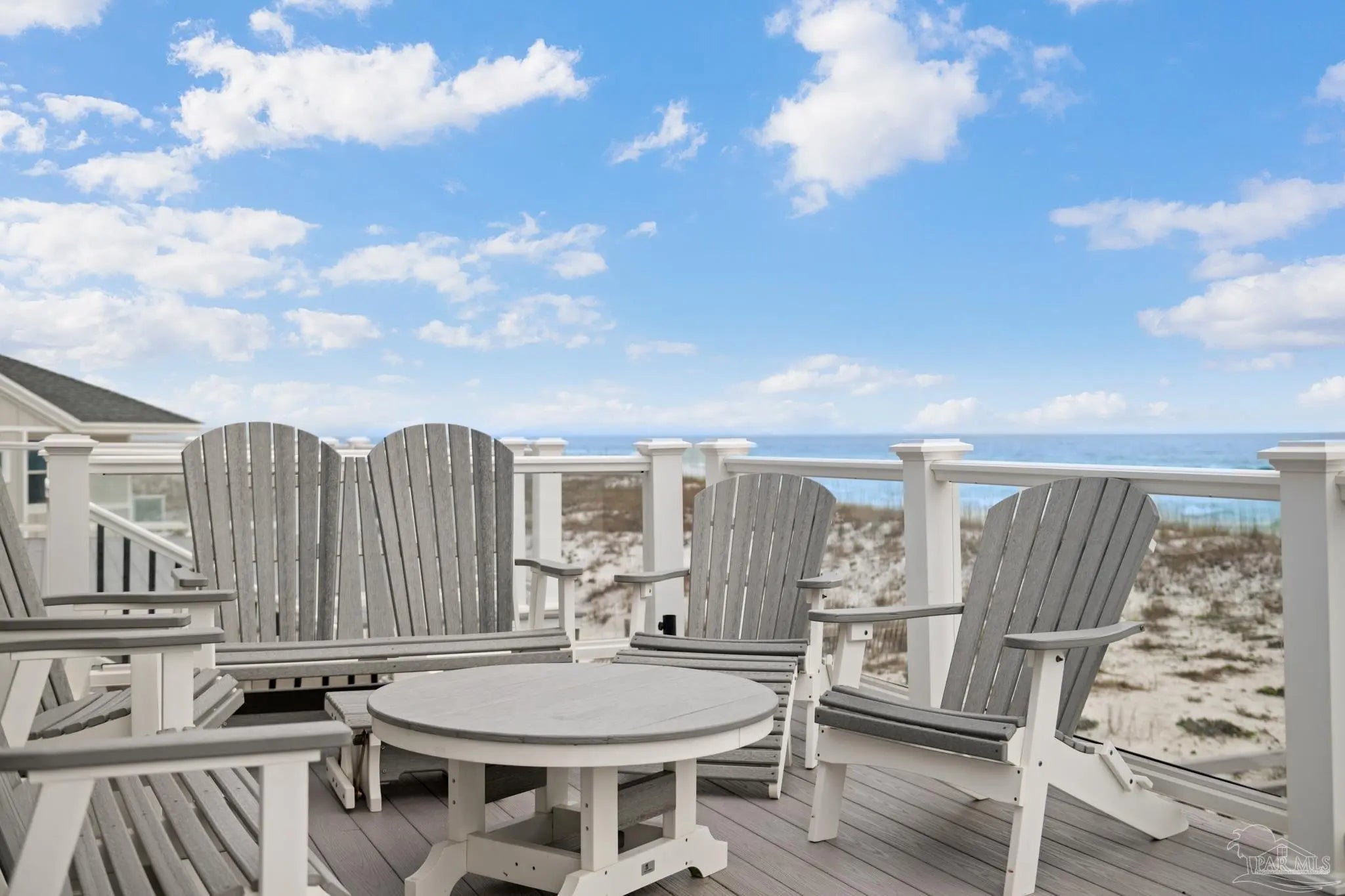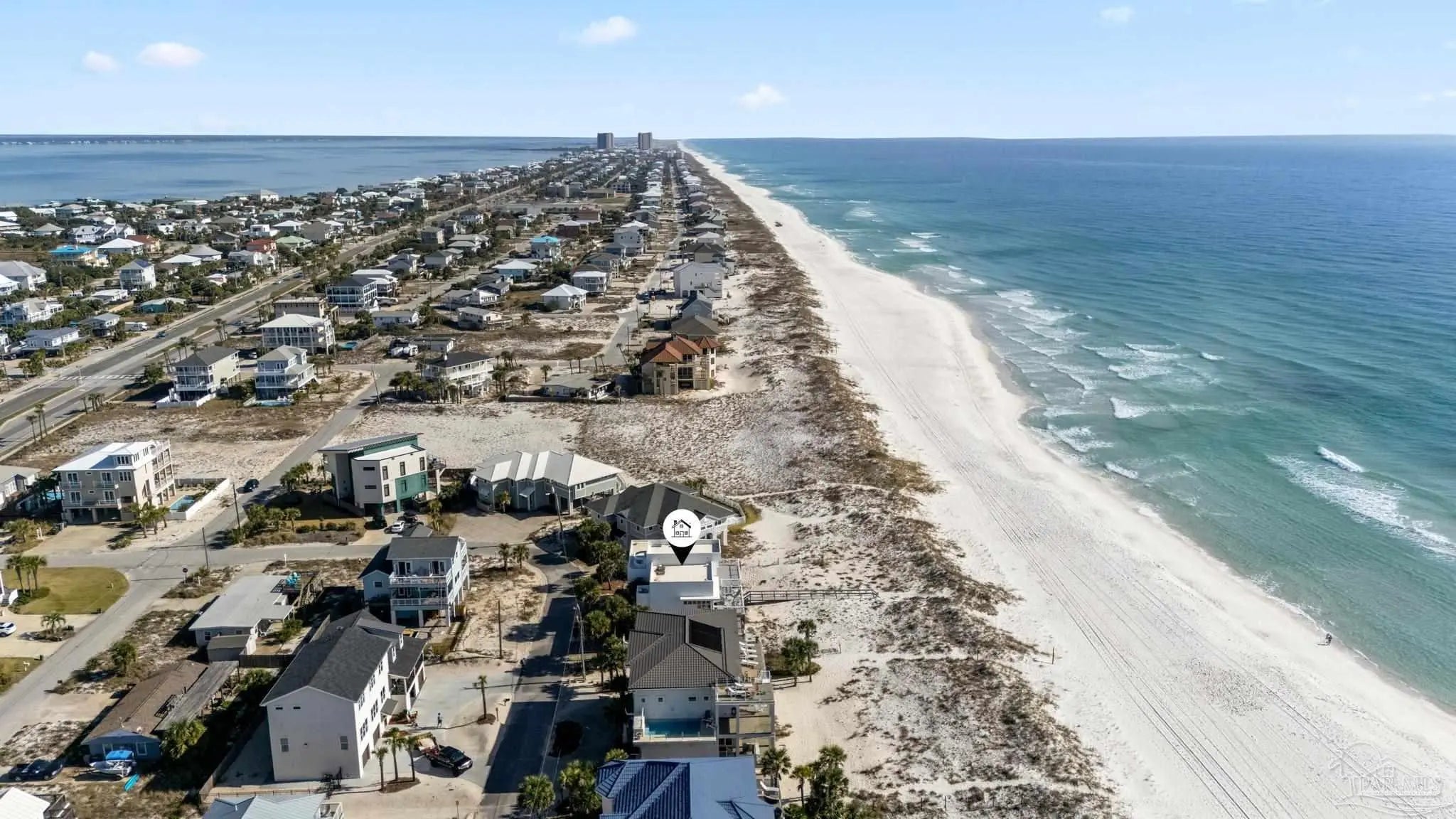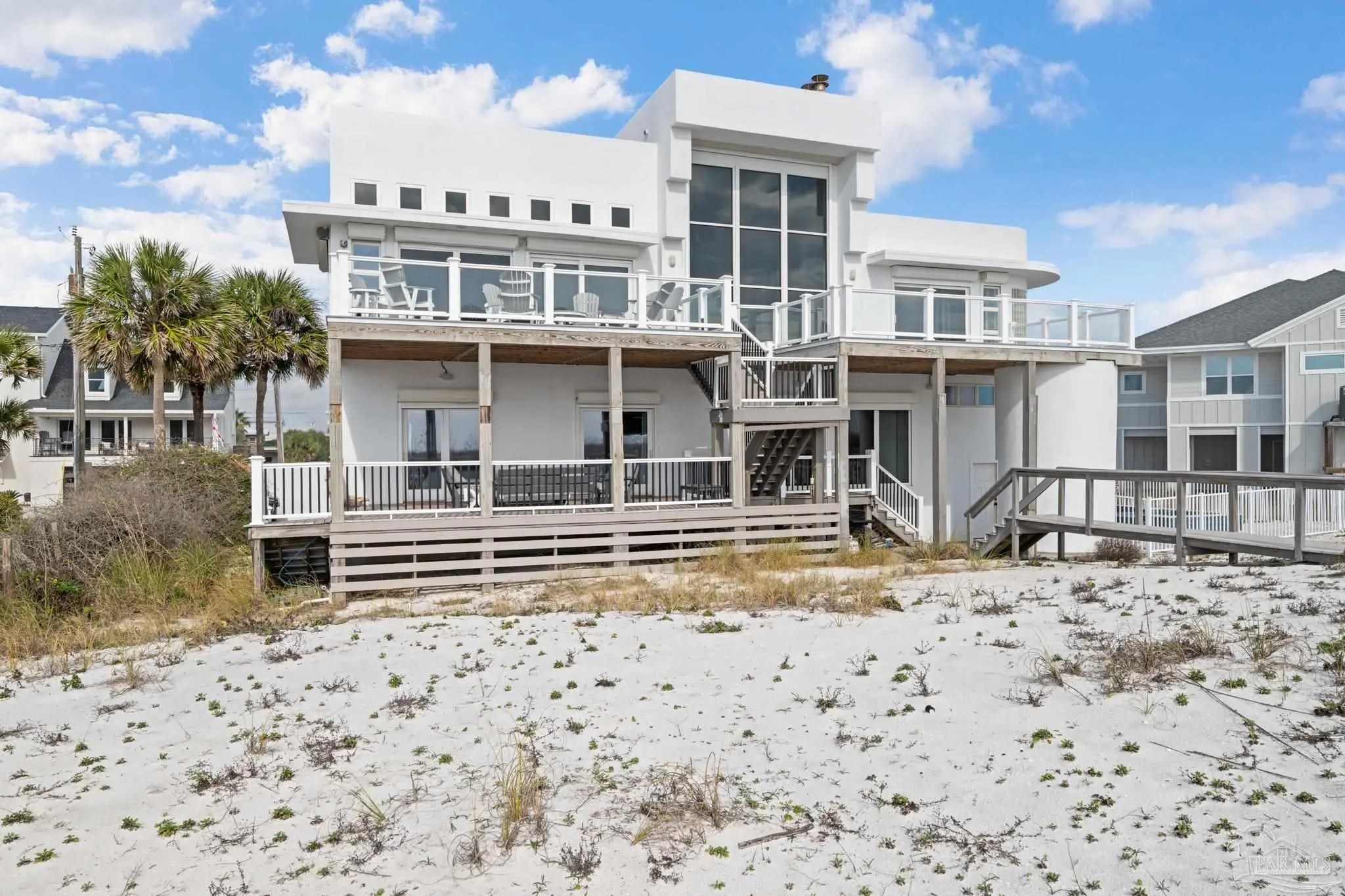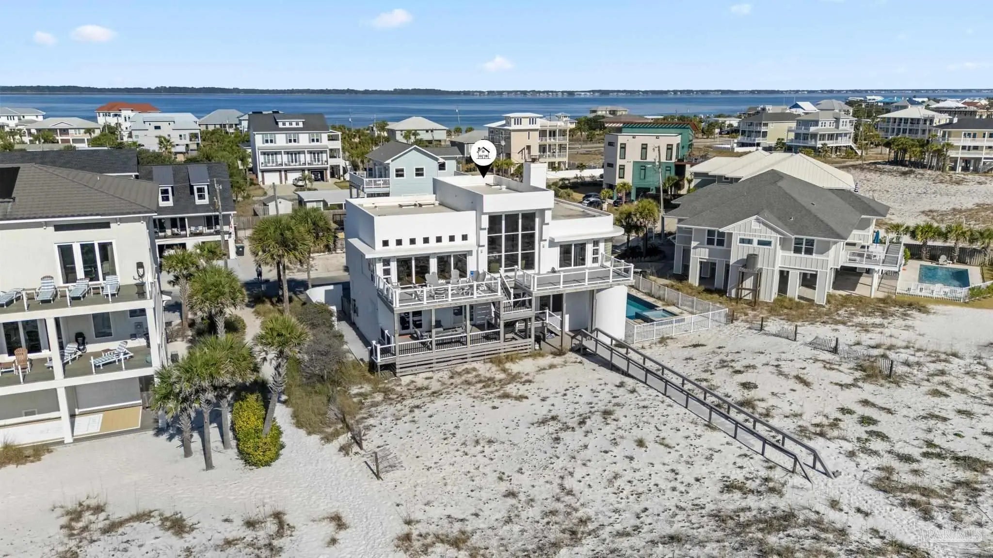 Experience the ultimate in Gulf-front luxury with this stunning Pensacola Beach retreat, perfectly positioned on the sugar-white sands and emerald waters of the Gulf of Mexico. This fully furnished 4-bedroom, 4-bathroom residence spans approximately 3,500 square feet and offers breathtaking water views from nearly every room. Designed for both relaxed coastal living and exceptional rental performance, the home generates over $228,000 in annual rental income.The open-concept main living area is thoughtfully located on the second floor to maximize panoramic views, featuring wall-to-wall windows that flood the space with natural light and frame the Gulf like a living work of art. The chef’s kitchen, dining area, and spacious living room flow seamlessly onto expansive outdoor decks, ideal for entertaining or simply soaking in the coastal scenery. Outside, a private saltwater gunite pool provides the perfect place to unwind after a day at the beach. The luxurious primary suite is a true sanctuary, complete with two walk-in closets, a cozy fireplace, and sliding glass doors leading to a private patio with stunning water views. With its prime Gulf-front location, impressive income potential, and timeless coastal design, this Pensacola Beach home is a rare opportunity to own an exceptional beachfront investment and personal escape.