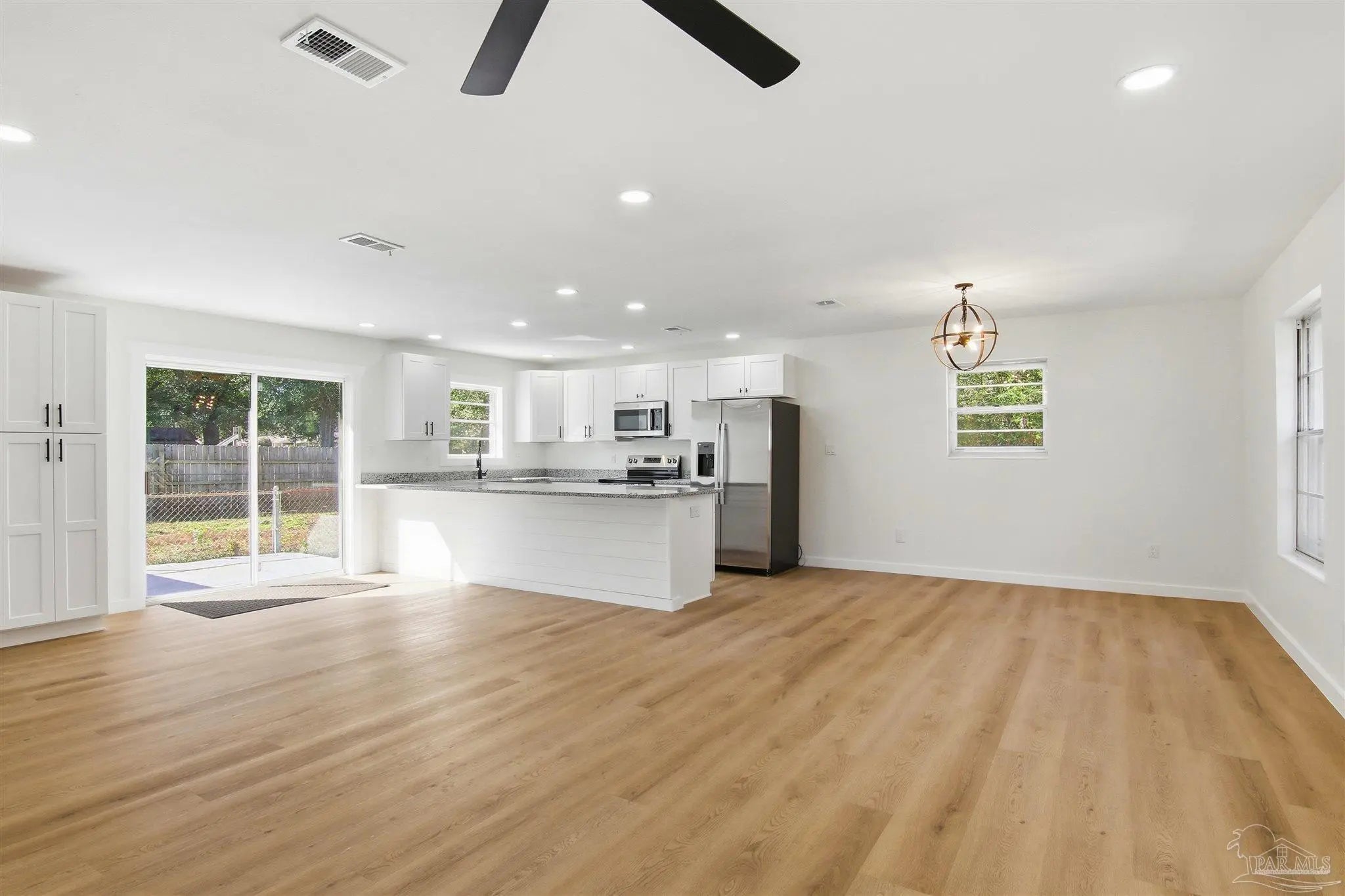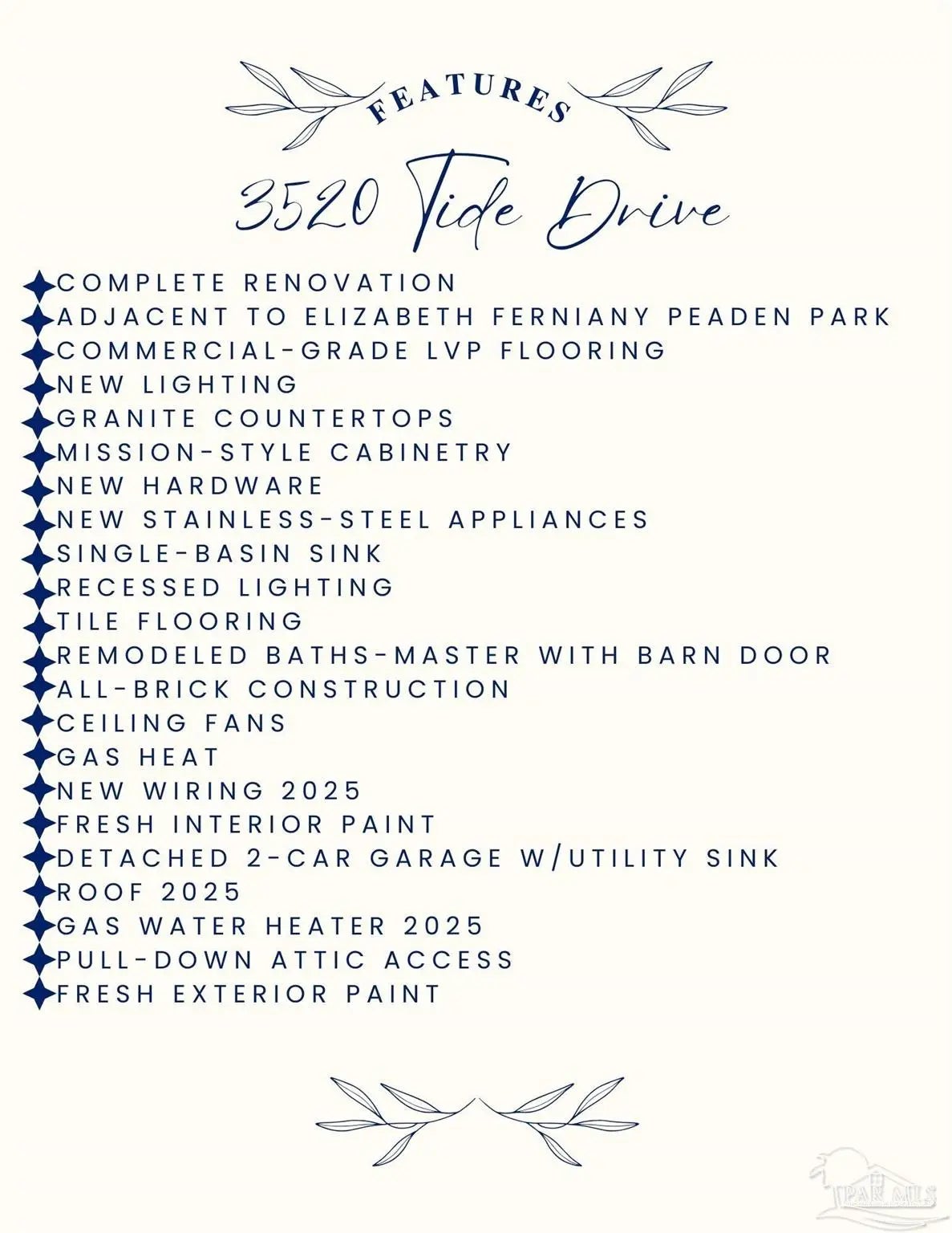 OPEN HOUSE JANUARY 31ST 1 TO 3 !!!!!!! FABULOUS RENOVATION! New lighting throughout...Granite countertops...New Mission-style cabinetry & hardware...New stainless-steel appliances...Commercial-grade luxury vinyl plank flooring...Ceiling fans...Tile flooring...Completely remodeled baths...Master Bath features hanging barn door...All-brick exterior freshly painted...Gas heat...Detached two-car garage w/utility sink & pull-down attic access...NEW WIRING 2025...NEW ROOF 2025...GAS WATER HEATER 2025...Property backs up to Eastgate Elizabeth Ferniany Peaden Dog Park & may be accessed from the backyard...Just minutes from Pensacola International Airport, Cordova Mall, eateries & I-10! You're going to love it!