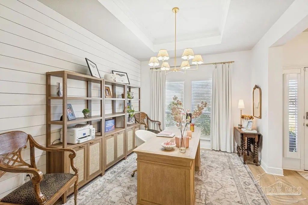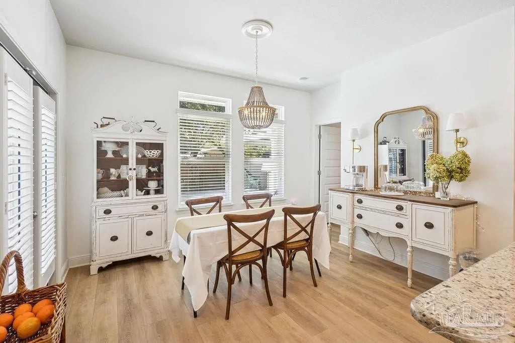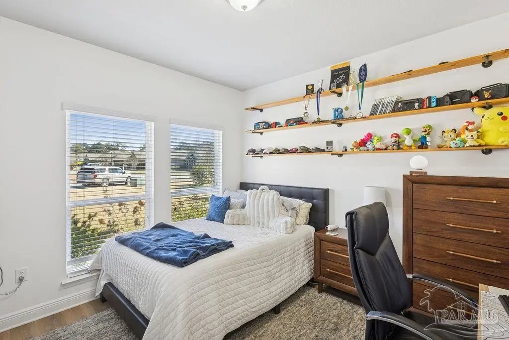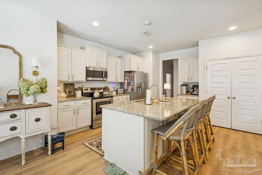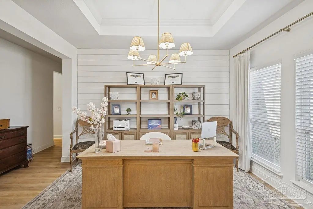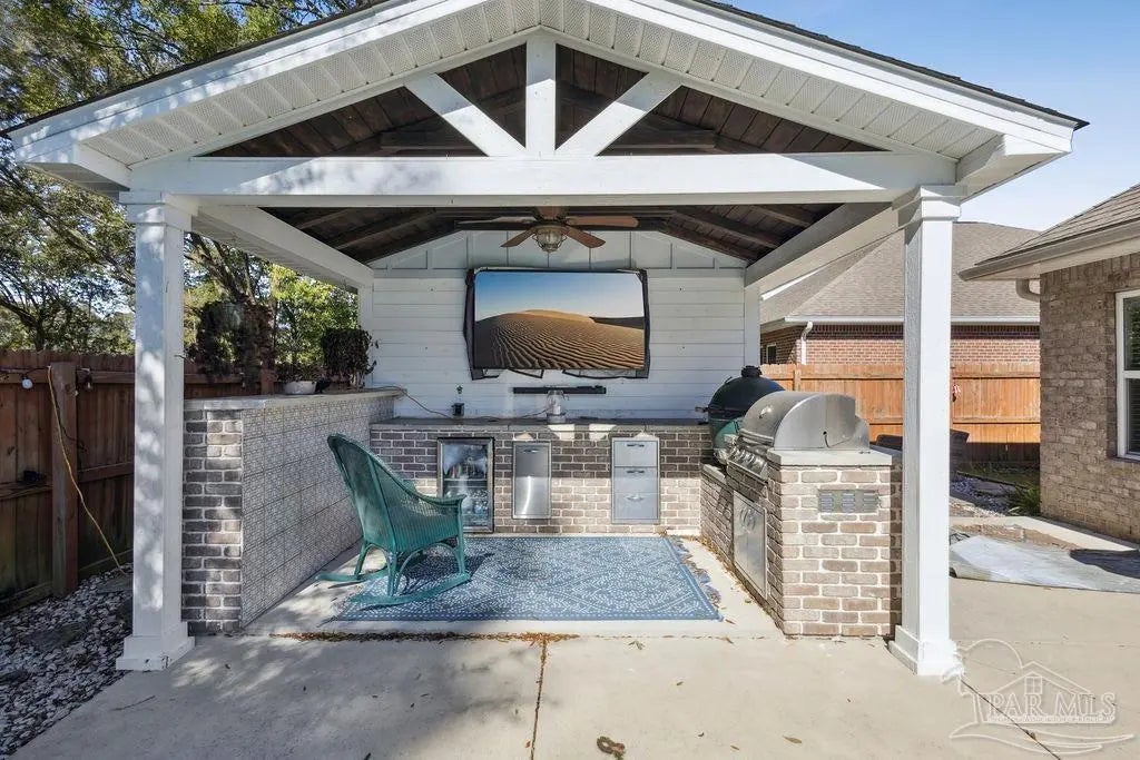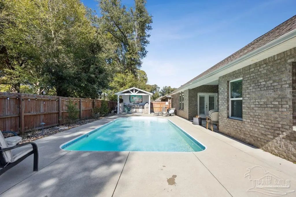 Located in Pace, Florida, this 4-bedroom, 3.5- bath POOL home with a dedicated study offers a functional open floor plan and a backyard designed for everyday enjoyment, complete with an inground pool and outdoor kitchen. Offering a thoughtful split layout with the primary suite privately located at the rear of the home. Two additional bedrooms share a Jack-and-Jill bath, while the fourth bedroom is tucked away with hall access to the third full bath, making it ideal for guests or a private secondary suite. The study provides flexible space for working from home or a quiet retreat. The kitchen includes a large island and opens to the great room with a double tray ceiling and designer ceiling fan. Double French doors connect the breakfast area to the covered back porch, creating easy indoor-outdoor living that leads to the pool and outdoor kitchen. Additional highlights include luxury vinyl plank flooring throughout, fresh interior paint, a shiplap accent wall in the dining area, gutters, and full irrigation. Conveniently located just minutes from shopping, dining, and local parks, this home is move-in ready and offers comfort, space, and functionality in a desirable Pace location.
