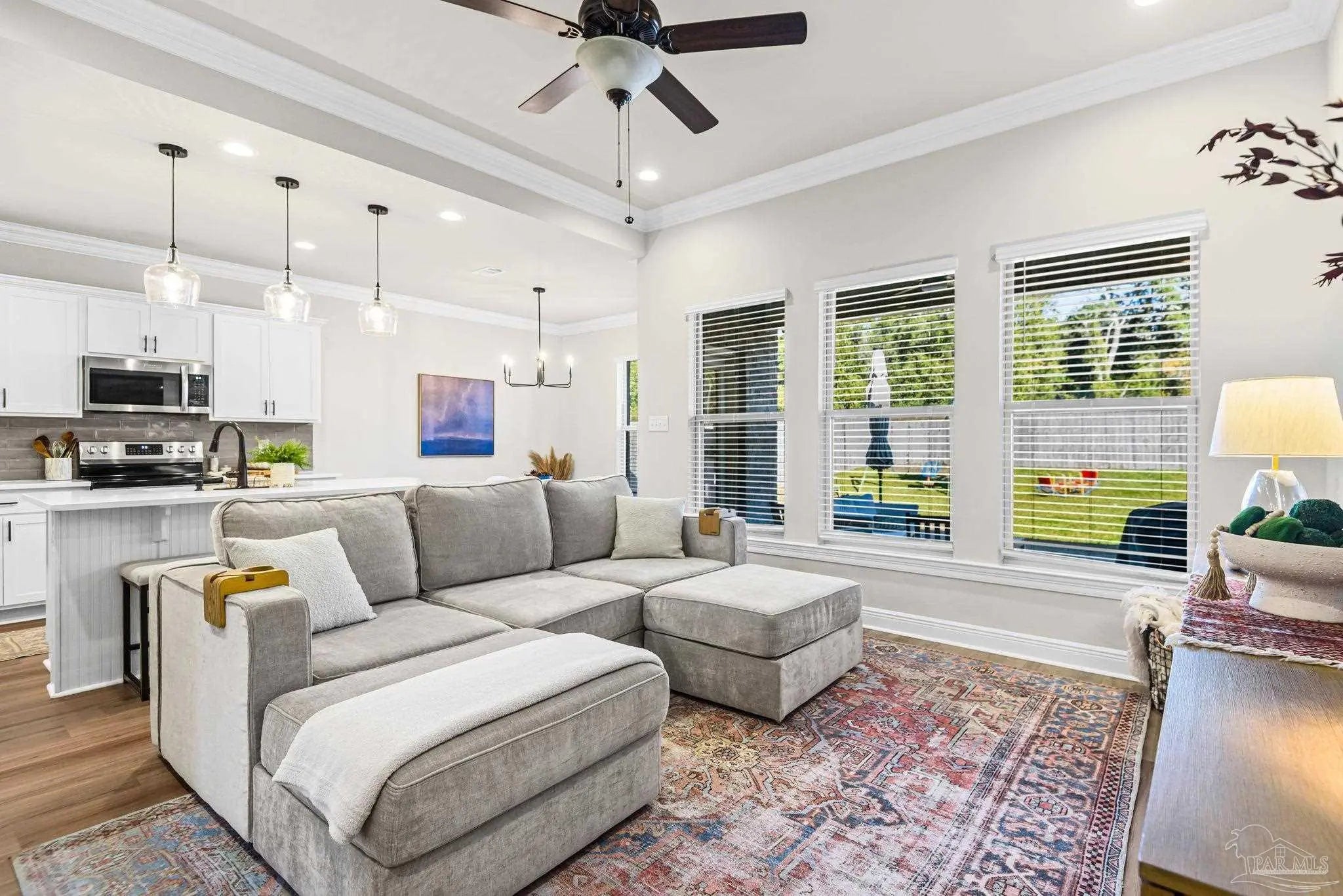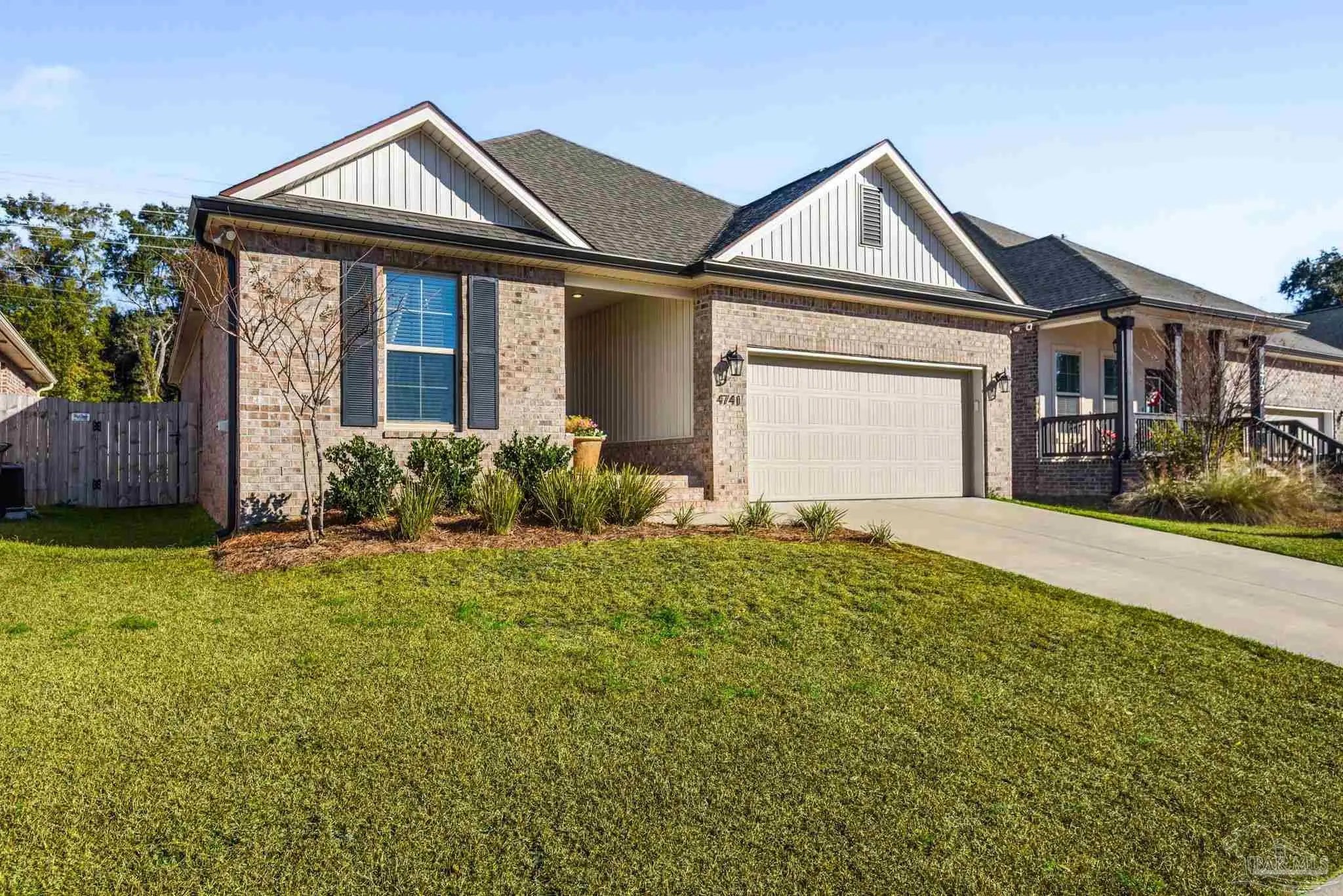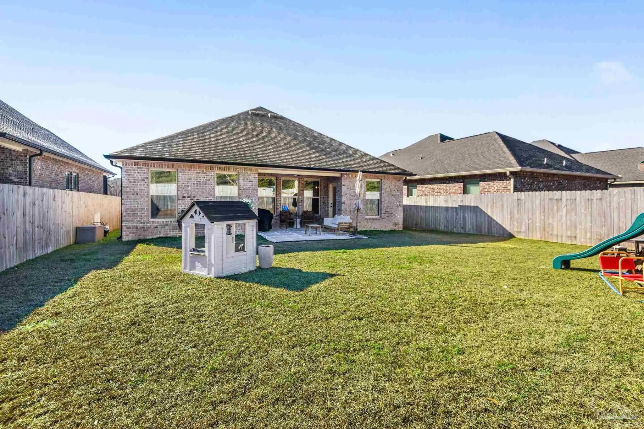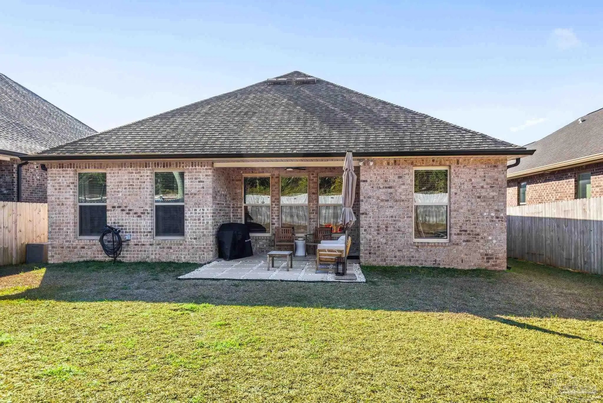 May I have the pleasure of presenting this VERY attractive and well-kept THREE-bedroom, TWO-bath GEM, nestled away in the welcoming Southern Palms neighborhood of Pace, Florida! This beautiful home is absolutely GORGEOUS! Featuring over 1,500 square feet of thoughtfully designed living space, it’s perfect for comfort, style, and entertaining! As you step inside, you are immediately greeted by well-designed open spaces, appealing color palettes, accents, and abundant natural light throughout. Walk with me toward the grand room, and your attention will first be drawn upward to the high 9-foot tray ceilings wrapped in crown molding, then downward to the beautiful luxury vinyl plank flooring that blankets the entire home! The open-concept kitchen is delightful for cooking family meals and hosting guests. An oversized island, polished quartz countertops, stainless steel appliances, a custom tile backsplash, plenty of cabinetry, and a walk-in pantry await! Tucked away is a generously sized private primary suite—a perfect sanctuary after a long day. The primary bath features double vanity sinks, a walk-in shower, and a garden soaking tub to help wash the day away! Across the home, the two secondary bedrooms are generously sized, each offering spacious closets and ample storage. Relaxation awaits as you step outside under your shaded, covered lanai! The backyard is wide open with tons of room to stretch your legs—perfect for outdoor dining, picking fresh herbs from your garden, and watching the kiddos play! Additional highlights include no rear neighbors, a Wi-Fi-enabled Ecobee thermostat, hurricane window protection, rain gutters, and a transferable termite bond! TOP-rated schools, parks, shopping, dining, stunning sugar-white beaches, and military installations are all within easy reach. Schedule your showing today!