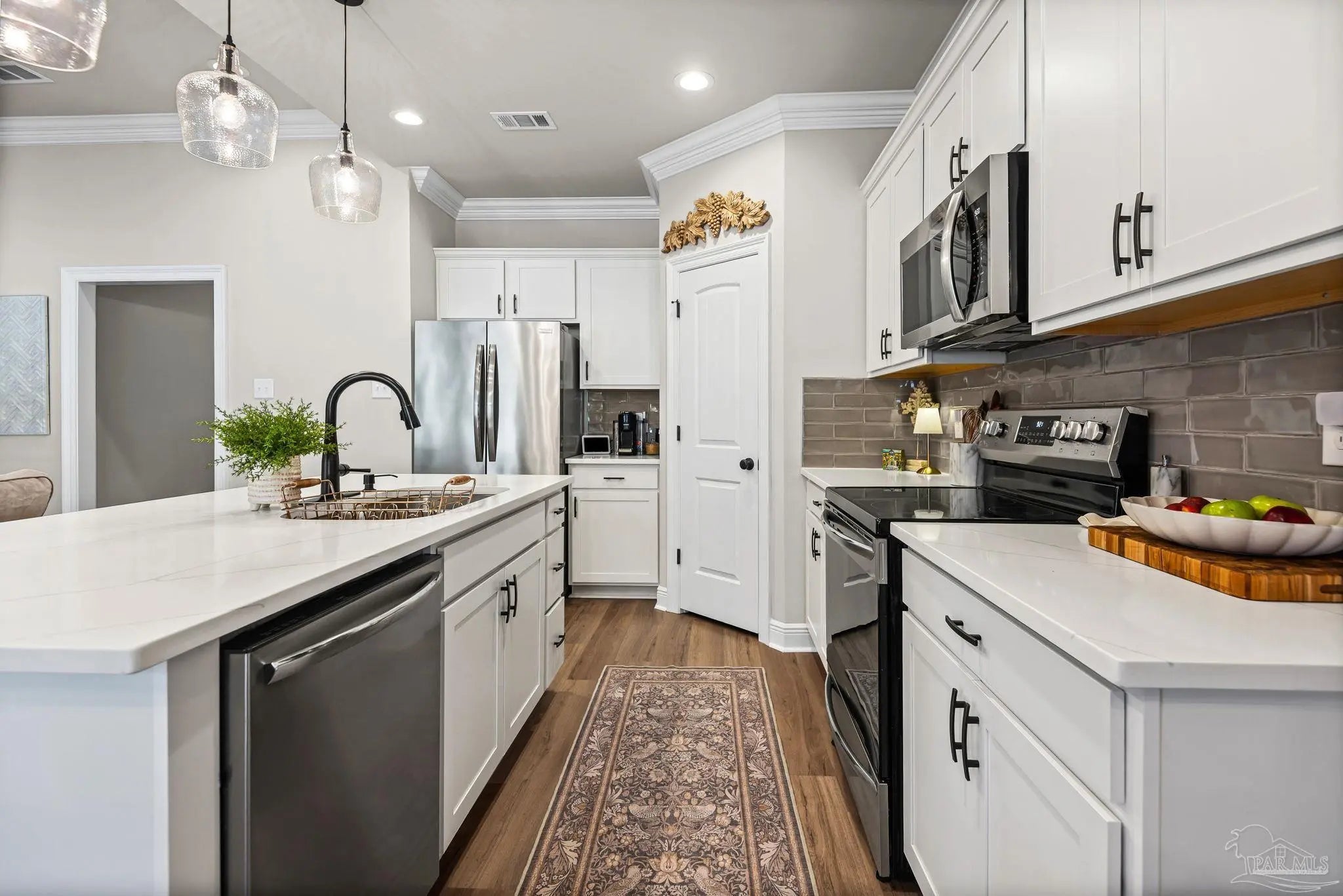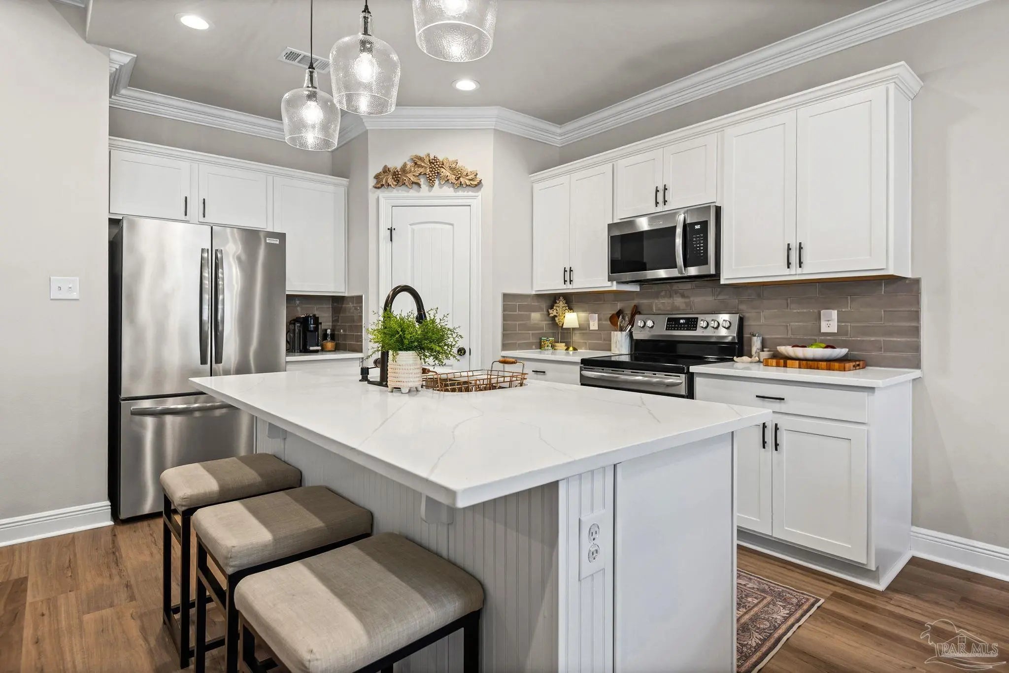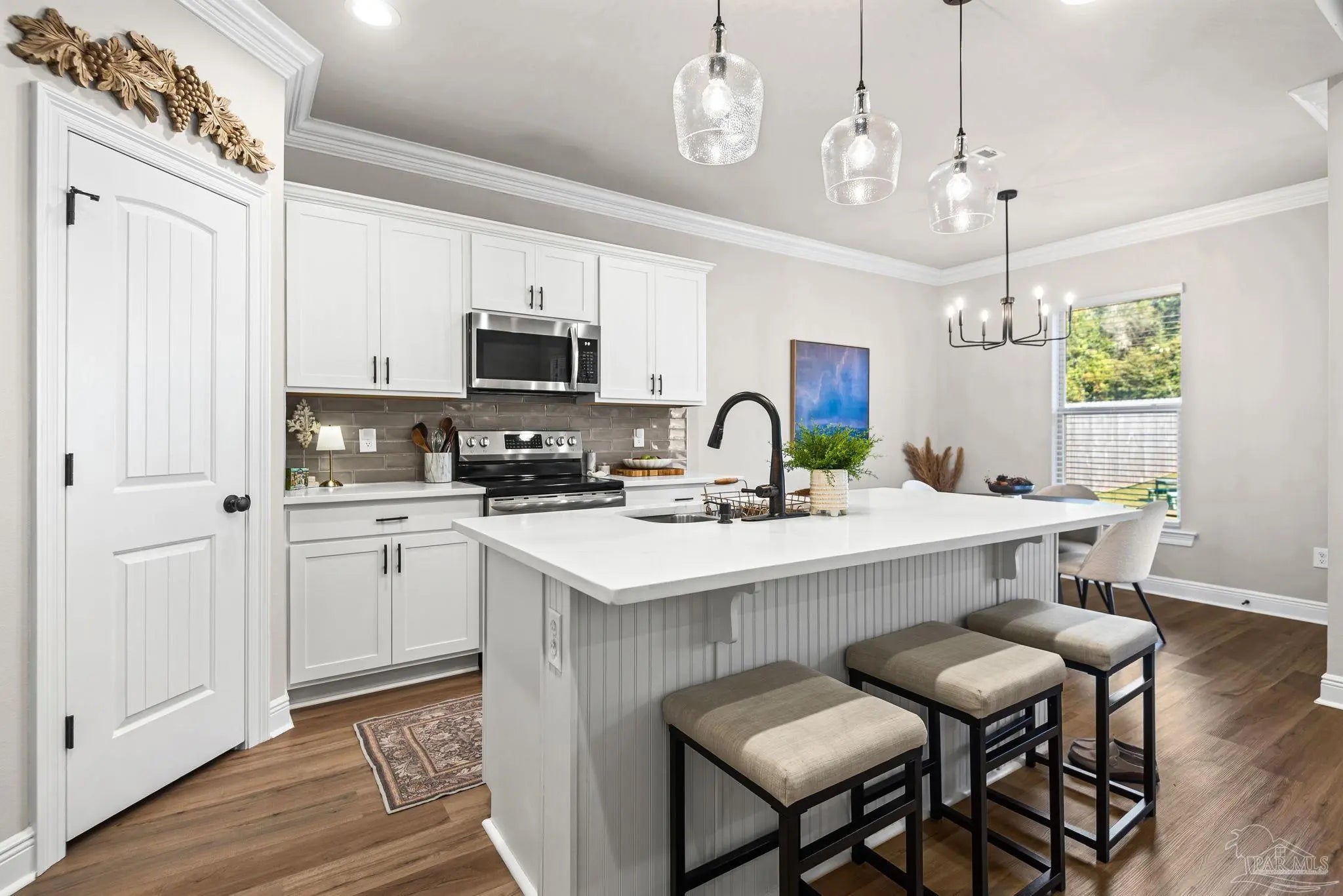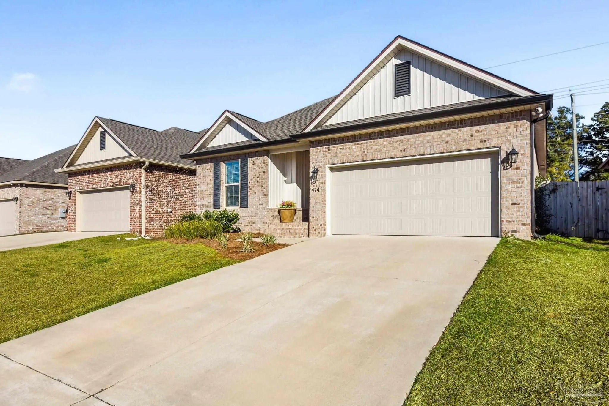 May I have the pleasure of presenting this VERY attractive and well-kept THREE-bedroom, TWO-bath GEM, nestled away in the welcoming Southern Palms neighborhood of Pace, Florida! This beautiful home is absolutely GORGEOUS! Featuring over 1,500 square feet of thoughtfully designed living space, it’s perfect for comfort, style, and entertaining! As you step inside, you are immediately greeted by well-designed open spaces, appealing color palettes, accents, and abundant natural light throughout. Walk with me toward the grand room, and your attention will first be drawn upward to the high 9-foot tray ceilings wrapped in crown molding, then downward to the beautiful luxury vinyl plank flooring that blankets the entire home! The open-concept kitchen is delightful for cooking family meals and hosting guests. An oversized island, polished quartz countertops, stainless steel appliances, a custom tile backsplash, plenty of cabinetry, and a walk-in pantry await! Tucked away is a generously sized private primary suite—a perfect sanctuary after a long day. The primary bath features double vanity sinks, a walk-in shower, and a garden soaking tub to help wash the day away! Across the home, the two secondary bedrooms are generously sized, each offering spacious closets and ample storage. Relaxation awaits as you step outside under your shaded, covered lanai! The backyard is wide open with tons of room to stretch your legs—perfect for outdoor dining, picking fresh herbs from your garden, and watching the kiddos play! Additional highlights include no rear neighbors, a Wi-Fi-enabled Ecobee thermostat, hurricane window protection, rain gutters, and a transferable termite bond! TOP-rated schools, parks, shopping, dining, stunning sugar-white beaches, and military installations are all within easy reach. Schedule your showing today!