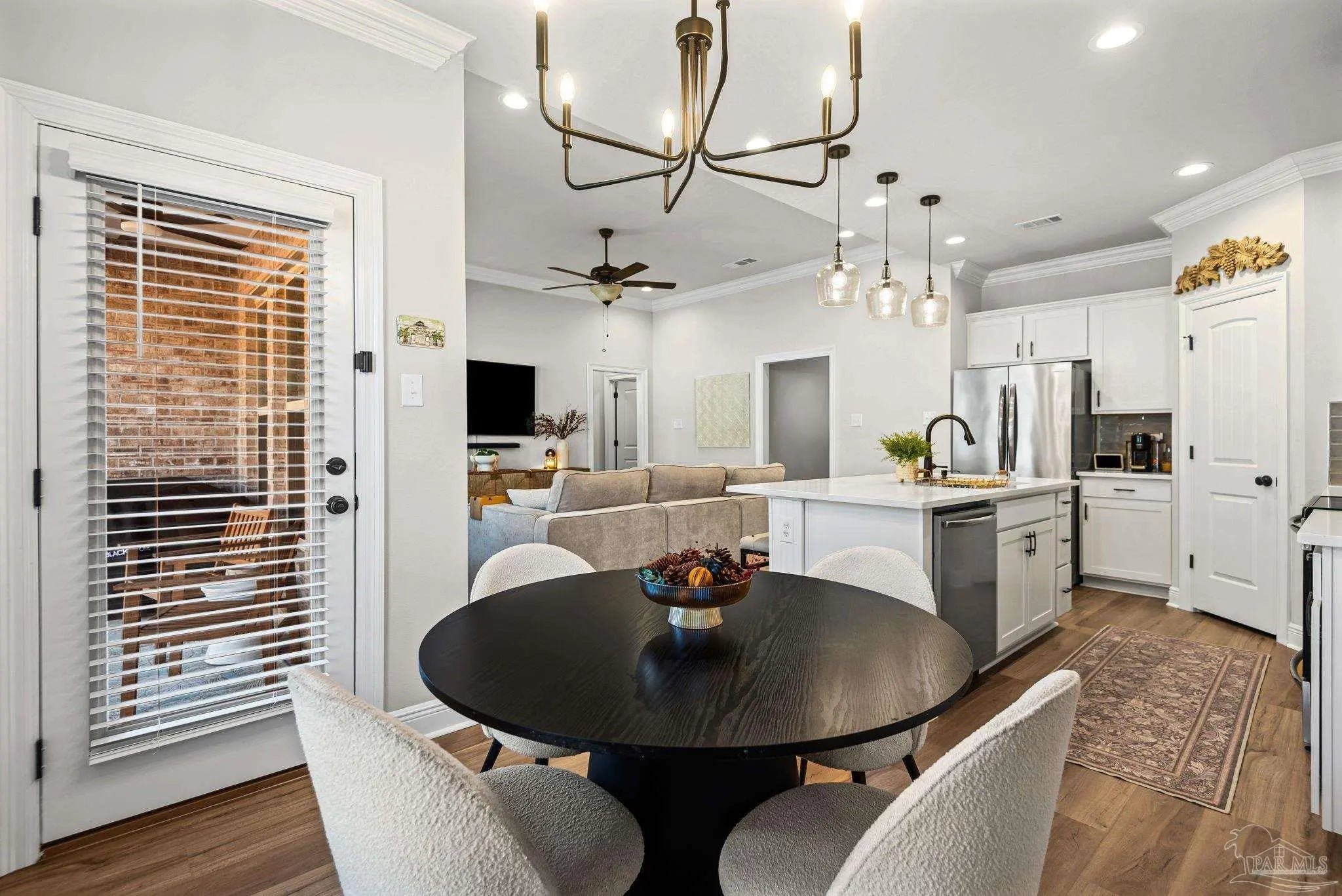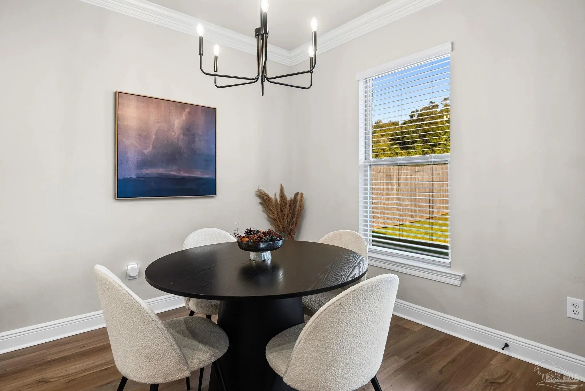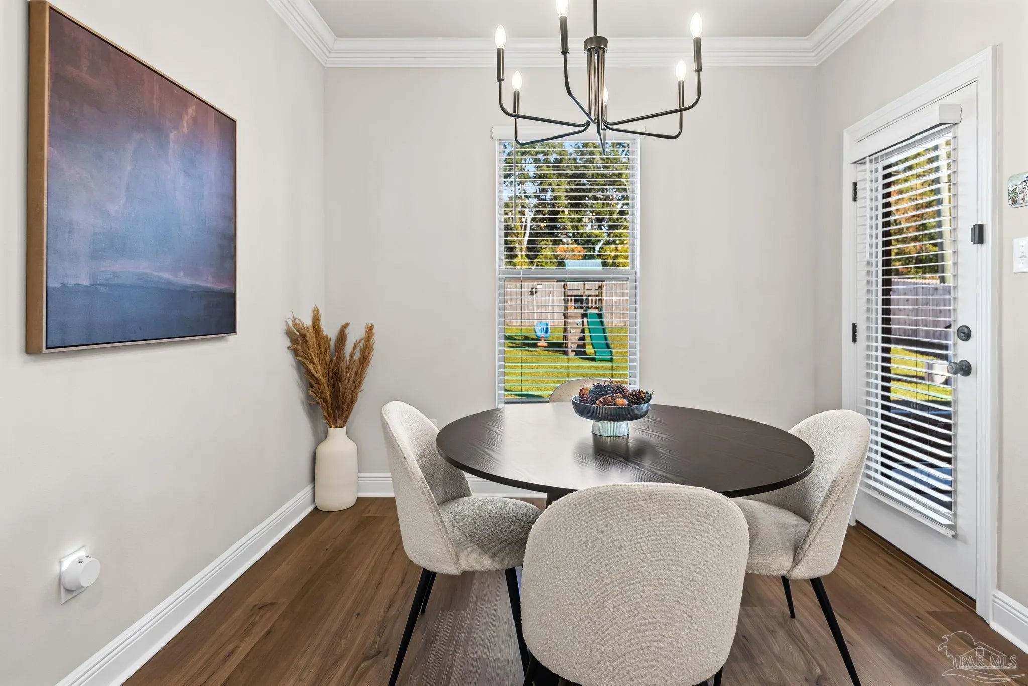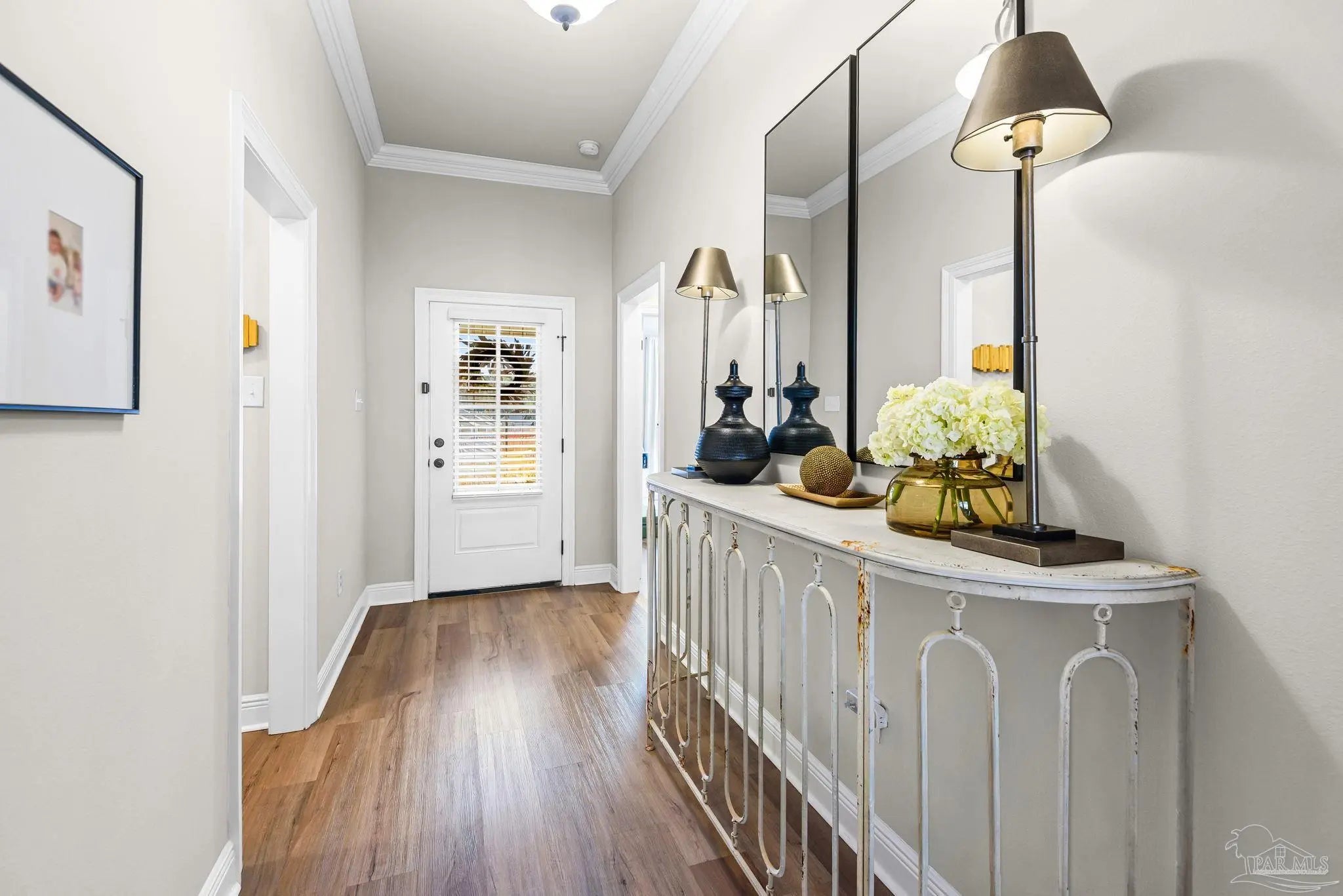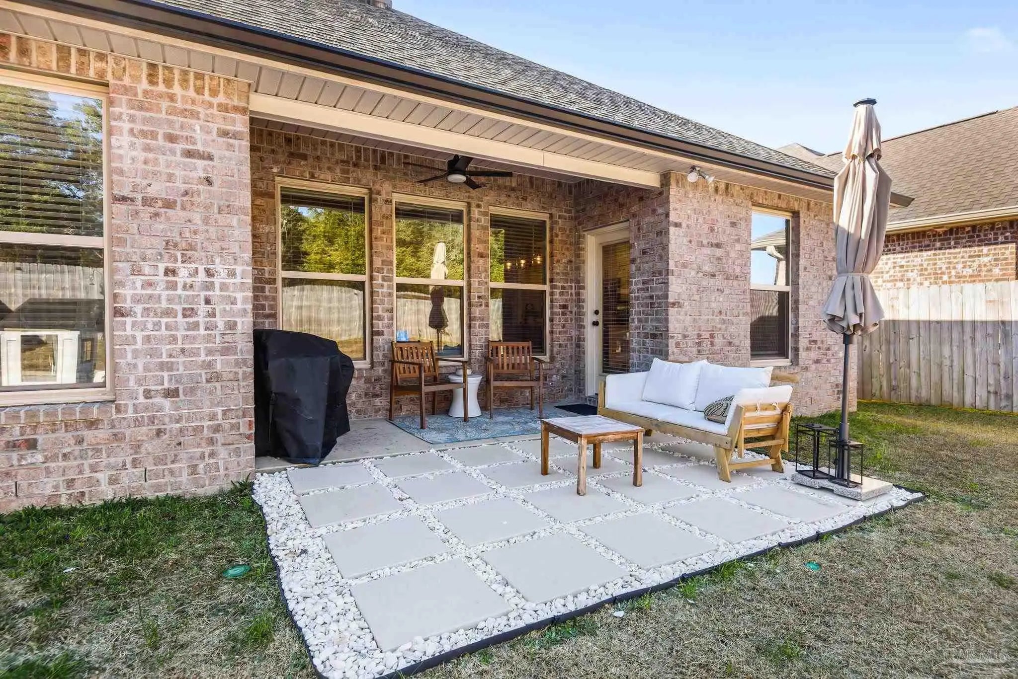 May I have the pleasure of presenting this VERY attractive and well-kept THREE-bedroom, TWO-bath GEM, nestled away in the welcoming Southern Palms neighborhood of Pace, Florida! This beautiful home is absolutely GORGEOUS! Featuring over 1,500 square feet of thoughtfully designed living space, it’s perfect for comfort, style, and entertaining! As you step inside, you are immediately greeted by well-designed open spaces, appealing color palettes, accents, and abundant natural light throughout. Walk with me toward the grand room, and your attention will first be drawn upward to the high 9-foot tray ceilings wrapped in crown molding, then downward to the beautiful luxury vinyl plank flooring that blankets the entire home! The open-concept kitchen is delightful for cooking family meals and hosting guests. An oversized island, polished quartz countertops, stainless steel appliances, a custom tile backsplash, plenty of cabinetry, and a walk-in pantry await! Tucked away is a generously sized private primary suite—a perfect sanctuary after a long day. The primary bath features double vanity sinks, a walk-in shower, and a garden soaking tub to help wash the day away! Across the home, the two secondary bedrooms are generously sized, each offering spacious closets and ample storage. Relaxation awaits as you step outside under your shaded, covered lanai! The backyard is wide open with tons of room to stretch your legs—perfect for outdoor dining, picking fresh herbs from your garden, and watching the kiddos play! Additional highlights include no rear neighbors, a Wi-Fi-enabled Ecobee thermostat, hurricane window protection, rain gutters, and a transferable termite bond! TOP-rated schools, parks, shopping, dining, stunning sugar-white beaches, and military installations are all within easy reach. Schedule your showing today!