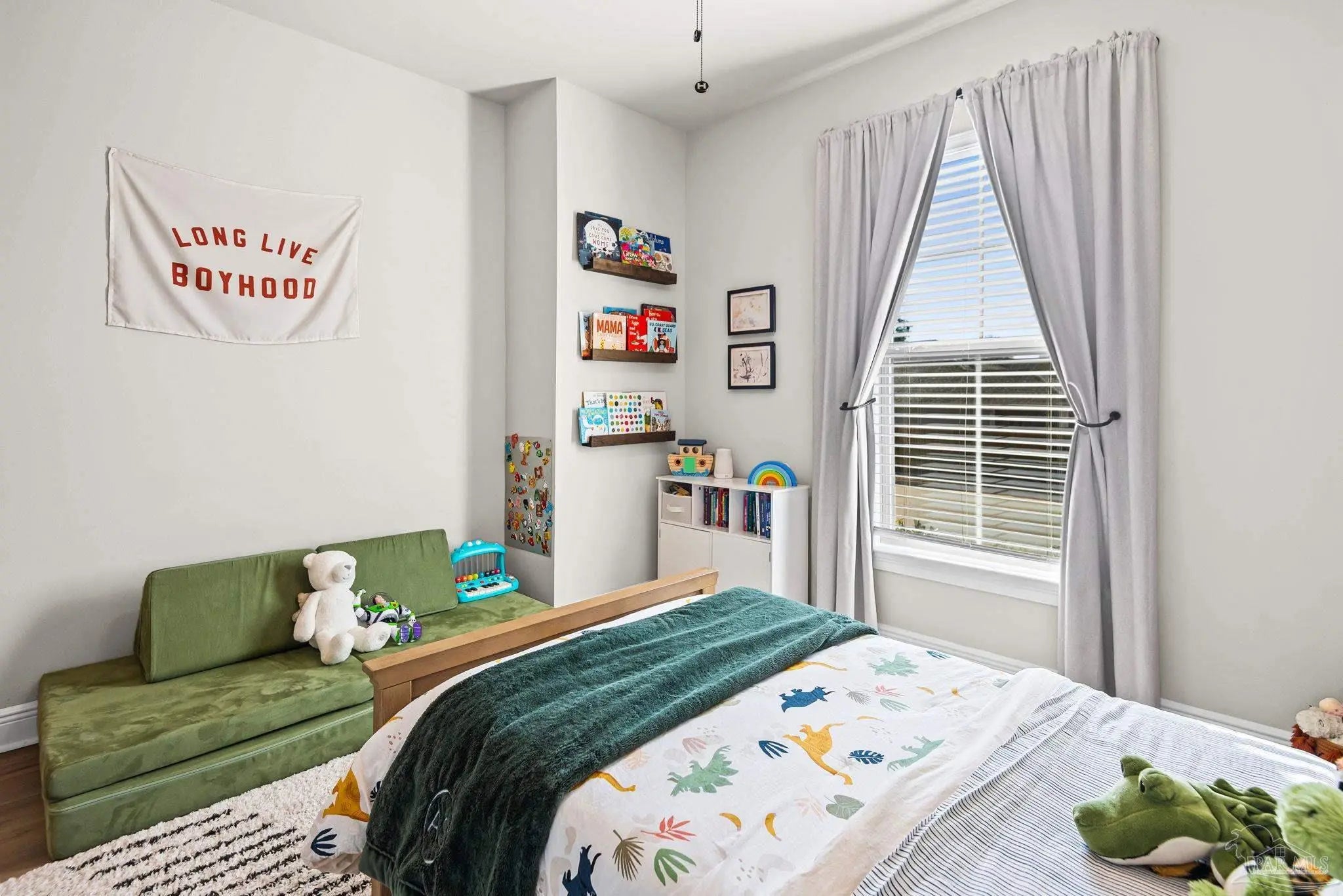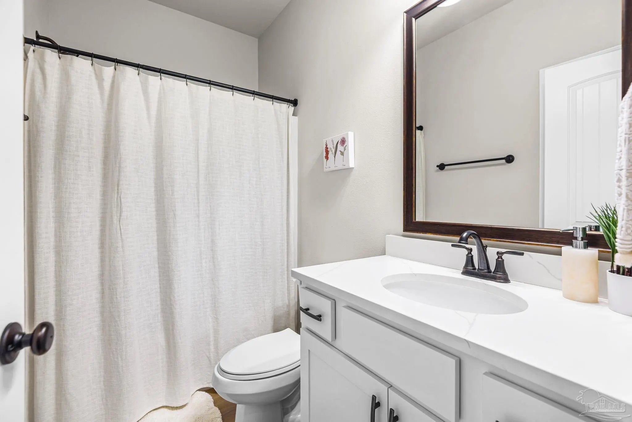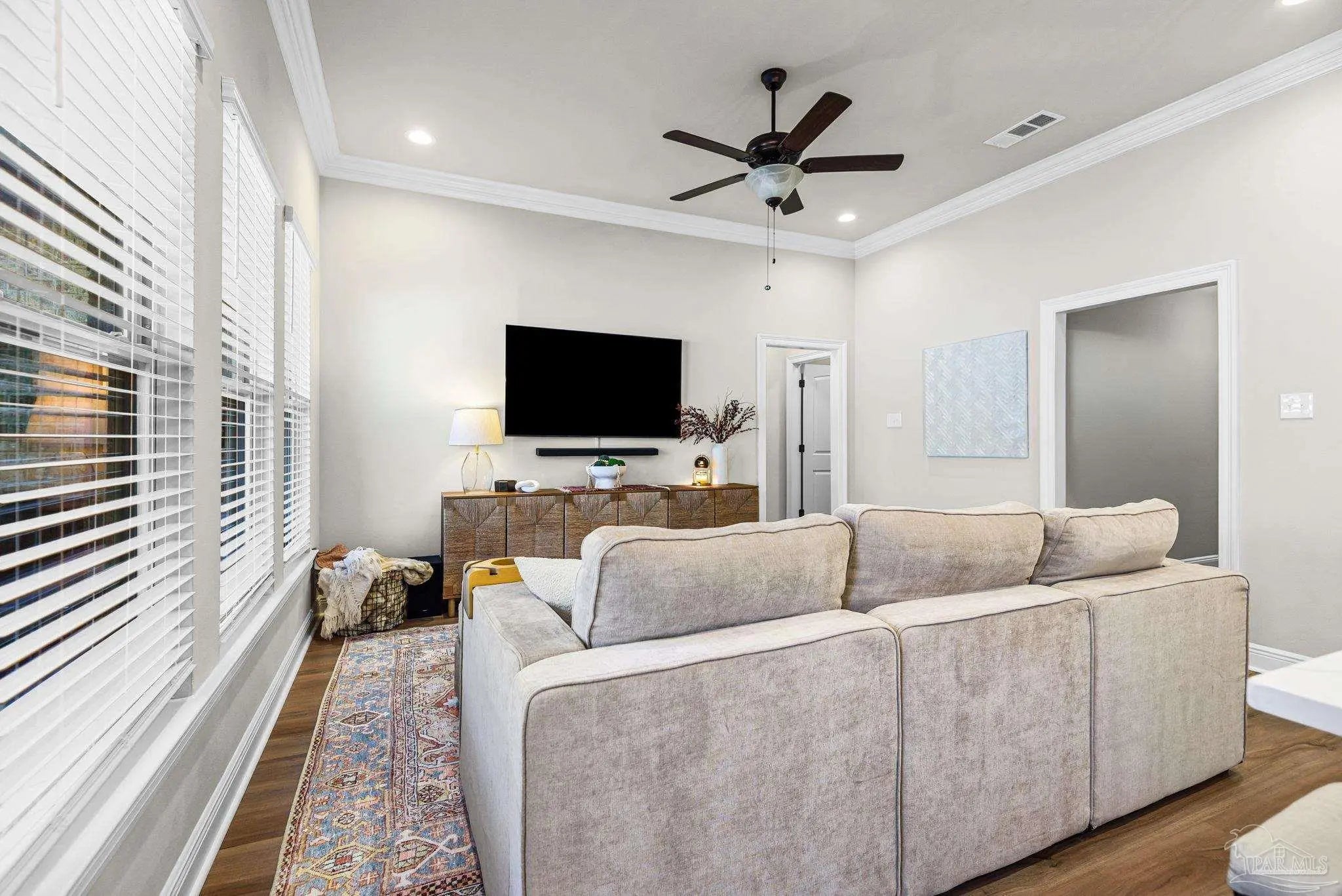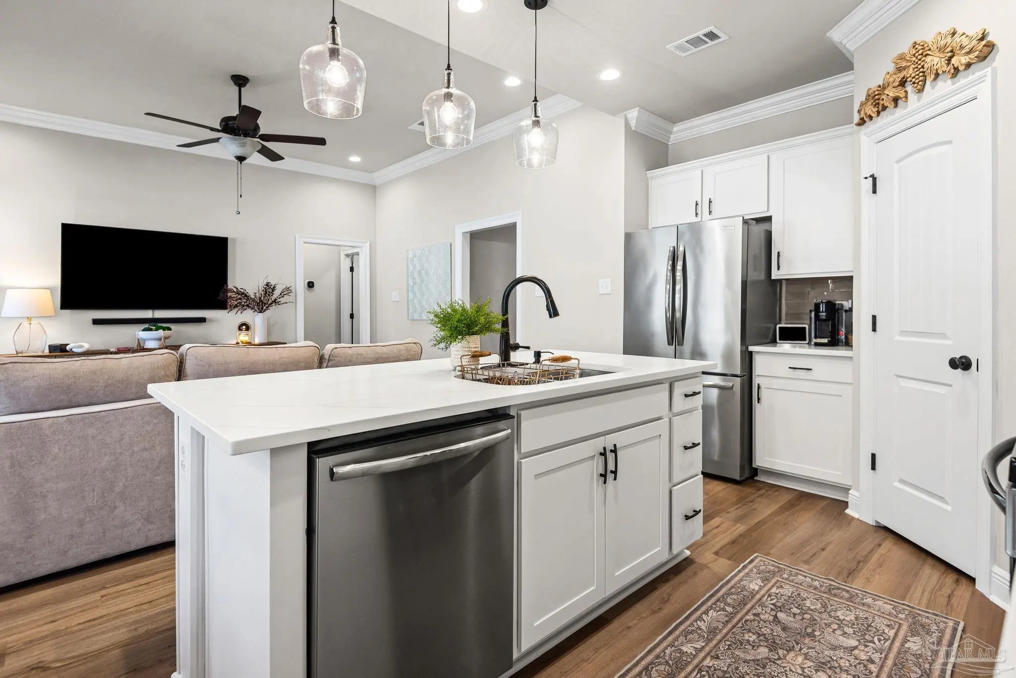 May I have the pleasure of presenting this VERY attractive and well-kept THREE-bedroom, TWO-bath GEM, nestled away in the welcoming Southern Palms neighborhood of Pace, Florida! This beautiful home is absolutely GORGEOUS! Featuring over 1,500 square feet of thoughtfully designed living space, it’s perfect for comfort, style, and entertaining! As you step inside, you are immediately greeted by well-designed open spaces, appealing color palettes, accents, and abundant natural light throughout. Walk with me toward the grand room, and your attention will first be drawn upward to the high 9-foot tray ceilings wrapped in crown molding, then downward to the beautiful luxury vinyl plank flooring that blankets the entire home! The open-concept kitchen is delightful for cooking family meals and hosting guests. An oversized island, polished quartz countertops, stainless steel appliances, a custom tile backsplash, plenty of cabinetry, and a walk-in pantry await! Tucked away is a generously sized private primary suite—a perfect sanctuary after a long day. The primary bath features double vanity sinks, a walk-in shower, and a garden soaking tub to help wash the day away! Across the home, the two secondary bedrooms are generously sized, each offering spacious closets and ample storage. Relaxation awaits as you step outside under your shaded, covered lanai! The backyard is wide open with tons of room to stretch your legs—perfect for outdoor dining, picking fresh herbs from your garden, and watching the kiddos play! Additional highlights include no rear neighbors, a Wi-Fi-enabled Ecobee thermostat, hurricane window protection, rain gutters, and a transferable termite bond! TOP-rated schools, parks, shopping, dining, stunning sugar-white beaches, and military installations are all within easy reach. Schedule your showing today!