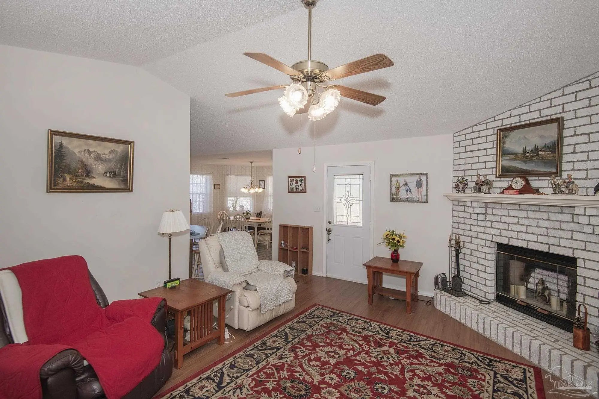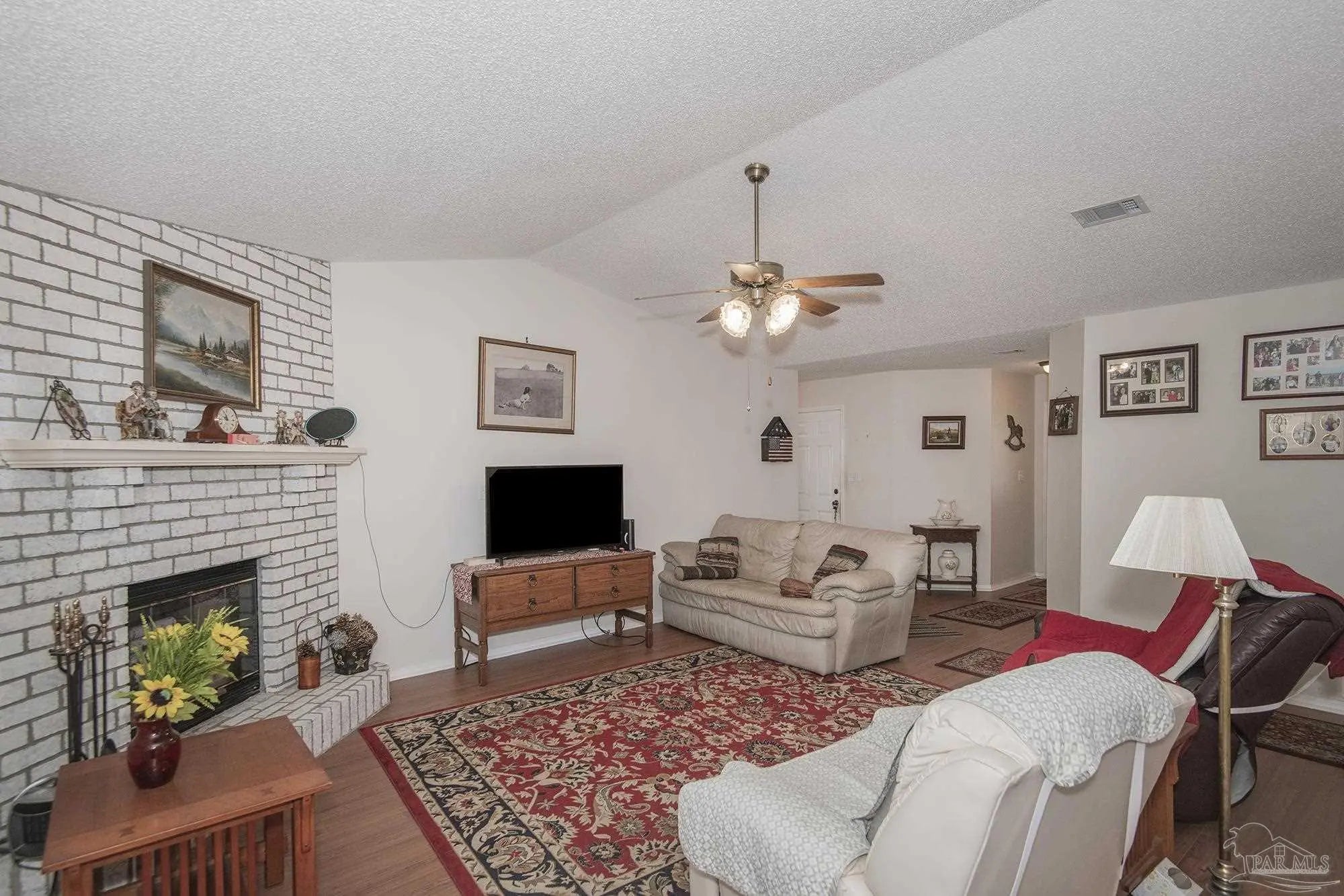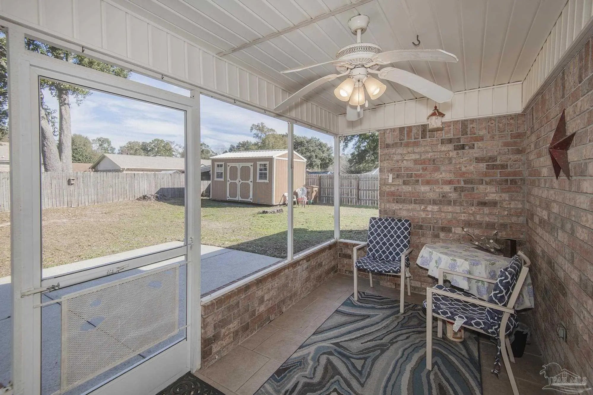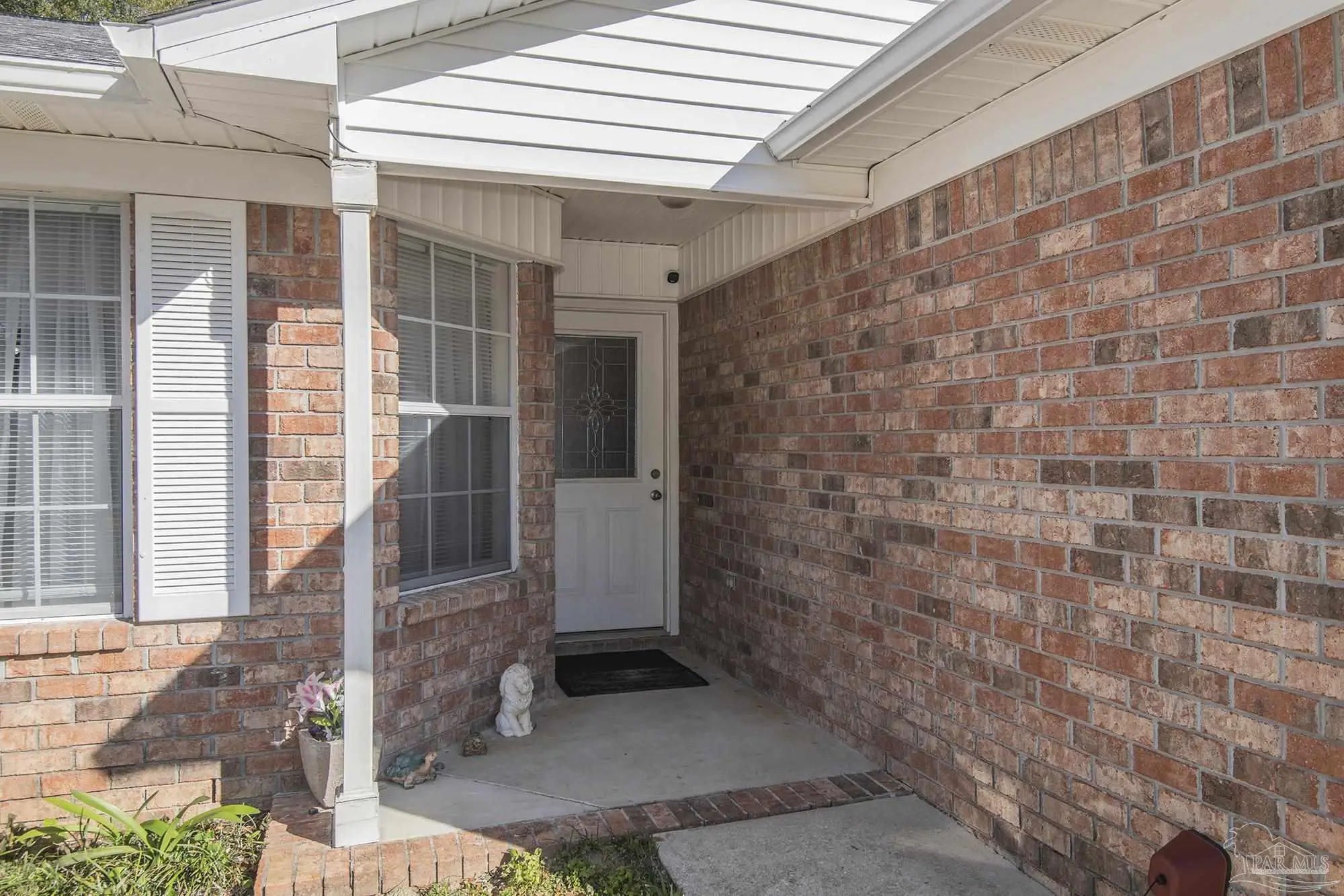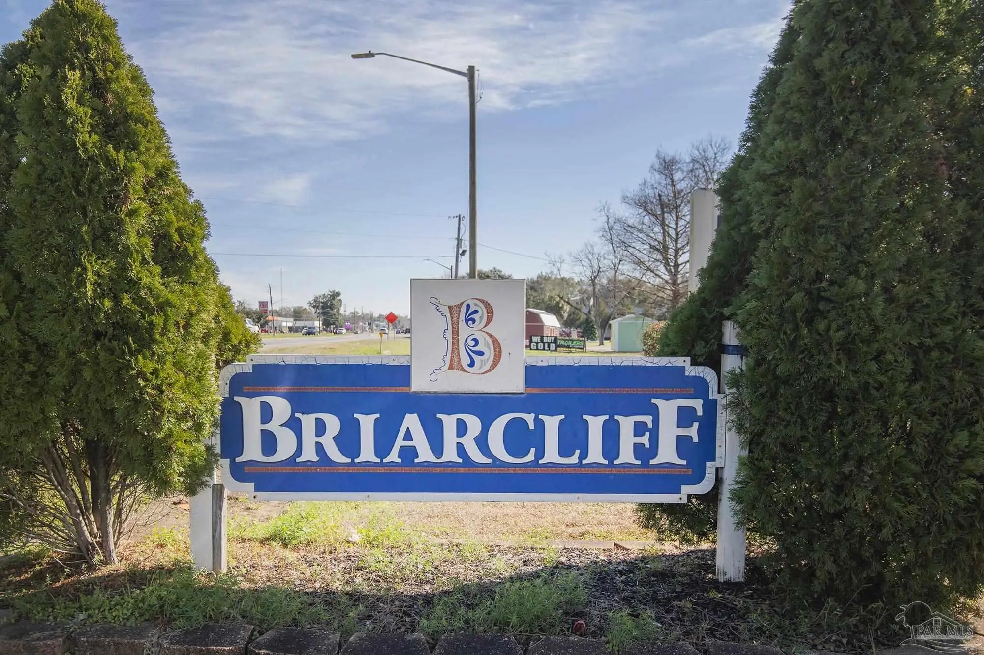 Lovely home in popular Briarcliff in the heart of Pace but off the busy thoroughfare. On a Cul de sac street, this terrific floor plan offers an exceptionally large kitchen and dining area that allow plenty of room for 2 cooks and plenty of space for family dining and guests to enjoy. Abundant wood cabinetry, breakfast bar and natural light from large bay window. There is a cozy and inviting family room with fireplace (capped off at the roof..no chimney), vaulted ceilings that extend to the kitchen. Split bedroom plan. Main suite features spacious bath with double vanities, separate shower and garden tub, 2 oversized closets. 2 additional bedrooms are spacious and bright. Huge, privacy fenced back yard with ample room for a pool and includes a large utility shed . Right off the kitchen/ living area there is a breezy screened porch very private and a good place for a nap or a good book, watching the birds and just relaxing. Convenient Inside laundry room plus double garage. Recent updates and improvements include: roof 3 yrs; water heater 2020; HVAC 2024. Sprinkler to convey "As Is".