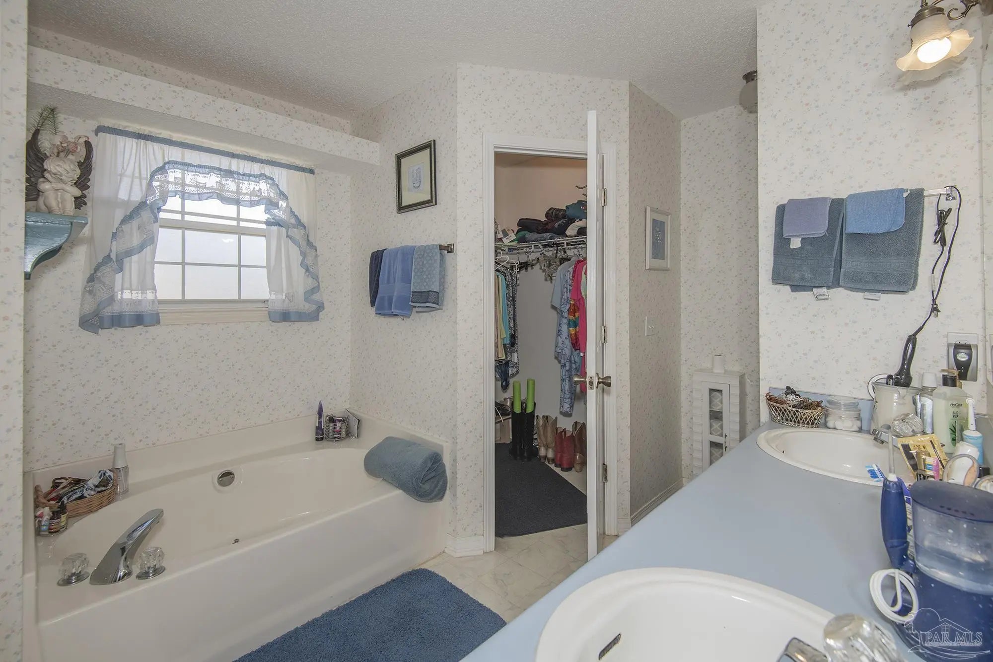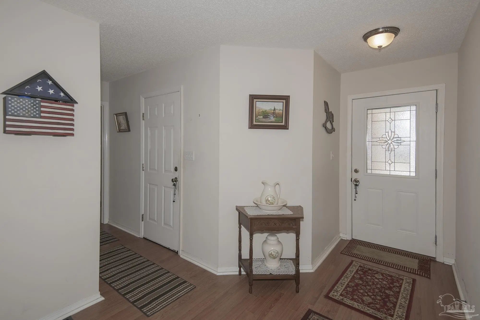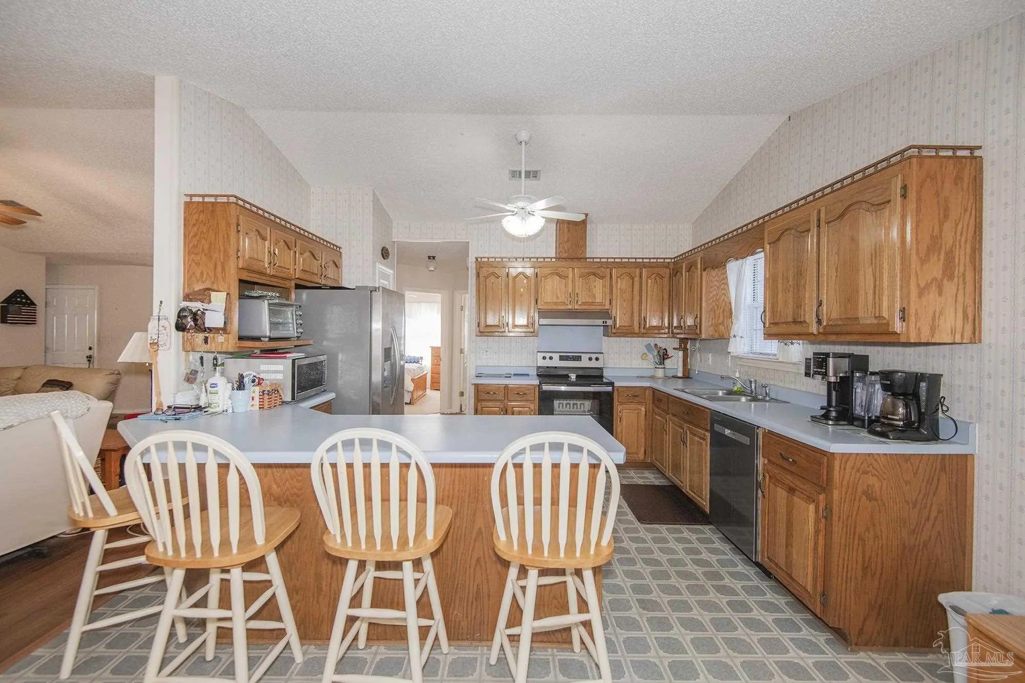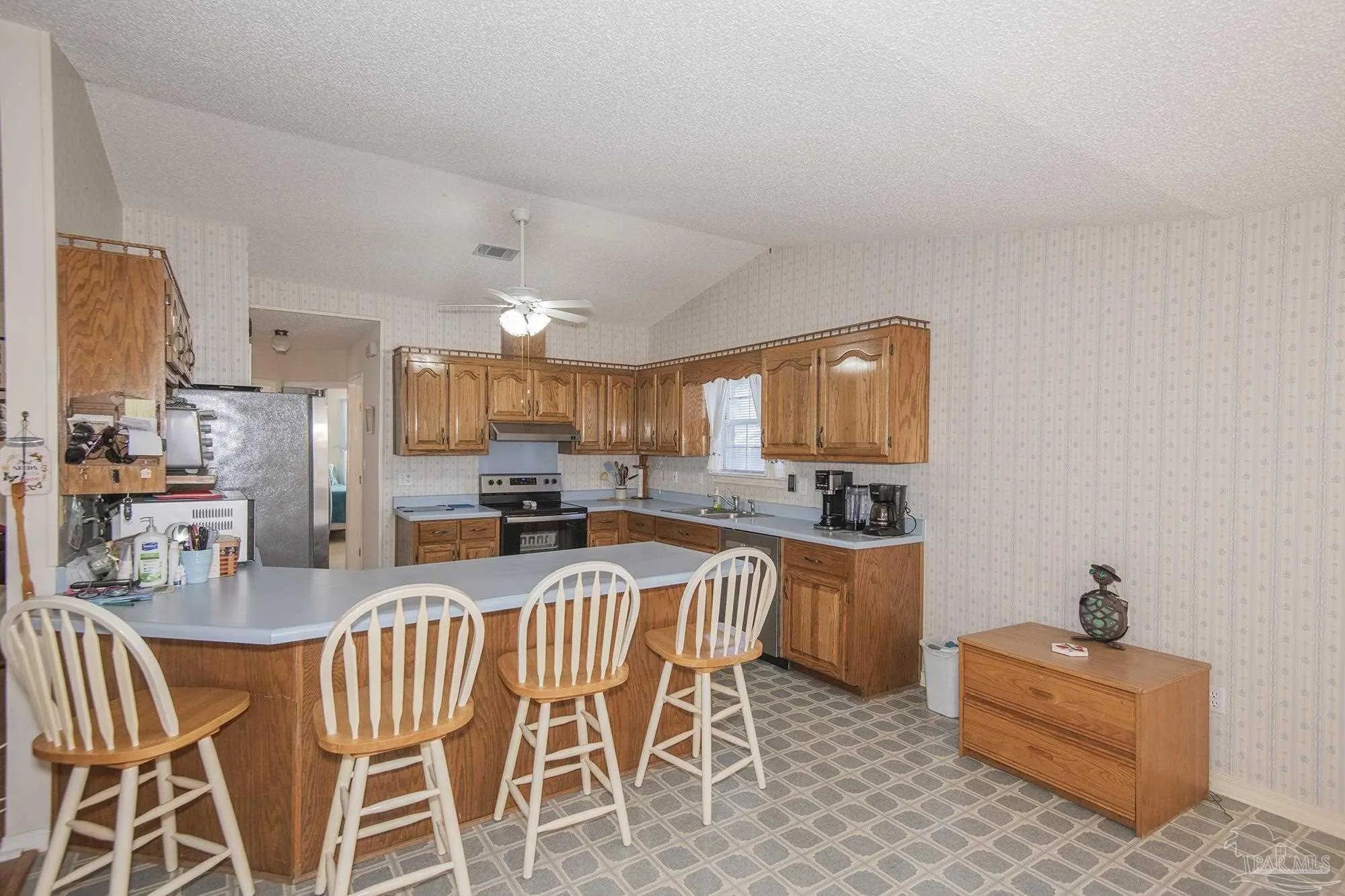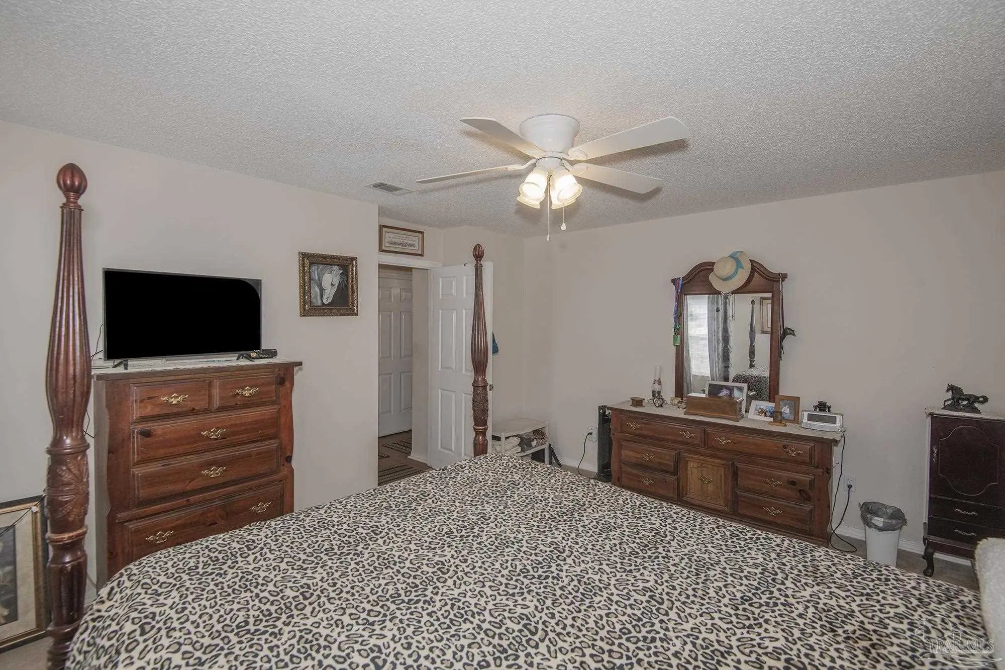 Lovely home in popular Briarcliff in the heart of Pace but off the busy thoroughfare. On a Cul de sac street, this terrific floor plan offers an exceptionally large kitchen and dining area that allow plenty of room for 2 cooks and plenty of space for family dining and guests to enjoy. Abundant wood cabinetry, breakfast bar and natural light from large bay window. There is a cozy and inviting family room with fireplace (capped off at the roof..no chimney), vaulted ceilings that extend to the kitchen. Split bedroom plan. Main suite features spacious bath with double vanities, separate shower and garden tub, 2 oversized closets. 2 additional bedrooms are spacious and bright. Huge, privacy fenced back yard with ample room for a pool and includes a large utility shed . Right off the kitchen/ living area there is a breezy screened porch very private and a good place for a nap or a good book, watching the birds and just relaxing. Convenient Inside laundry room plus double garage. Recent updates and improvements include: roof 3 yrs; water heater 2020; HVAC 2024. Sprinkler to convey "As Is".