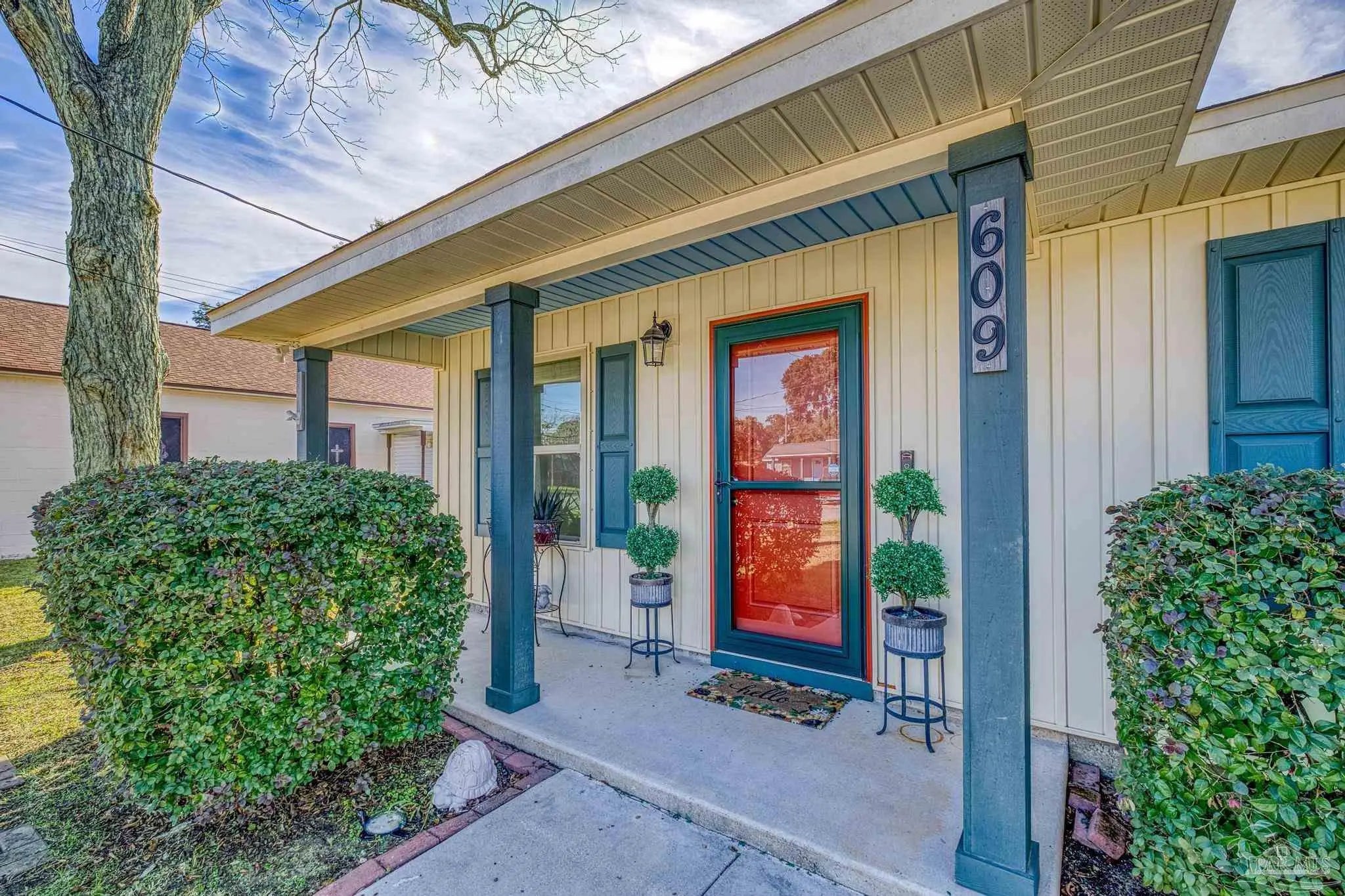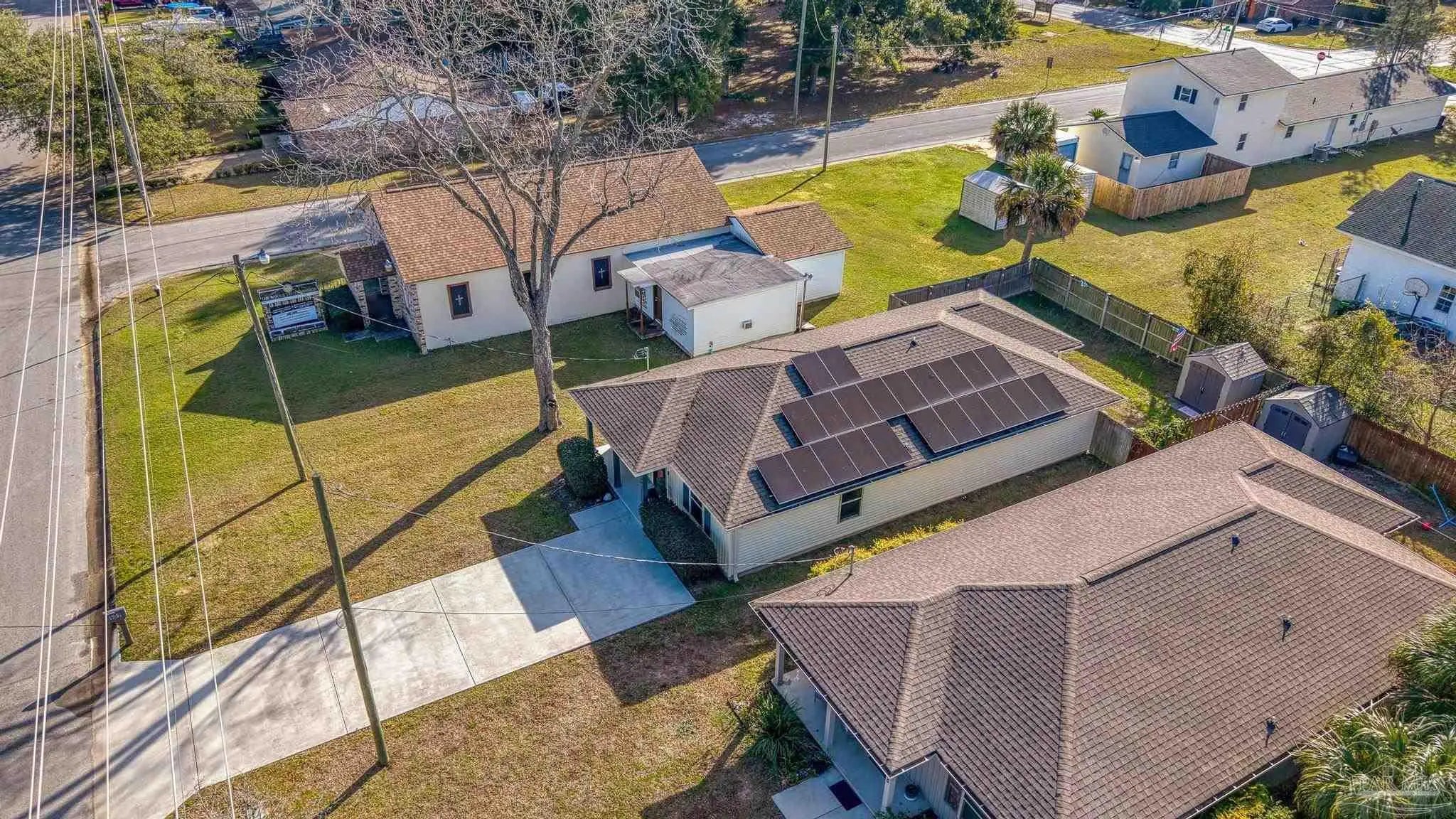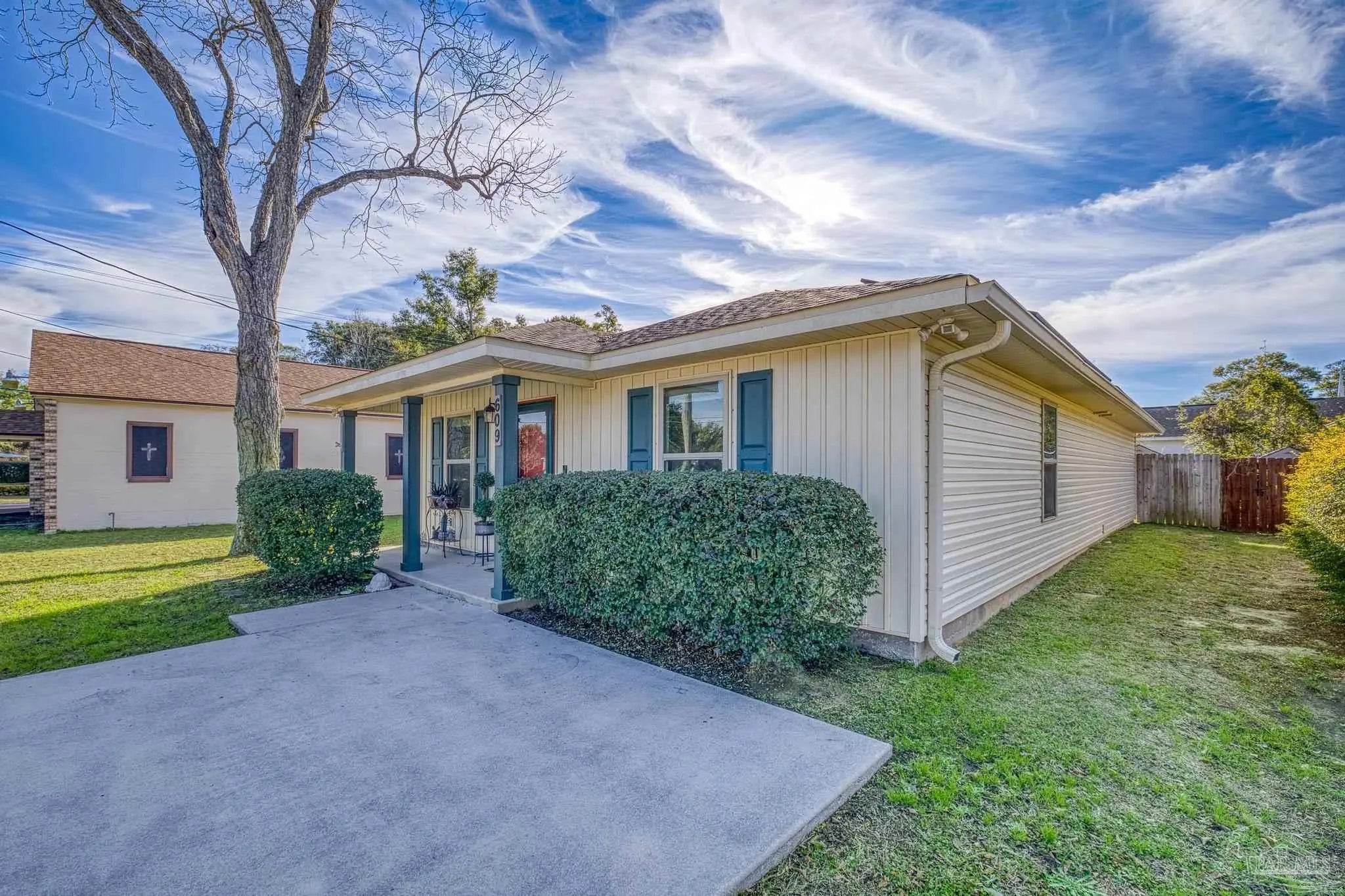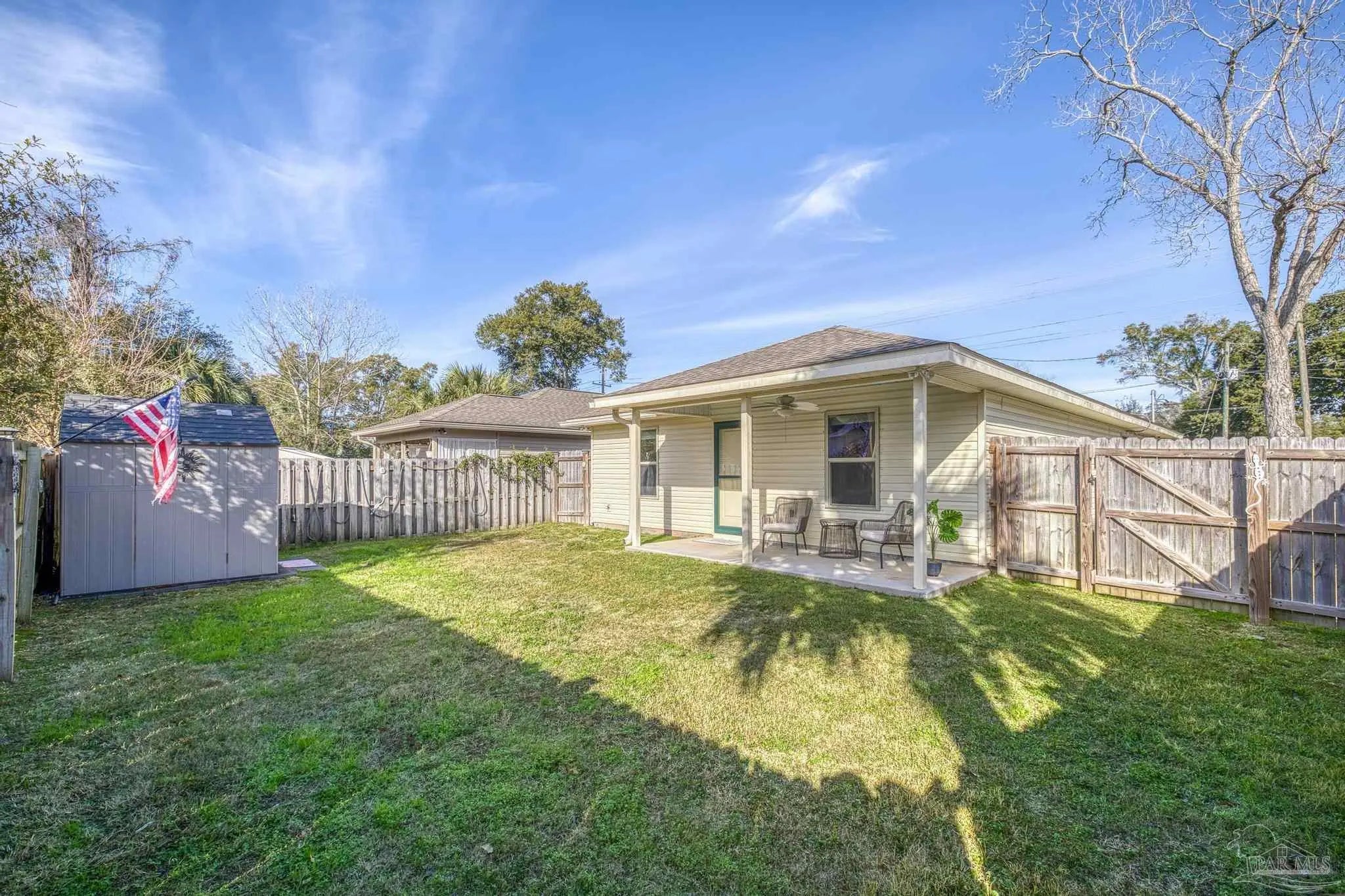 Perfectly positioned just minutes from downtown Pensacola, this 2020-built modern cottage is one of the best-priced newer homes in the area, offering the advantages of recent construction along with strong investment potential. Its central location near Palafox Street dining, shopping, breweries, the airport, beaches, NAS Pensacola, and major roadways makes it an attractive option for homeowners and investors alike. This home features attractive curb appeal with a welcoming front porch and spacious driveway. Inside, enjoy natural light in the open-concept living and dining area enhanced by tray ceilings, ceiling fans, recessed lighting and durable luxury vinyl plank flooring throughout. The kitchen offers granite countertops, stainless steel appliances, and bar seating, making it ideal for everyday living and entertaining. The primary suite includes a tray ceiling, walk-in closet, and an upgraded walk-in soaking tub designed for mobility or disabled occupants. Two additional bedrooms share a full bath. Additional features include an air scrubber for improved indoor air quality and a spacious laundry room with washer and dryer included. Outdoor highlights include a covered back porch, fully fenced yard with a storage shed, and exterior motion-sensor lighting. Paid for solar panels help reduce monthly electric costs, adding long-term value and efficiency. Move-in ready and centrally located, this home is an excellent option for first-time homebuyers, retirees, downsizers, or investors seeking a high-demand rental property.