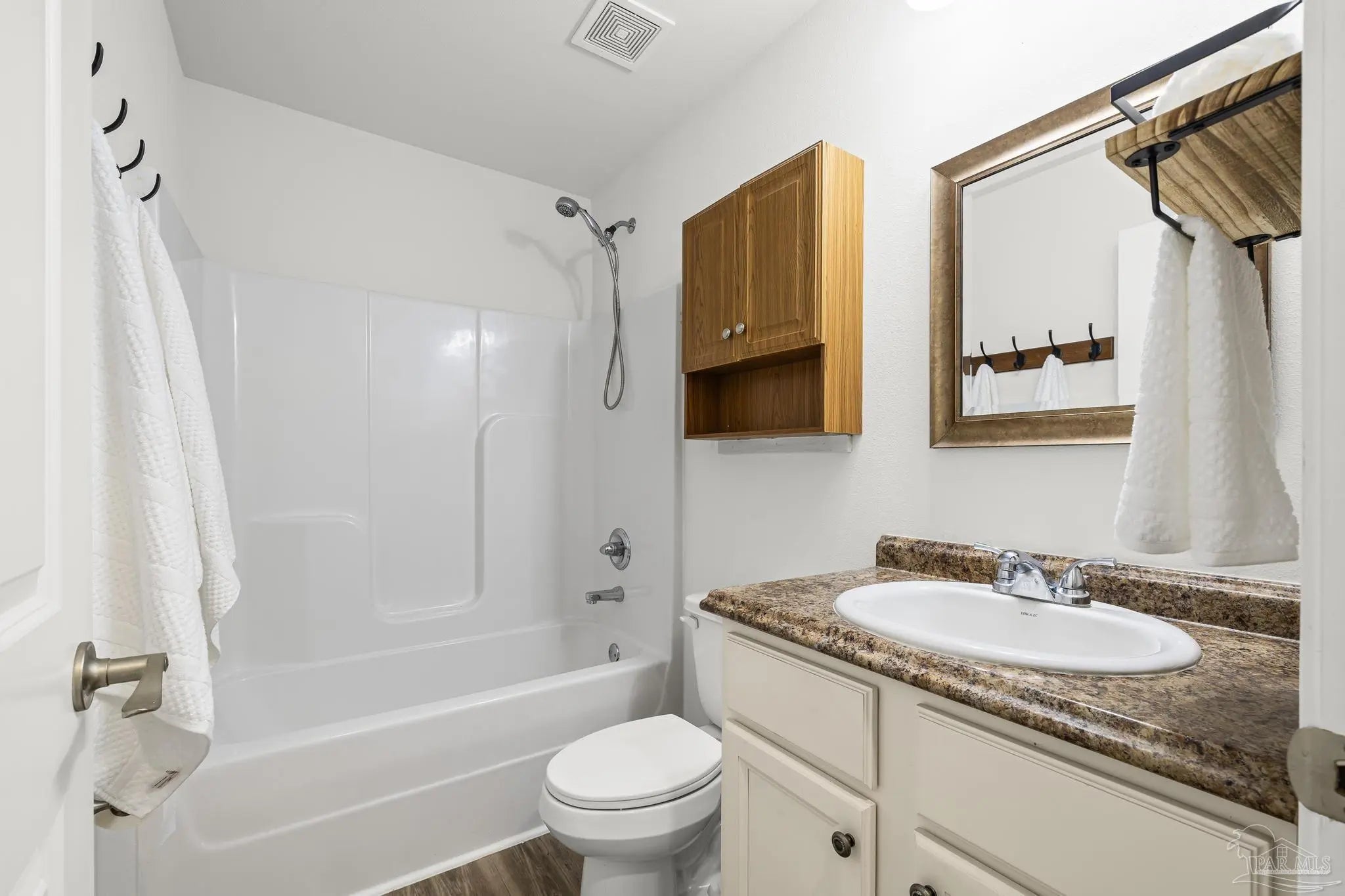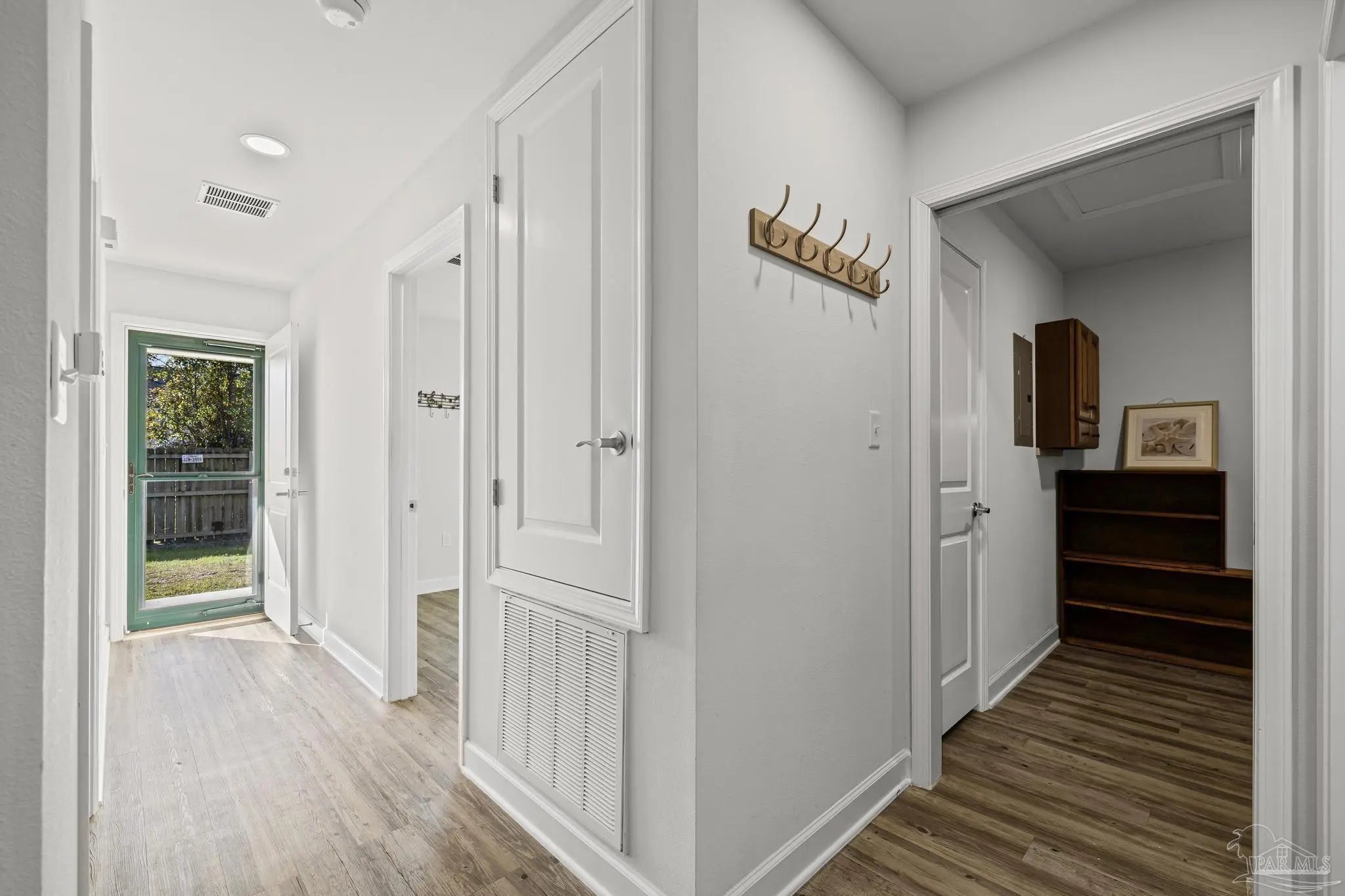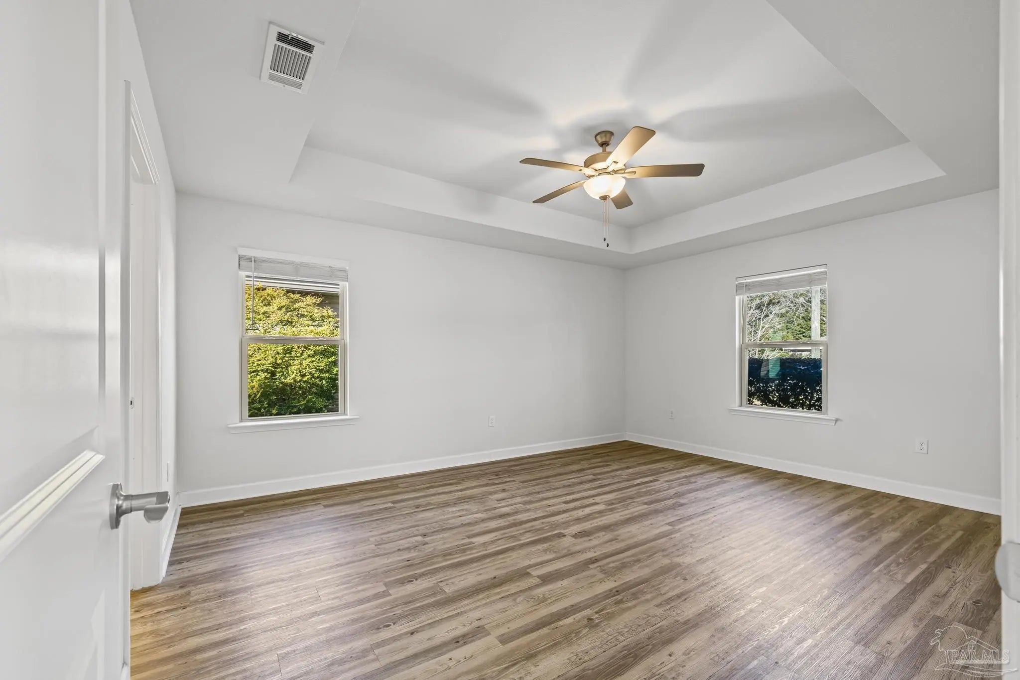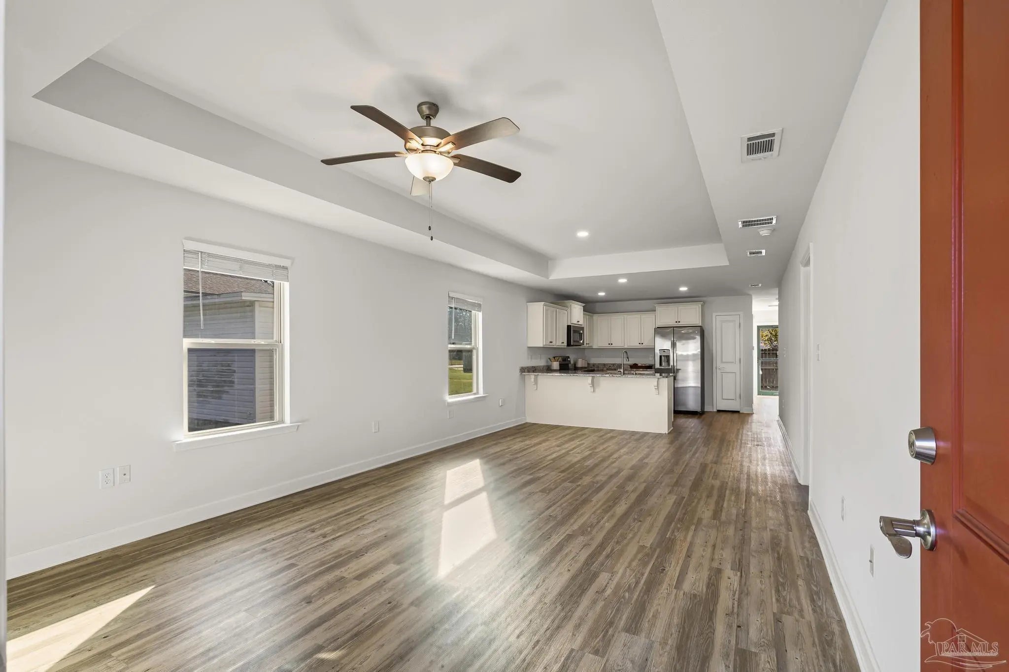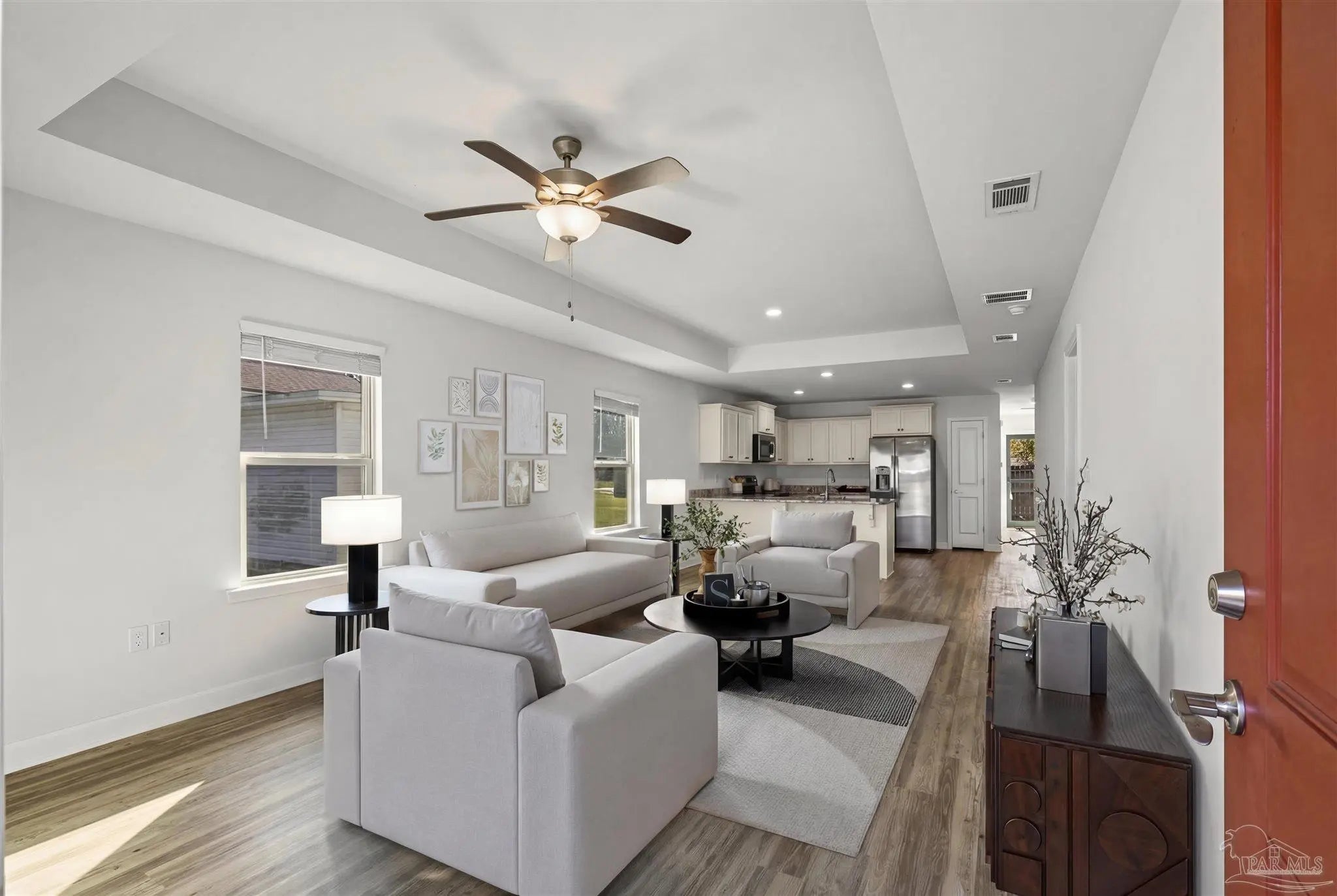 Perfectly positioned just minutes from downtown Pensacola, this 2020-built modern cottage is one of the best-priced newer homes in the area, offering the advantages of recent construction along with strong investment potential. Its central location near Palafox Street dining, shopping, breweries, the airport, beaches, NAS Pensacola, and major roadways makes it an attractive option for homeowners and investors alike. This home features attractive curb appeal with a welcoming front porch and spacious driveway. Inside, enjoy natural light in the open-concept living and dining area enhanced by tray ceilings, ceiling fans, recessed lighting and durable luxury vinyl plank flooring throughout. The kitchen offers granite countertops, stainless steel appliances, and bar seating, making it ideal for everyday living and entertaining. The primary suite includes a tray ceiling, walk-in closet, and an upgraded walk-in soaking tub designed for mobility or disabled occupants. Two additional bedrooms share a full bath. Additional features include an air scrubber for improved indoor air quality and a spacious laundry room with washer and dryer included. Outdoor highlights include a covered back porch, fully fenced yard with a storage shed, and exterior motion-sensor lighting. Paid for solar panels help reduce monthly electric costs, adding long-term value and efficiency. Move-in ready and centrally located, this home is an excellent option for first-time homebuyers, retirees, downsizers, or investors seeking a high-demand rental property.