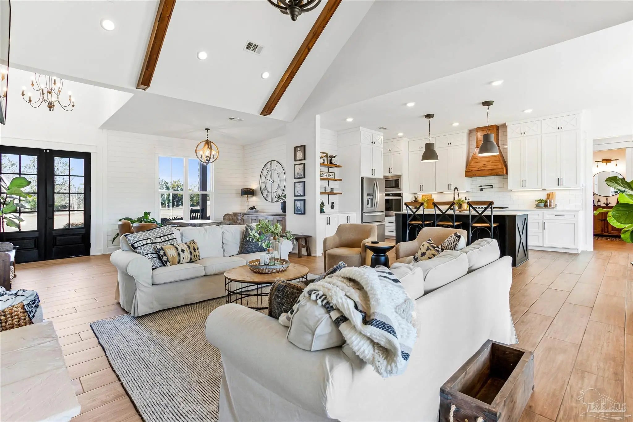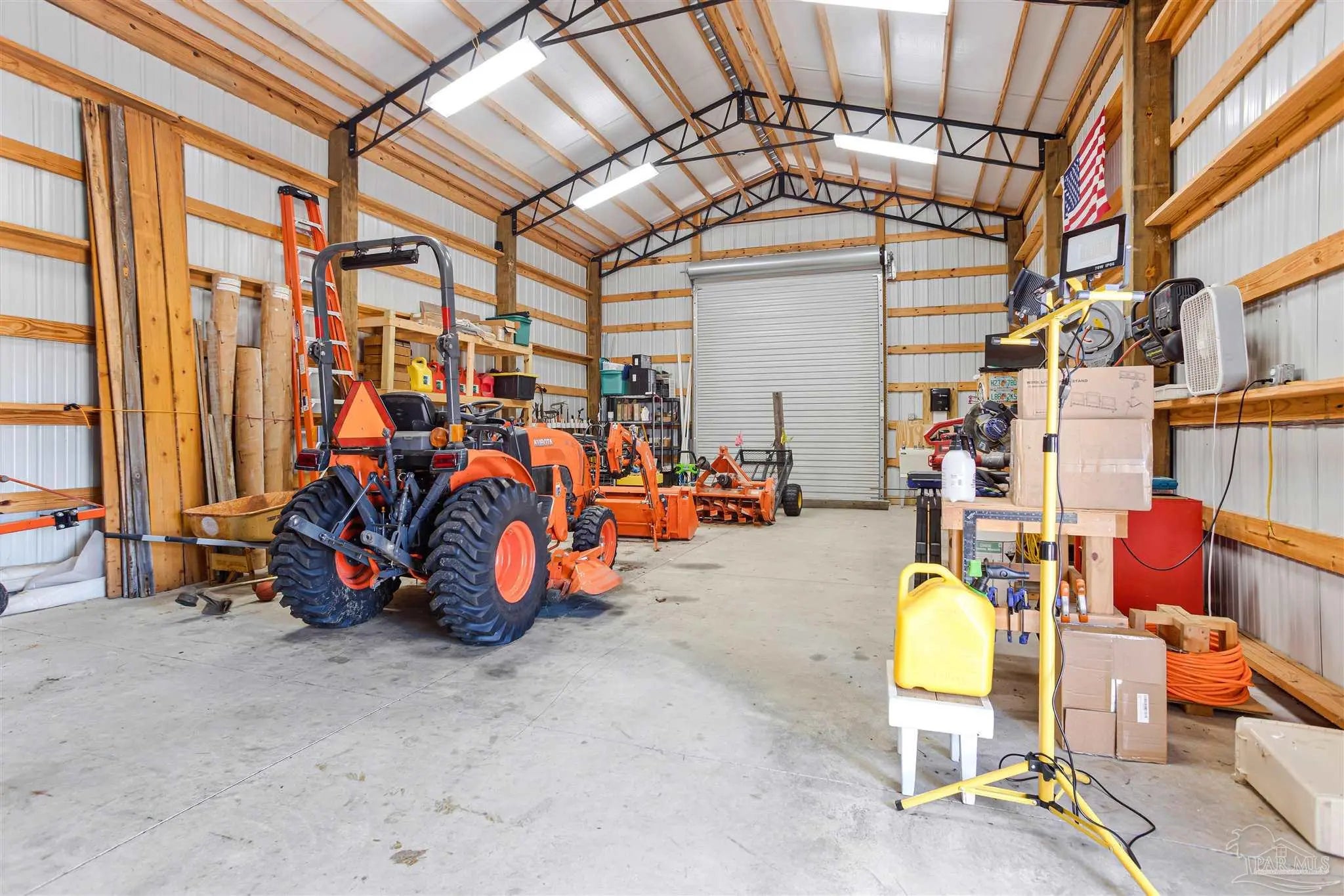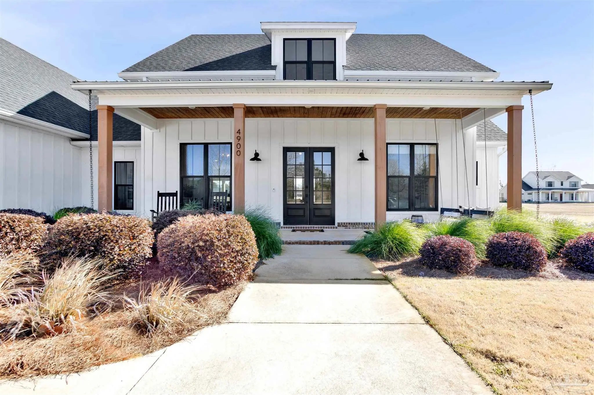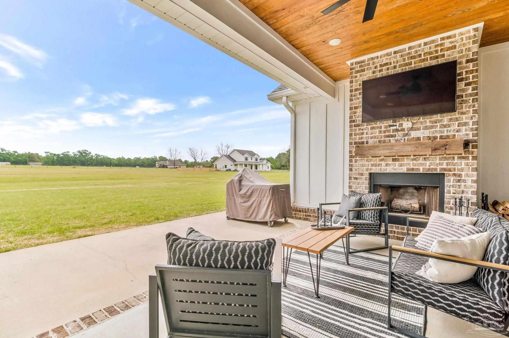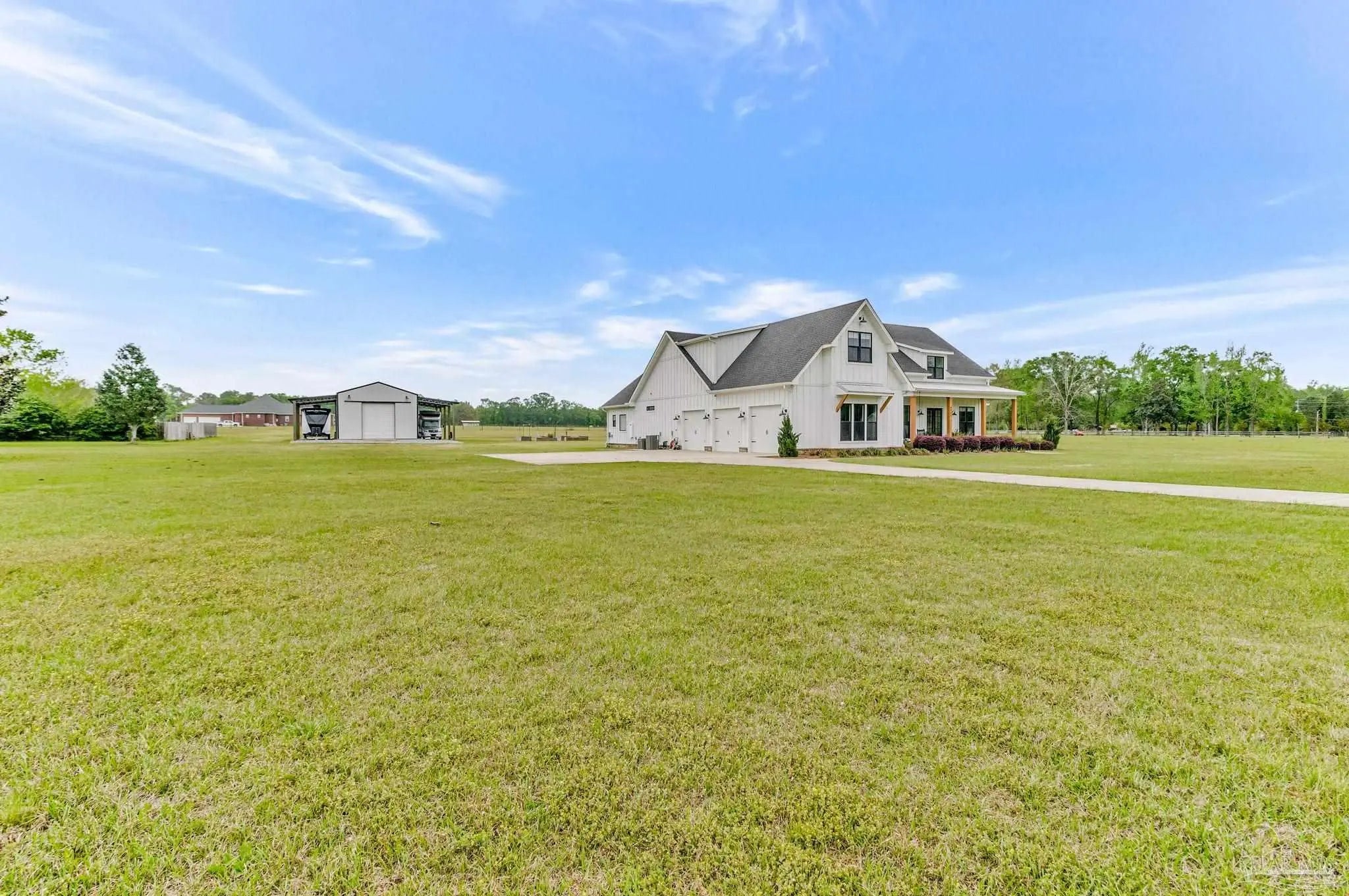 PRIVATE 4.5-ACRE MODERN FARMHOUSE RETREAT — 20 MINUTES TO PENSACOLA. Welcome to a truly exceptional, custom-built farmhouse, set on 4.5 private acres with no HOA—offering the space, privacy, and flexibility to live beautifully, both indoors and out. Freshly painted and thoughtfully finished, this 3,426-square-foot home features 4 bedrooms and 3.5 baths with elevated selections throughout, including wood-look tile flooring, roller shades, and spray-foam insulation for year-round comfort and efficiency. The open-concept main living area is designed for effortless entertaining, while still providing the separation and quiet spaces a home of this caliber deserves. The oversized 3-car garage is complemented by a generous bonus room above—ideal for a home office, media lounge, playroom, or guest suite. Walking attic space adds convenient, accessible storage rarely found in newer construction. Outdoors, the setting is as refined as it is functional. Enjoy evenings by the outdoor fireplace, cultivate your own harvest in the raised garden beds, and appreciate the lush zoysia lawn supported by a full irrigation system across the front and side yards. A premier feature of the property is the 40x48 pole barn, with 24x40 fully enclosed and equipped with power and water—perfect for a workshop, equipment storage, hobbies, or future expansion. Dedicated RV parking with electrical hookup adds even more versatility for travelers and guests alike. This is a rare offering where craftsmanship, acreage, and lifestyle amenities meet—delivering polished country living with the freedom to make it your own.