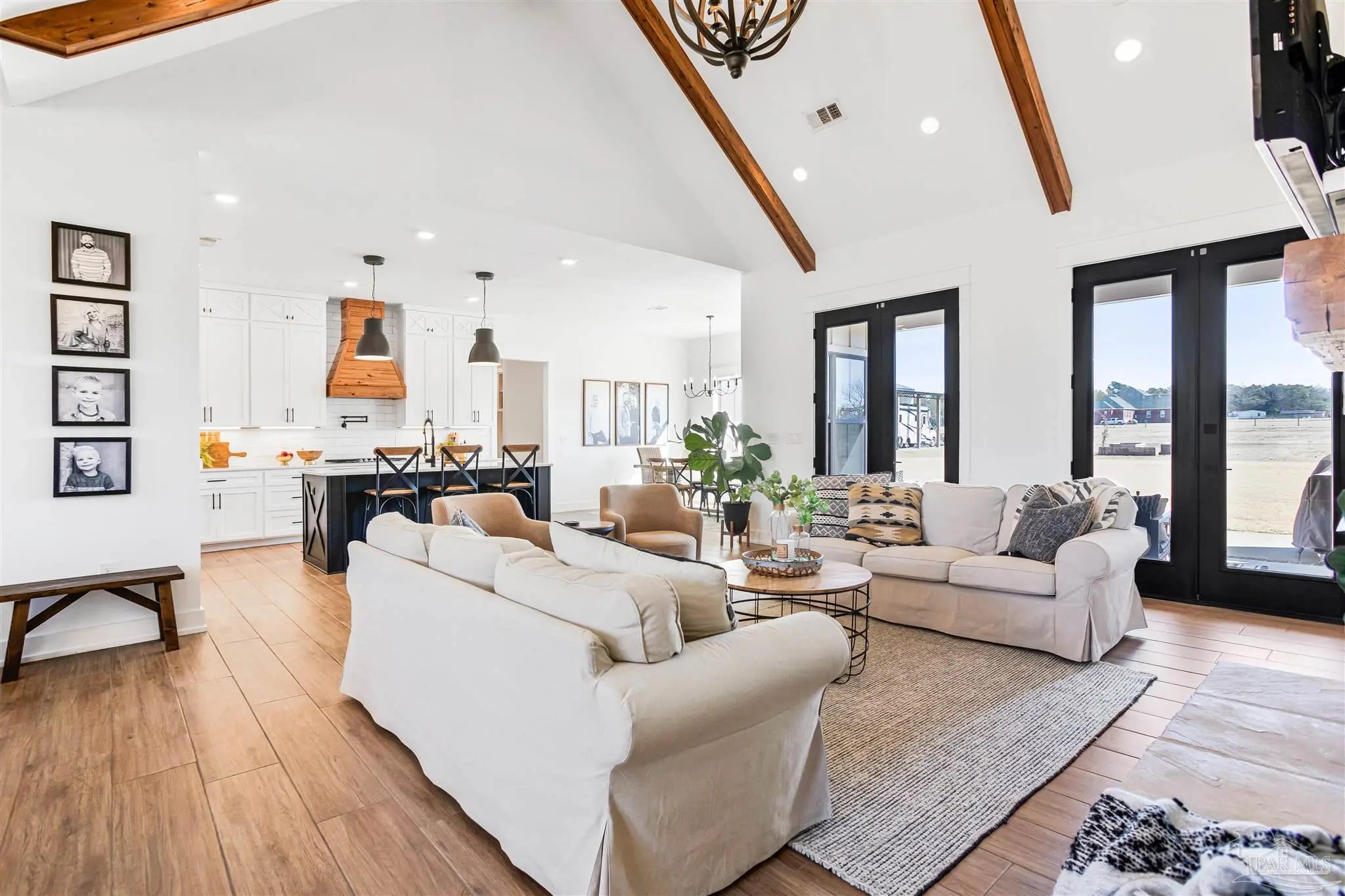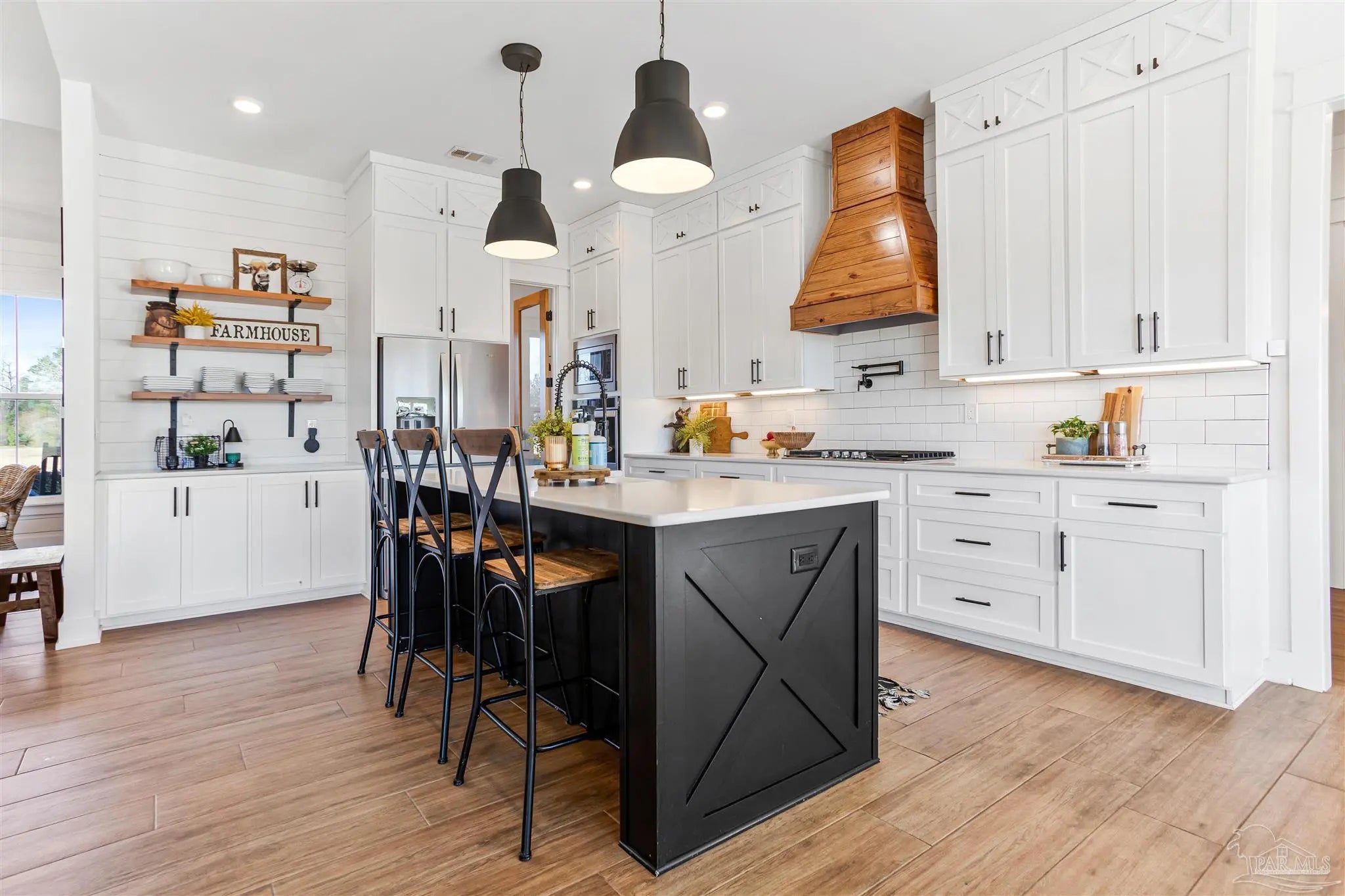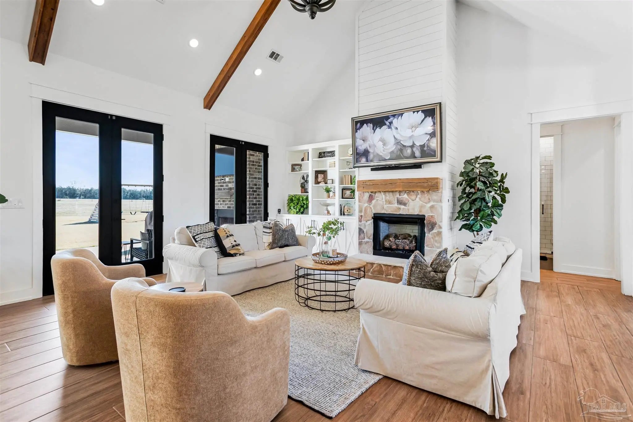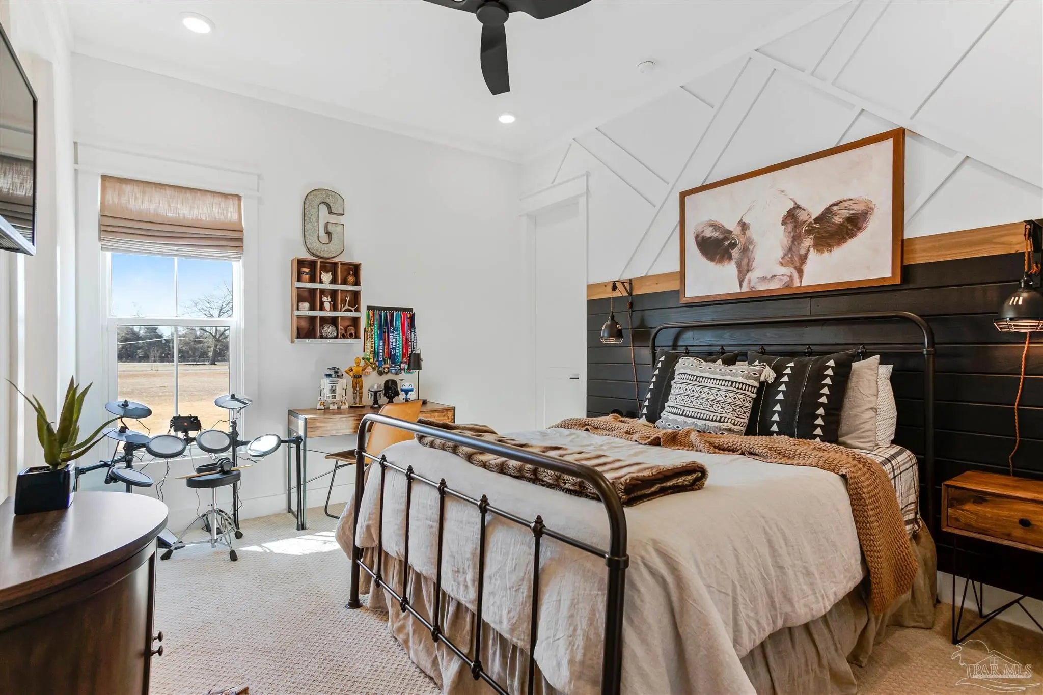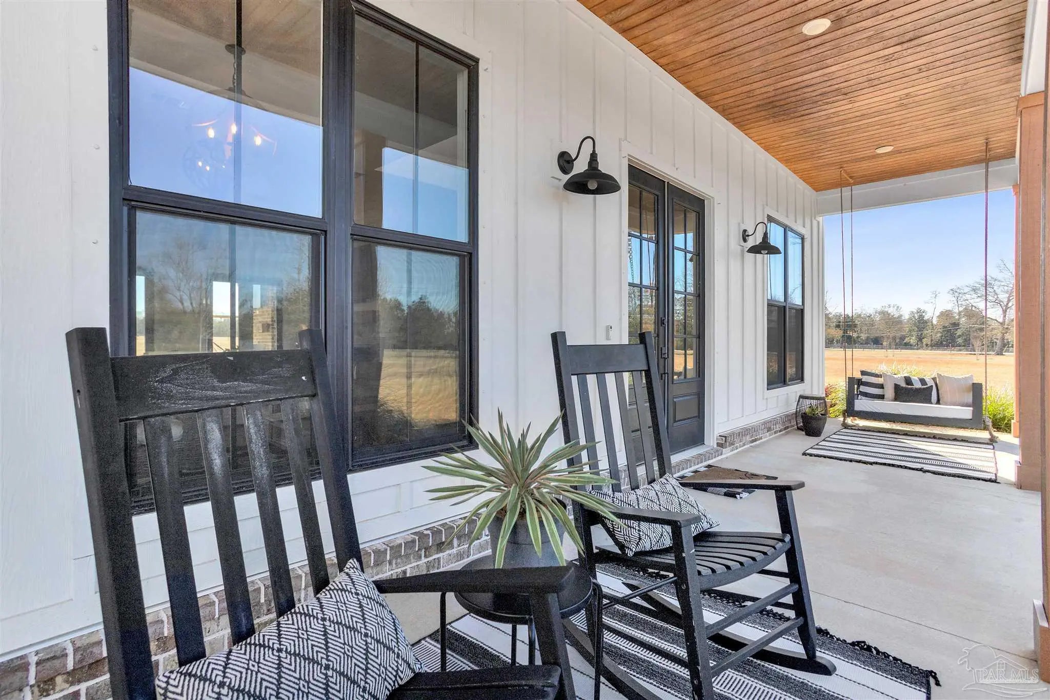PRIVATE 4.5-ACRE MODERN FARMHOUSE RETREAT — 20 MINUTES TO PENSACOLA. Welcome to a truly exceptional, custom-built farmhouse, set on 4.5 private acres with no HOA—offering the space, privacy, and flexibility to live beautifully, both indoors and out. Freshly painted and thoughtfully finished, this 3,426-square-foot home features 4 bedrooms and 3.5 baths with elevated selections throughout, including wood-look tile flooring, roller shades, and spray-foam insulation for year-round comfort and efficiency. The open-concept main living area is designed for effortless entertaining, while still providing the separation and quiet spaces a home of this caliber deserves. The oversized 3-car garage is complemented by a generous bonus room above—ideal for a home office, media lounge, playroom, or guest suite. Walking attic space adds convenient, accessible storage rarely found in newer construction. Outdoors, the setting is as refined as it is functional. Enjoy evenings by the outdoor fireplace, cultivate your own harvest in the raised garden beds, and appreciate the lush zoysia lawn supported by a full irrigation system across the front and side yards. A premier feature of the property is the 40x48 pole barn, with 24x40 fully enclosed and equipped with power and water—perfect for a workshop, equipment storage, hobbies, or future expansion. Dedicated RV parking with electrical hookup adds even more versatility for travelers and guests alike. This is a rare offering where craftsmanship, acreage, and lifestyle amenities meet—delivering polished country living with the freedom to make it your own.