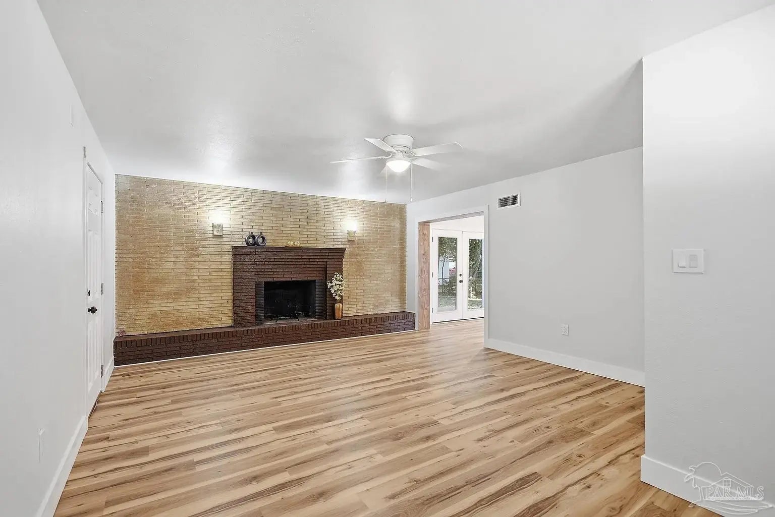 Step inside to an open floor plan filled with natural light, featuring luxury vinyl plank flooring, fresh interior paint, and a beautifully updated kitchen complete with granite countertops, brand-new cabinets, and stainless steel appliances overlooking the backyard. A large secondary living space with a wood-burning fireplace offers flexibility for a family room, playroom, or entertainment area. The upgraded bathroom includes a tiled walk-in shower accented with modern gold finishes. The home also features new windows, a new roof, and a new HVAC system, providing peace of mind with major updates already completed. Additional highlights include a spacious laundry room, generous bedrooms, a back patio, and a newly installed front-facing fence. This move-in-ready property combines modern style with practical comfort in a convenient location.