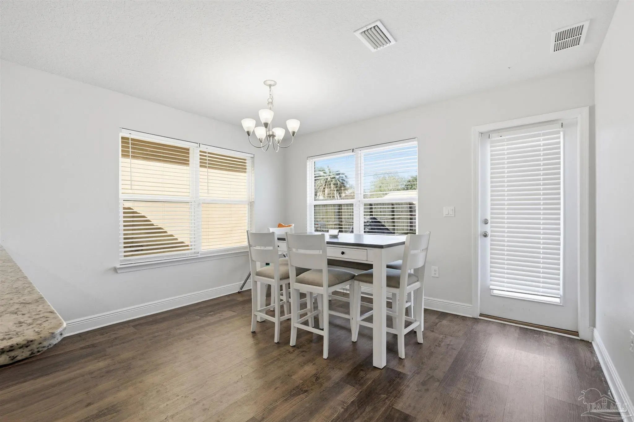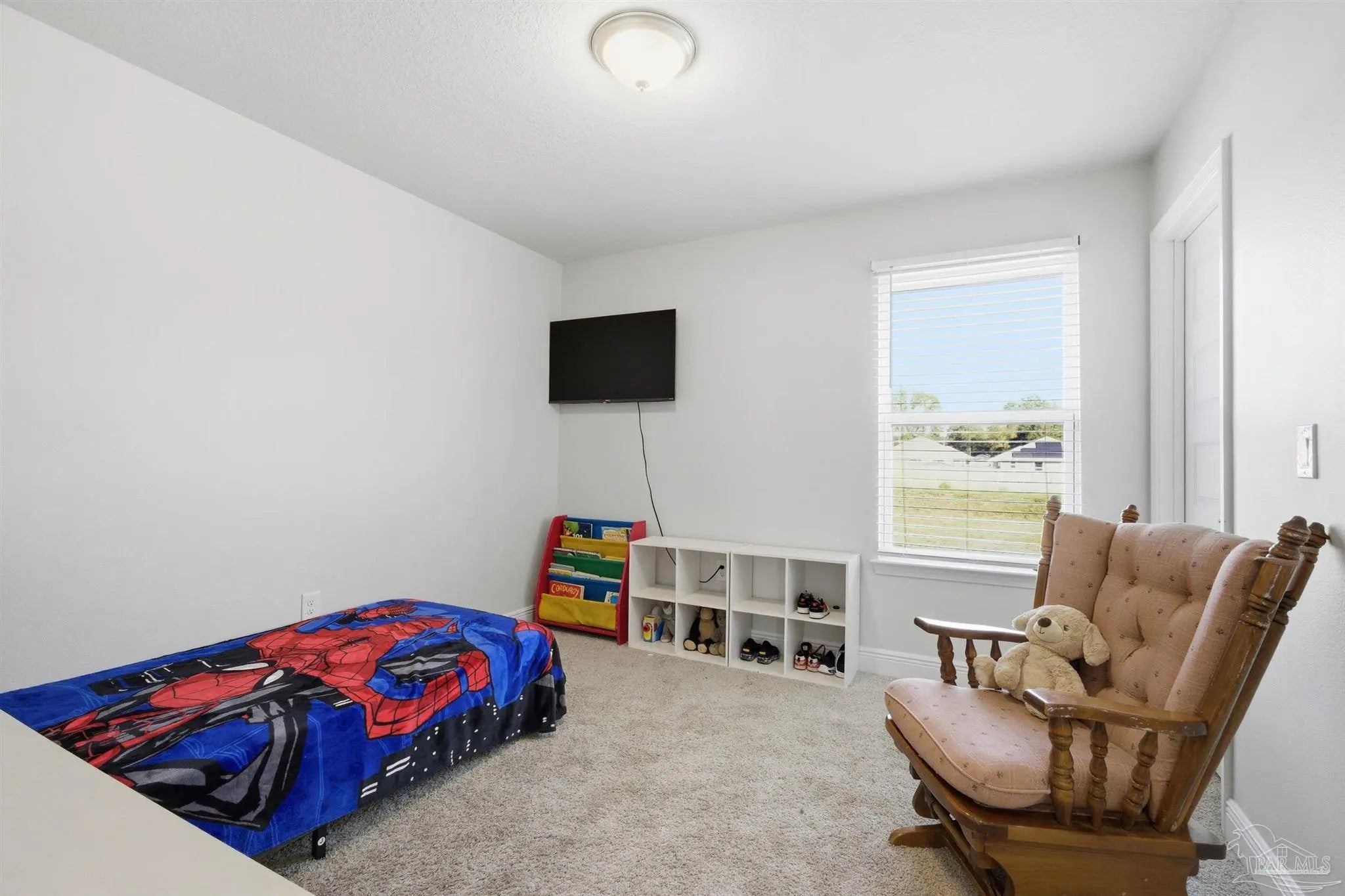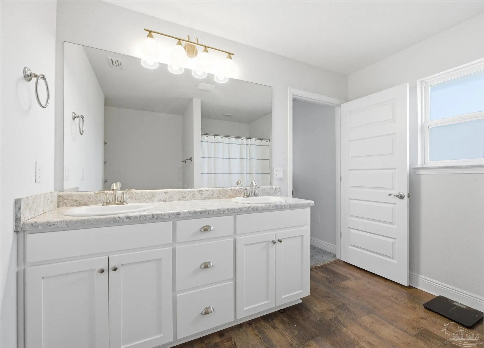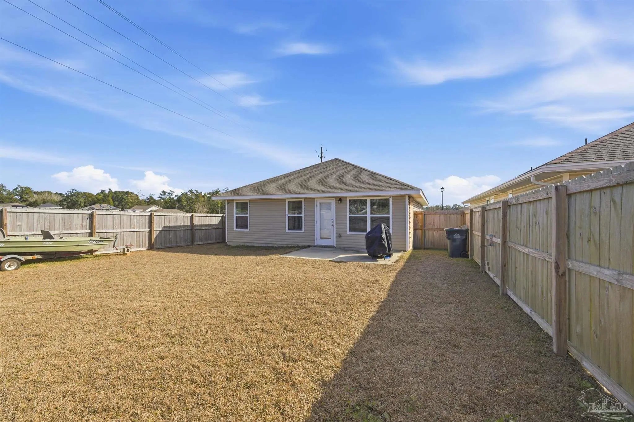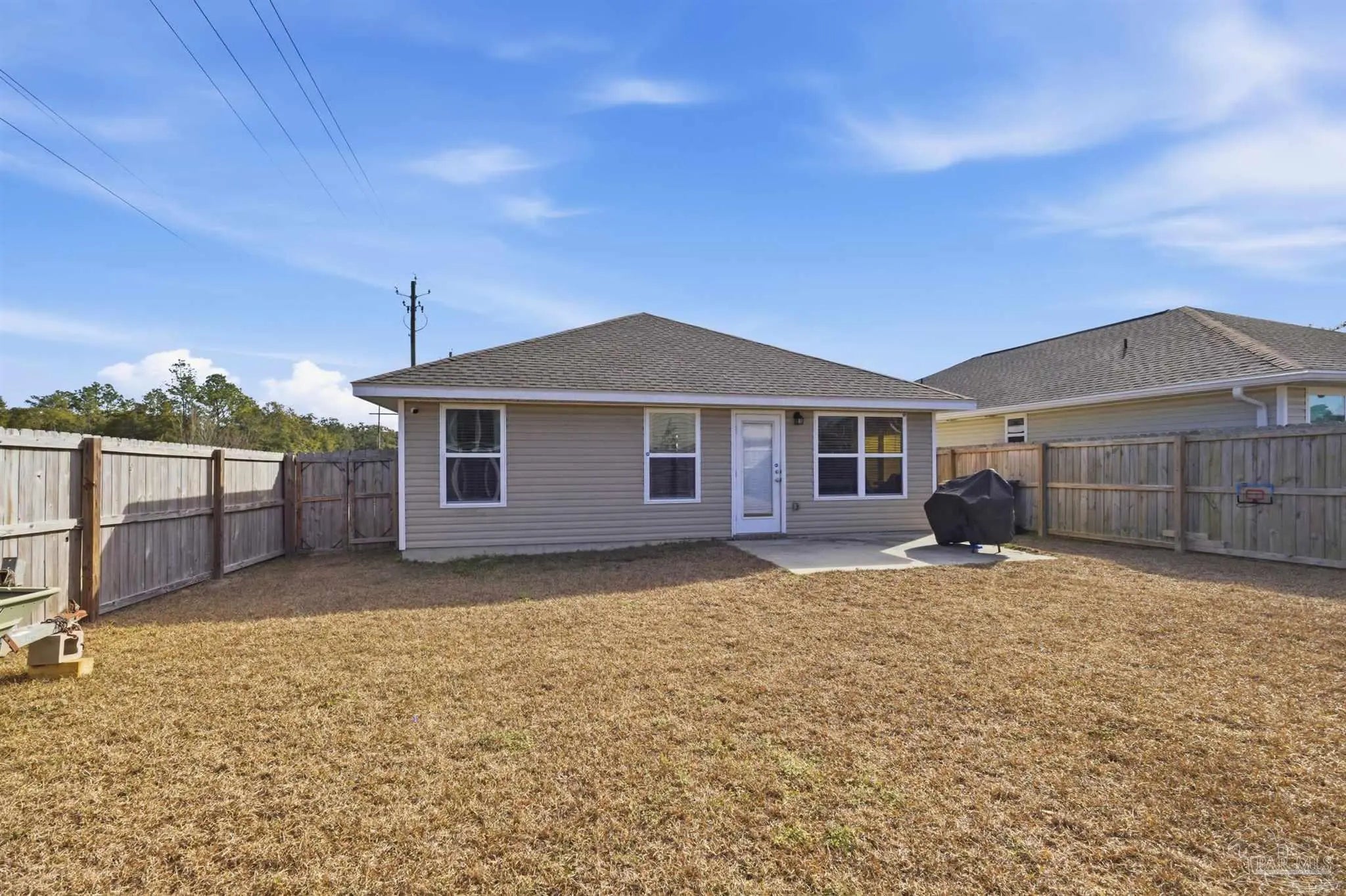 Welcome to Commander’s Cove, an Adams Homes subdivision conveniently located just minutes from UWF, West Florida Hospital, and abundant shopping and dining options. Built in 2023, this like-new 3-bedroom, 2-bath cottage offers modern finishes, an open layout, and thoughtful design throughout its 1,515 sq ft of living space. As you arrive, you’ll appreciate the home’s popular floor plan and inviting covered front porch. Step inside to a spacious living area featuring a ceiling fan and an open, airy feel. Luxury vinyl plank flooring flows throughout the main living areas, with carpet in the bedrooms for added comfort. The living room opens seamlessly into the kitchen and dining area, making it ideal for everyday living and entertaining. The kitchen is equipped with stainless steel appliances, granite countertops, and overlooks the dining space for easy hosting. The primary suite is privately situated off the dining area and features a tray ceiling, ceiling fan, and a generous walk-in closet accessible through the en-suite bath. The primary bathroom offers a double vanity and a shower/tub combo. Two additional bedrooms are nicely sized with ample closet space. A well-designed hallway includes a coat closet, while the secondary bath features a single vanity and shower/tub combo. Additional highlights include a dedicated laundry area with washer/dryer hookups and linen storage. With its newer construction, excellent location, and move-in-ready condition, this home is a fantastic opportunity at this price point.