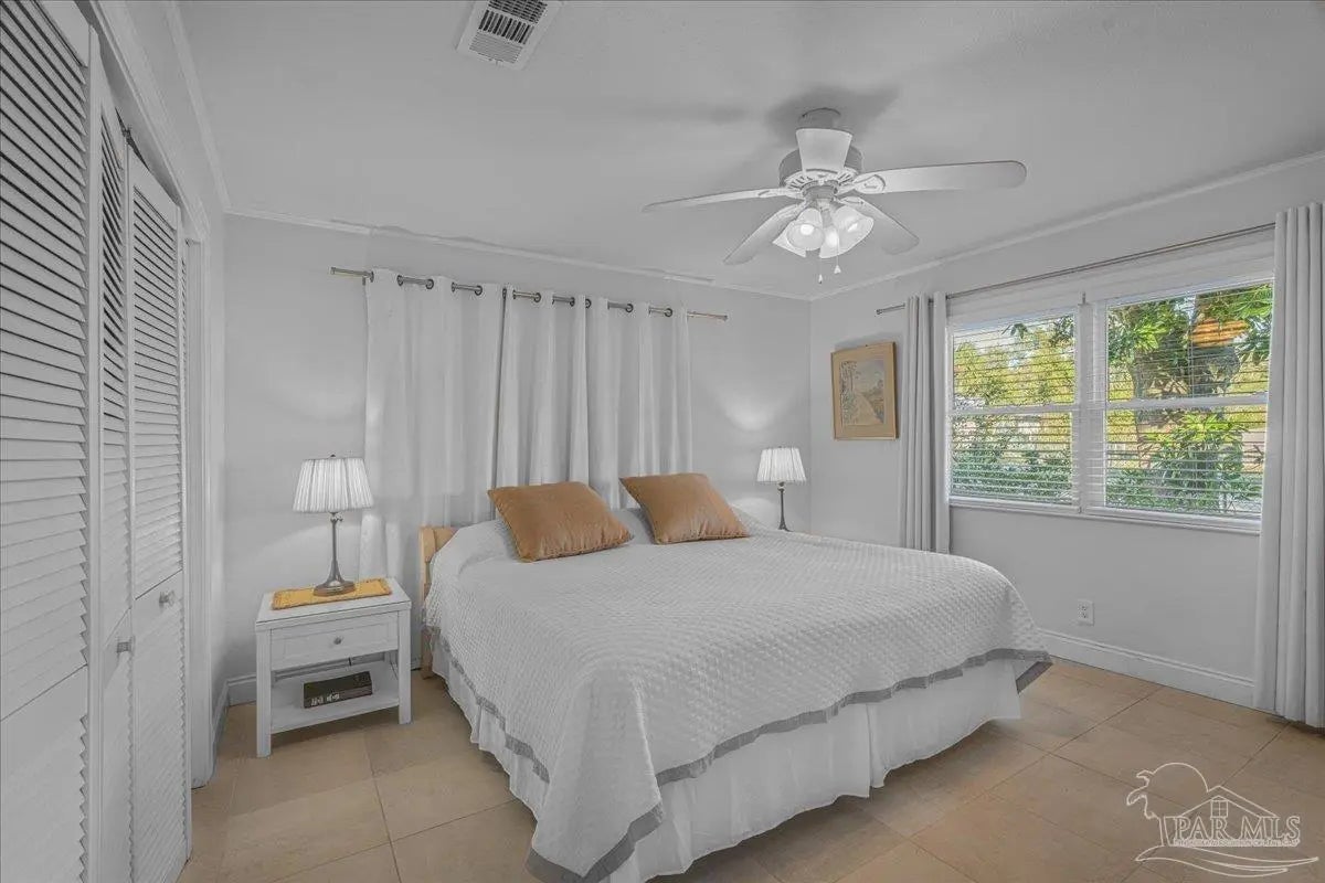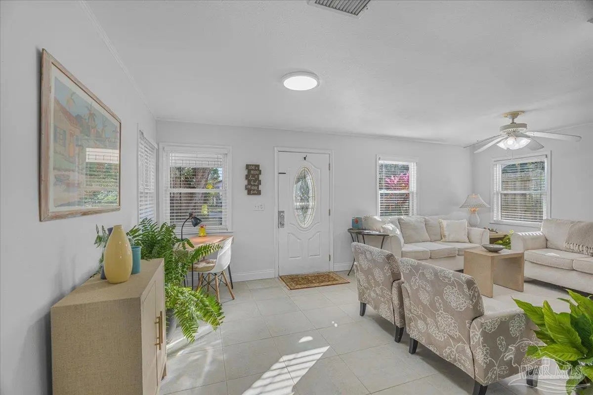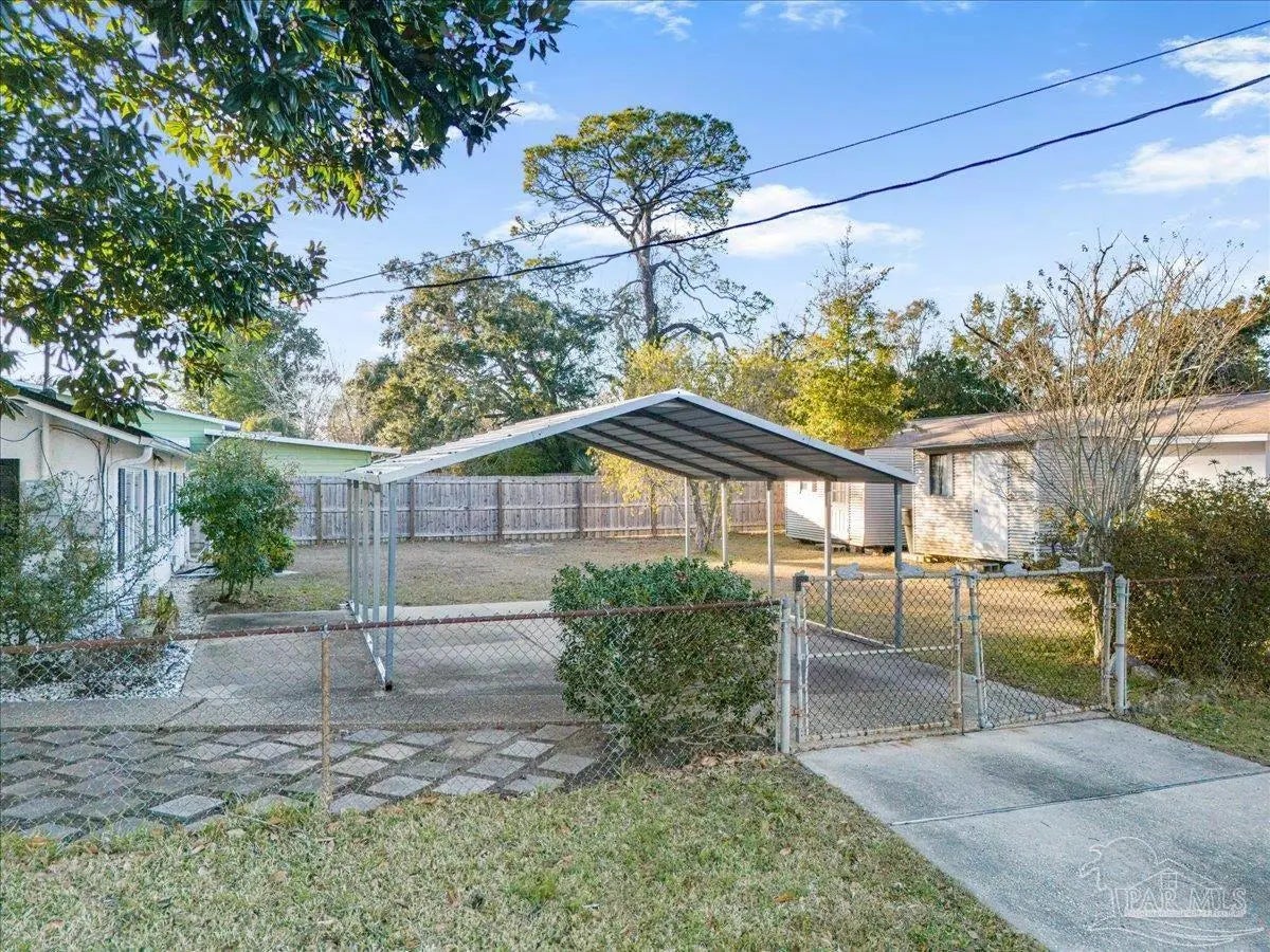 One level open plan living, with beautifully tiled interior, over-height ceilings, bright windows and light decor. 3 large-sized bedrooms with closets and a spacious bath with 4’x4’ walk-in shower. Effective Date 2010 ESCPA. Recently transformed 2021-2025 with new air conditioning, furnace, decorator tile floor, quartz counters, kitchen upgrades. New appliances, fridge, microwave, dishwasher, washer, dryer and bathroom remodel. All interior has been professionally drywalled and painted with new trim. The exterior has a new roof, paint and glazing replaced in the upgraded vinyl double pane windows. New electrical panel 2005 permitted. Huge sunny backyard. Carport on concrete slab, poured sidewalks and patio-stone work. Very private and a perfect combination of sun and shade. Sit out front or enjoy the large covered outdoor patio for dining and barbeques. This is an excellent fully fenced and gated corner property (2 lots). An ADU is allowed in the rear yard as per City Planning. Location, location, location! On the edge of downtown, close to Blue Wahoos stadium, Joe Patti’s Seafood, just blocks from the ocean, walk to Bruce Beach Park or waterfront dining. Home is wheelchair accessible, entry, bath, bedrooms all main living areas level floor.
