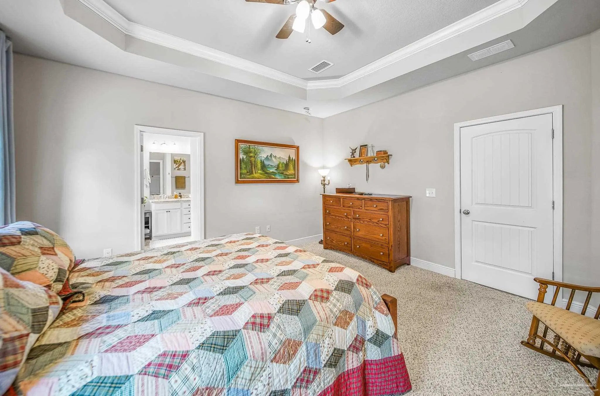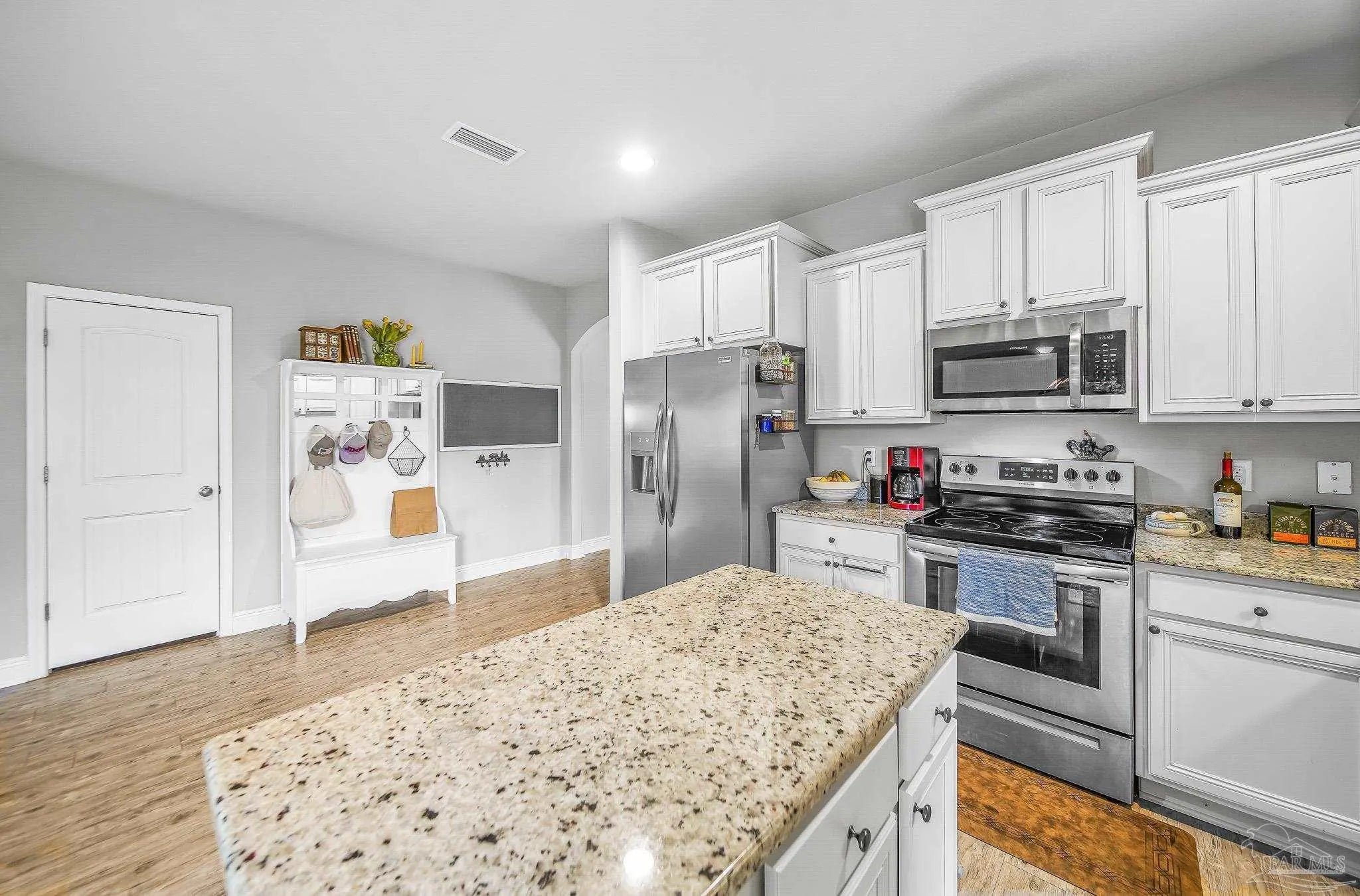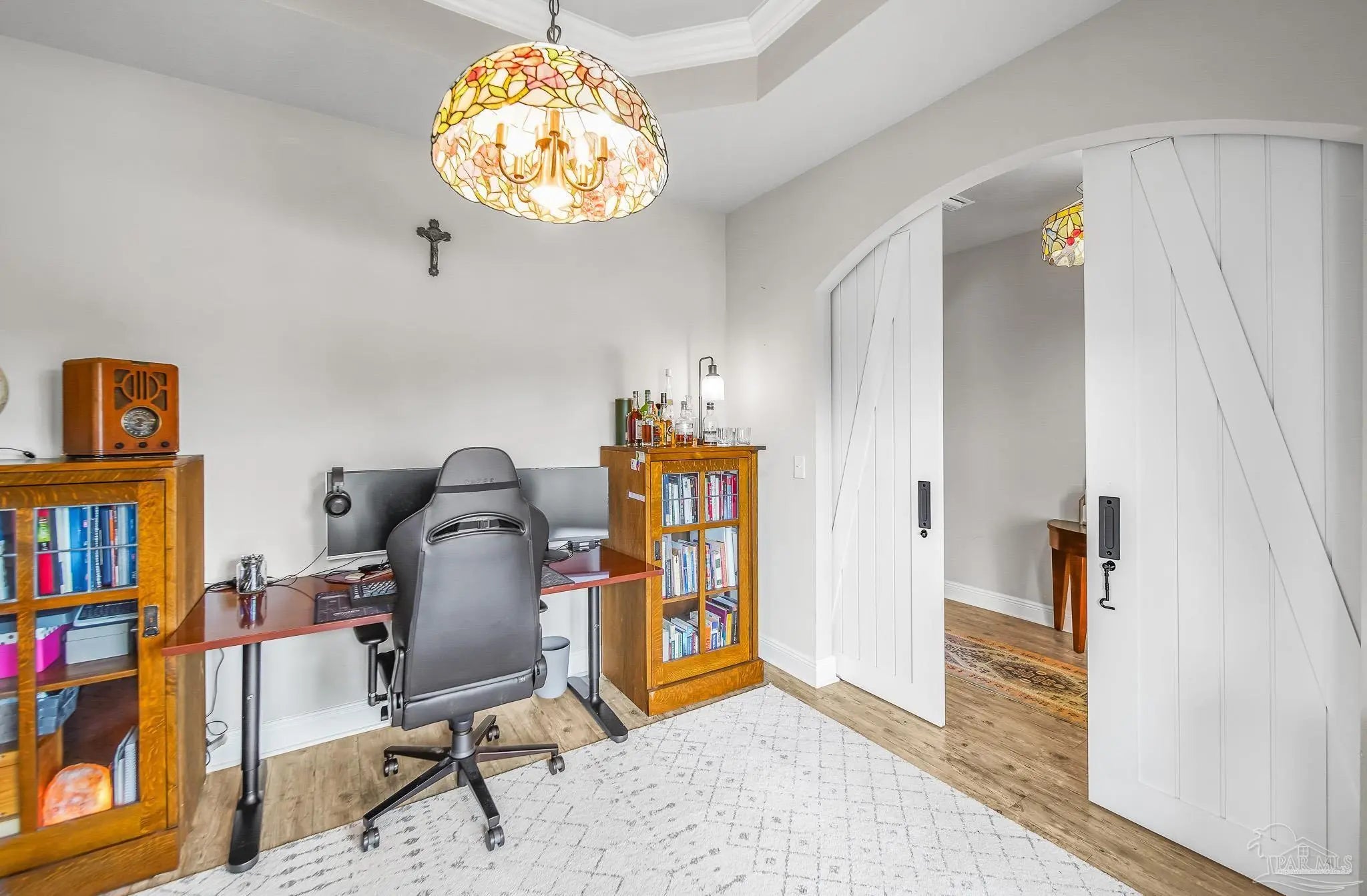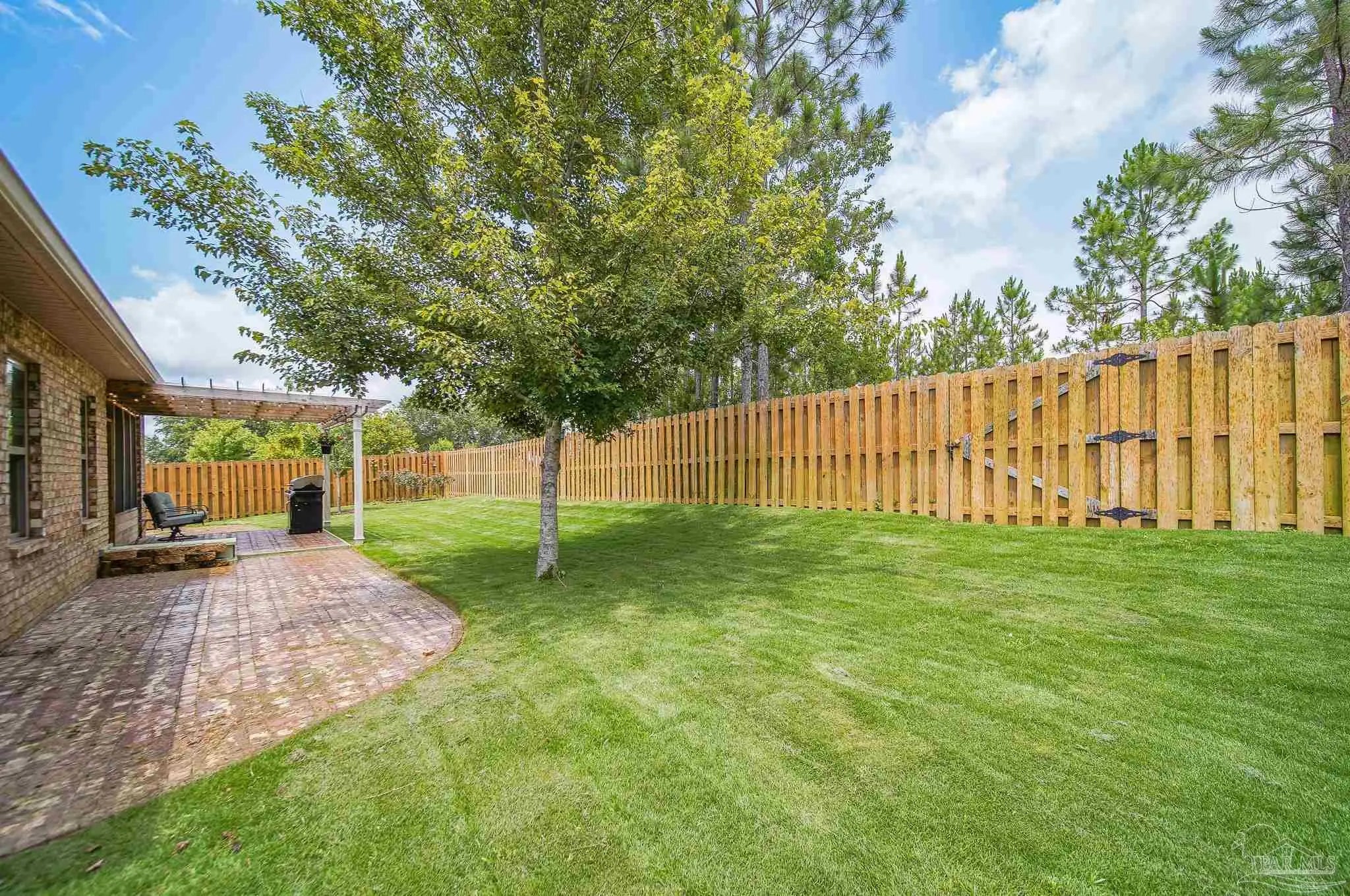 Beautiful brick contemporary in the highly desirable Ashley Plantation subdivision of Pace! This turnkey home offers nearly 2,000 square feet including three bedrooms, two full bathrooms, and a separate office. Although the home is only 6 years old, the current owners did a wonderful job adding both character and modern touches like board and batten siding in some rooms, a screened porch, and a brand new tankless water heater. Other architectural details like trey ceilings and arched doorways can be found throughout creating an inviting atmosphere. The main living areas are ideal for entertaining with a wide open kitchen, dining area, and great room. They say the kitchen is the heart of the home and this kitchen is no exception. Its both functional and beautiful with custom cabinets, granite counters, a center island, and a large pantry. Split from the guest rooms is the private primary suite. With views of the backyard and a stunning ensuite bathroom, it's a true oasis. The ensuite has similar finishes as the kitchen like a granite double vanity, as well as a soaking tub, and separate tile shower. It also has a huge walk-in closet so sharing space with your partner will no longer be an issue! Out back is a fully fenced yard with a brand new irrigation system and sod that can be enjoyed from both the paver patio and screened porch. Just imagine hosting barbecues this summer and lounging under that gorgeous pergola! This home is a must-see so schedule a showing today!