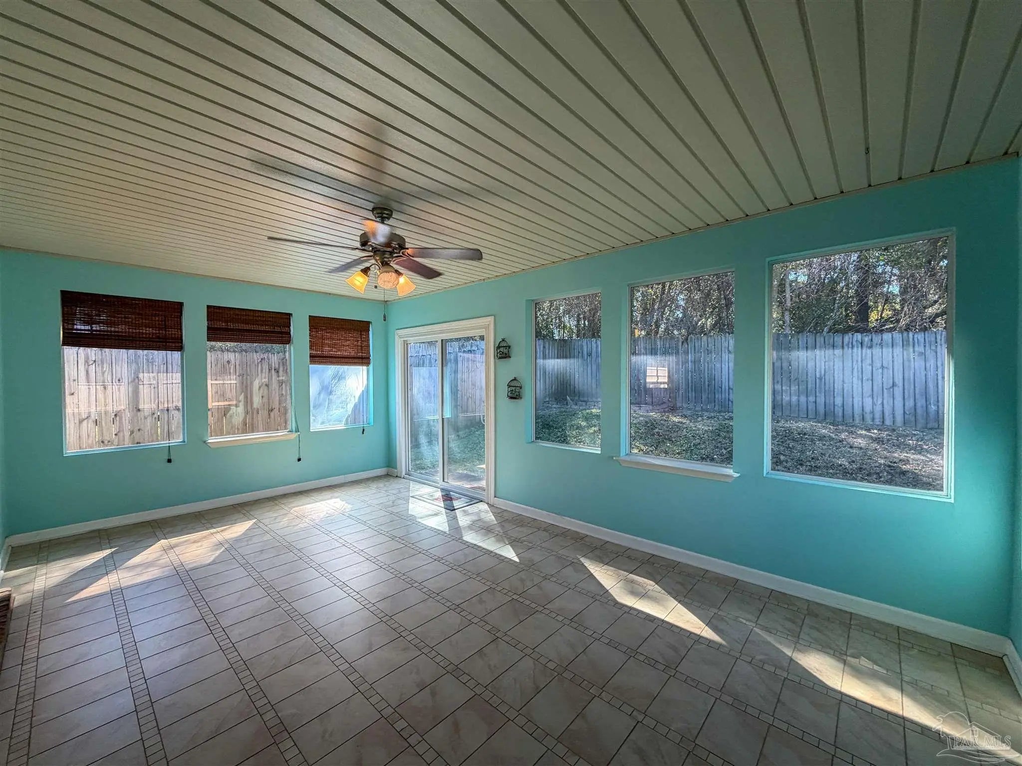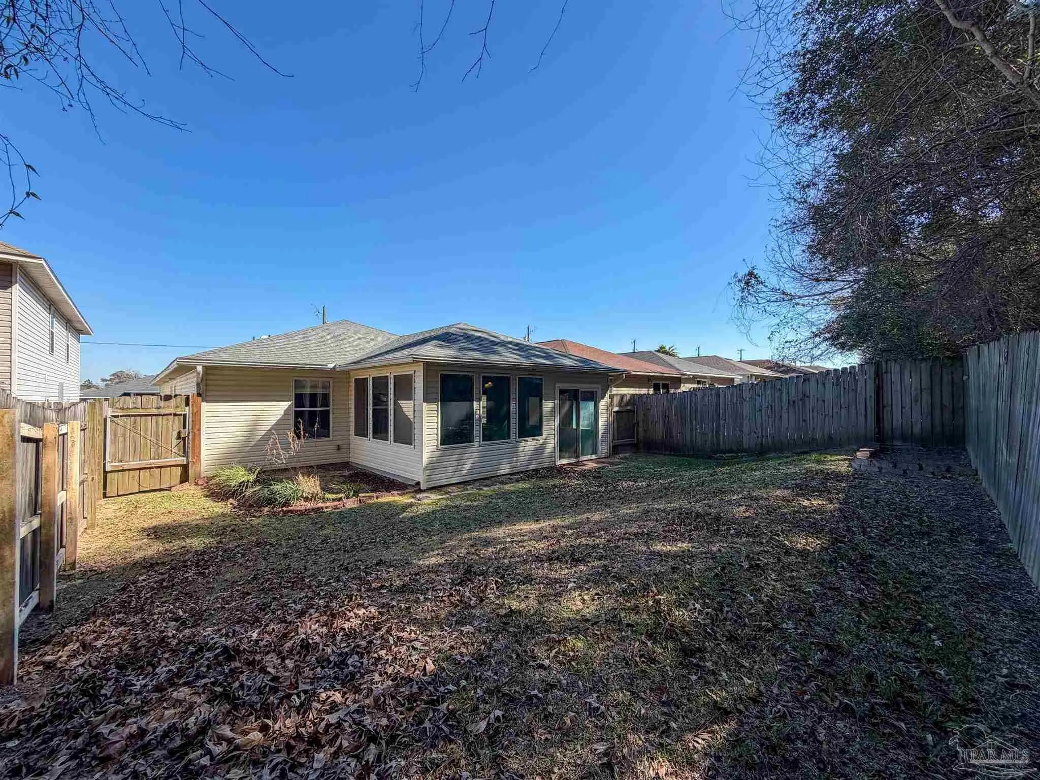 Three-bedroom, two-bathroom long-term rental home with a spacious sunroom located near Nine Mile Road and Hwy 29! This home features a living room that flows seamlessly into the kitchen with a breakfast nook. The large kitchen offers ample counter space and cabinetry and features a refrigerator, electric stove and microwave, dishwasher, and double sink. The primary bedroom has an ensuite bathroom with a double vanity, shower/tub combo, and spacious oversized closet. Washer and Dryer (as-is) is located by the primary bedroom and living room. There are two additional bedrooms and a guest bathroom with a shower/tub combo. There is a one car garage. The sunroom is not heated or cooled. The backyard is fenced. Note that this property backs up to an active railroad. Pets considered: up to 2 under 100 lbs, age 1+, prior approval, third-party screening; aggressive breeds not considered; $250 non-refundable pet fee per pet and additional deposit of $250. All Hometown Properties of the Gulf Coast residents are enrolled in the Resident Benefits Package (RBP). RBP is $50 per month and includes liability insurance, credit building for on-time rent, up to $1M ID theft protection, HVAC filter delivery (where applicable), resident rewards, and on-demand pest control. More details provided with application.