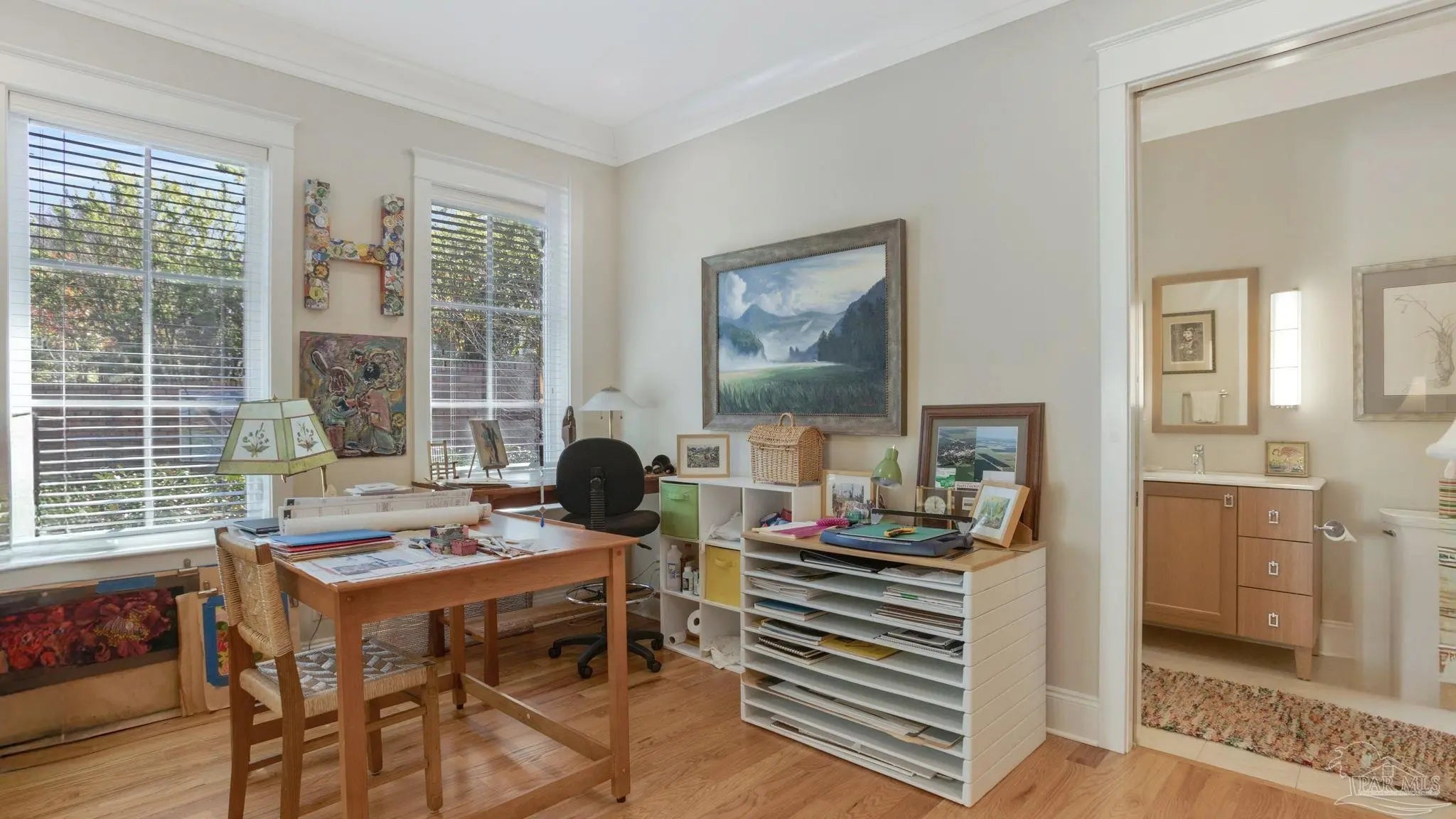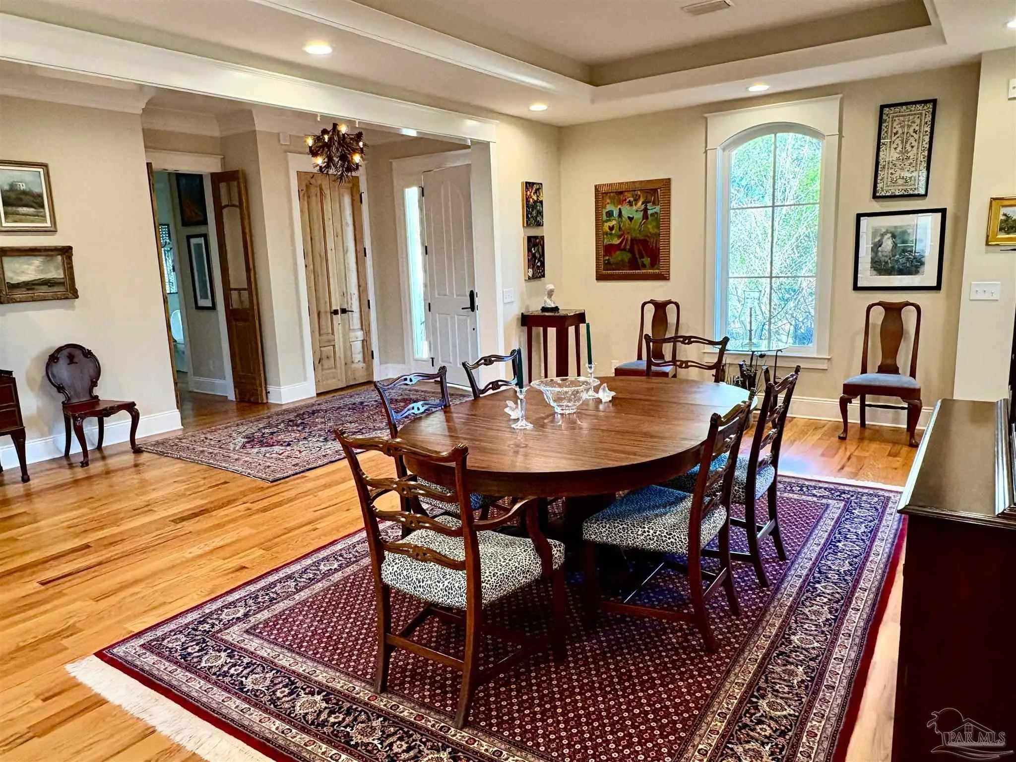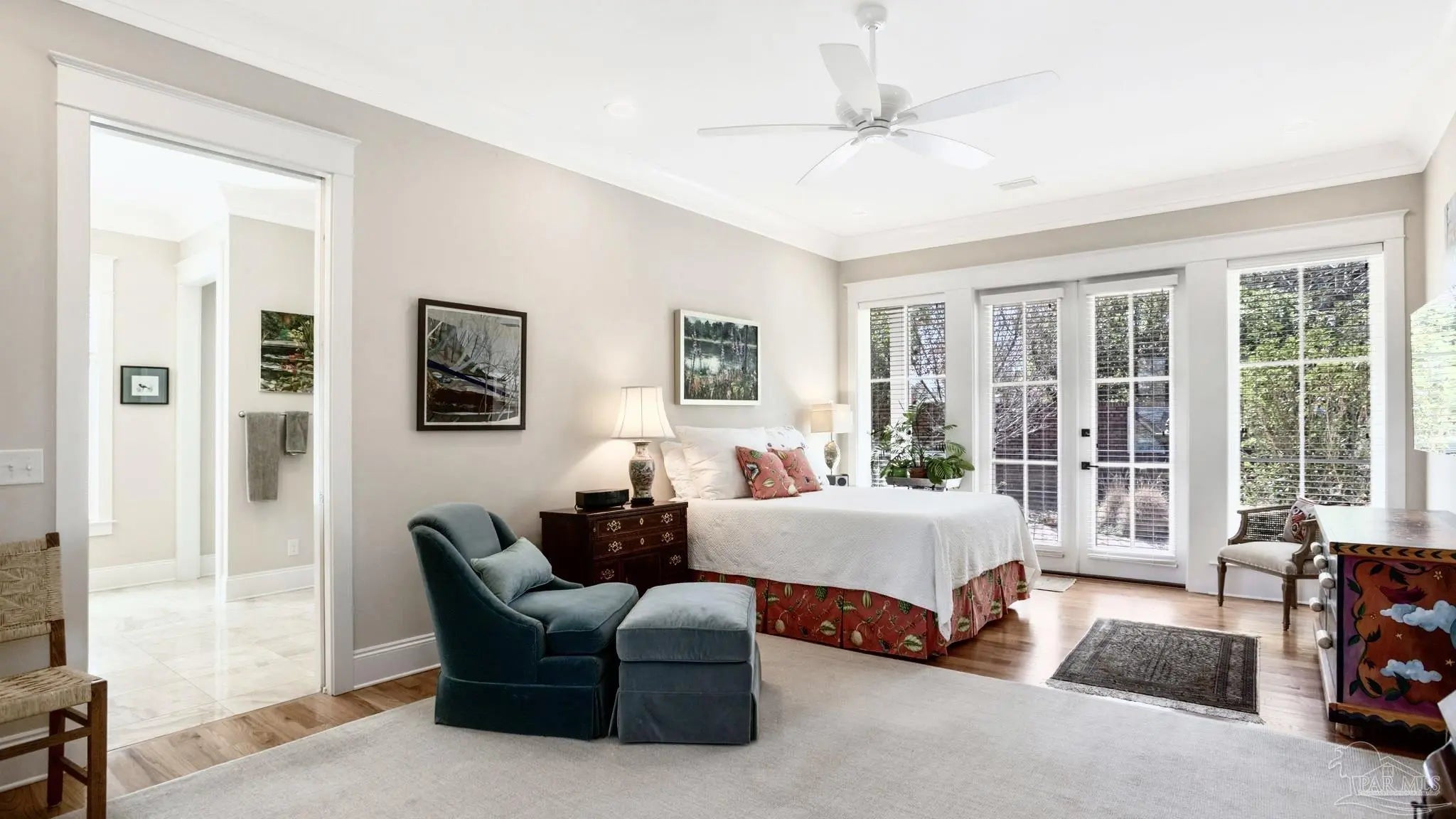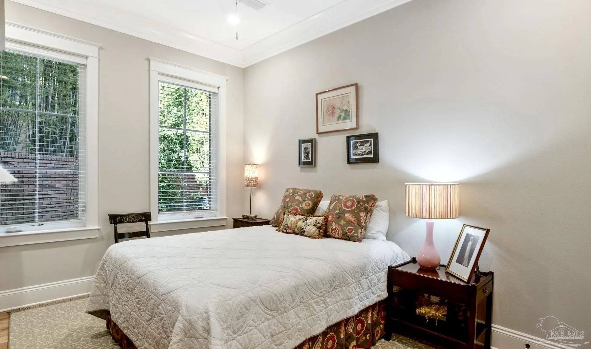 This elegant 9 year old Southern Traditional home rises with quiet confidence and charm in sought after East Hill. Located across from Bayou Texar. The entry opens to 11.5’ ceilings with a grand foyer (8'x22') with two step cove molding and beautiful polished 4” red oak hardwood floors. The expansive (13’x 22’) Dining room is filled with natural light pouring in through arched impact glass window and French doors. Transitioning to the heart of the house is the family room with an impressive 11’ high x 32’ long floor to ceiling solid brick accent wall and fireplace lending warmth and texture. The professionally designed modern kitchen with top of the line Thermador appliances, gas Range and rich quartz countertops and large island with prep sink support the open design. A large pantry and a 10’ long wet bar with ice maker that also serves as a secondary work space or buffet. A serene private primary suite in a split plan is designed as a true retreat, featuring a comfortable sitting area. French doors open to a private covered porch overlooking a New Orleans style, walled courtyard with tiered fountain echoing peaceful sounds of water splashing. The spacious bath offers a large walk-in or roll-in glassed shower, while the generous custom designed closet features built in cabinetry with hanging space, drawers and shelving. Two additional bedrooms with ensuite baths offer privacy and convenience. Inspired by nature, the owner has thoughtfully designed, planted and maintained a botanical garden and tranquil wildlife sanctuary, emphasizing native plants. Spring will bring a revelation of and texture with wildflowers, camellias - even a wetland oasis!!!Extras include a side entry garage with 220 outlet for charging station, security system with camera monitors, whole house generator. Built to handicapped accessible standards this home is truly a lifetime treasure.