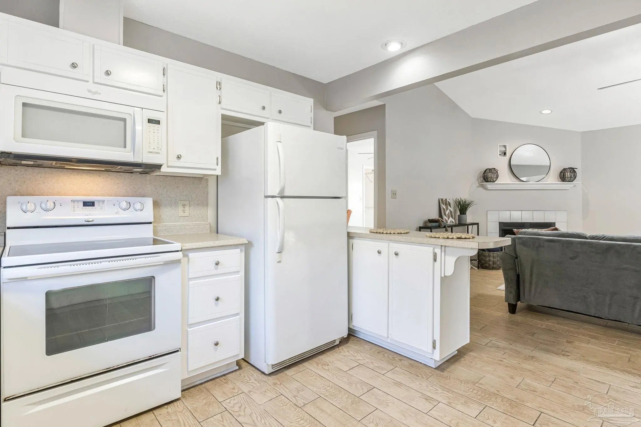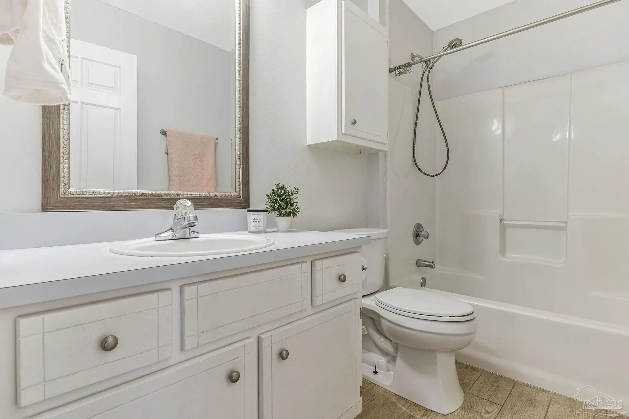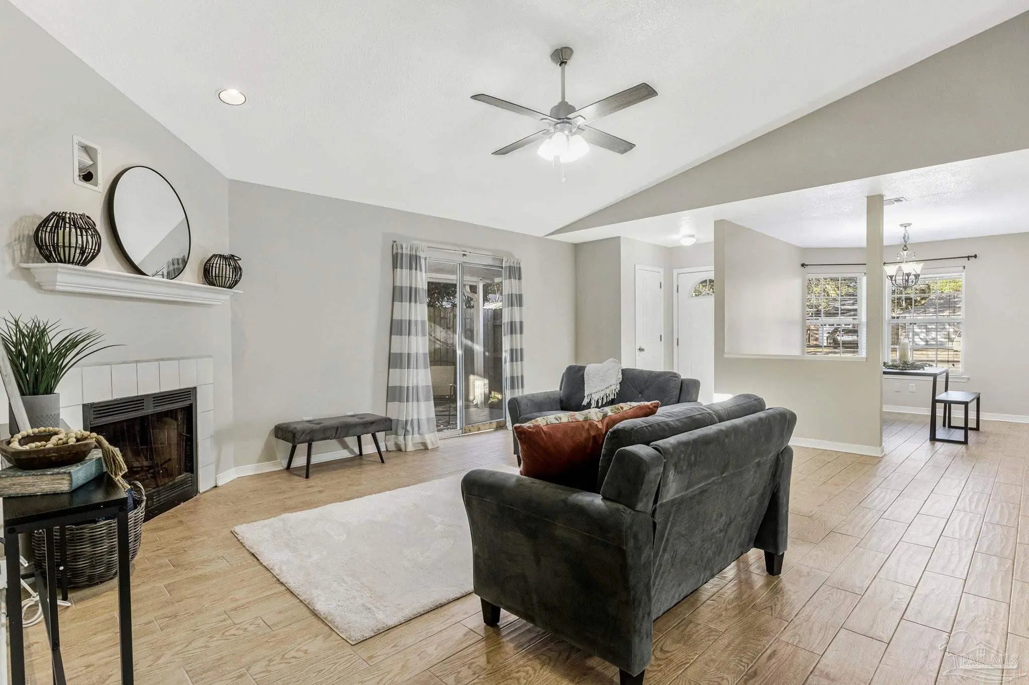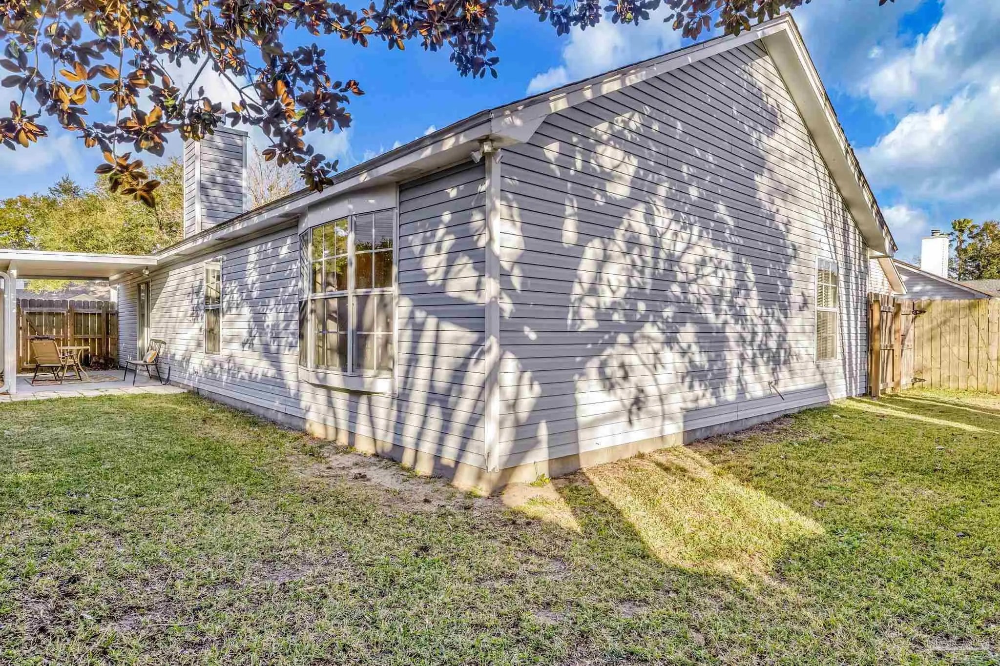 Welcome to one of the cutest cottages you’ll find—perfectly priced and ideally located in the highly sought-after Cordova Park school district! Tucked away on a quiet cul-de-sac, this charming home offers a one-car garage and a welcoming living room with vaulted ceilings that create an open, airy feel. Wood-look tile flows beautifully through the main living areas, complementing a relaxed coastal, beachy vibe that feels right at home here in Pensacola. The dedicated dining area is just off of the living room, and perfect for entertaining. The kitchen, also part of the open concept has ample cabinetry for storage, making everyday living easy and functional. An indoor laundry area adds convenience, and the washer and dryer convey with the home. The bedrooms feature newer carpet, and one of the guest bedrooms is especially inviting with its generous size and charming bay window. The primary bedroom comfortably fits a king-size bed and additional furniture, and the en-suite bathroom offers a garden tub/shower combo, walk-in closet, and a single sink vanity with an extra vanity area—perfect for adding a second sink or keeping the space just as it is. Step outside to a peaceful backyard shaded by beautiful dogwood trees, complete with a covered patio and wooden privacy fence—ideal for relaxing or entertaining. This sweet cottage truly checks all the boxes with charm, location, and comfort all wrapped into one special home.