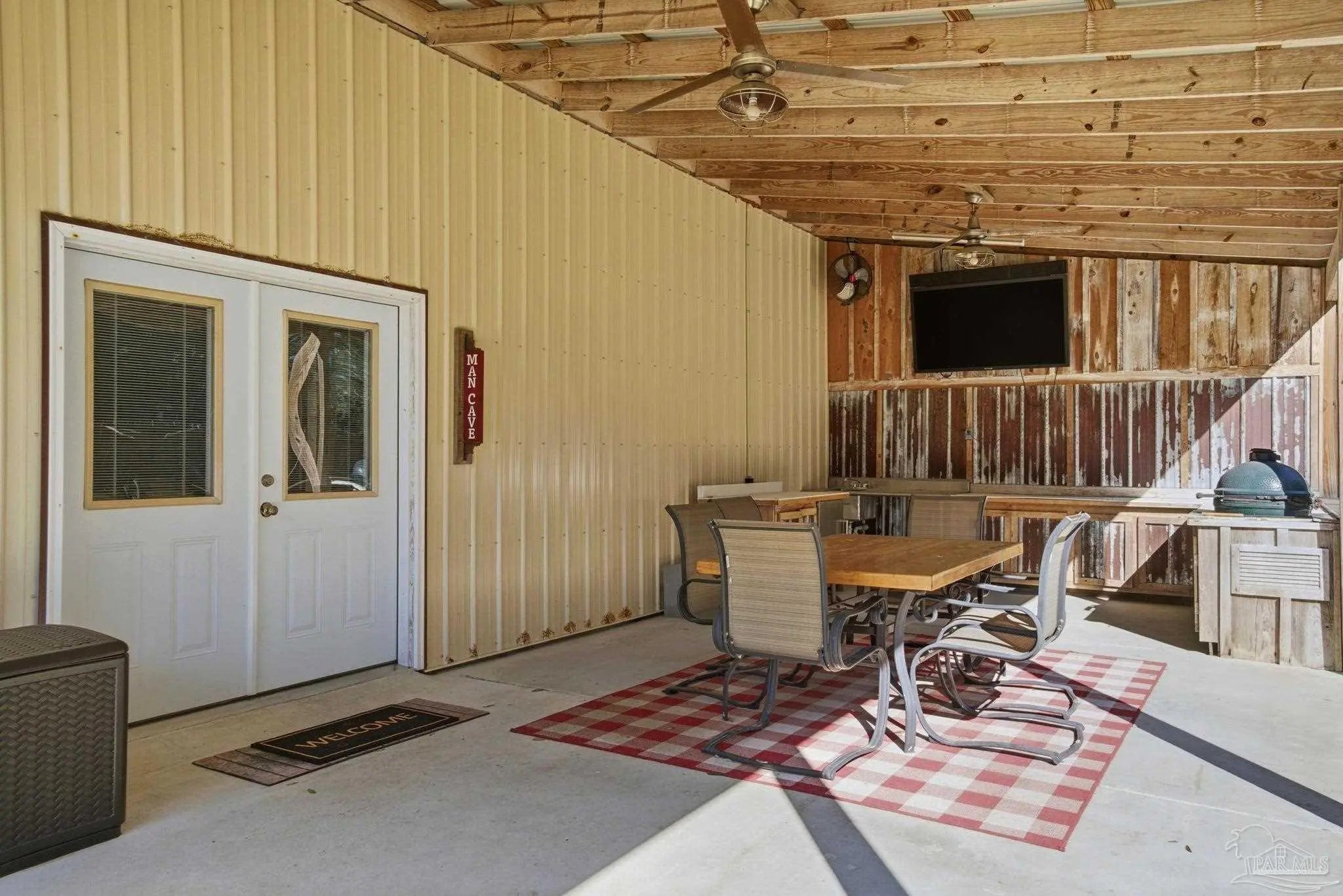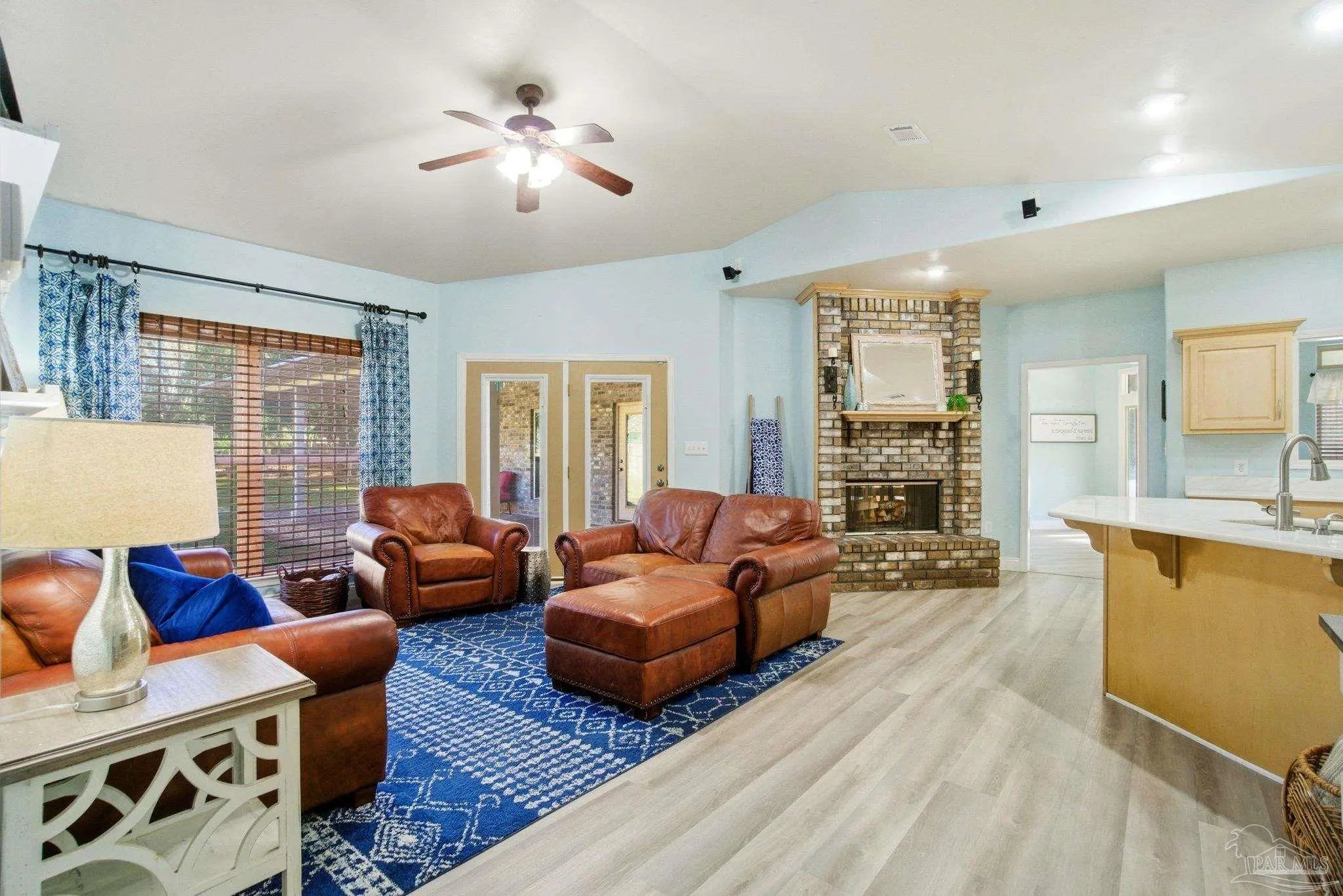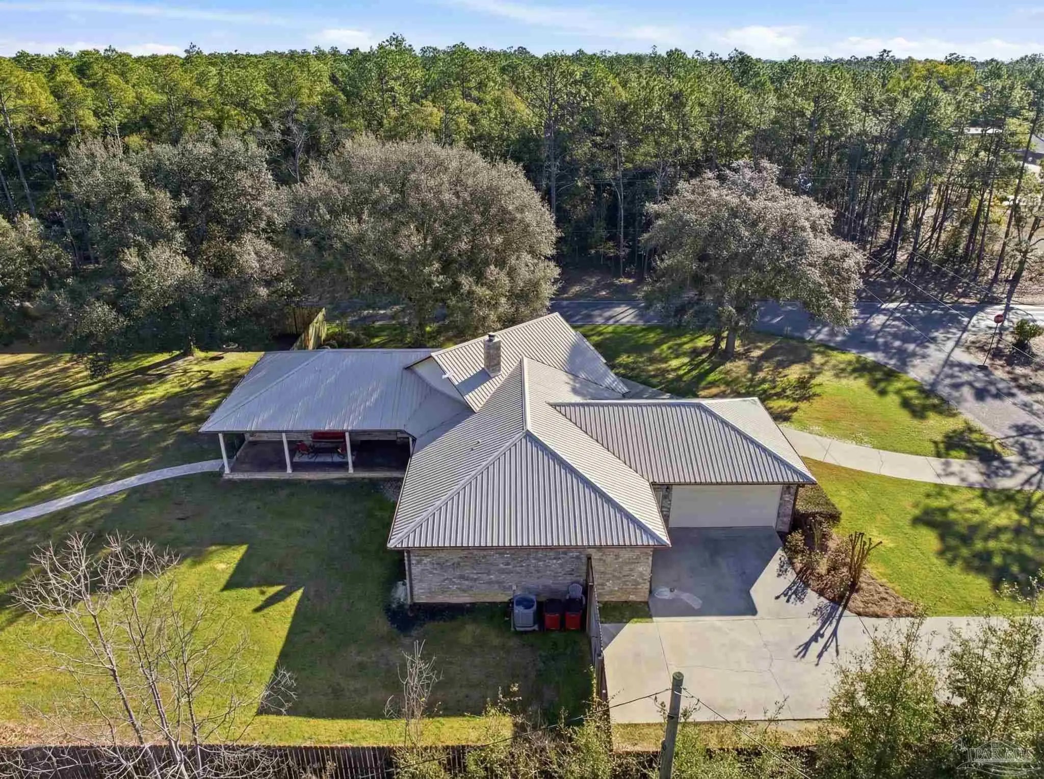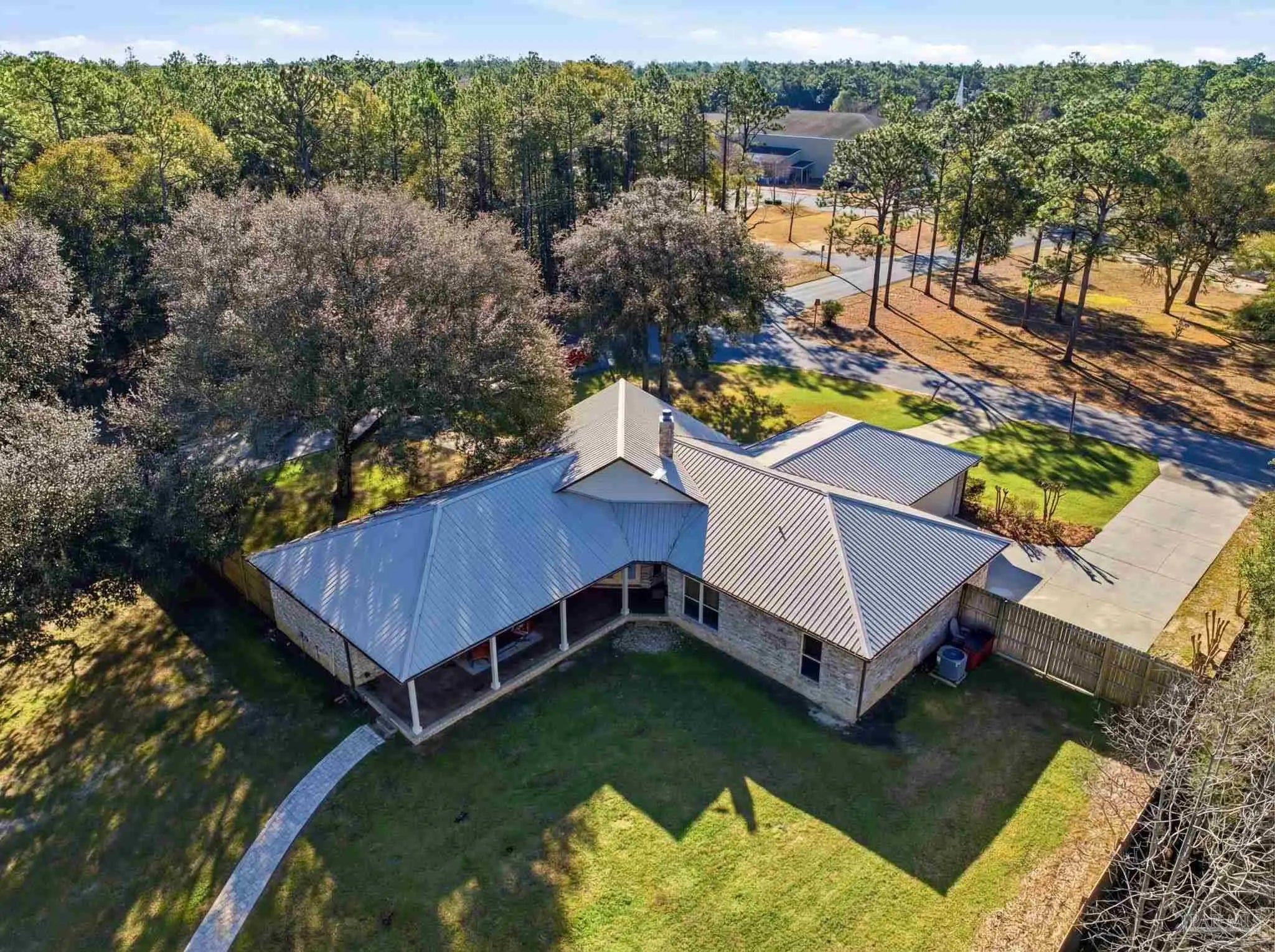 Set on a full acre, this beautifully maintained 3-bedroom, 3.5-bath home offers space, comfort, and serious peace of mind. Enjoy all updated flooring with no carpet anywhere, plus a stunning double-sided fireplace connecting the living and dining rooms. The kitchen is designed to impress with maple-stained cabinetry, updated calcite countertops, a deep sink, island cooktop, built-in oven and microwave, and a counter-depth refrigerator. Two cozy home offices make working from home effortless.The spacious main suite features built-in bookshelves, a dedicated mini-split for added comfort, and private access to the massive covered back porch, also accessible from the living and dining areas. The main bath offers separate vanities, a large walk-in closet, and its own 50-gallon water heater. Both secondary bedrooms are true suites, each with a private bathroom and walk-in closet. Outdoor living truly shines with a circular and extended driveway, cozy front porch, huge covered back porch, outdoor firepit area, and paver walkway leading to the show-stopping 40x30 (1,200 sq ft) detached building—ideal as a man cave, guest retreat, home gym, studio, hobby space, or private office. This incredible space also features a 15x40 covered overhang for entertaining, a 65” outdoor TV & green egg(included), open interior layout, walk-in closet, full bathroom, and a mini-split added in 2025. A double gate on the side of the fence provides easy access for your boat or RV. This home is built for Florida living with a 48kW whole-property generator, regularly serviced and capable of powering the entire home and the detached building. Additional features include a security system, metal roof, gutters, termite bond, sprinkler system, UV light added to HVAC (2025), oversized garage with coated floors and cabinets that stay, and an 8-foot privacy fence. A rare combination of space, flexibility & upgrades—this property truly has it all.