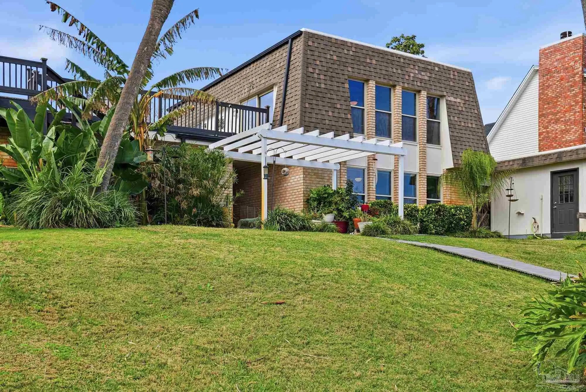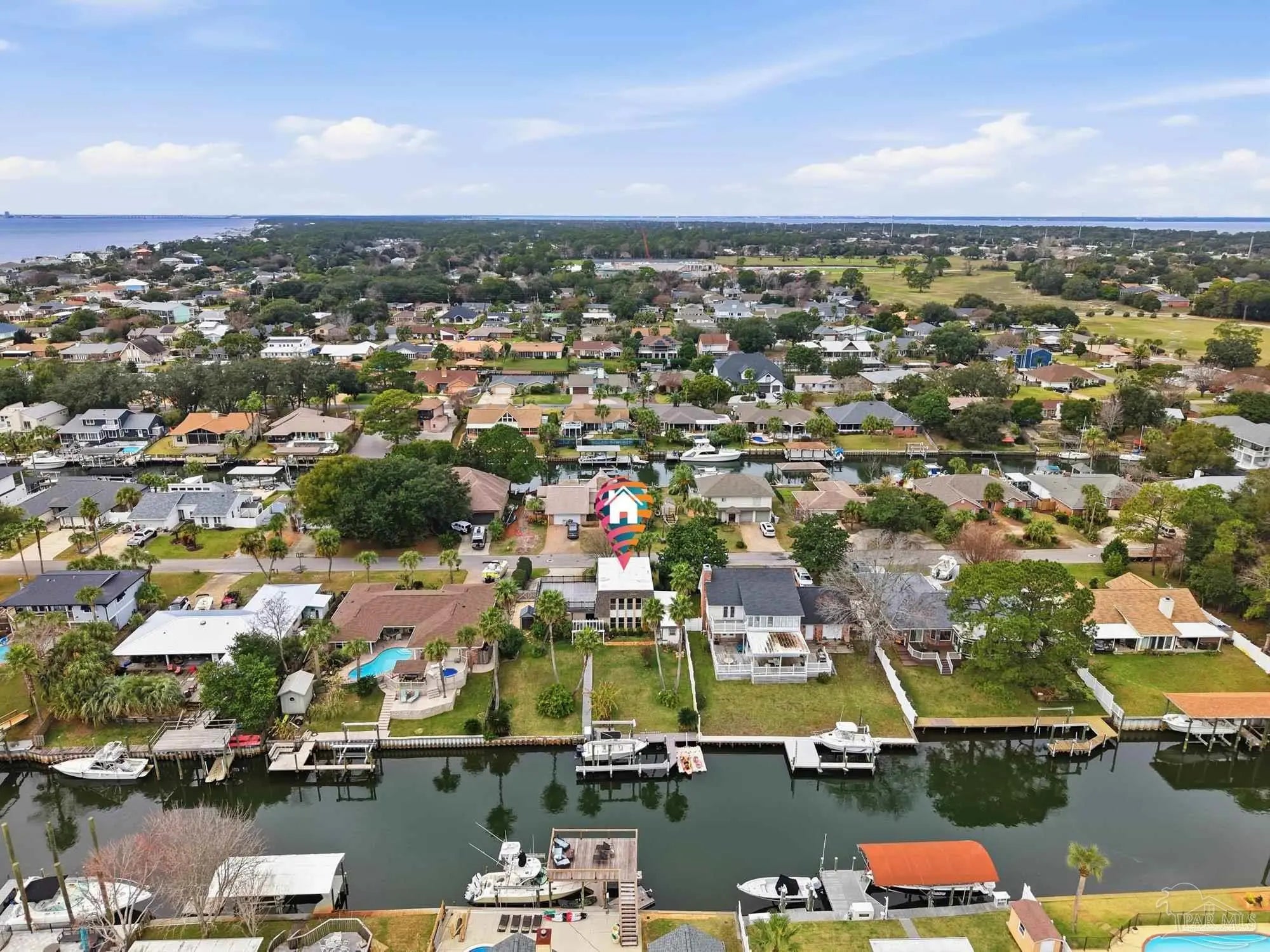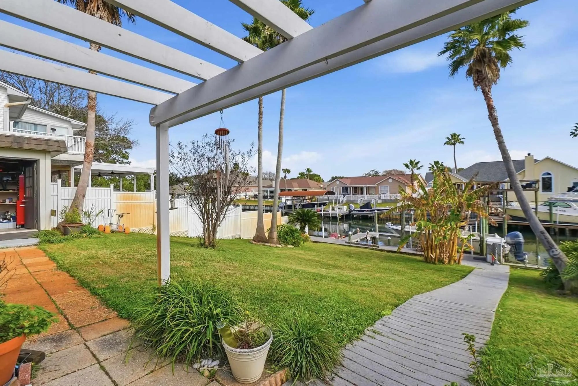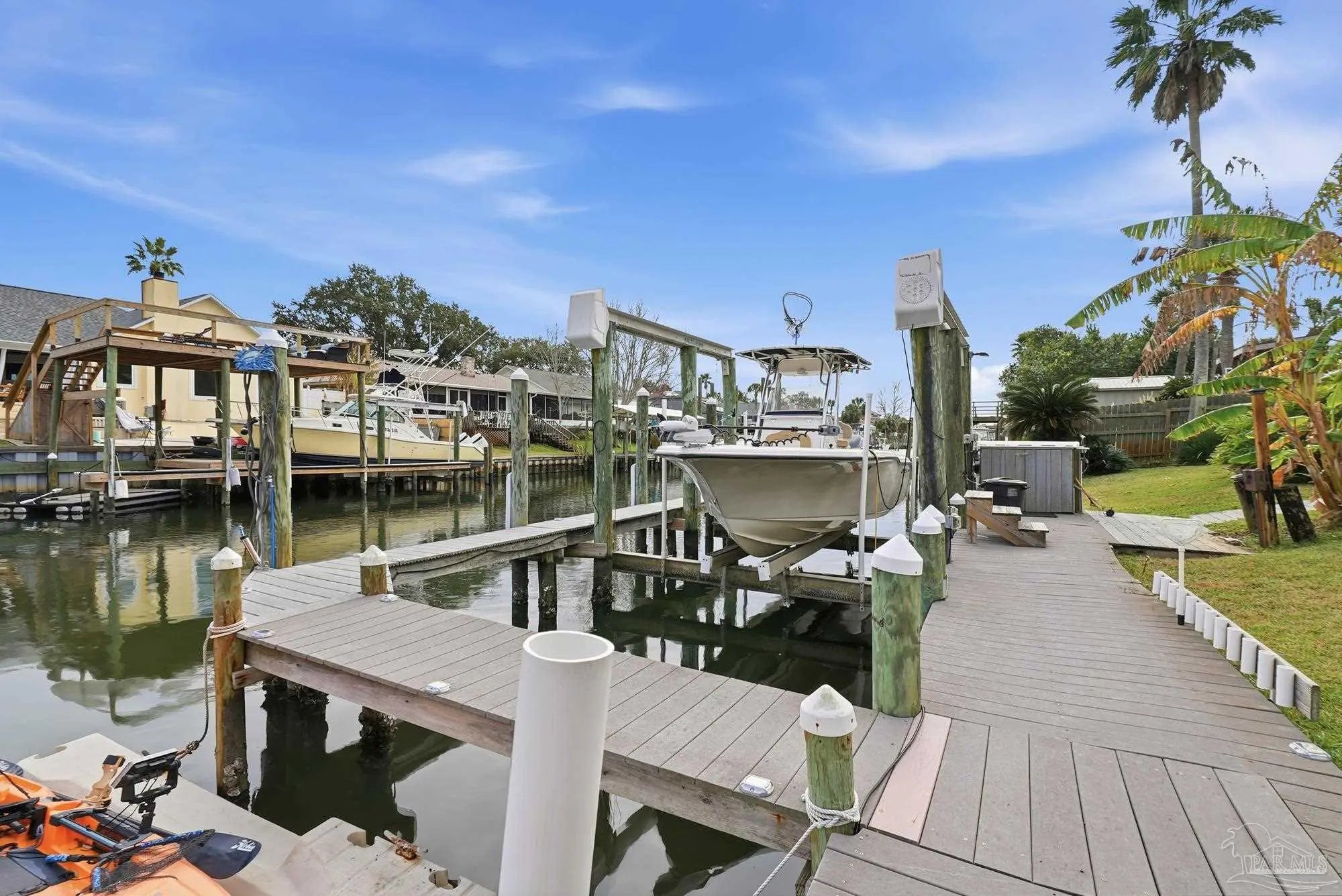 Welcome to effortless coastal living where every day feels like a vacation! This 3br, 2.5ba canal-front stunner is made for boaters and entertainers! Cruise out anytime from your own boat slip with a 20,000lb boat lift, then rinse off in the outdoor shower room after a day on the water. The huge upper deck sets the stage for epic gatherings, sunset cocktails, and weekend celebrations. A detached bonus space (previously the garage) offers flexibility for a guest suite, gym, game room, storage, etc.. or can be converted back to garage space. The 2nd floor offers open kitchen and living space, and the 3 bedrooms are conveniently located on the main floor. Come embrace this golf cart friendly community just minutes from the park and Tiger Point Golf Course!