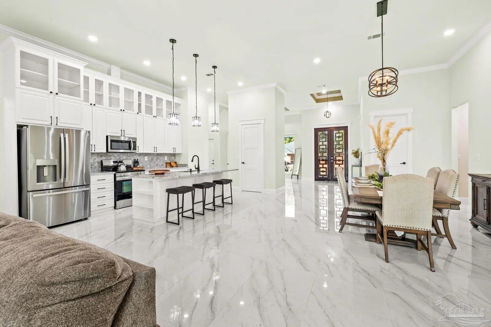 Welcome to this custom-built Craftsman masterpiece in the prestigious Marcus Lake subdivision, where refined luxury meets timeless design. From the moment you arrive, the home’s grand, oversized front door makes a striking first impression, setting the stage for the elegance showcased throughout. Step inside to a magnificent open-concept floor plan enhanced by soaring 9-12 foot tray ceilings that flood the home with natural light and create an impressive sense of space. Every detail reflects exceptional craftsmanship and upscale finishes, offering both beauty and functionality. The gourmet chef’s kitchen is thoughtfully designed to impress, featuring abundant custom cabinetry, granite countertops, stainless steel appliances, and an expansive pantry with granite surfaces. Perfect for elevated entertaining, the home also includes a butler’s pantry-wine cellar, creating the ultimate entertaining experience. Spanning approximately 2,600 square feet, this residence offers four spacious bedrooms, three beautifully appointed bathrooms, and a generously sized office, ideal for today’s flexible lifestyle. The presence of two primary suites makes this home perfectly suited for multi-generational living or accommodating guests in complete comfort. Each room has been carefully designed to maximize space, style, and livability. Unwind while taking in serene lake views and embrace the tranquil, upscale lifestyle that Marcus Lake provides. A separate covered patio creates the perfect setting for outdoor cooking and gatherings, while the oversized garage offers ample space for vehicles, storage, and more. This home is the perfect blend of luxury, comfort, and thoughtful design. Experience it for yourself — schedule your private tour today and discover the exceptional home you’ve been waiting for.