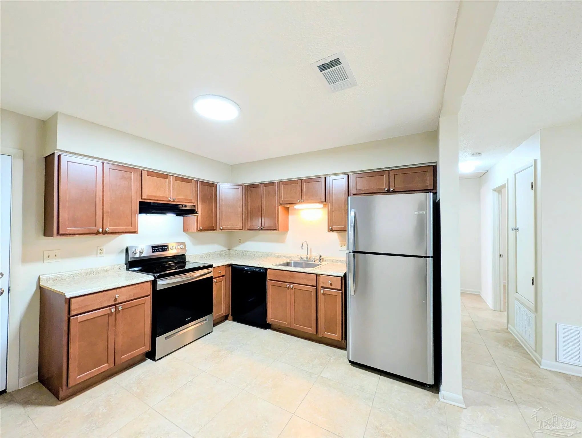 This well-maintained brick duplex offers a clean, updated interior and a practical single-story layout. The exterior features classic brick construction with a covered front entry and a private concrete walkway/drive area. Mature trees provide shade and privacy, creating a quiet residential feel. Inside, the unit includes a bright, functional kitchen with wood cabinetry, laminate countertops, and stainless steel appliances, including a refrigerator, range, and dishwasher. The open layout provides efficient workflow and good natural and overhead lighting. The washer/dryer hookups are located in the outdoor storage room by the covered patio. The bathroom features a double-sink vanity with a stone-look countertop, framed mirrors, updated fixtures, and a tub/shower combination with tiled surround. Neutral tile flooring and light wall colors throughout create a fresh, move-in-ready appearance. This property requires participation in the MSPM Resident Benefit Package for an additional monthly fee. Additional information on this program can be found upon submission of application.