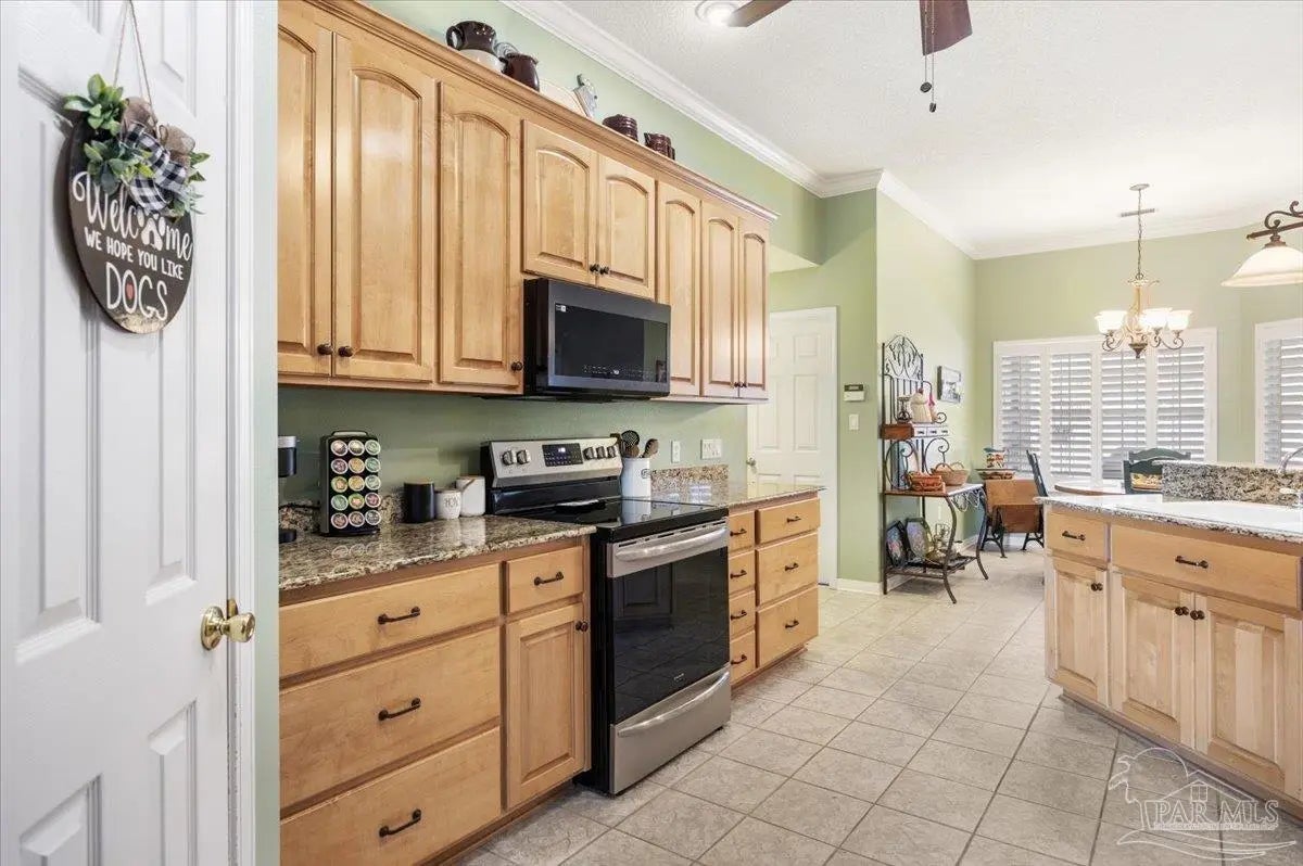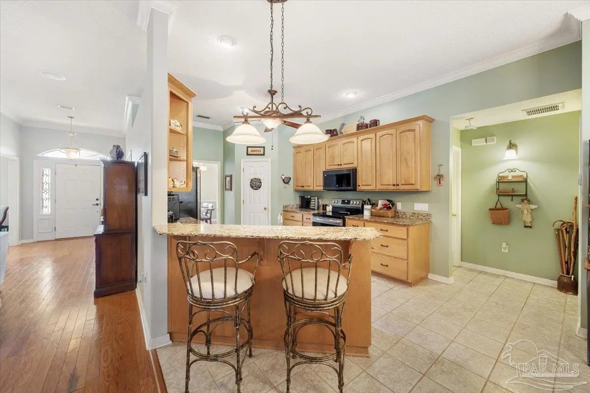 Set on a spacious 0.6-acre lot with screened in pool in the Sawmill Subdivision in Pace, 3656 Sawmill Cir offers the comfort of a well-established neighborhood with no HOA and the space and privacy buyers are looking for. A wide front porch sets the tone as you enter the home, where hardwood flooring flows throughout the main living areas and tile finishes the kitchen and bathrooms. At the front of the home, a formal dining room provides an ideal space for gatherings, while an office or bonus room across the hall offers flexibility for work, hobbies, or additional living space. The large living room is both functional and inviting, featuring built-in cabinets and shelving along with a propane fireplace as a cozy focal point. The kitchen is designed for everyday living and entertaining, with real wood cabinetry, granite countertops, a farm sink, newer stainless steel appliances, a pantry, and a breakfast nook overlooking the backyard. Plantation shutters throughout the home add character, charm, and privacy. The primary suite is spacious and well-appointed, featuring a tray ceiling and an ensuite bathroom with a soaking tub, separate shower, double vanities, a walk-in closet, and a linen closet. Two additional bedrooms are generously sized and share a Jack-and-Jill bathroom that includes a large tub and a separate shower, offering both convenience and comfort. Outdoor living truly shines at this property. The covered back porch, accessible from both the primary bedroom and a rear bedroom, is designed for relaxation and entertaining with a sink, mini fridge, and a hot tub offered as-is. The screened-in vinyl inground pool is the highlight of the backyard, creating a private retreat ideal for summer days and evening gatherings. A privacy-fenced yard and garden shed complete the outdoor space, while the side-entry two-car garage adds curb appeal and functionality.
