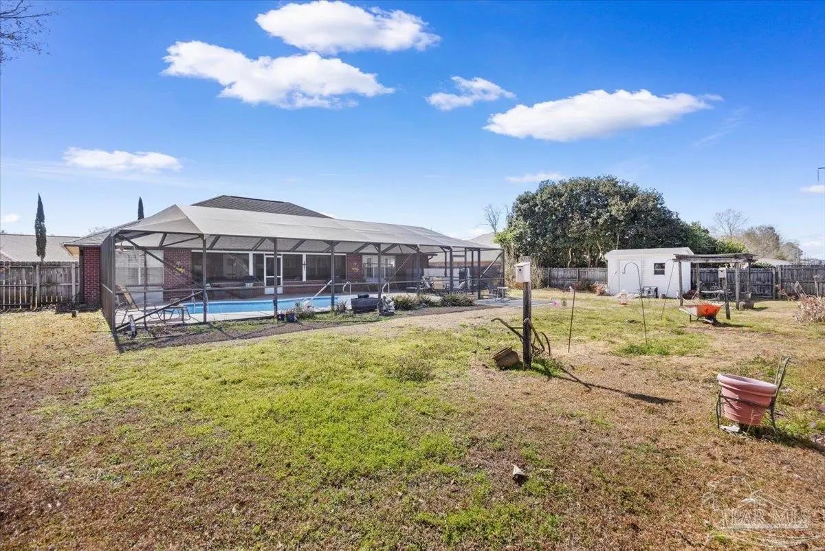 Set on a spacious 0.6-acre lot in the Sawmill Subdivision in Pace, 3656 Sawmill Cir offers the comfort of a well-established neighborhood with no HOA and the space and privacy buyers are looking for. Surrounded by beautifully maintained homes, this property blends thoughtful interior design with exceptional outdoor living. A wide front porch sets the tone as you enter the home, where hardwood flooring flows throughout the main living areas and tile finishes the kitchen and bathrooms. At the front of the home, a formal dining room provides an ideal space for gatherings, while an office or bonus room across the hall offers flexibility for work, hobbies, or additional living space. The large living room is both functional and inviting, featuring built-in cabinets and shelving along with a propane fireplace as a cozy focal point. The kitchen is designed for everyday living and entertaining, with real wood cabinetry, granite countertops, a farm sink, newer stainless steel appliances, a pantry, and a breakfast nook overlooking the backyard. Plantation shutters throughout the home add character, charm, and privacy. The primary suite is spacious and well-appointed, featuring a tray ceiling and an ensuite bathroom with a soaking tub, separate shower, double vanities, a walk-in closet, and a linen closet. Two additional bedrooms are generously sized and share a Jack-and-Jill bathroom that includes a large tub and a separate shower, offering both convenience and comfort. Outdoor living truly shines at this property. The covered back porch, accessible from both the primary bedroom and a rear bedroom, is designed for relaxation and entertaining with a sink, mini fridge, and a hot tub offered as-is. The screened-in vinyl inground pool is the highlight of the backyard, creating a private retreat ideal for summer days and evening gatherings. A privacy-fenced yard and garden shed complete the outdoor space, while the side-entry two-car garage adds curb appeal and functionality.