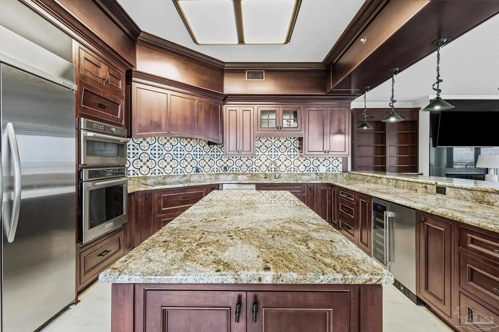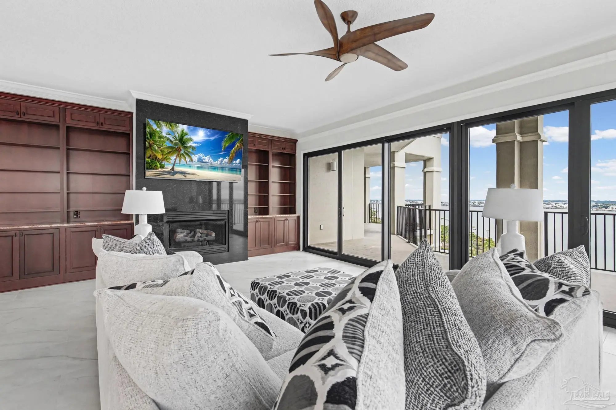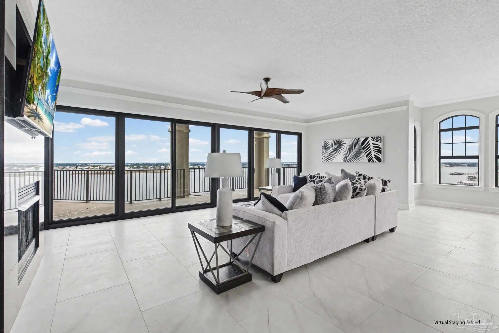 Experience elevated coastal living in this expansive 3,714 sq ft top-floor penthouse at Florencia, offering space, privacy, and sweeping water views. The residence has been thoughtfully refreshed with new flooring throughout and an updated kitchen designed for both everyday living and entertaining. The open-concept layout flows seamlessly into generous living and dining areas, framed by floor-to-ceiling windows that capture panoramic views of the Gulf and Old River. The kitchen features modern finishes, ample storage, and a layout that opens to the main living space—ideal for hosting or relaxed coastal living. With six bedrooms and five and a half baths, the floor plan offers exceptional flexibility, including a dedicated wine room with climate-controlled storage, ideal for collectors or entertaining. An oversized waterfront balcony spans the width of the residence, creating effortless indoor-outdoor living and unforgettable sunset views. Florencia is a private, gated waterfront community offering indoor and outdoor pools, DEEDED beach access, fitness facilities, tennis courts, and beautifully maintained grounds. Rentals are restricted to a 30-day minimum, supporting a quieter, owner-focused environment. TWO COVERED parking spots and additional storage completes this exceptional offering. All information is deemed reliable but not guaranteed. Buyer and/or buyers agent to verify all information deemed important.