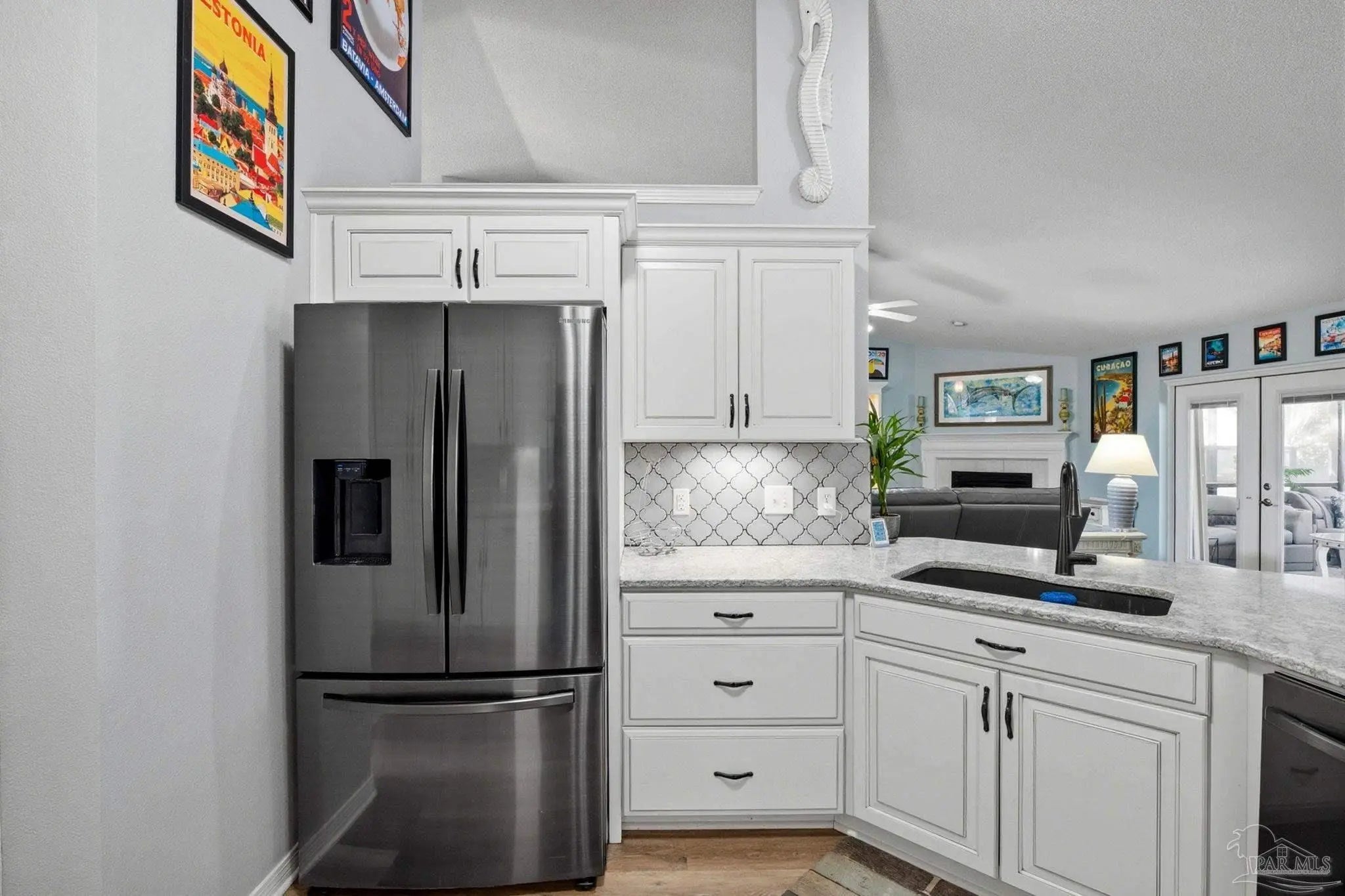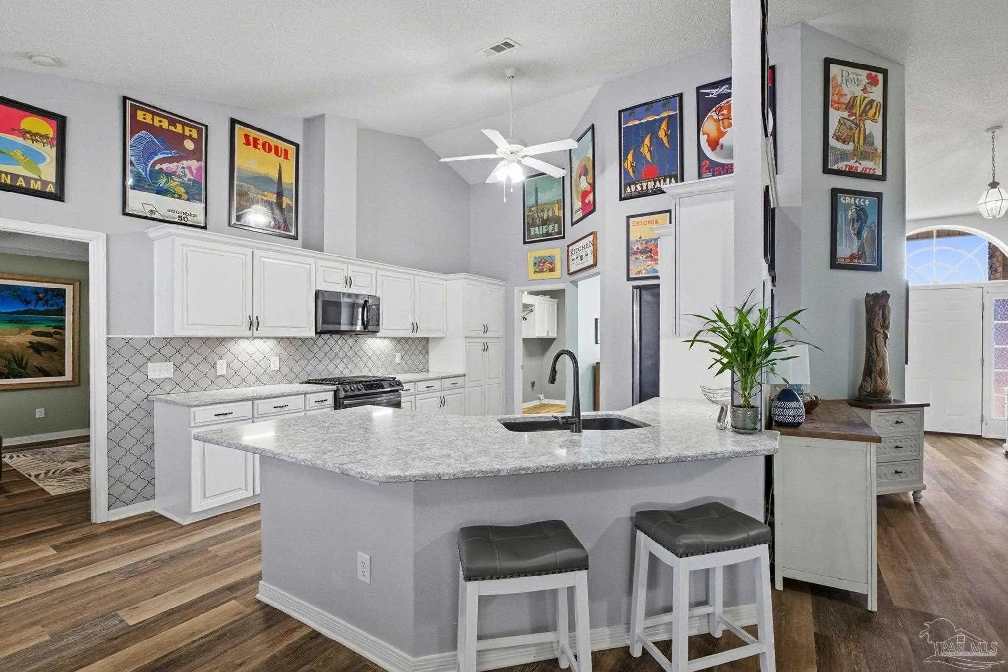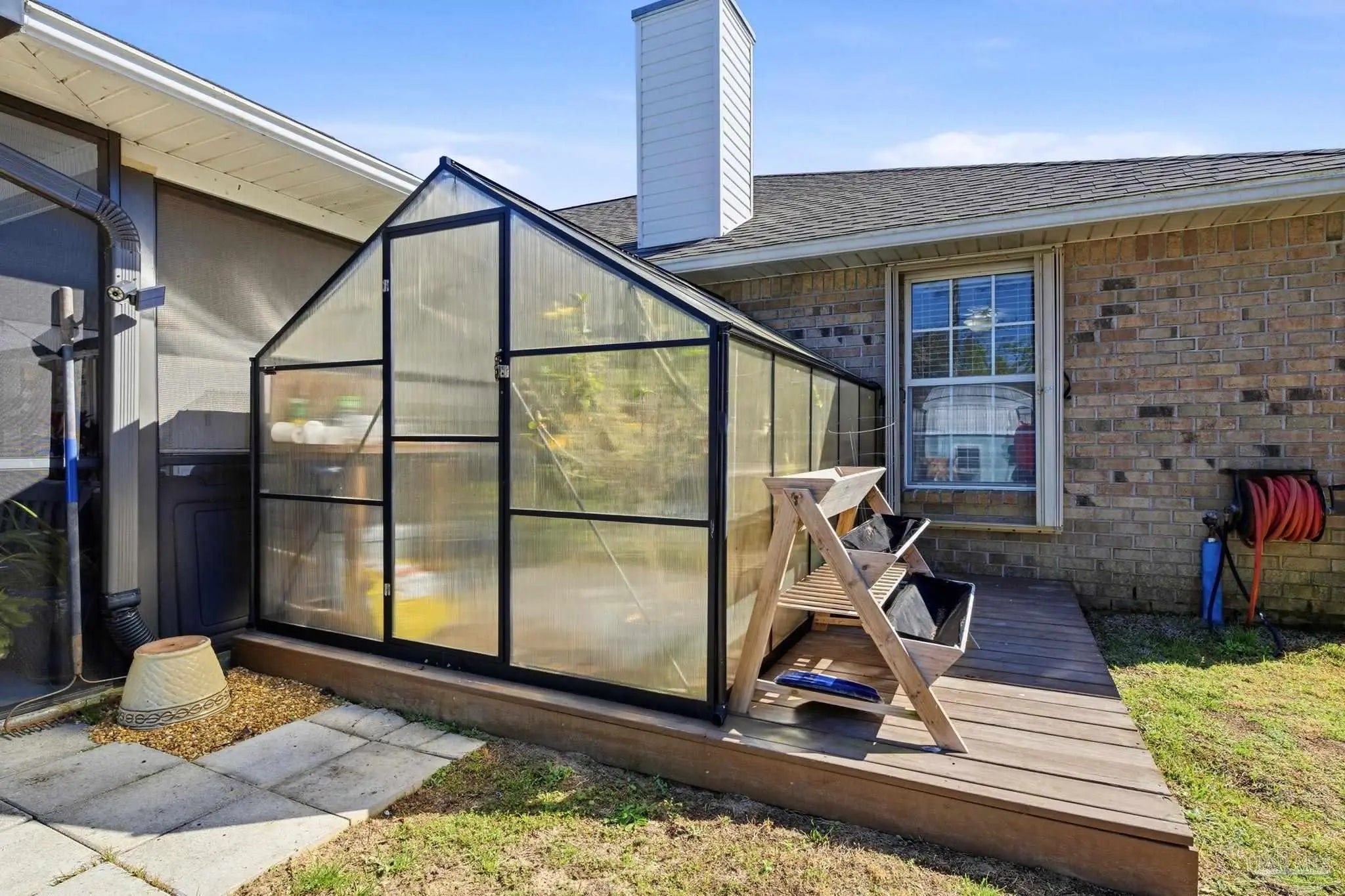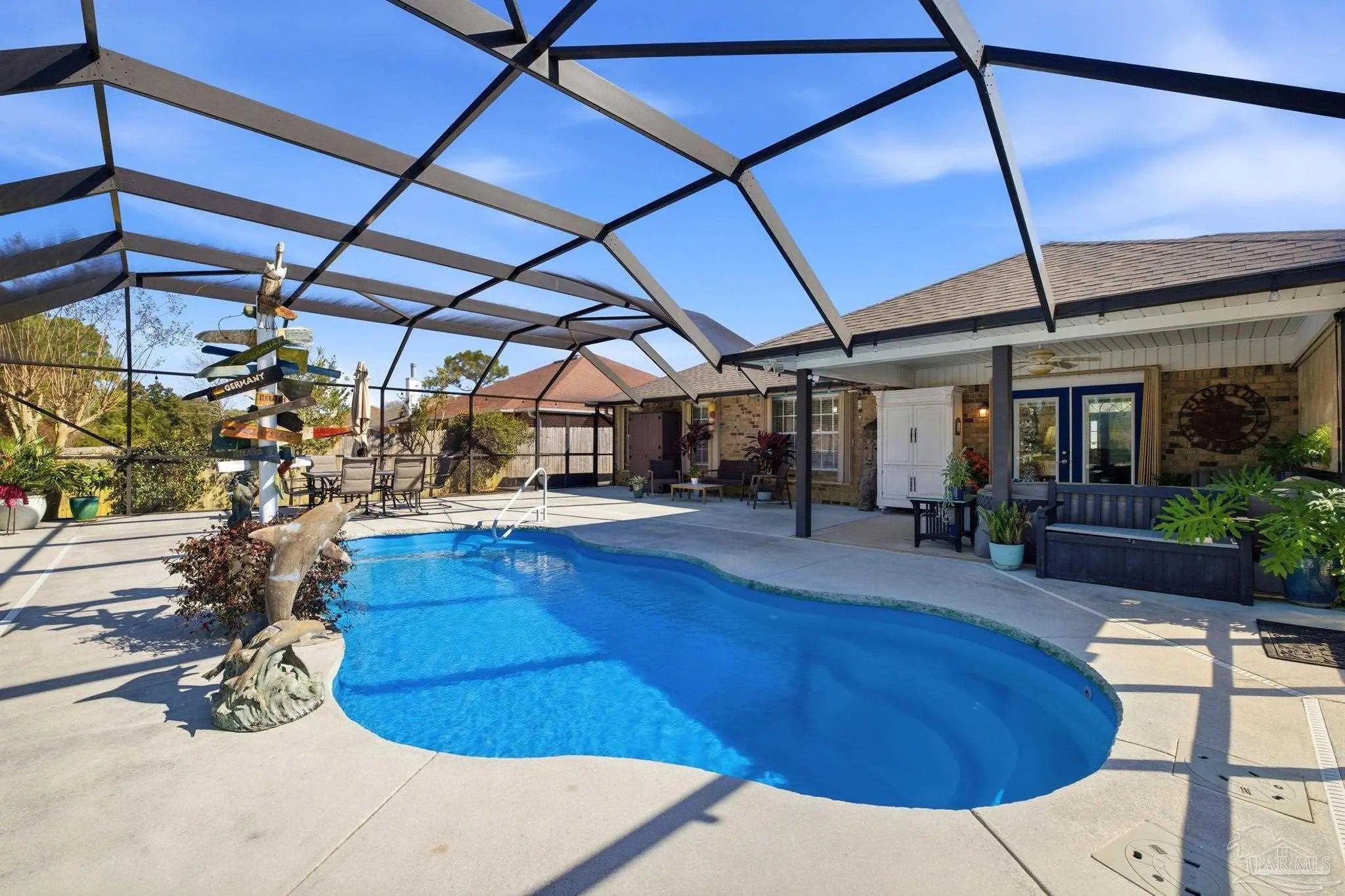 Welcome to this beautifully updated 4-bedroom, 2-bath home with a versatile flex space ideal for a home office or formal dining room—designed for comfortable living and effortless entertaining. Step inside to a spacious living room featuring a gas fireplace that creates a striking focal point. Updated LVP flooring flows throughout the main living areas, while the three additional bedrooms offer cozy carpeting for family or guests. The heart of this home is both the stunning updated kitchen and the incredible outdoor pool area. The fully renovated kitchen showcases solid wood cabinetry, high-quality F-grade quartz countertops, and a custom wine/coffee bar with a wine fridge that conveys—blending style and function for everyday living and hosting alike. The primary suite offers a relaxing retreat with a walk-in closet featuring custom organization. The beautifully updated en-suite bath includes a quartz-topped custom vanity, cultured marble walk-in shower, and a modern round freestanding soaking tub for a spa-like feel. The second bathroom has also been fully renovated. Outdoor living truly shines with a 10,000-gallon fiberglass pool complete with a UV ozone heater/chiller for year-round enjoyment. The oversized lanai provides generous covered space for dining, lounging, and entertaining, creating your own private backyard oasis. Additional features include an updated roof, HVAC, and water heater, storm shutters, and a sprinkler system on a well. A 10x20 shed, along with a greenhouse equipped with a watering system. The garage is neat and tidy with built-in cabinets for extra storage. The beautifully landscaped yard showcases peach trees, white and crepe myrtles, jasmine and vibrant Joseph’s Coat roses. Backing to a peaceful greenbelt, this home offers added privacy with no rear neighbors. This meticulously maintained property combines thoughtful upgrades, modern finishes, and exceptional indoor-outdoor living in one incredible package.