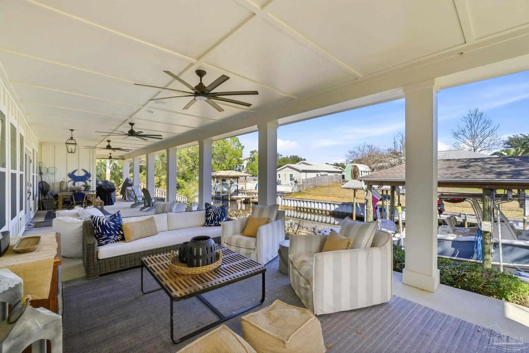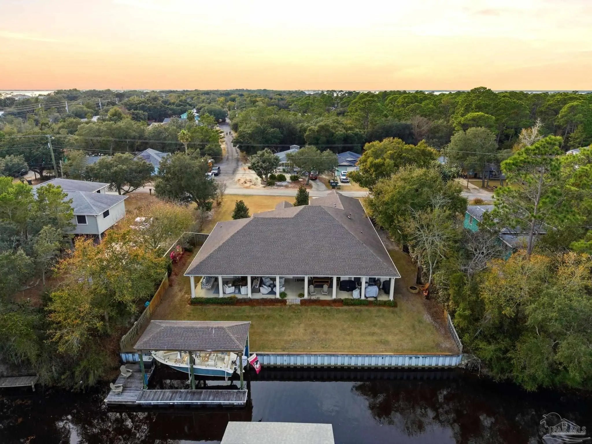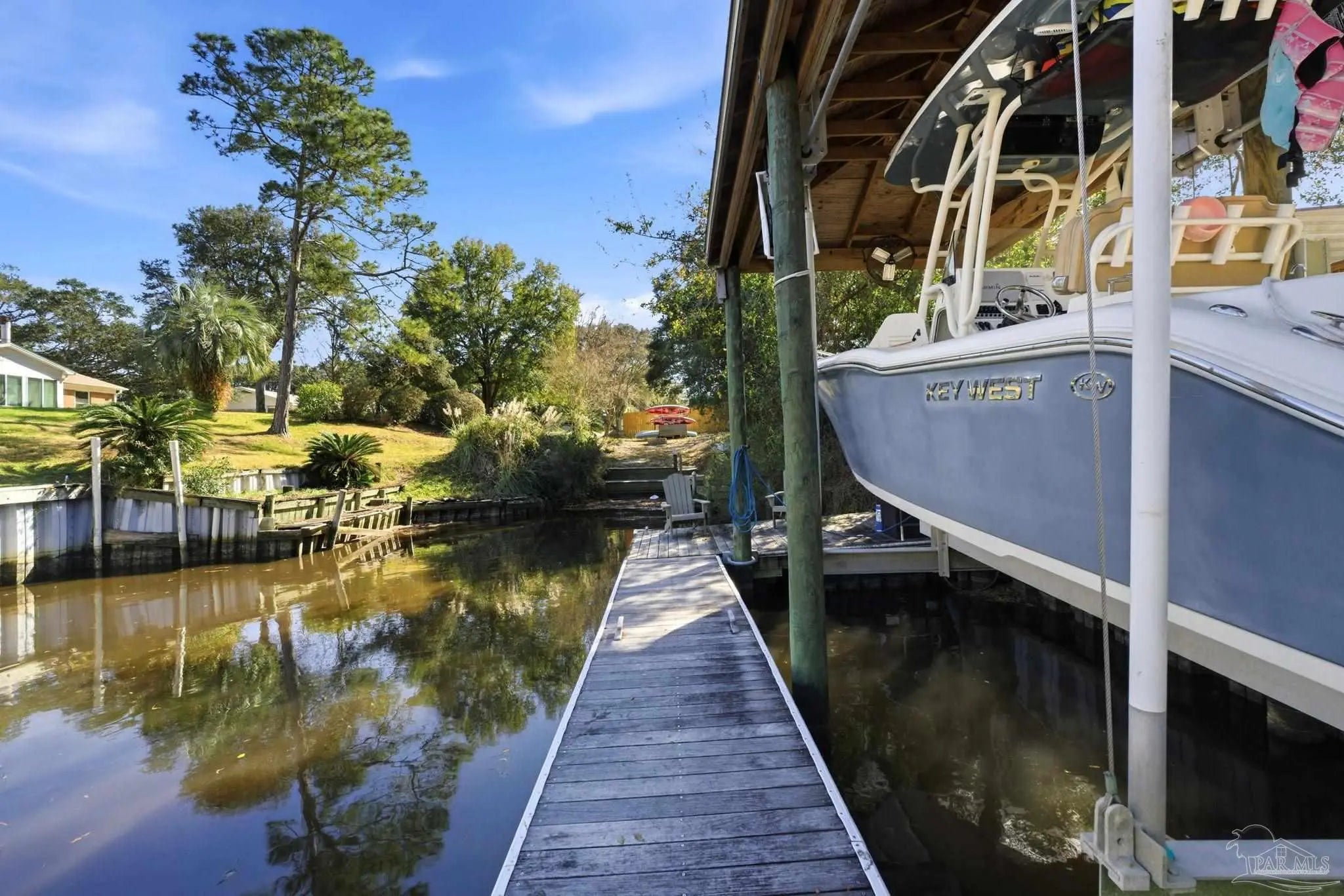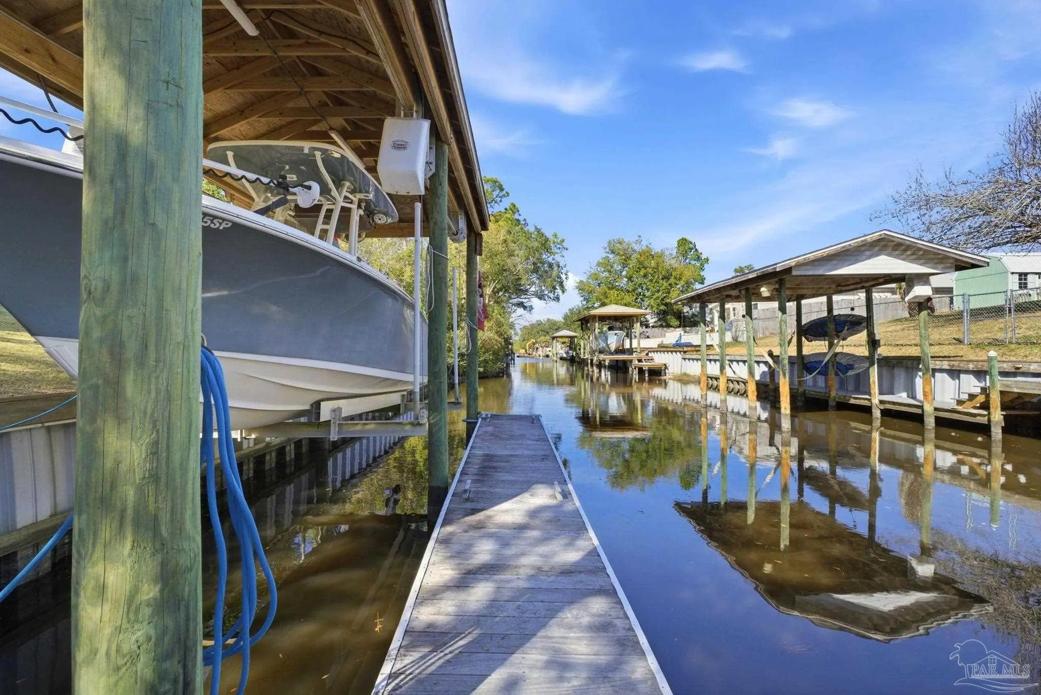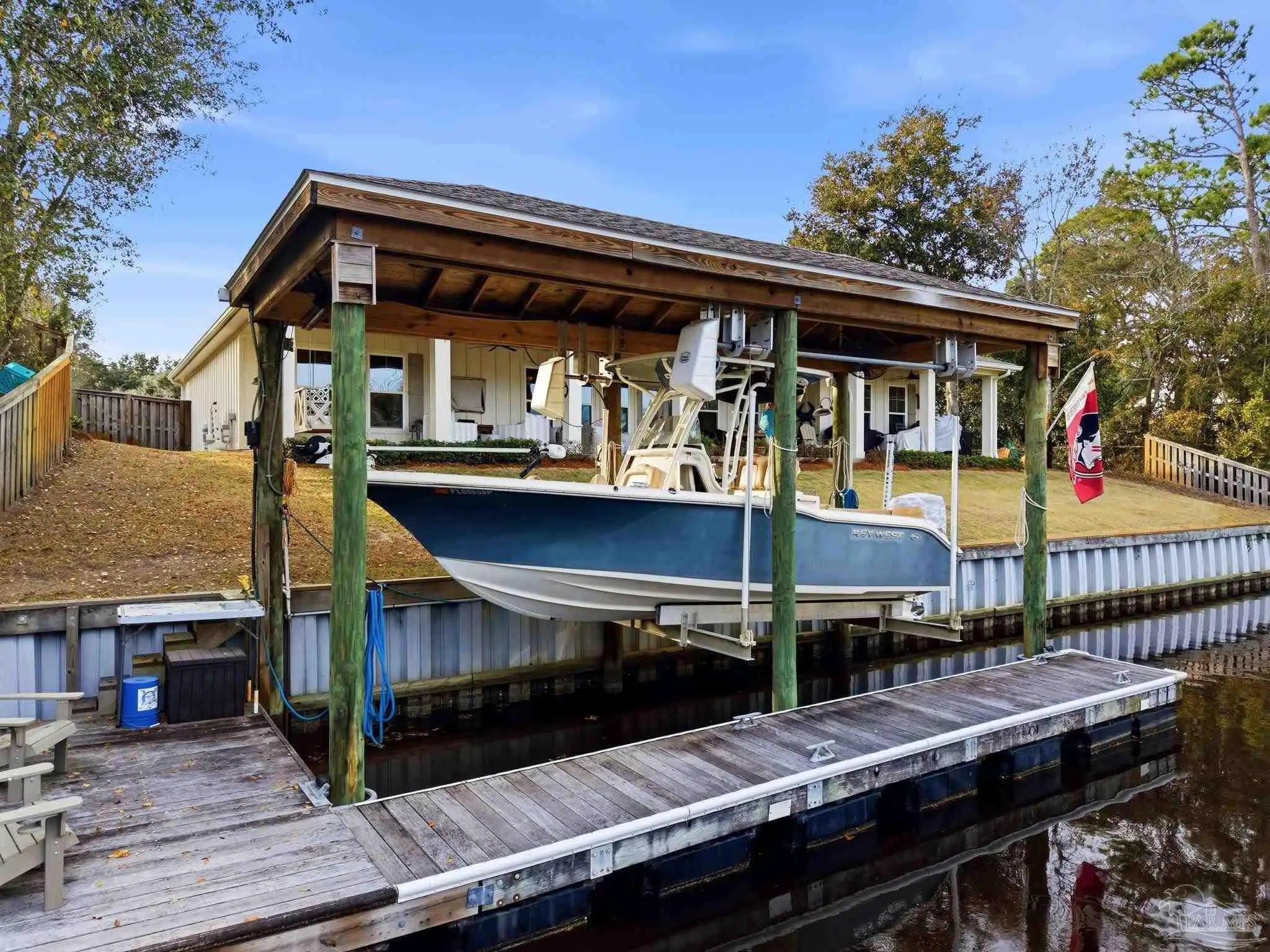 Waterfront living on Innerarity Island! Built in 2019, this canal-front home offers modern construction, a split floor plan, and direct boating access just minutes to Perdido Bay. Designed for both everyday comfort and entertaining, the open floor plan features a spacious living area with two separate seating spaces—one anchored by a cozy fireplace and the other ideal for TV and gathering. The oversized kitchen island provides abundant storage and generous seating, making it the heart of the home. The split-bedroom layout offers privacy, with the primary suite on one side and three additional bedrooms on the opposite side. The primary suite includes dual closets, dedicated shoe shelving, and plenty of space to unwind. A separate study (currently used as a playroom) adds flexible living space, and an additional office has been built out in the garage area—perfect for working from home. Step outside to enjoy true Florida waterfront living. The canal features a seawall and private boat lift, making it easy to keep your boat at home and head out on the water anytime. The dock is equipped with electricity, water, and fans—ideal for fishing, relaxing, or cleaning your catch. Gas plumbing is already in place for your grill, and the covered outdoor seating area includes ceiling fans for year-round comfort. Additional highlights include surround sound speakers in the living room and back patio, an irrigation well, and a termite bond. This home did not flood during Hurricane Sally. If you’ve been searching for a move-in-ready waterfront home with boat lift, modern features, and quick access to Perdido Bay, this property delivers. Buyer to verify all measurements and information.
