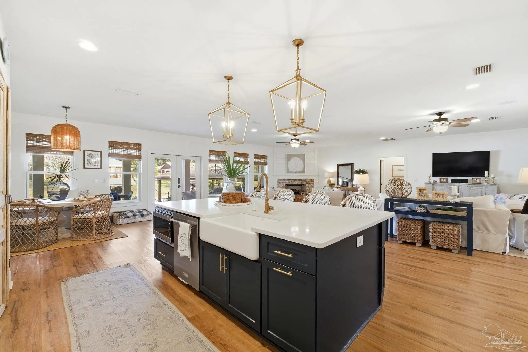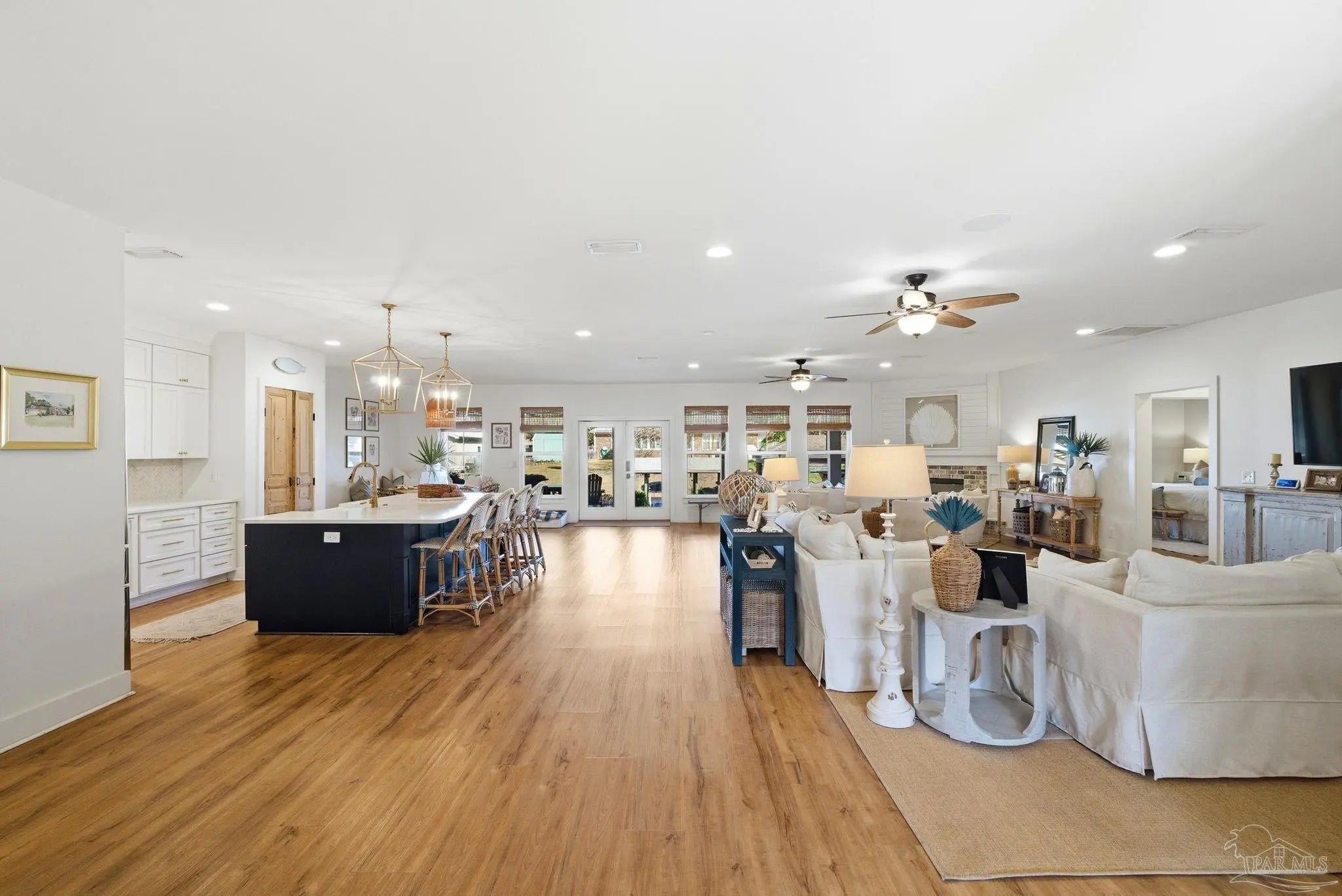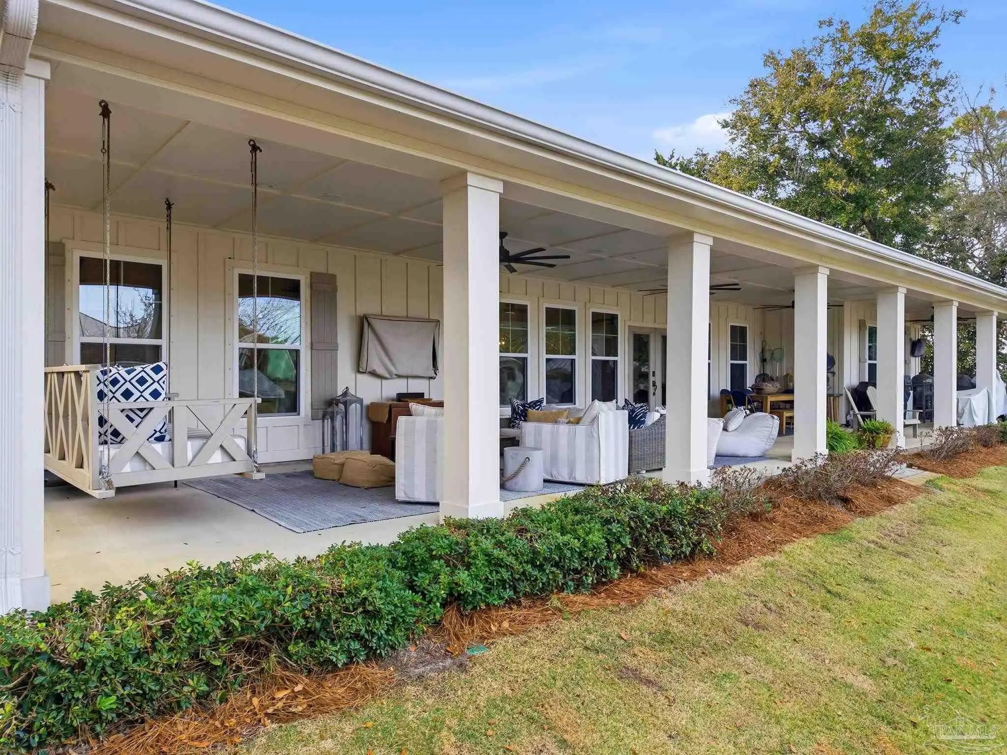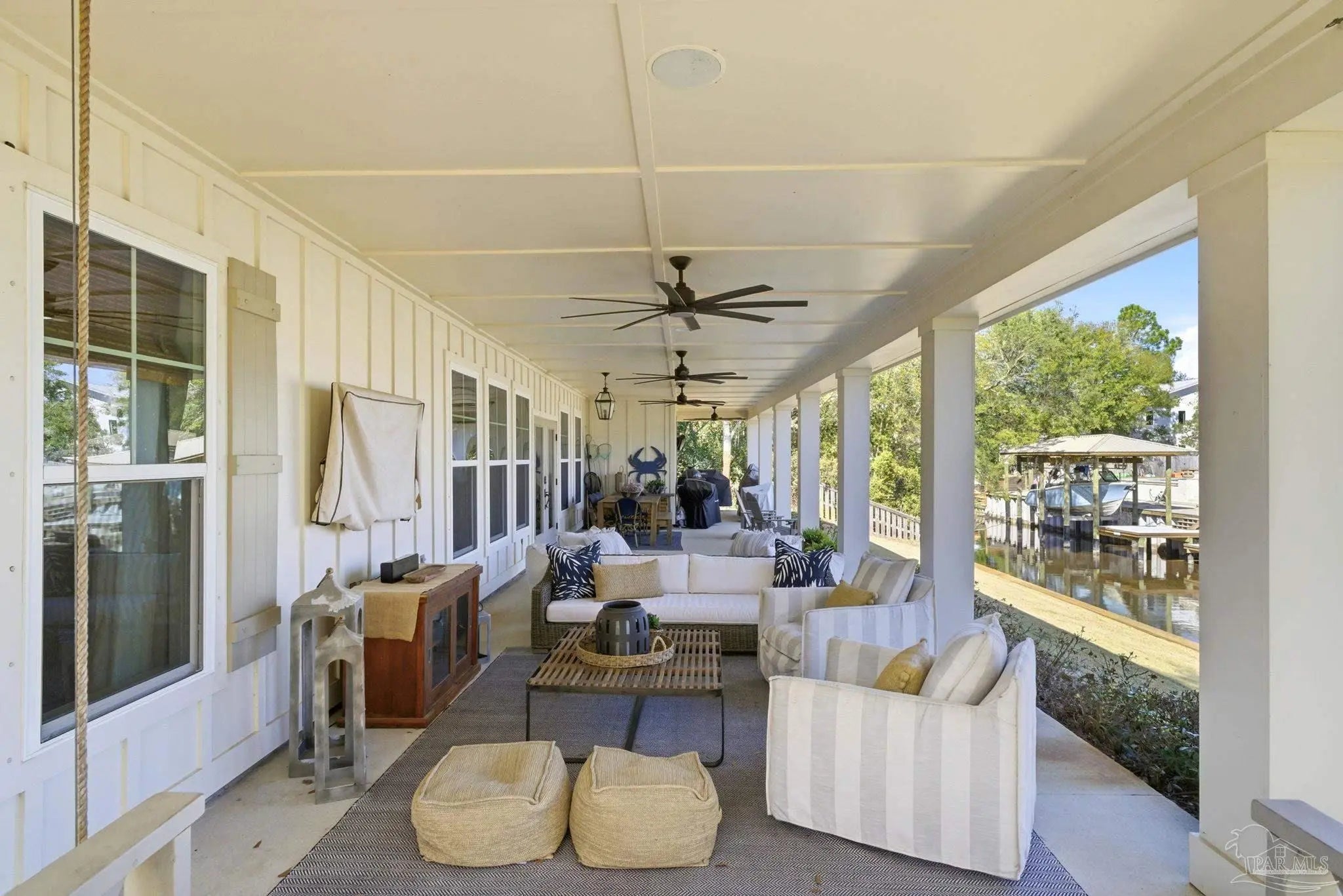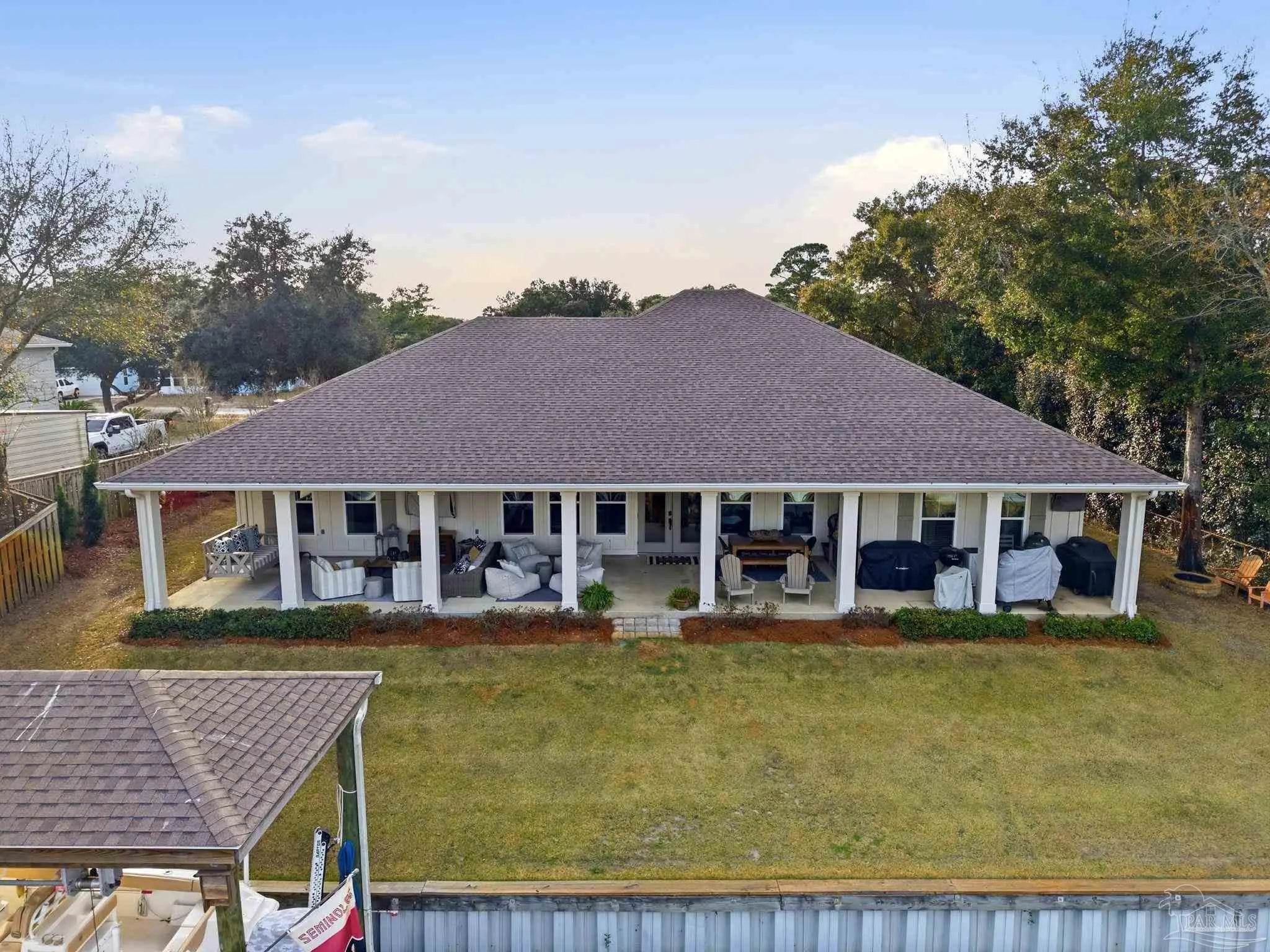 Waterfront living on Innerarity Island! Built in 2019, this canal-front home offers modern construction, a split floor plan, and direct boating access just minutes to Perdido Bay. Designed for both everyday comfort and entertaining, the open floor plan features a spacious living area with two separate seating spaces—one anchored by a cozy fireplace and the other ideal for TV and gathering. The oversized kitchen island provides abundant storage and generous seating, making it the heart of the home. The split-bedroom layout offers privacy, with the primary suite on one side and three additional bedrooms on the opposite side. The primary suite includes dual closets, dedicated shoe shelving, and plenty of space to unwind. A separate study (currently used as a playroom) adds flexible living space, and an additional office has been built out in the garage area—perfect for working from home. Step outside to enjoy true Florida waterfront living. The canal features a seawall and private boat lift, making it easy to keep your boat at home and head out on the water anytime. The dock is equipped with electricity, water, and fans—ideal for fishing, relaxing, or cleaning your catch. Gas plumbing is already in place for your grill, and the covered outdoor seating area includes ceiling fans for year-round comfort. Additional highlights include surround sound speakers in the living room and back patio, an irrigation well, and a termite bond. This home did not flood during Hurricane Sally. If you’ve been searching for a move-in-ready waterfront home with boat lift, modern features, and quick access to Perdido Bay, this property delivers. Buyer to verify all measurements and information.