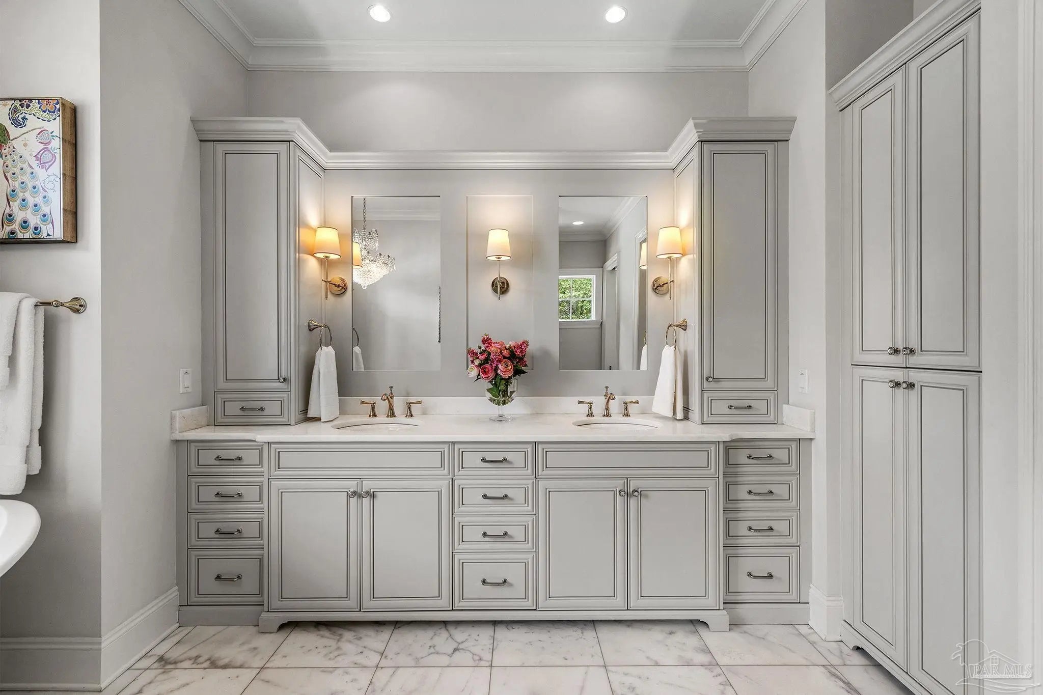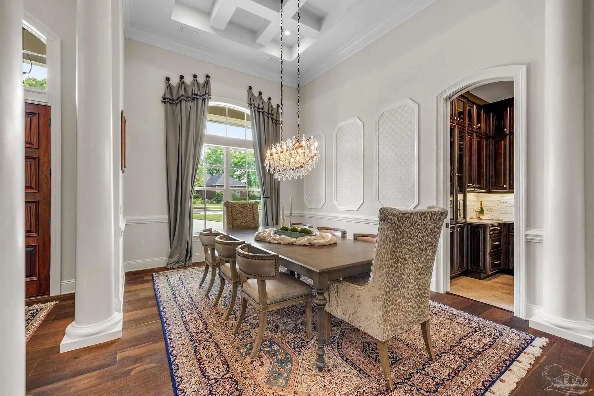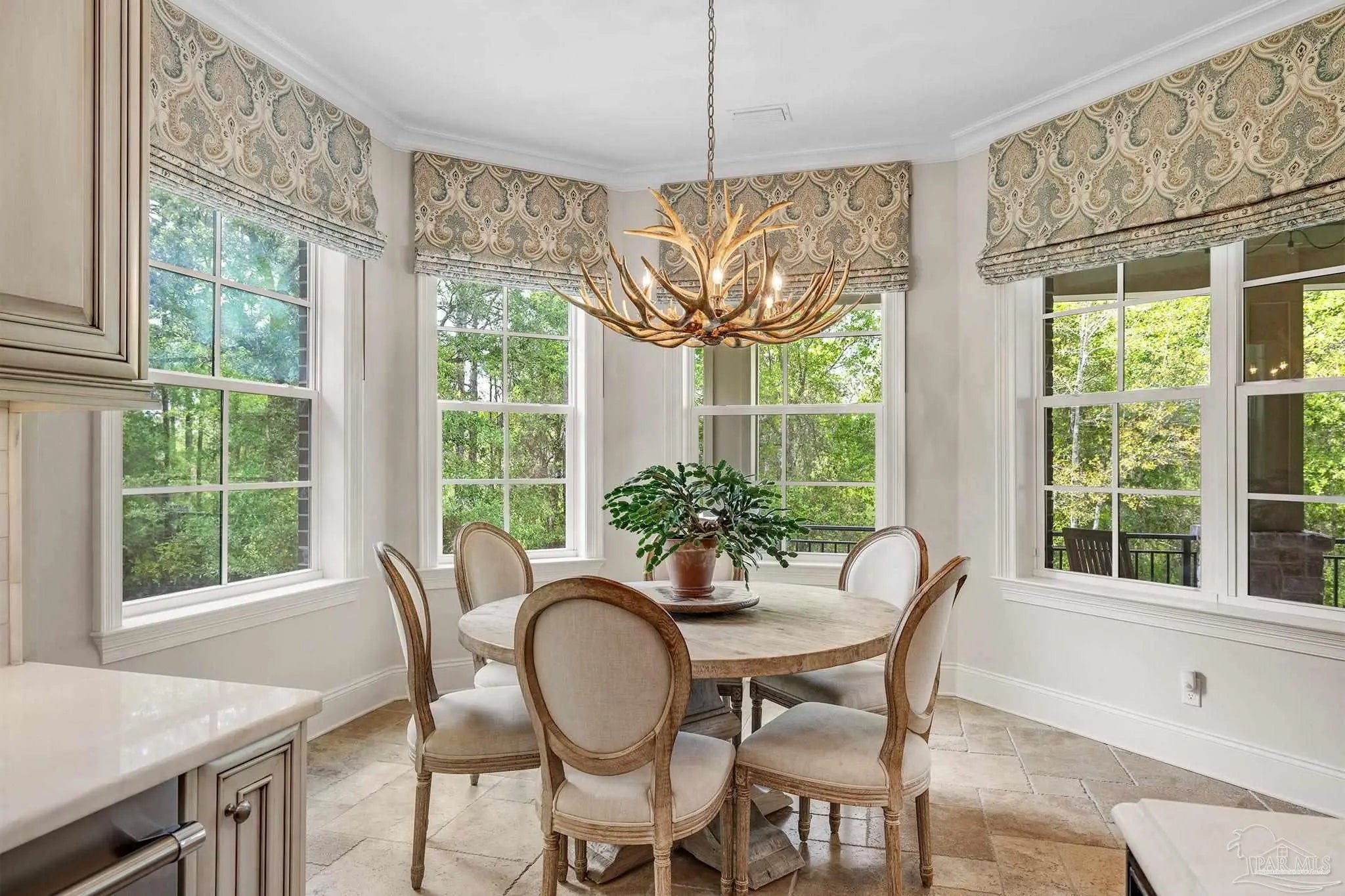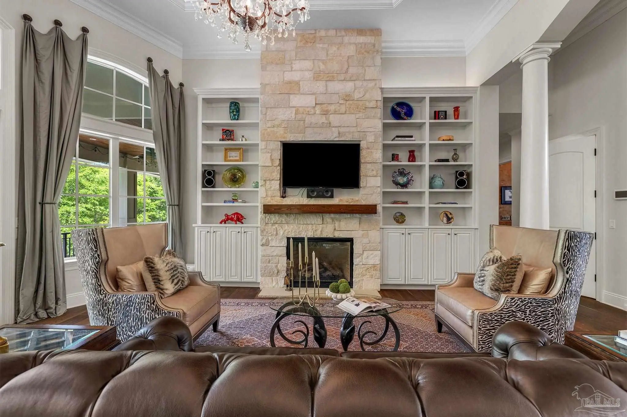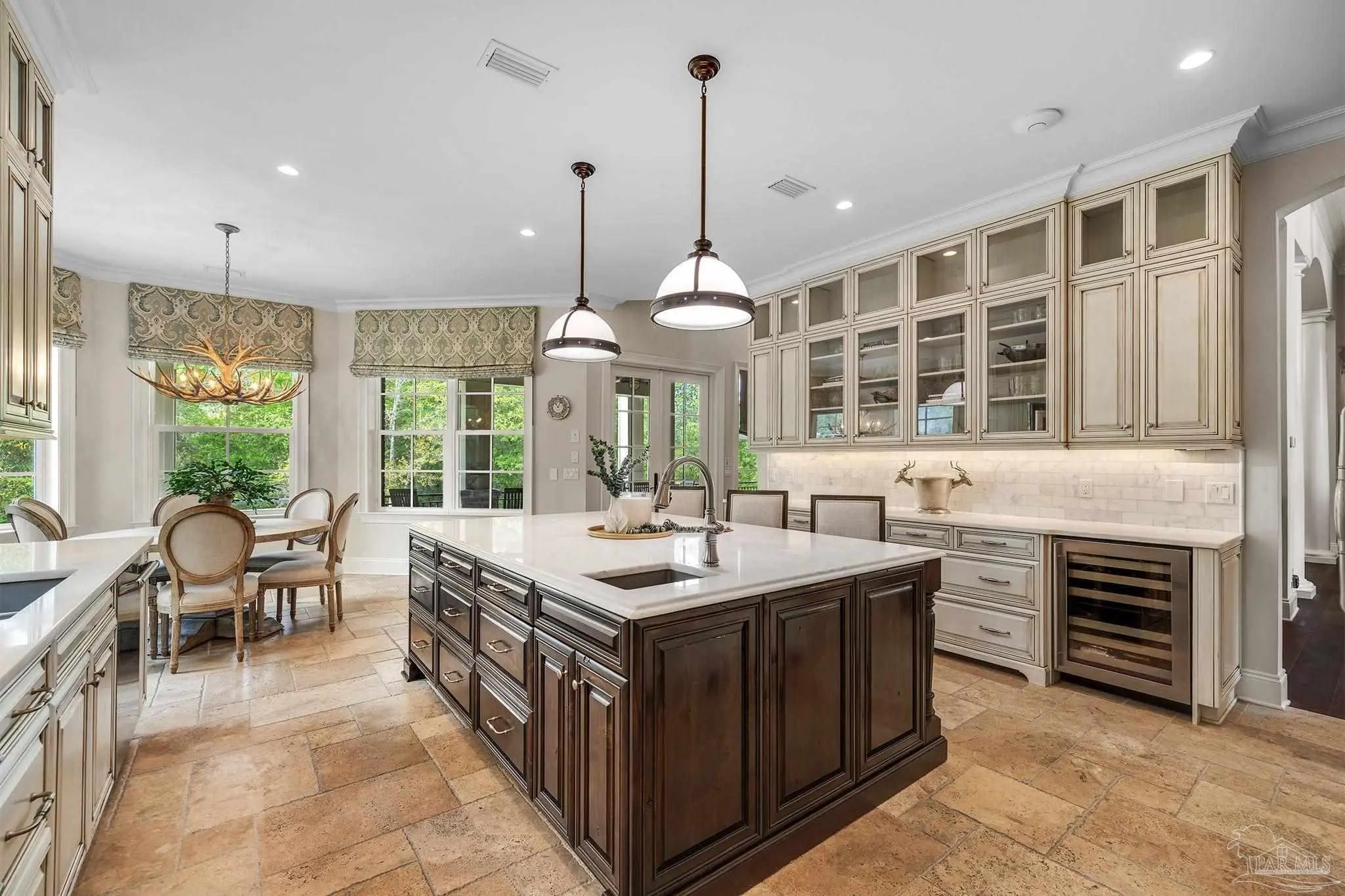 Indulge in the timeless romance of this custom French Country estate, a masterwork of architectural grace situated on over half an acre against a serene nature preserve. Located within the prestigious, guard-gated Nature Trail community, this residence captures the essence of European elegance with a grand circular drive and sophisticated silhouettes. Inside, 15-foot coffered ceilings and rich oak hardwoods lead you through light-filled galleries. The formal living room, anchored by a stately gas fireplace and artisanal built-ins, sets a tone of refined intimacy. For the culinary enthusiast, the gourmet kitchen is a triumph of design, featuring travertine flooring, marble surfaces, Sub-Zero refrigeration, and a Thermador suite. Even the functional spaces are elevated, including a bespoke laundry with a dedicated dog wash station. The main-level owner’s sanctuary offers a romantic retreat with a private fireplace and a spa-inspired marble bath featuring a classic clawfoot soaking tub. Three additional ground-floor suites each provide the luxury of a private en-suite bath. Offering unparalleled versatility, the second story reveals over 1,000 square feet of sophisticated living space, featuring a full kitchen and living quarters—ideal for guests or a second master suite complete with pre-planned elevator access. The entertainment wing is a sensory experience, blending Chicago brick accents, pecky cypress beams, and a climate-controlled wine room. Host grand events in the billiards and media rooms or transition through the wet bar to the breathtaking outdoors. A dramatic two-story veranda overlooks a competition-length lap pool and the lush conservation backdrop. The resort-style pool area is serviced by a fully equipped outdoor kitchen, a dedicated pool half bath, and private outdoor shower. Built with enduring quality, the home features a safe room, high-impact glass, geothermal HVAC and NEW Roof in 2022.