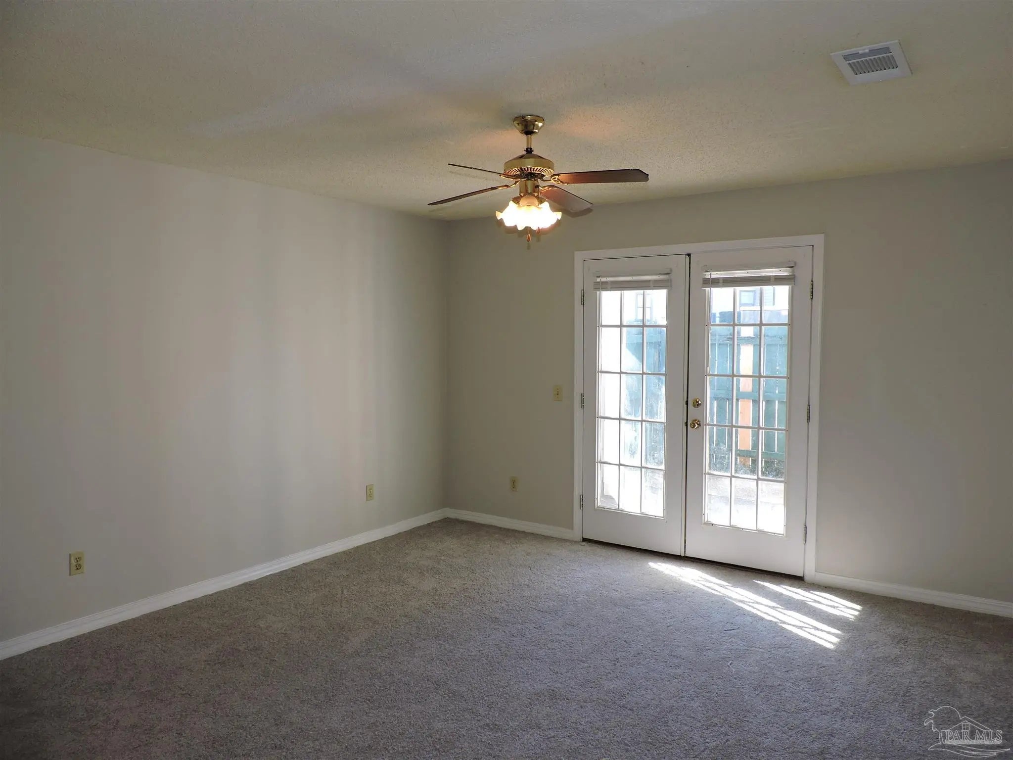 Downstairs unit that's centrally located! Easy access to interstate, schools & shopping. Freshly painted walls. New carpet. Tile flooring in kitchen & baths. Living room with ceiling fan & french doors to covered patio. Separate dining area. Fully equipped kitchen with pantry. Main suite has oversized closet & double vanity. Inside laundry. Ceiling fans in both bedrooms. Storage room off porch. No pets.