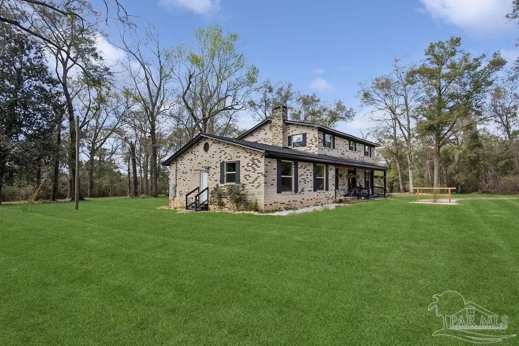 Fully renovated 3,190 sq ft all-brick home situated on 4 private acres in Chumuckla, FL. Renovated top to bottom, this property offers space, flexibility, and major system updates for true move-in-ready living. Inside, you’ll find engineered laminate flooring, two spacious living areas downstairs, and two back-to-back fireplaces that create warmth and character between the main gathering spaces. The large, centrally located kitchen flows seamlessly into a spacious formal dining room, ideal for entertaining or hosting family gatherings. A convenient half bath is located off the main hallway for guests. Upstairs features four bedrooms and two full bathrooms, offering a functional layout with sleeping quarters separate from the main living areas. The downstairs secondary living area offers excellent flexibility and could easily be converted into a primary suite with a full bath if desired, making this home suitable for multi-generational living or a first-floor master option. The oversized mudroom/laundry room provides additional storage and practicality. Major upgrades include a brand-new roof, new heat pump, all new HVAC units (inside and out), new electrical panel, and brand-new windows. Step outside to a covered back porch overlooking the quiet backyard — the perfect place to unwind and enjoy the peaceful setting. With 4 acres of usable land and a fully updated brick exterior, this property offers the best of country living with room to grow.