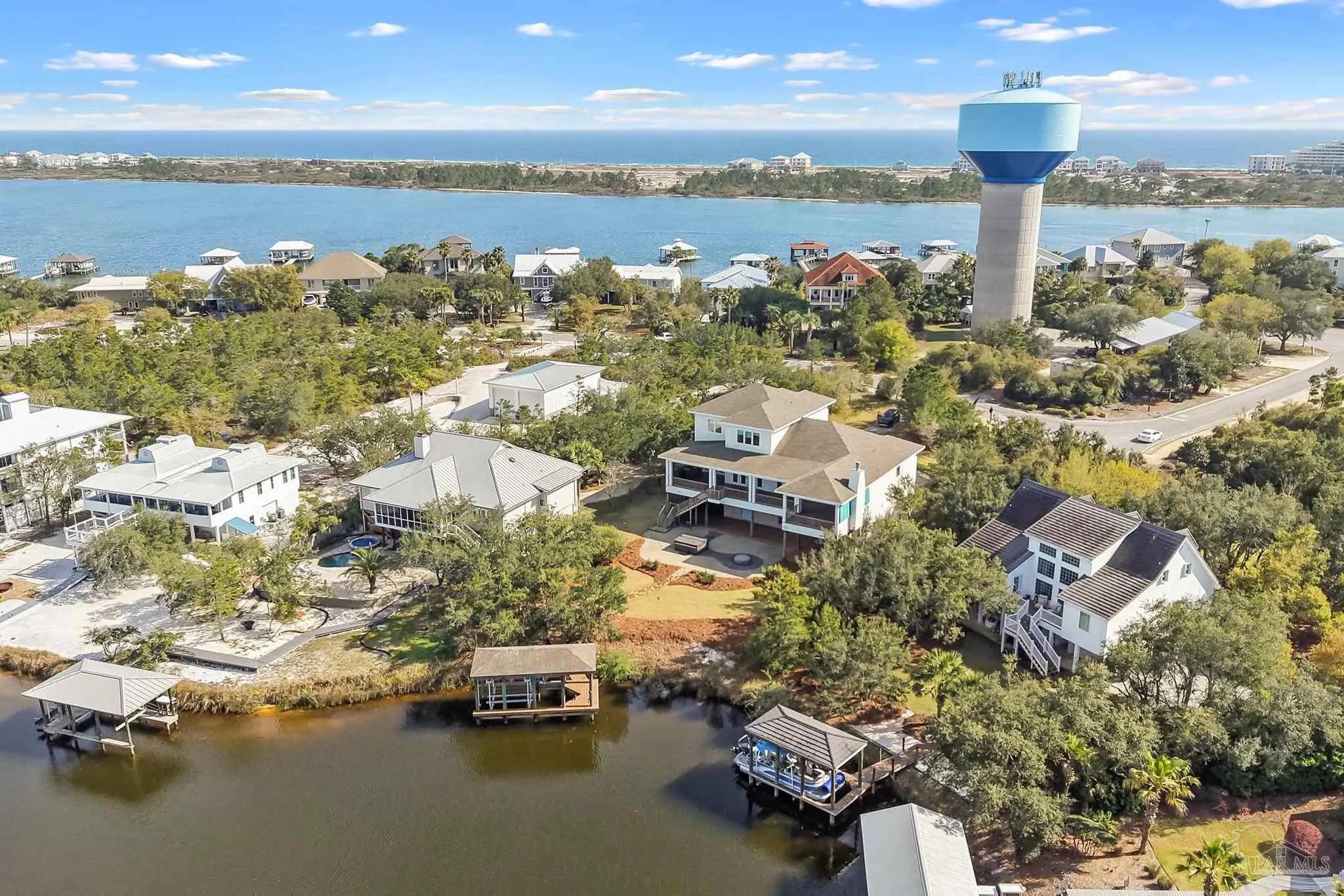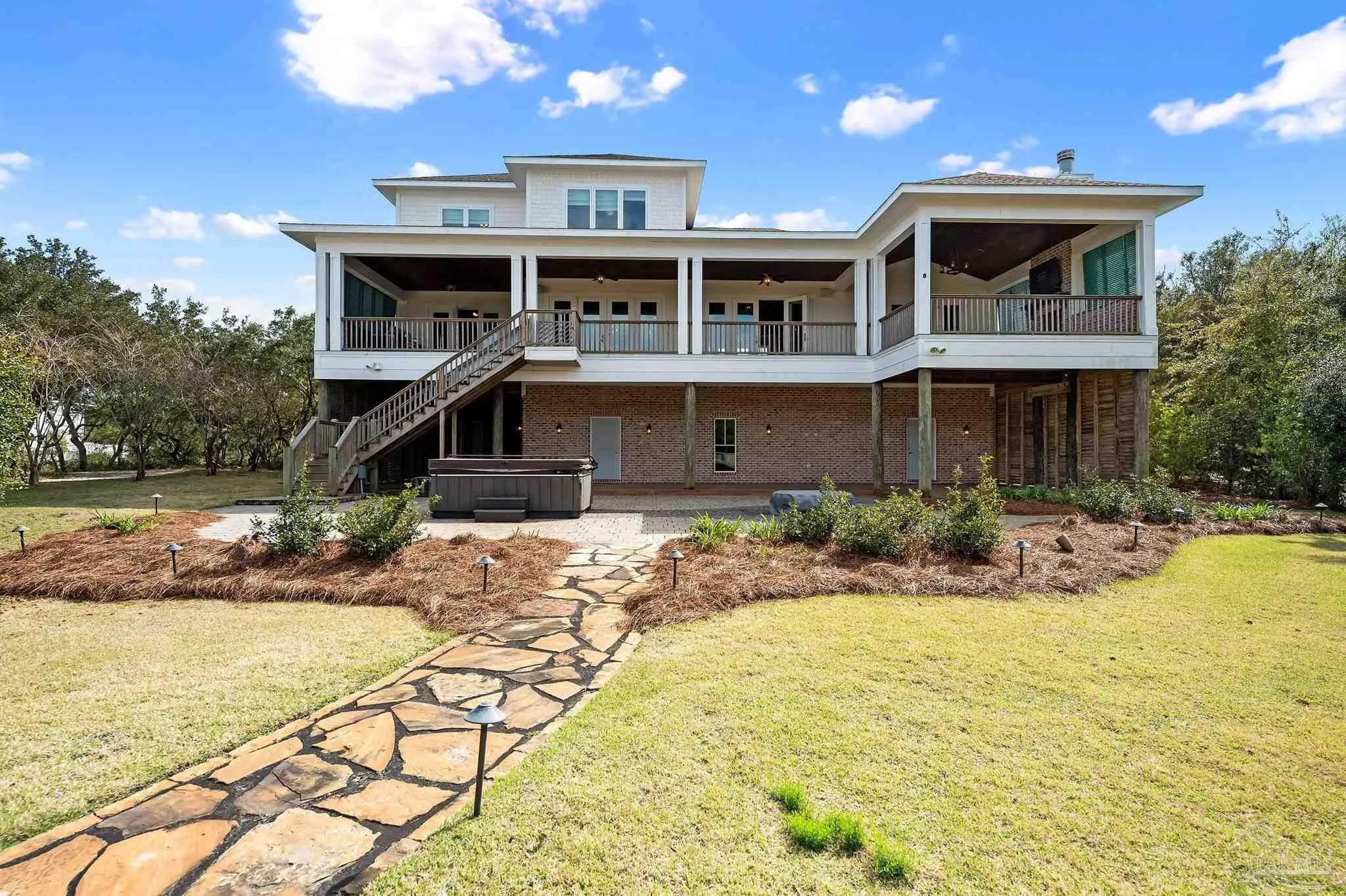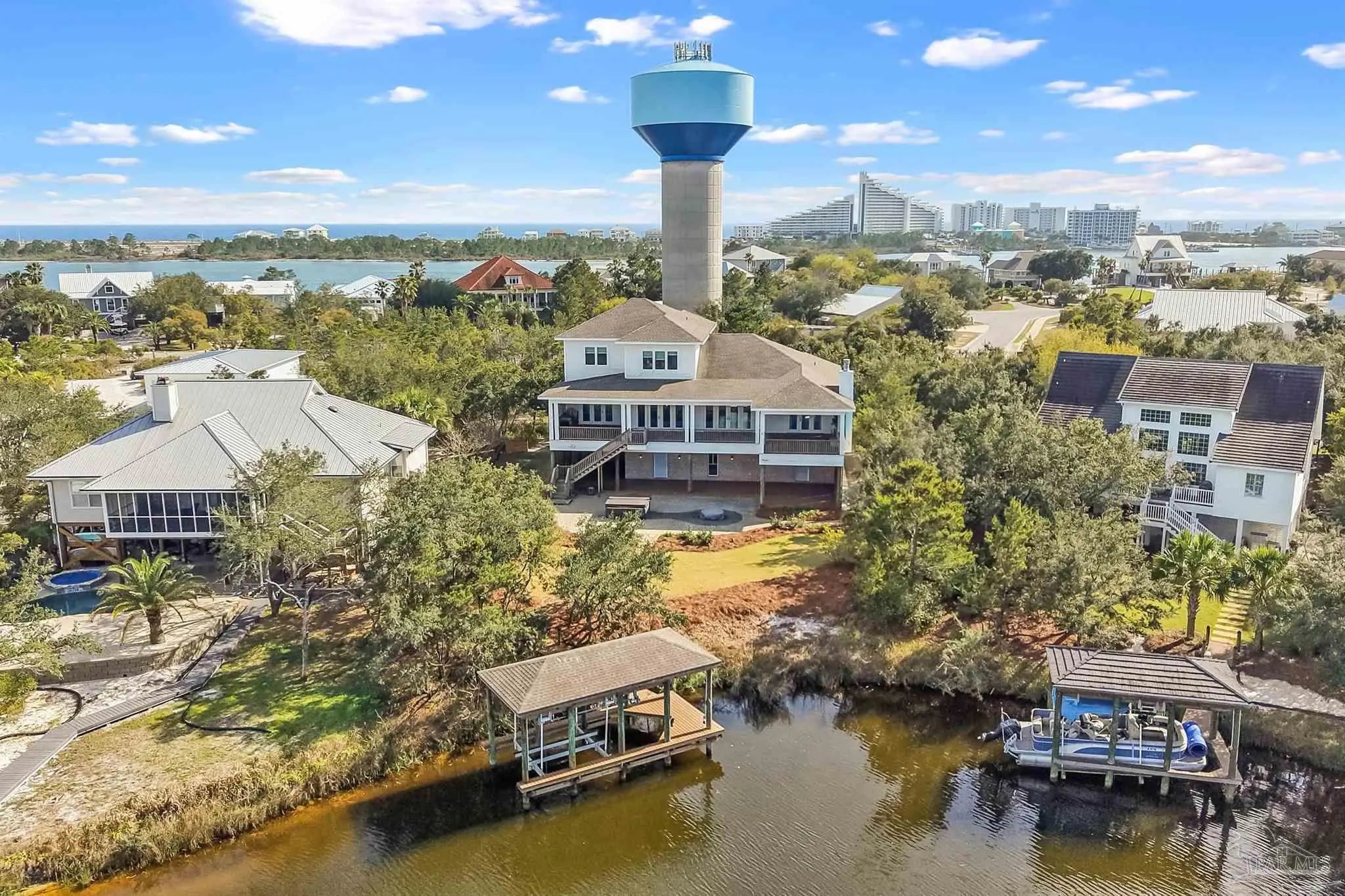 Ono Island’s Crown Jewel, perched on one of Ono Island’s highest points, private cul-de-sac, this southern charmer boasts all-things nautical. Stunning canal frontage, easy, quick open-big water access, sunset views + regular sights of pelicans! Residence has an elevator, a new boat dock and boat lift. Outdoor includes a gas log fireplace, indoor/outdoor sound system, outdoor grill, tile back patio, shuttered enclosure, backlit walkway + Trex on front steps. Master Chef’s Kitchen includes mixer lift, leathered granite, large island w/ various custom storage, dimmer lights, oversized glass globe pendants, awning cooktop, steamer & convection oven, induction oven (like gas), water faucet over stove, soft close cabinets, wine cooler, microwave in pantry, extra spice & utensil pullouts. Master BR has back door exit, scenery & water views, shiplap ceilings, walk-in closets, private master bath. Master Bath has free-standing tub, beveled glass walk-in shower, gorgeous glistening quartzite. The Living Room is breezy, open, vaulted ceilings crafted of pecky cypress + double door entries back deck. Main level Office has private balcony entry. Downstairs garage w epoxy flooring has ½ bath & welcoming room + shiplap walls. Pine paneling finishes garage w beadboard ceilings. 2 two back exits to patio. Storm & Beach Shutters. Hose pipes connected in front for water feature + plant watering. Separate private downstairs entry. Fine finishes: 4” crown, quartzite/granite, wide plank hardwood, floor outlets LR, extra thick baseboards. Also: water filtration + well sprinkler system. Backyard Stonybrook Courtyard, architectural pavers, outdoor firepit, built in gas grill + fireplace fueled by propane. Large capacity hot tub remains. Outdoor TV above stays. NEW AC Unit. Geothermal AC. New Hot H2O Heater. Washer & Dryer convey.