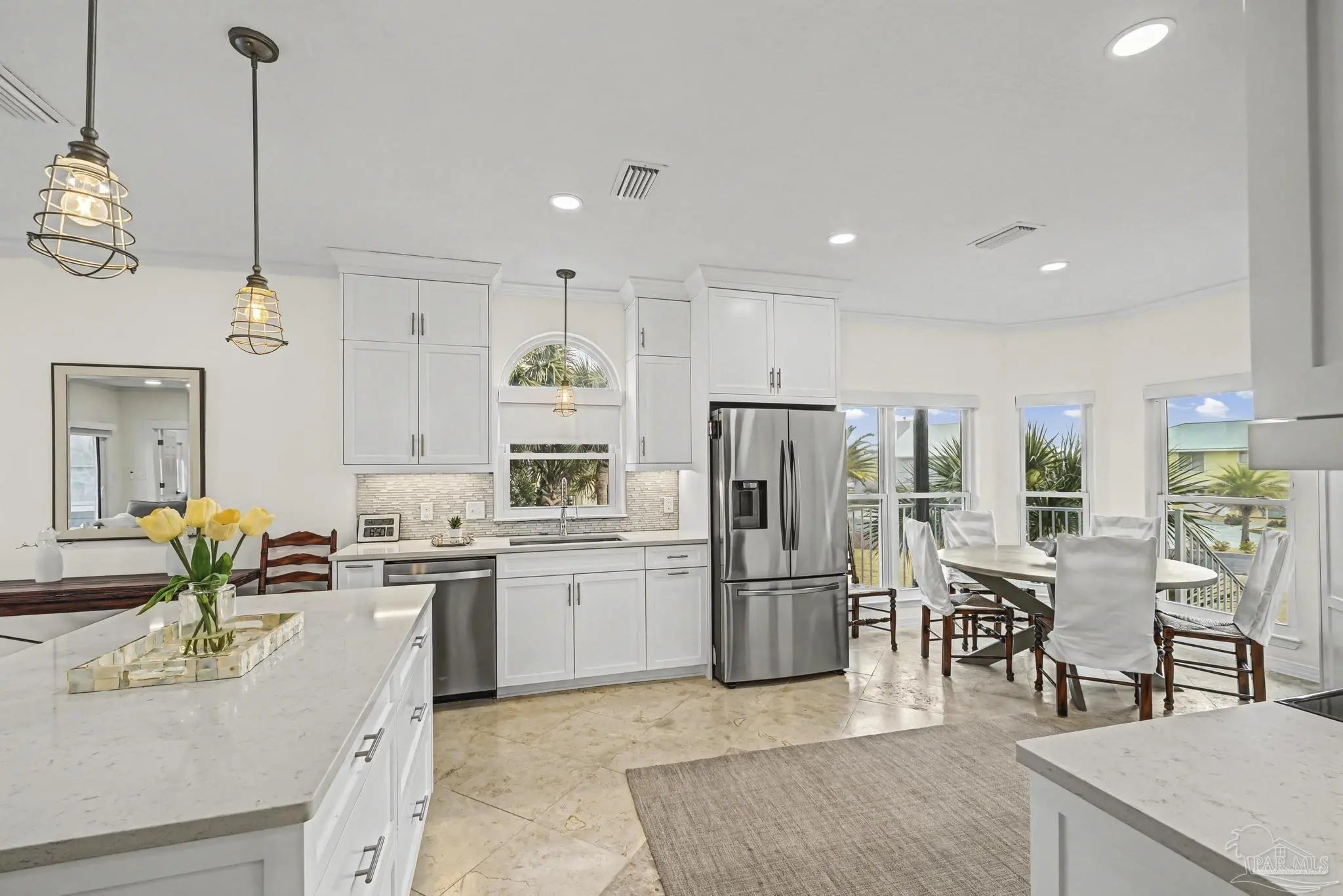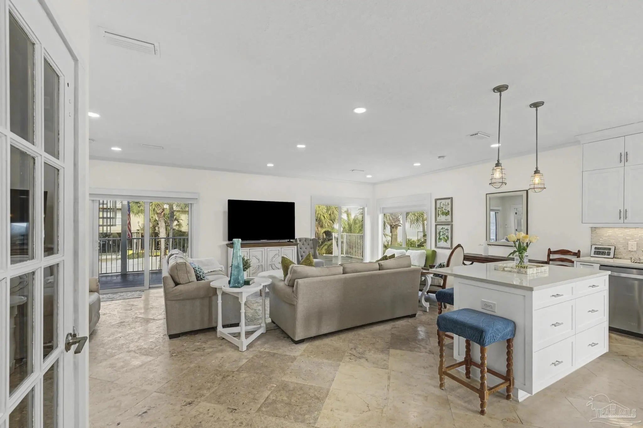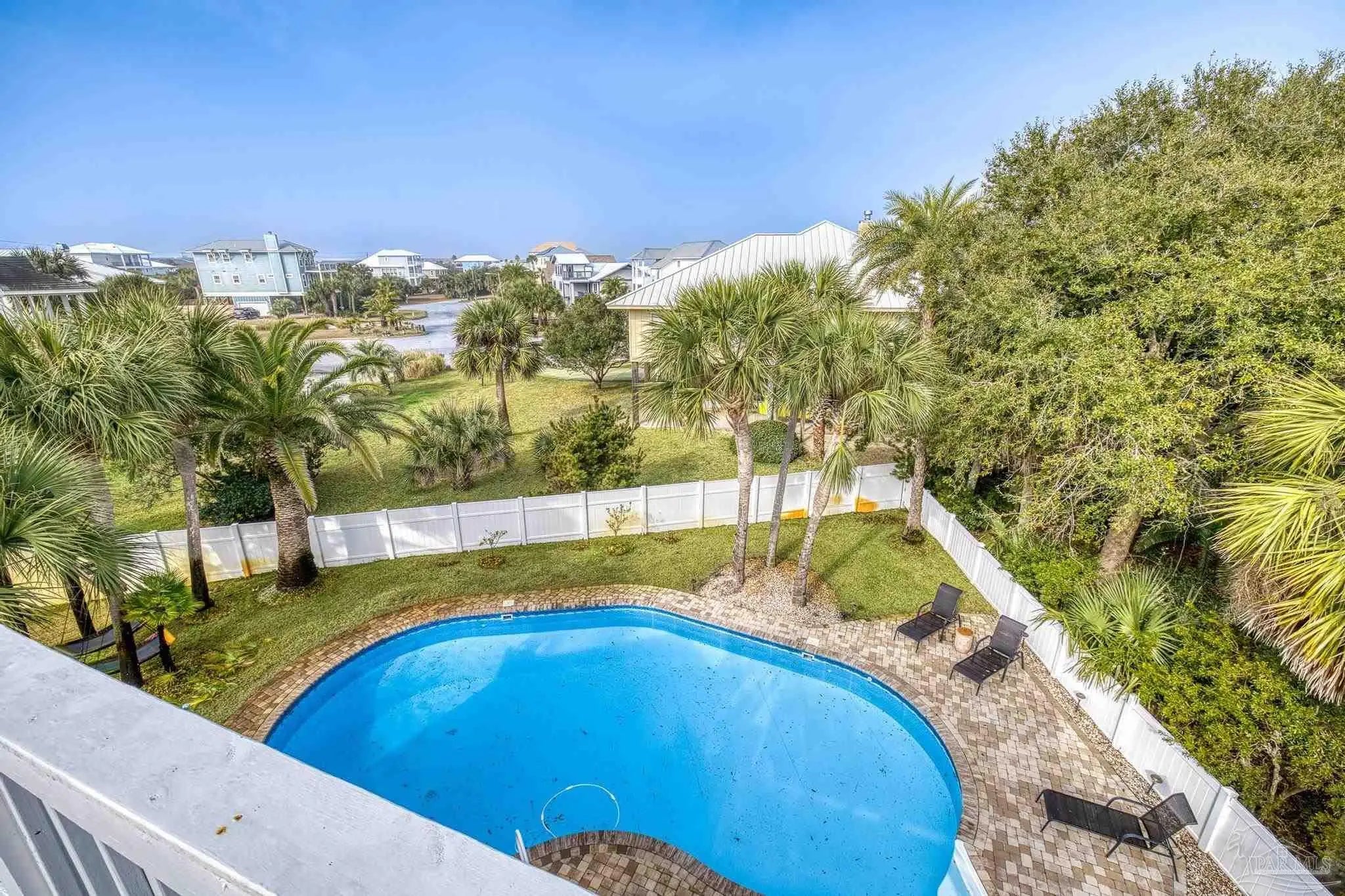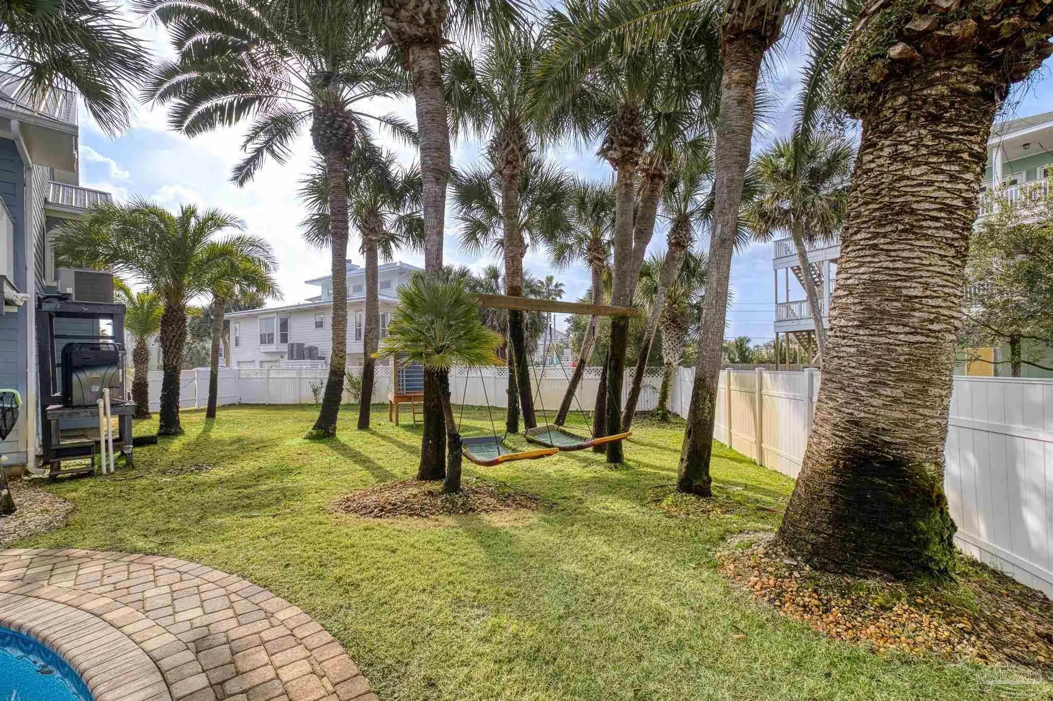 Experience coastal living at it's finest in this stunning pool home with sweeping views of the Santa Rosa Sound. Perfectly positioned to capture beautiful views and Gulf Breezes, this 3 bedroom 2 and a half bath Island gem blends relaxed beach vibes with modern comfort. Step inside, you'll find continuous travertine flooring in this open concept living space filled with natural light. Large windows and spacious balconies showcase the expansive backyard and pool. Enjoy the seamless connection between indoor and outdoor living. The well appointed kitchen features ample cabinetry, stainless steal appliances, quartz countertops, an island, and a breakfast nook. It's an ideal layout for gathering family and friends. The primary suite is large enough for a separate seating area, access to the outdoor decks and backyard views. An updated en-suite bath completes the space. And as an added bonus the washer/dryer closet is easily accessible. Two additional bedrooms provide comfortable space for guests or family. One comes with it's own half bath. Another full bathroom is down the hallway. Tired of taking the stairs? Use the elevator to access the 2 car oversized garage. Bring your beach toys, your hobbies, your golf cart, your dreams. There is plenty of room. The yard is a private oasis, take a dip in the oversized heated saltwater pool or just sway away on a yard swing. This home is located in the Sugar Bowl neighborhood which does not allow short term rentals. Come grab the ultimate beach lifestyle.