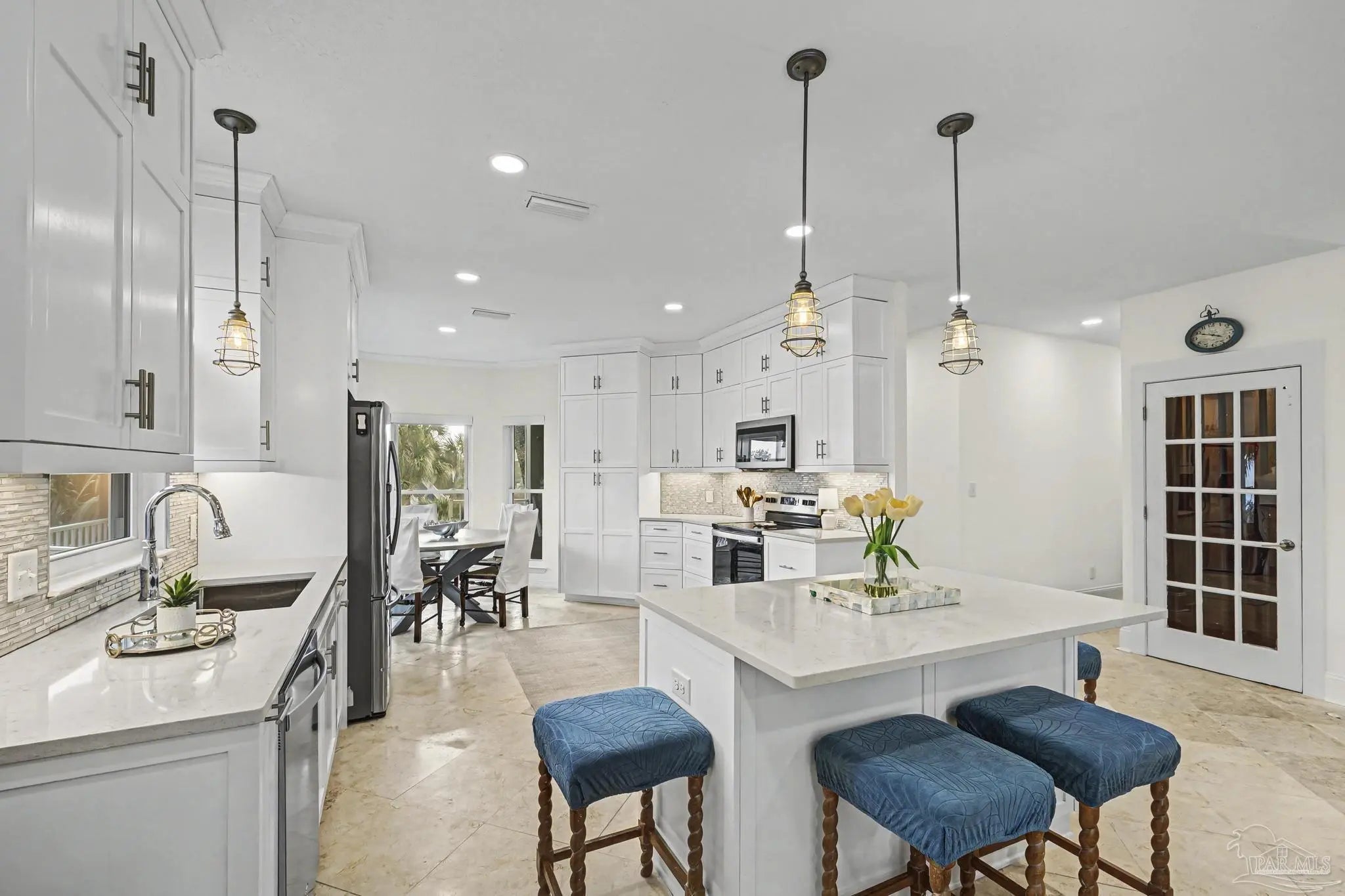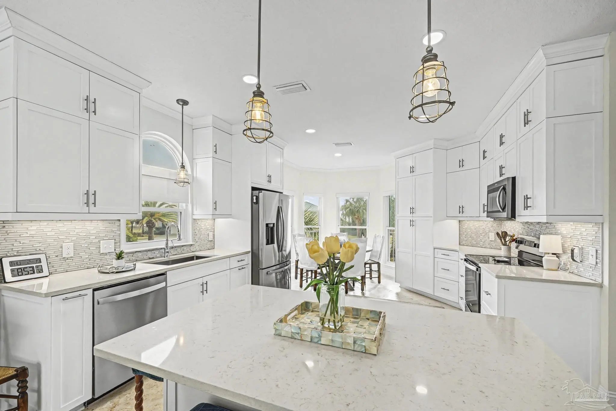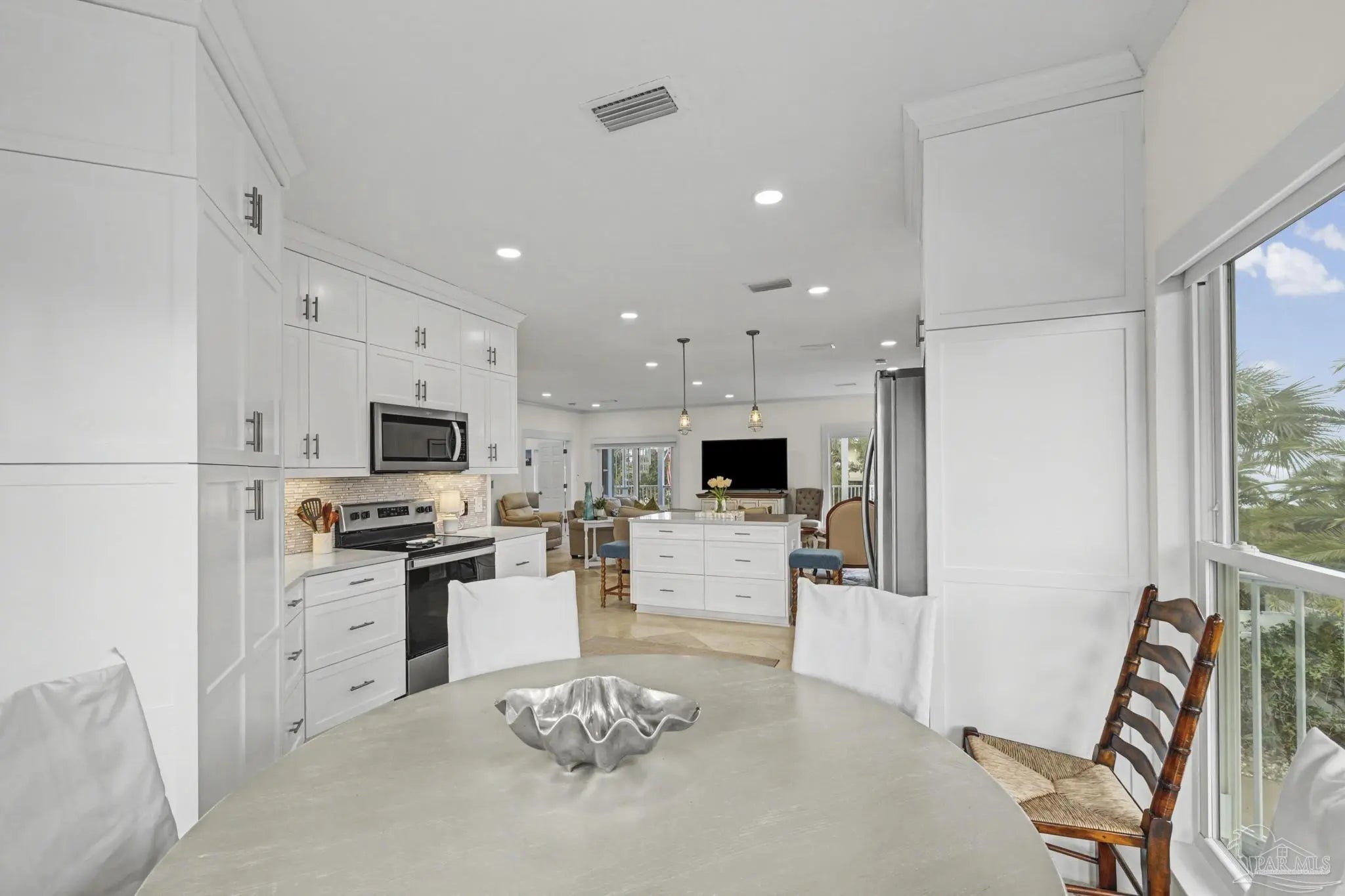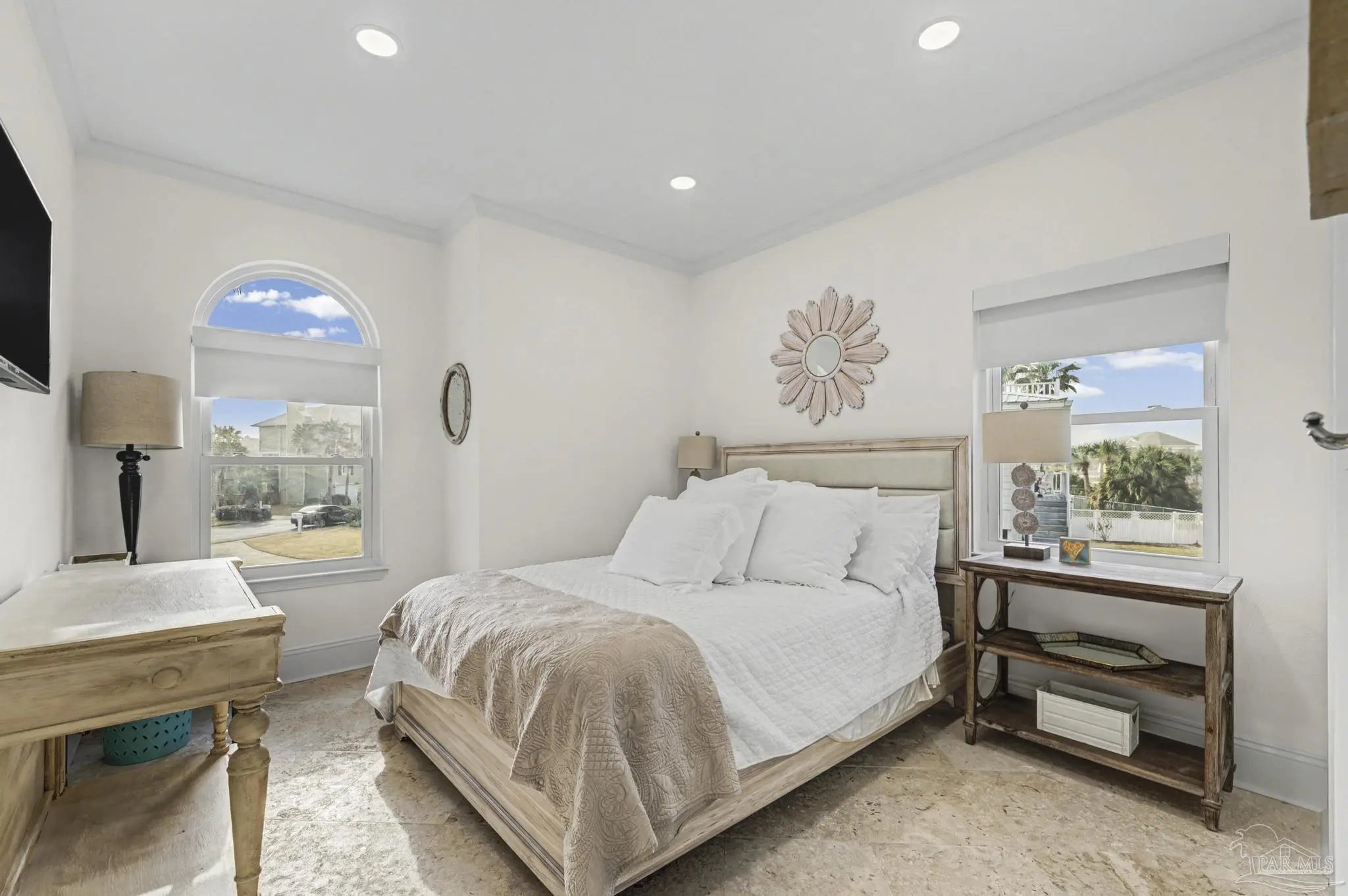 Experience coastal living at it's finest in this stunning pool home with sweeping views of the Santa Rosa Sound. Perfectly positioned to capture beautiful views and Gulf Breezes, this 3 bedroom 2 and a half bath Island gem blends relaxed beach vibes with modern comfort. Step inside, you'll find continuous travertine flooring in this open concept living space filled with natural light. Large windows and spacious balconies showcase the expansive backyard and pool. Enjoy the seamless connection between indoor and outdoor living. The well appointed kitchen features ample cabinetry, stainless steal appliances, quartz countertops, an island, and a breakfast nook. It's an ideal layout for gathering family and friends. The primary suite is large enough for a separate seating area, access to the outdoor decks and backyard views. An updated en-suite bath completes the space. And as an added bonus the washer/dryer closet is easily accessible. Two additional bedrooms provide comfortable space for guests or family. One comes with it's own half bath. Another full bathroom is down the hallway. Tired of taking the stairs? Use the elevator to access the 2 car oversized garage. Bring your beach toys, your hobbies, your golf cart, your dreams. There is plenty of room. The yard is a private oasis, take a dip in the oversized heated saltwater pool or just sway away on a yard swing. This home is located in the Sugar Bowl neighborhood which does not allow short term rentals. Come grab the ultimate beach lifestyle.