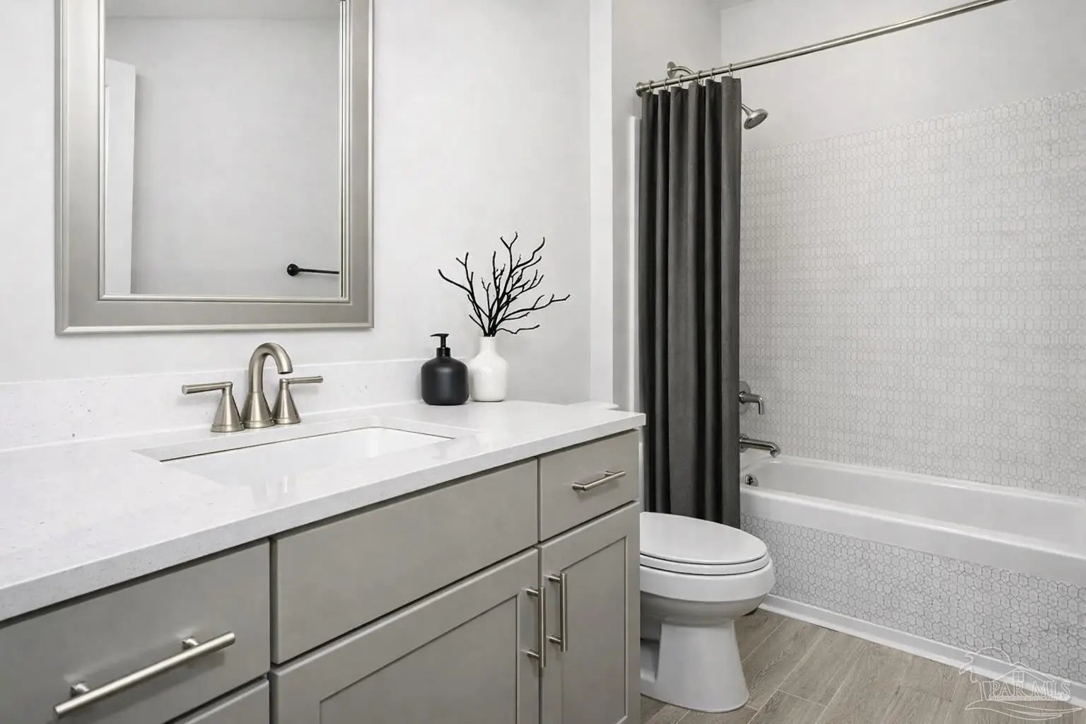 Private Backyard, nestled against a 25 acre conservation buffer. Home will feature timeless and rich, Urbane Bronze ,dovetail Tongue and groove, solid birchwood cabinets with soft close drawers and doors and putty colored in bathrooms. You absolutely must see this home in person! NEW CONSTRUCTION in the prestigious Bentley Oaks Neighborhood. May completion. FOUR SIDES BRICK, 9 ft ceilings. This home is a showstopper! 1706 sq ft in Bentley Oaks. Conveniently located minutes from I-10, easy commute to bases, downtown and to the beach. The Dogwood floor plan has 3 bedrooms, and 2 baths. The design has an open kitchen with large prep island and the popular Shaker Style cabinets. This home stands out with white quartz, Carrera frost, 3 cm counter tops in kitchen and bath and Stainless appliances are featured in kitchen, as well as brushed nickel bar pulls on cabinets. A built-in microwave is also included. The breakfast room has easy access to very private and spacious, covered lanai, perfect for entertaining, a wonderful pantry and LED lighting makes meal prep a dream. The master suite has trey ceilings and ceiling fan. Deluxe master bathroom has a spacious shower, luxury quartz counters, framed mirrors over sinks, LED ceiling lights, and large walk in closet. Shaw, floating, beveled LVP, color lighthouse in all areas except carpet is in bedrooms and bedroom closets. Double garage, 30 year architectural shingles, energy efficient double pane vinyl windows, storm shutter window protection, and covered by StrucSure, a 10year limited warranty. Call today to view this gorgeous home. Photos are representative of completed home, actual home under construction pics are accurate.