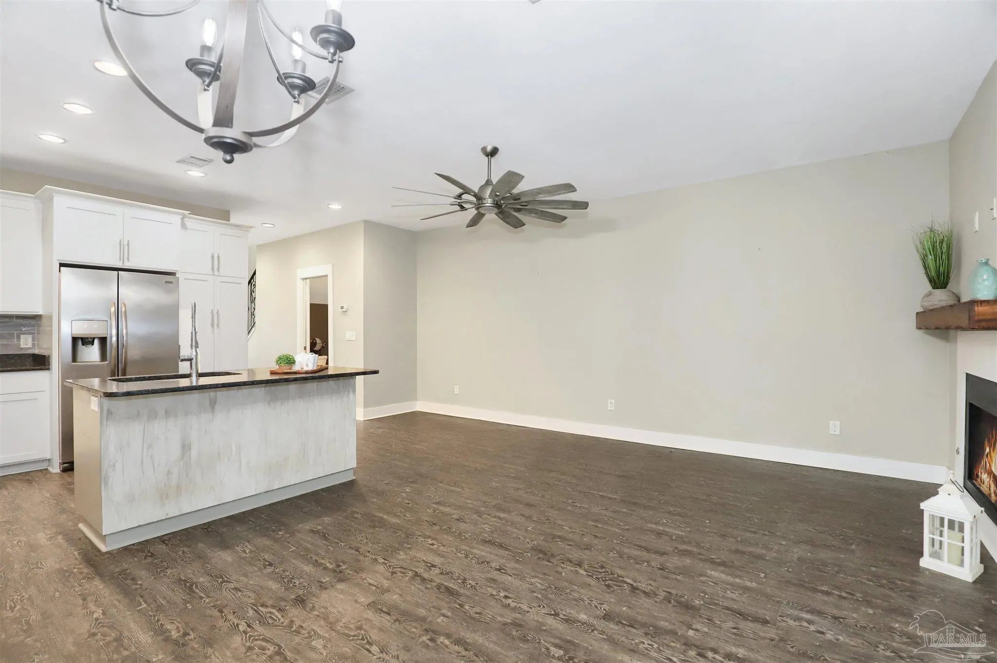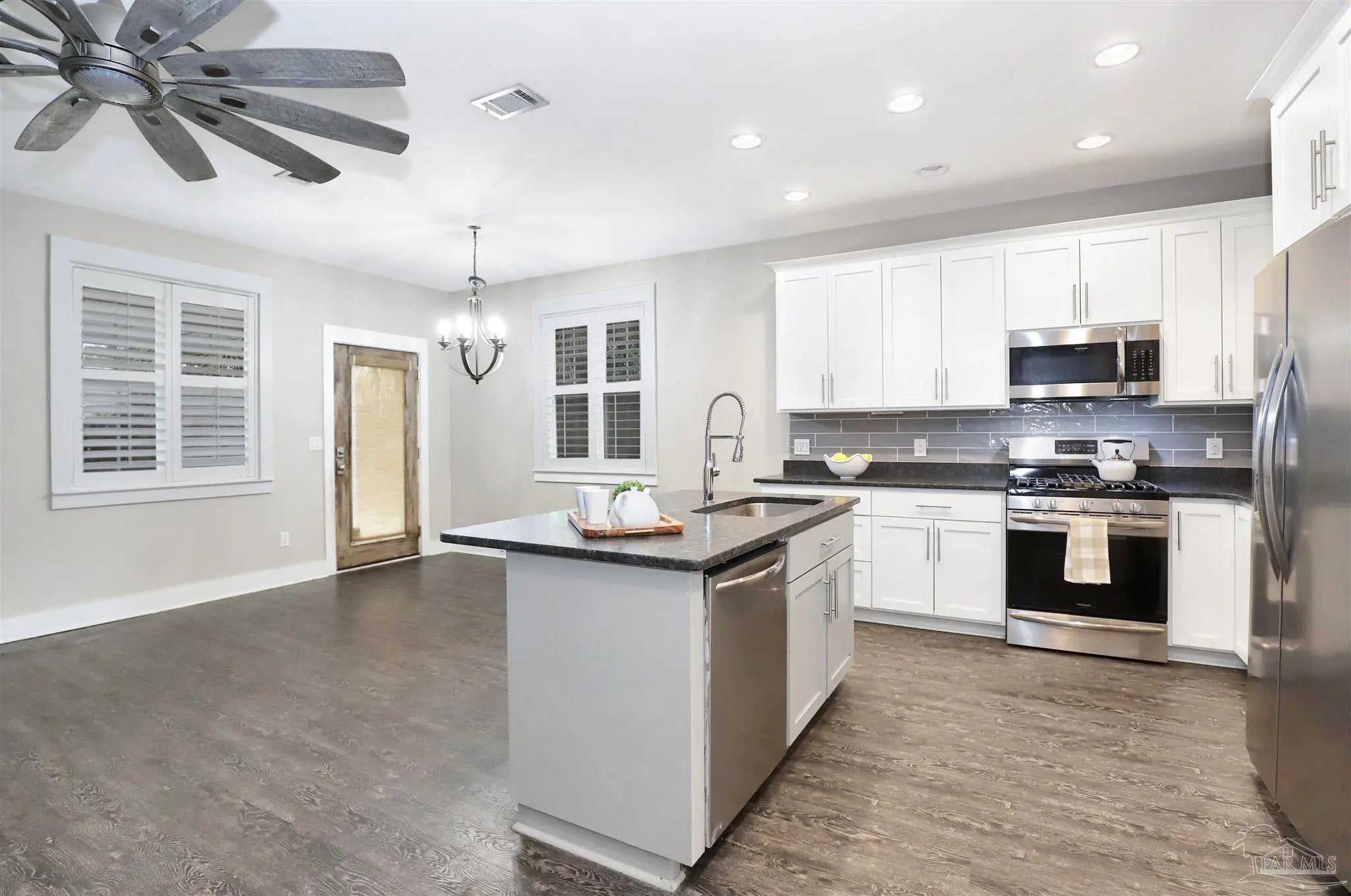 3BR/2.5BA Downtown Pensacola home. 1,741 sqft with one-car garage, open floorplan, and Fridgeaire Gallery appliances. Granite counters & luxury vinyl plank. No HOA fee. Welcome home to this well-appointed three-bedroom, two-and-a-half-bath residence with a one-car garage. The main level features an open kitchen and living area designed for both comfort and entertaining. The kitchen offers granite countertops, stainless steel Frigidaire Gallery Series appliances, including a gas cooktop and refrigerator, and flows seamlessly into the living room highlighted by a gas fireplace. Plantation shutters throughout the downstairs add a touch of luxury. Upstairs, the primary suite features luxury vinyl flooring, a double vanity with granite countertops, a walk-in tiled shower, and an oversized closet. Two additional bedrooms include carpet, while the remaining upstairs spaces feature luxury vinyl flooring. All three bedrooms offer ceiling fans, and recessed lighting enhances the upper level. Outside, enjoy a covered back porch overlooking a paver patio, trellis, and privacy-fenced backyard accented by several palm trees.