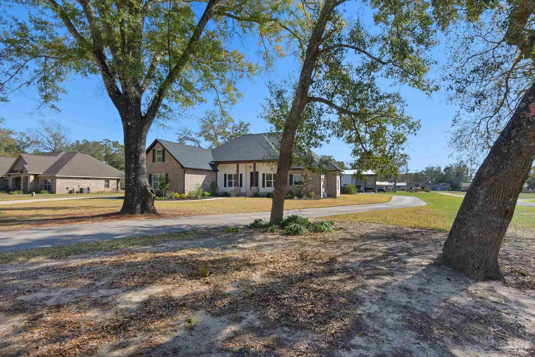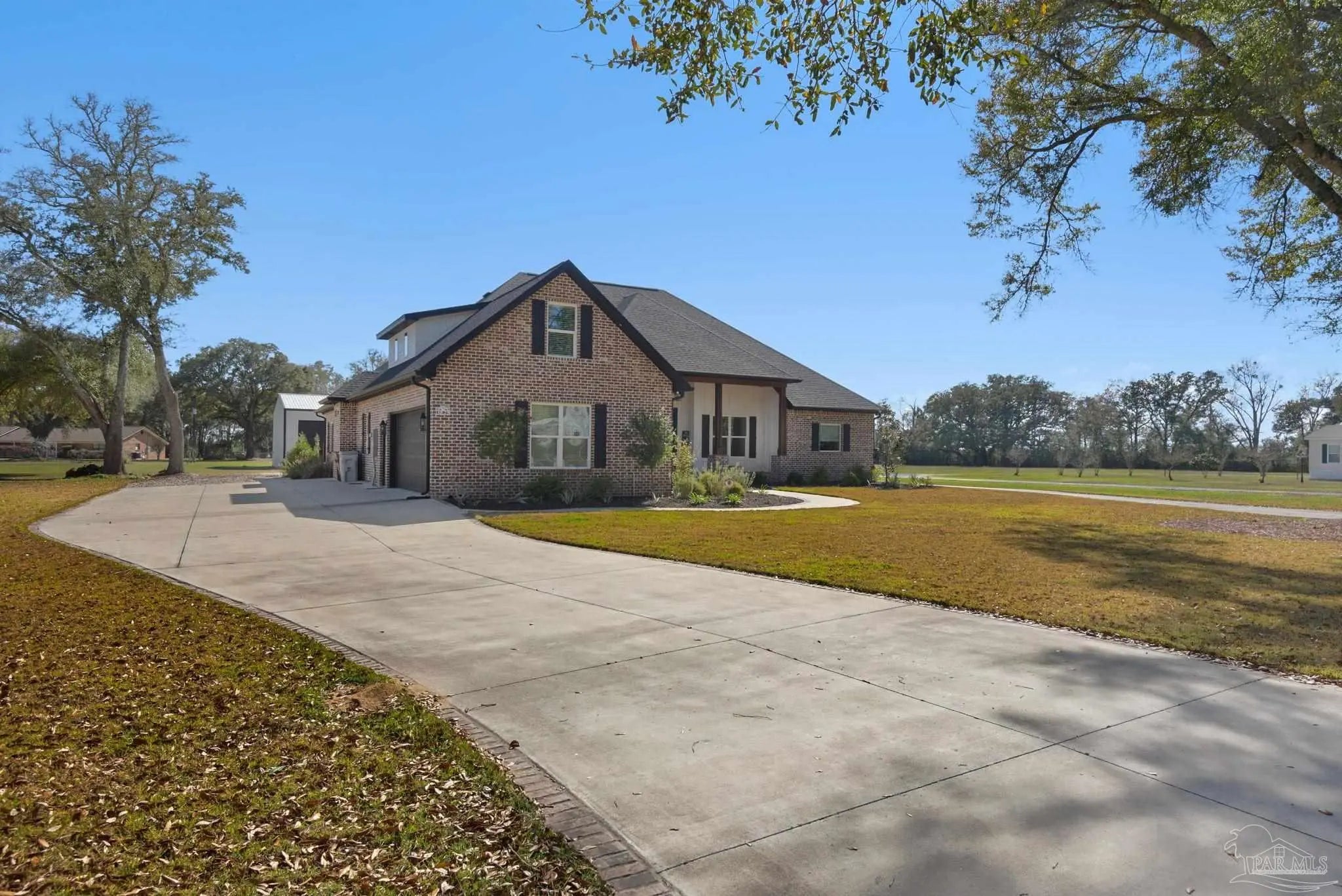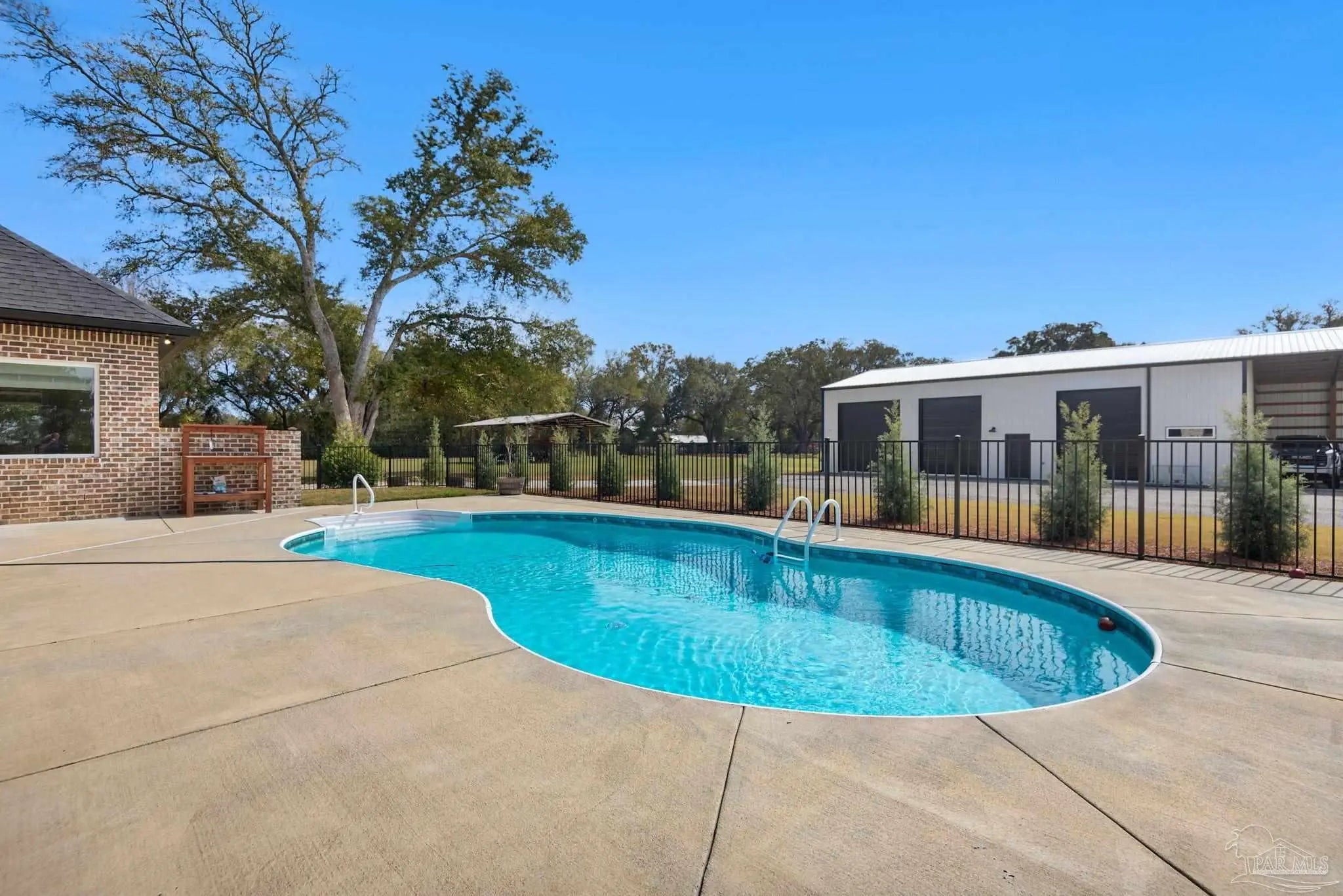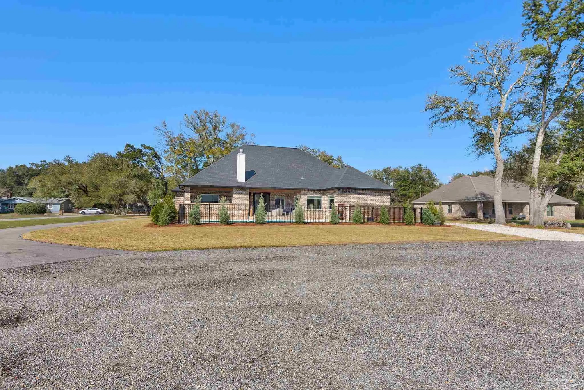 URGENT MUST-SEE! This executive custom home is loaded with upgrades and every bell and whistle, situated on a beautiful one-acre lot in the heart of Pace with no HOA. Offering 5 bedrooms and 4 bathrooms, this stunning home blends luxury finishes, thoughtful design, and incredible indoor and outdoor living. Inside, the welcoming foyer features Chicago brick accents and opens to a spacious living room with beautiful coffered wood beam ceilings. The private primary suite offers tray ceilings, an antique barn door, and a spa-inspired bathroom complete with hexagon tile flooring, a freestanding soaking tub, glass walk-in shower with bench seating, private water closet, and dual custom walk-in closets. The chef’s kitchen is a showstopper featuring quartz countertops, farmhouse sink, and a professional 48" dual-fuel range with a 7-burner gas cooktop, cast iron griddle, and double electric ovens. Additional highlights include a full-size refrigerator and freezer, floor-to-ceiling cabinetry, vent hood, under-cabinet lighting, pull-out microwave drawer, herringbone subway tile backsplash, oversized island, walk-in pantry, and drop zone. Upstairs offers a loft-style bedroom with a full bath, and walk-in attic storage. Step outside to enjoy the in-ground pool with metal safety fence and a covered lanai featuring a gas fireplace and aoutdoor kitchen, perfect for entertaining. Also includes a tankless gas water heater, spray foam installation, sprinkler system, and an oversized garage designed to fit a king-cab truck. Two driveways provide easy access to the impressive 40x80 metal building with a 20-foot open span and 14-foot roll-up doors, ideal for RVs, boats, a workshop, or additional storage. Plus, a air-conditioned workout room with full bath. Homes with this level of custom detail, land, pool, and shop rarely come available. Schedule your private showing today before this incredible property is gone.