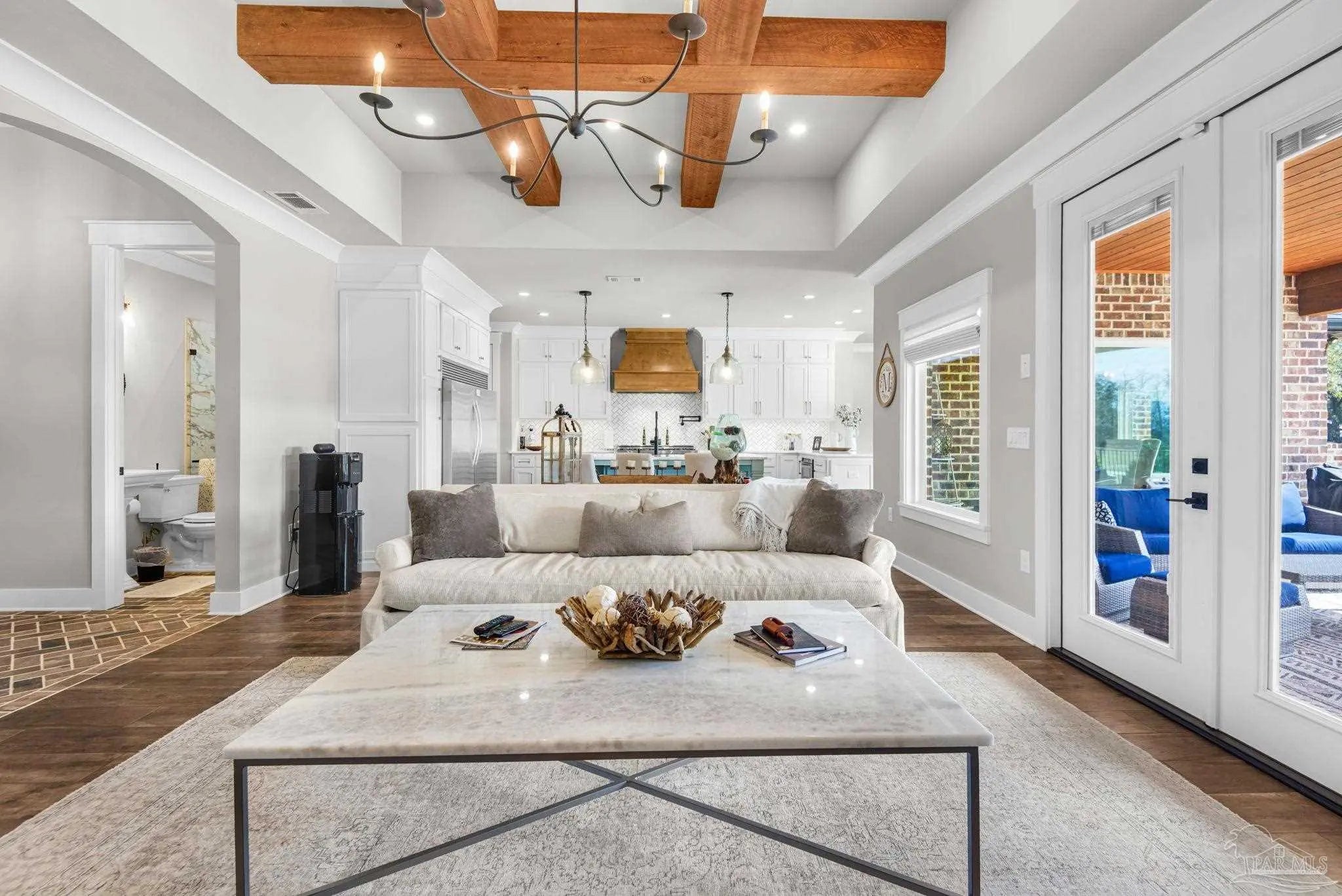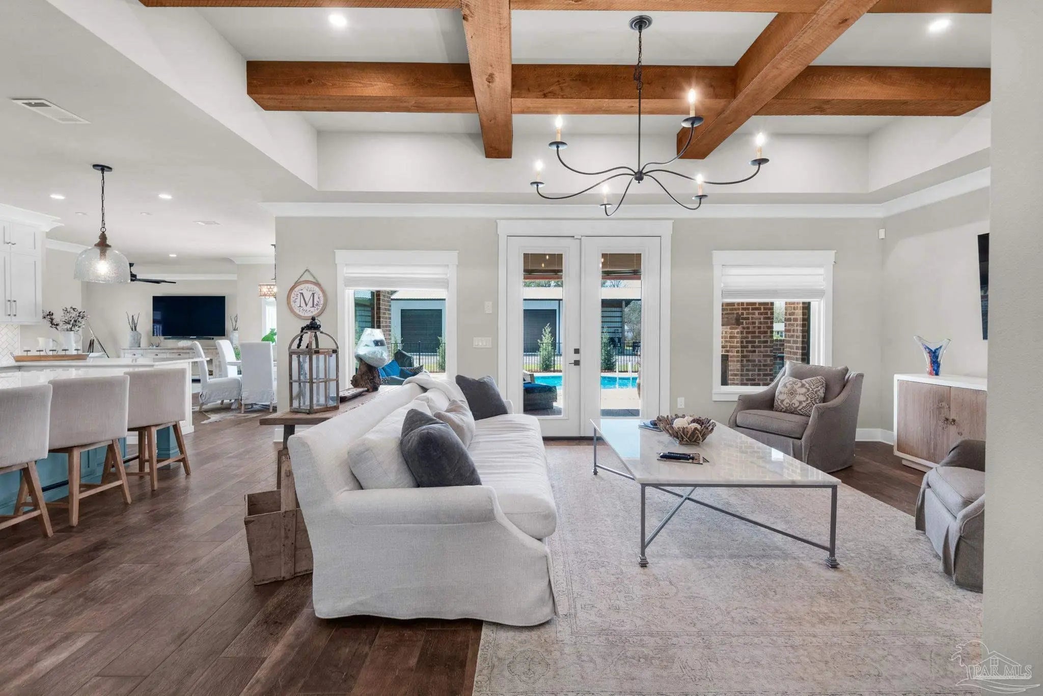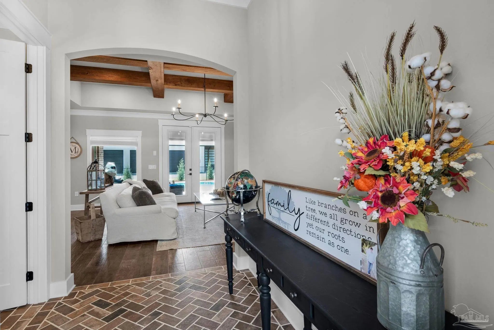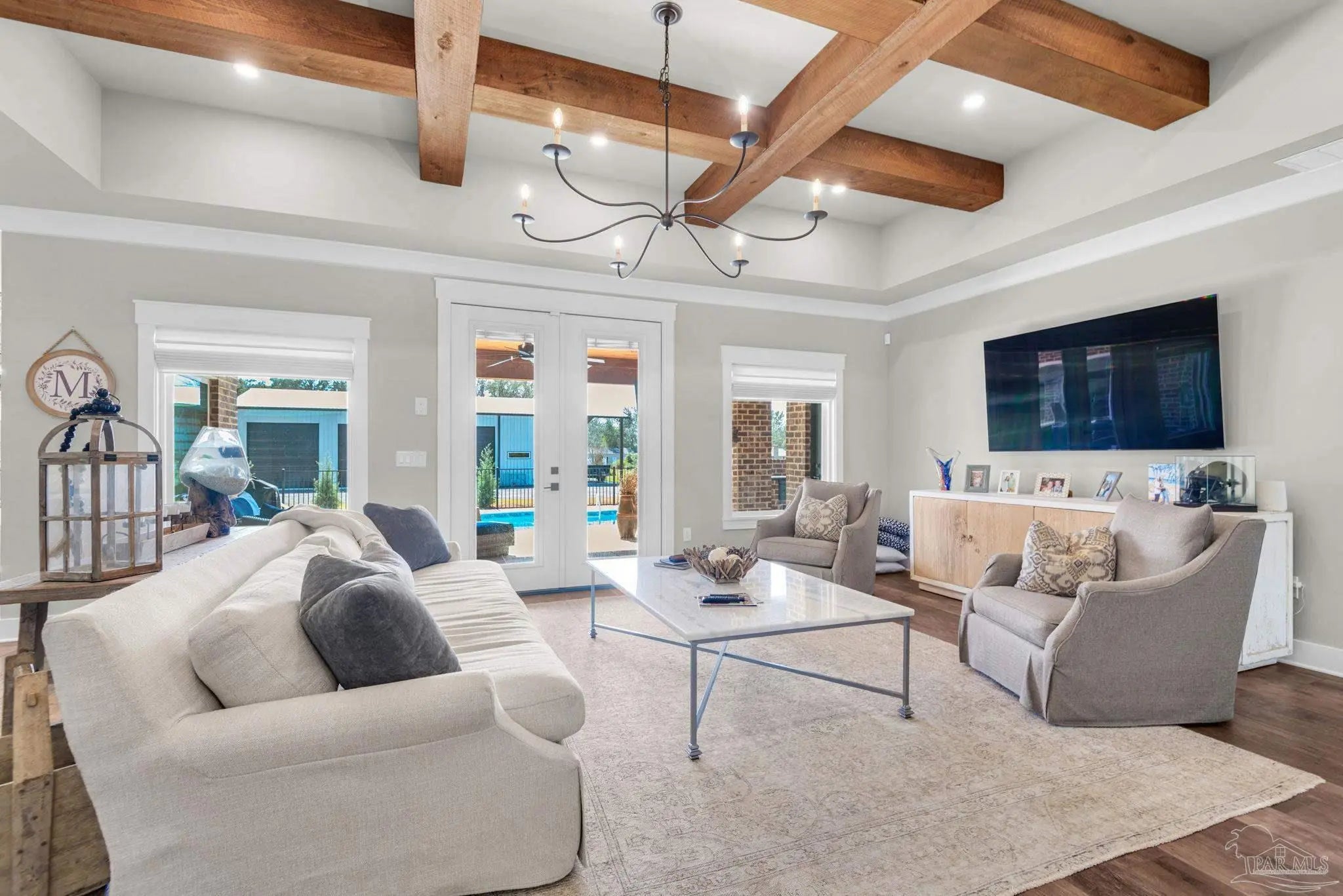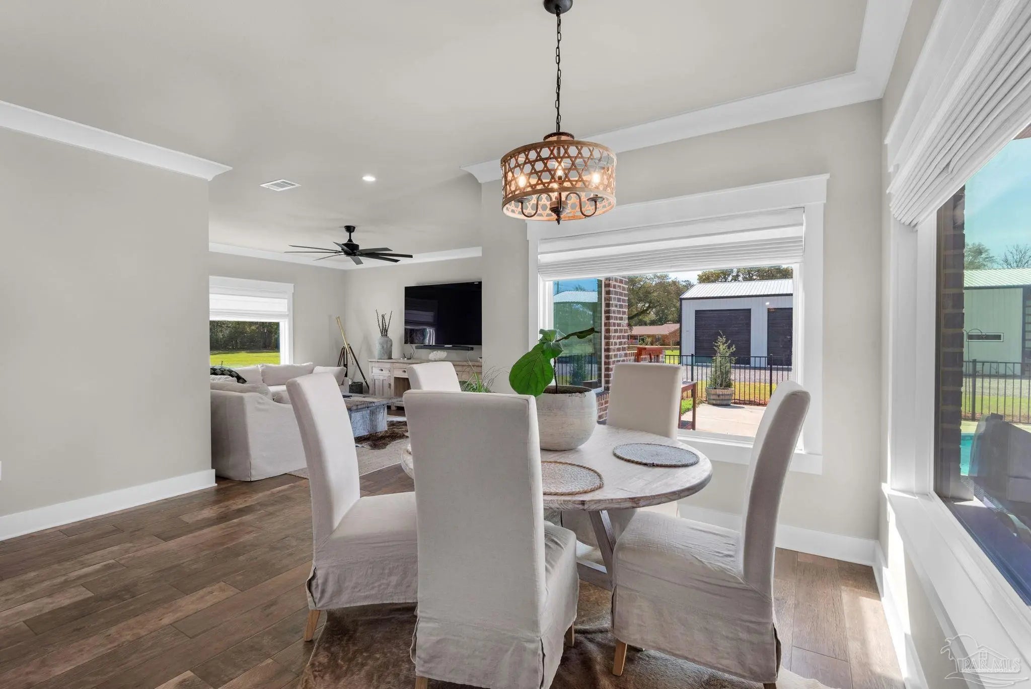 URGENT MUST-SEE! This executive custom home is loaded with upgrades and every bell and whistle, situated on a beautiful one-acre lot in the heart of Pace with no HOA. Offering 5 bedrooms and 4 bathrooms, this stunning home blends luxury finishes, thoughtful design, and incredible indoor and outdoor living. Inside, the welcoming foyer features Chicago brick accents and opens to a spacious living room with beautiful coffered wood beam ceilings. The private primary suite offers tray ceilings, an antique barn door, and a spa-inspired bathroom complete with hexagon tile flooring, a freestanding soaking tub, glass walk-in shower with bench seating, private water closet, and dual custom walk-in closets. The chef’s kitchen is a showstopper featuring quartz countertops, farmhouse sink, and a professional 48" dual-fuel range with a 7-burner gas cooktop, cast iron griddle, and double electric ovens. Additional highlights include a full-size refrigerator and freezer, floor-to-ceiling cabinetry, vent hood, under-cabinet lighting, pull-out microwave drawer, herringbone subway tile backsplash, oversized island, walk-in pantry, and drop zone. Upstairs offers a loft-style bedroom with a full bath, and walk-in attic storage. Step outside to enjoy the in-ground pool with metal safety fence and a covered lanai featuring a gas fireplace and aoutdoor kitchen, perfect for entertaining. Also includes a tankless gas water heater, spray foam installation, sprinkler system, and an oversized garage designed to fit a king-cab truck. Two driveways provide easy access to the impressive 40x80 metal building with a 20-foot open span and 14-foot roll-up doors, ideal for RVs, boats, a workshop, or additional storage. Plus, a air-conditioned workout room with full bath. Homes with this level of custom detail, land, pool, and shop rarely come available. Schedule your private showing today before this incredible property is gone.